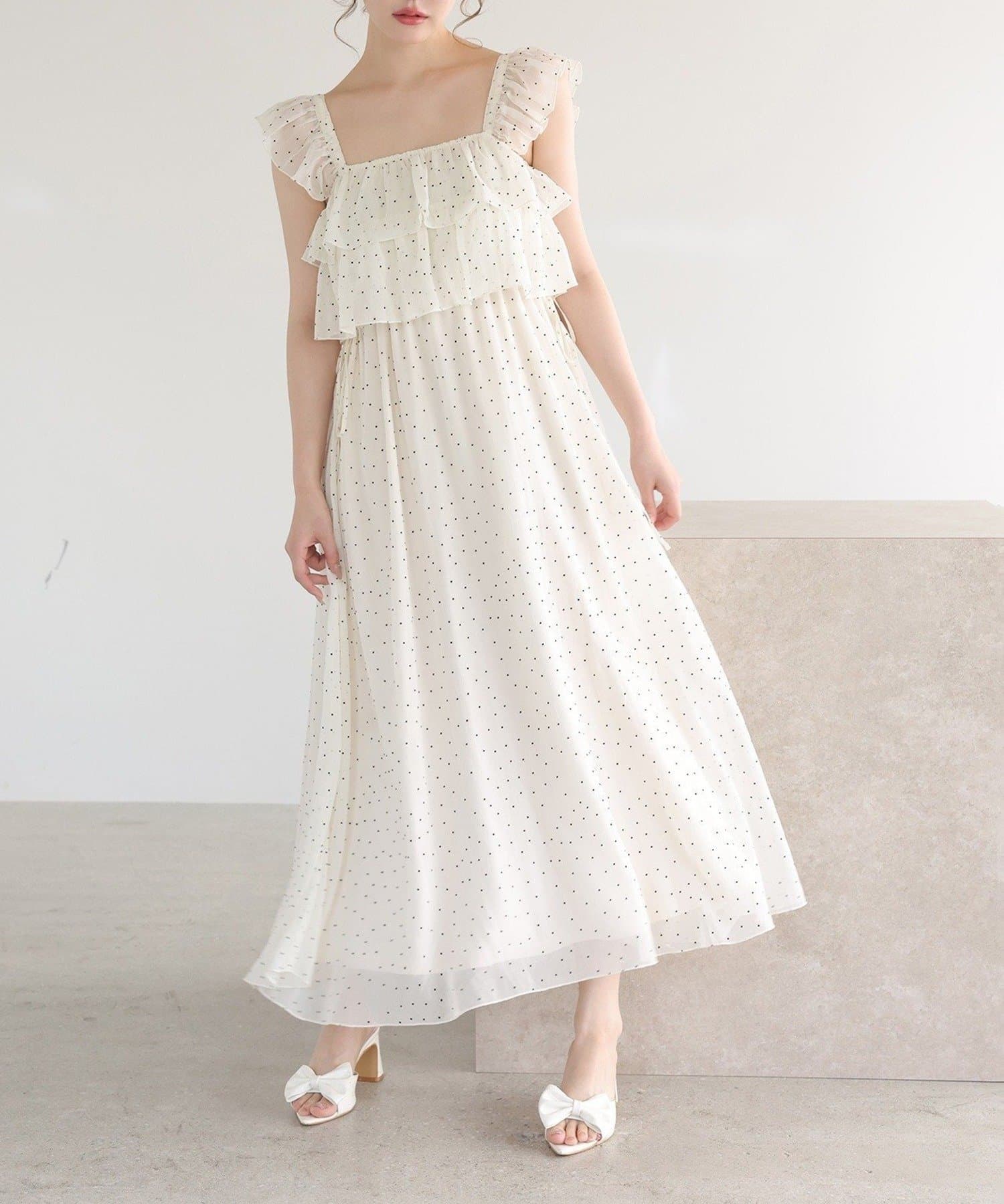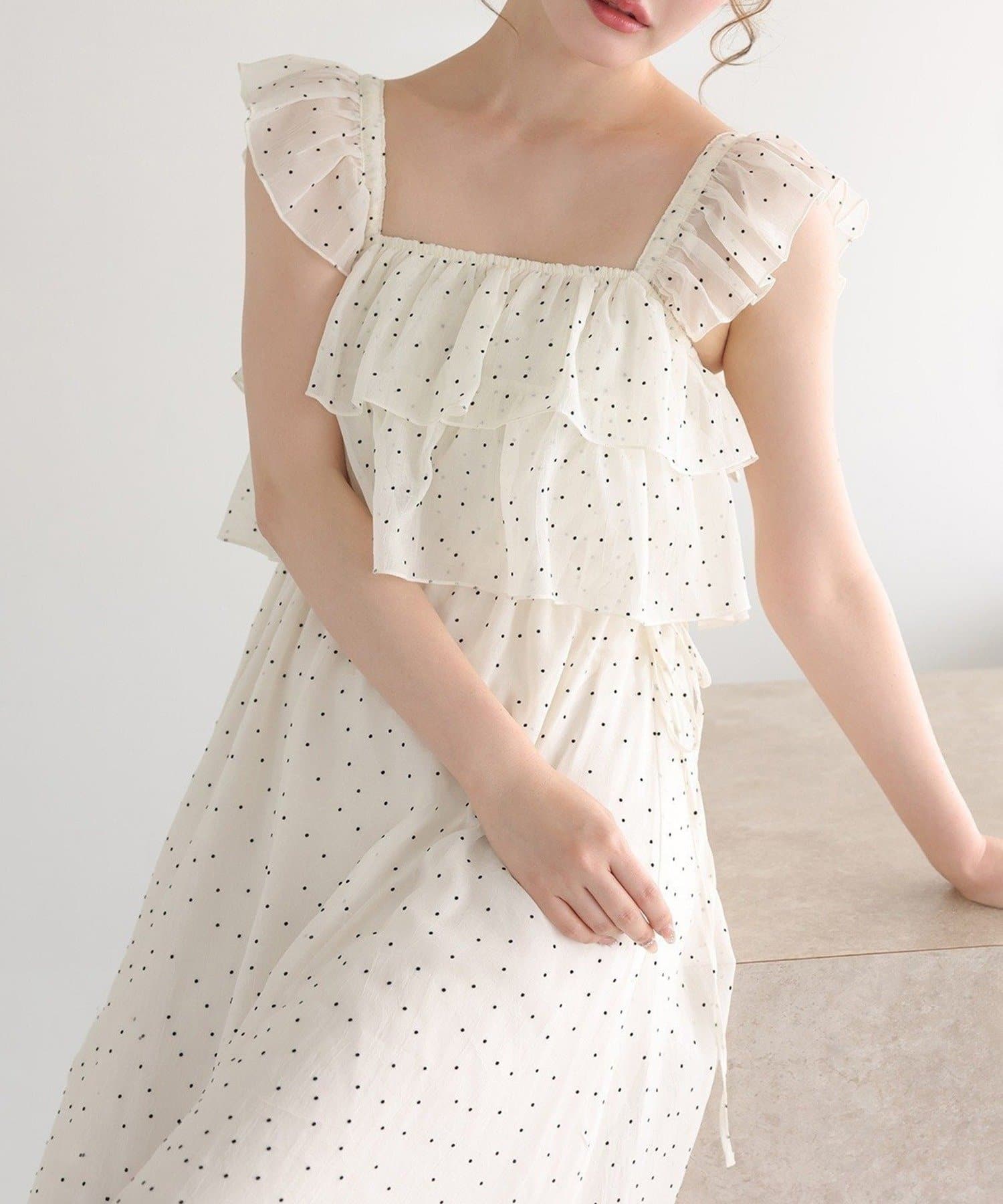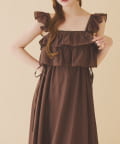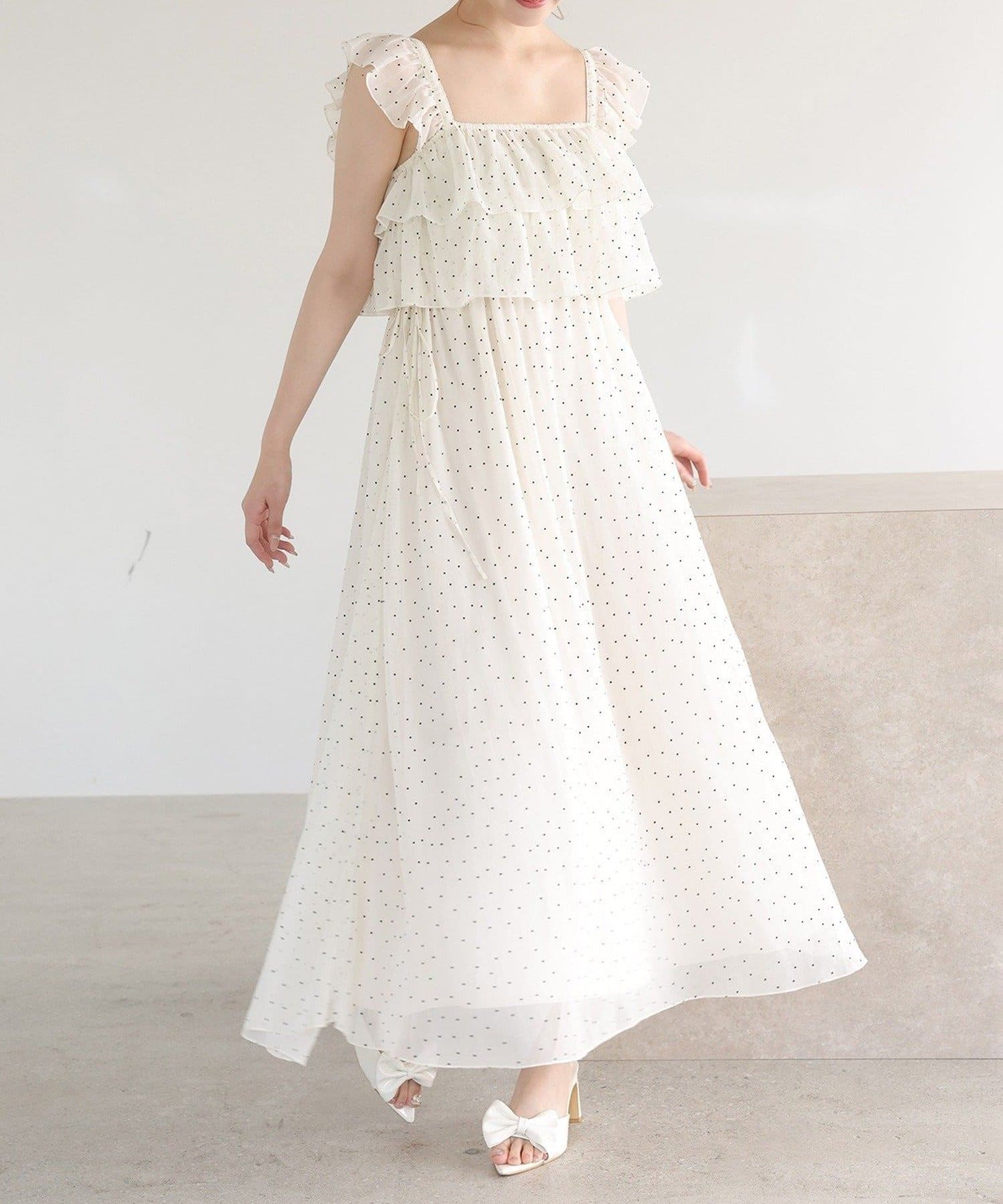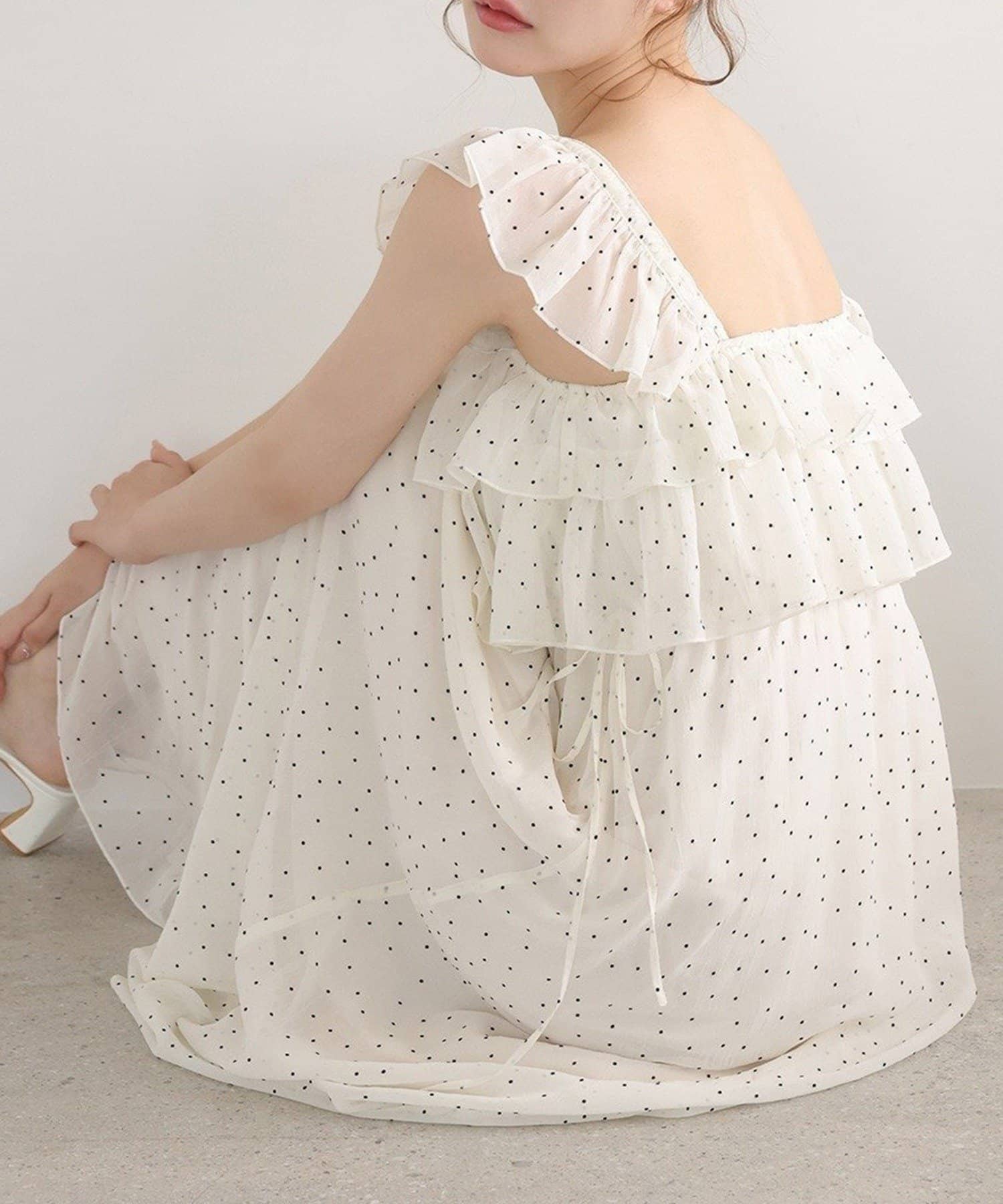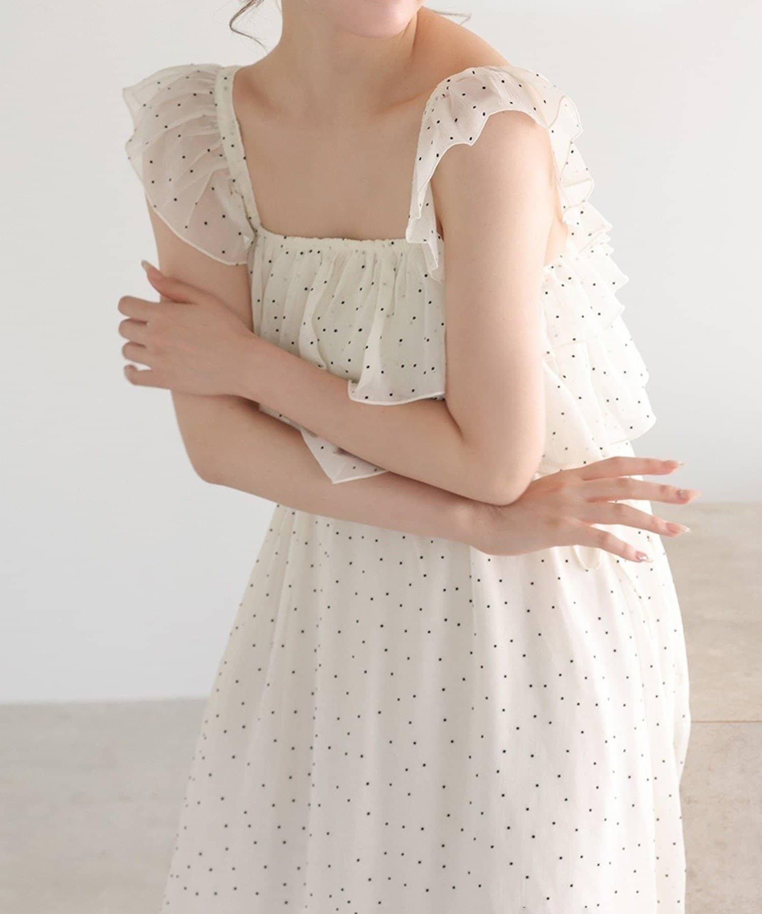 肩紐のフリルやふんわりと広がるフレアシルエットが