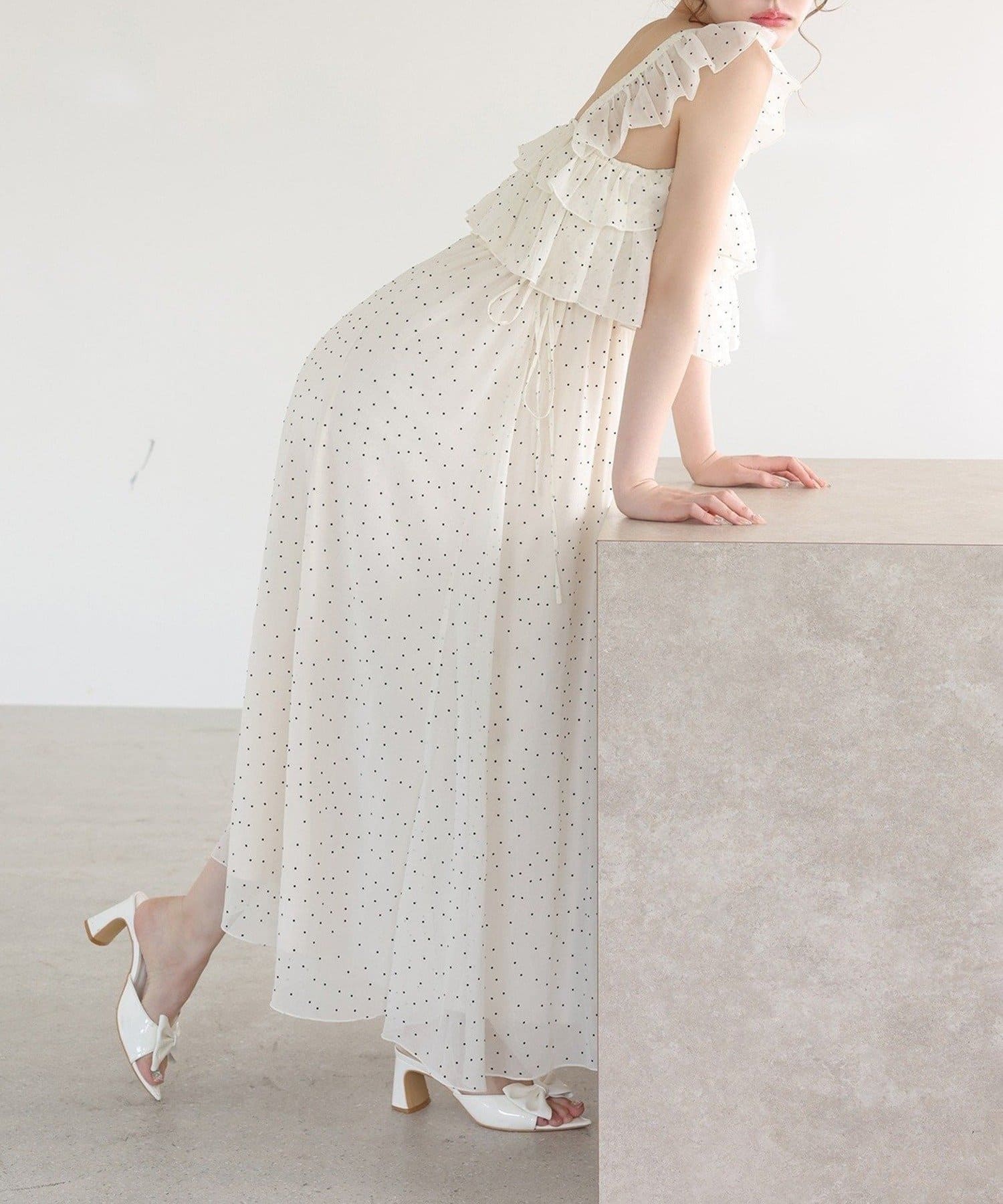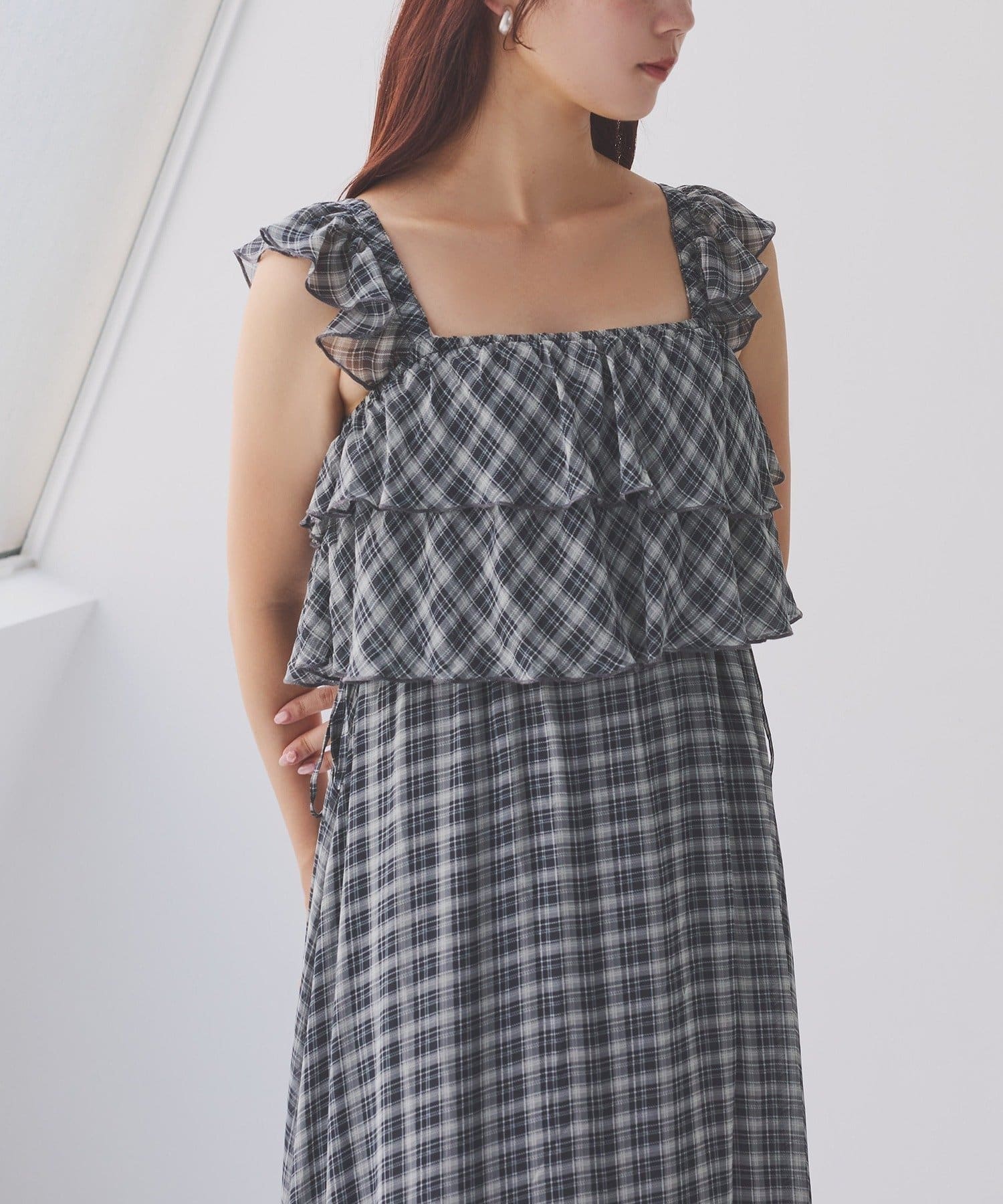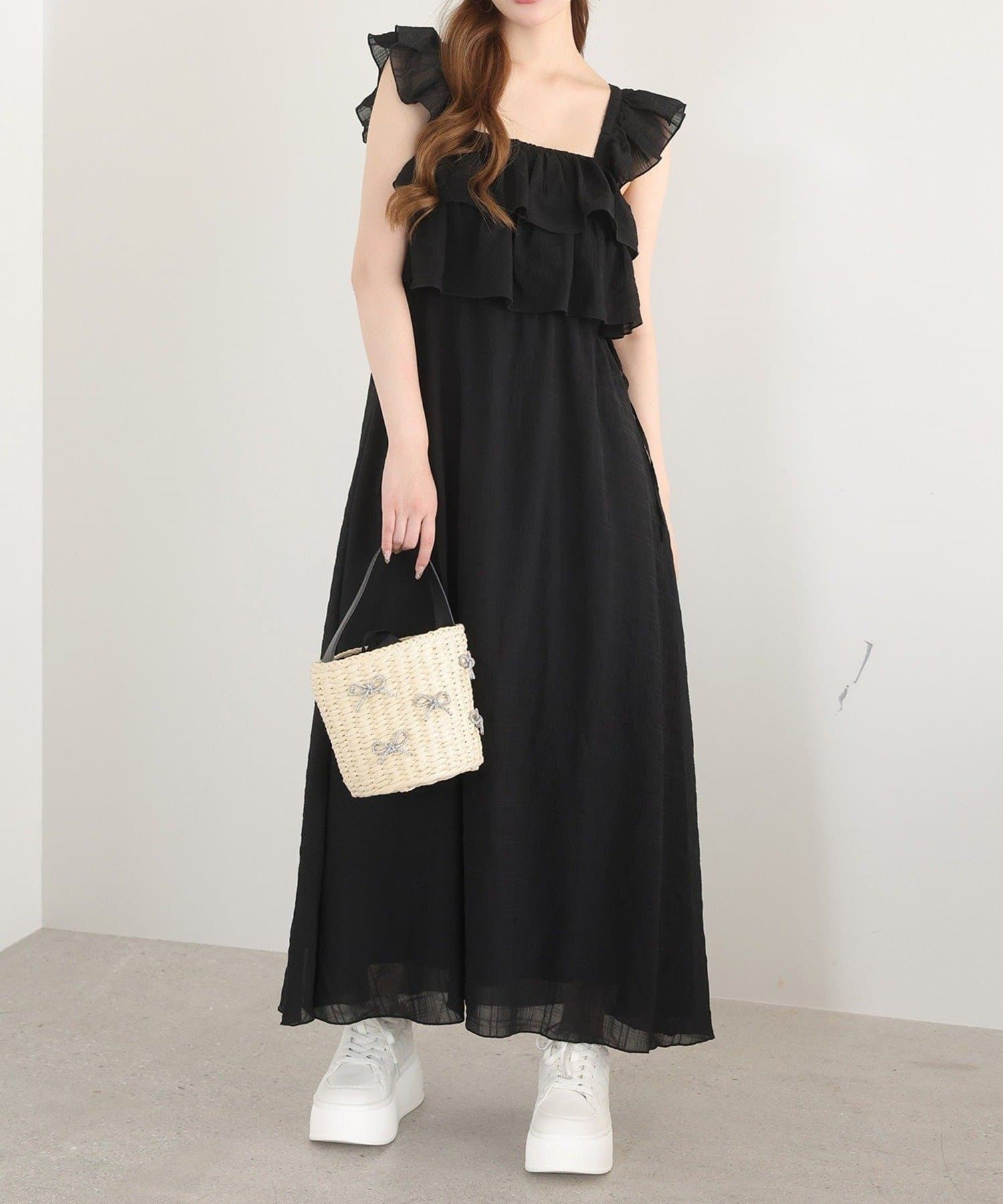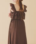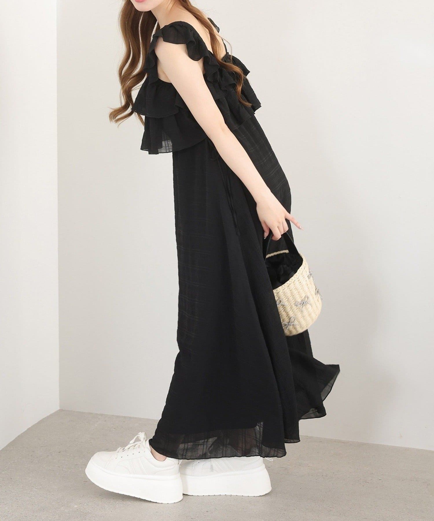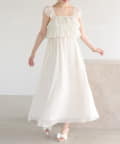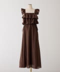 肩紐のフリルやふんわりと広がるフレアシルエットが