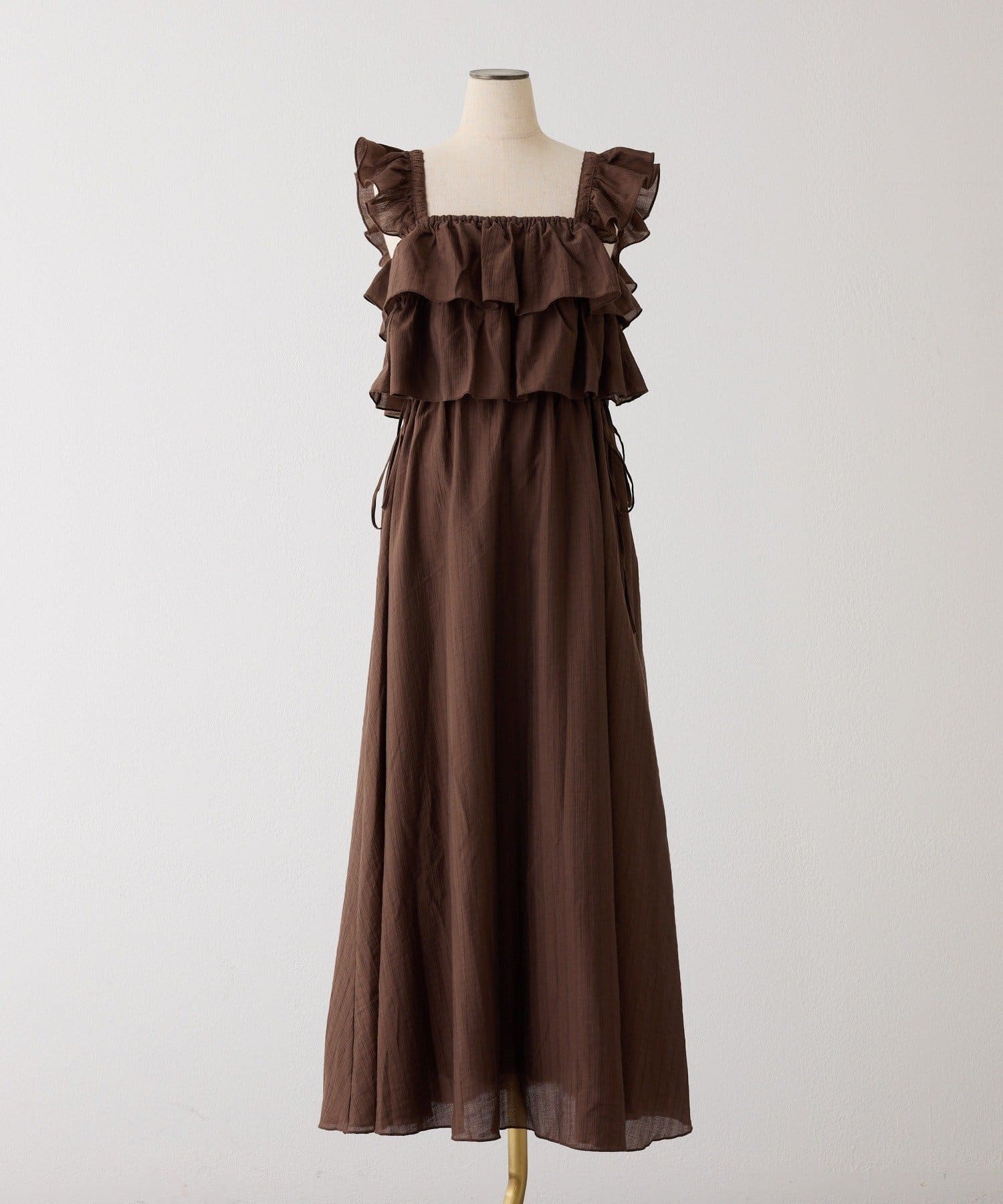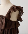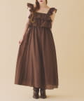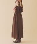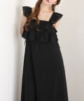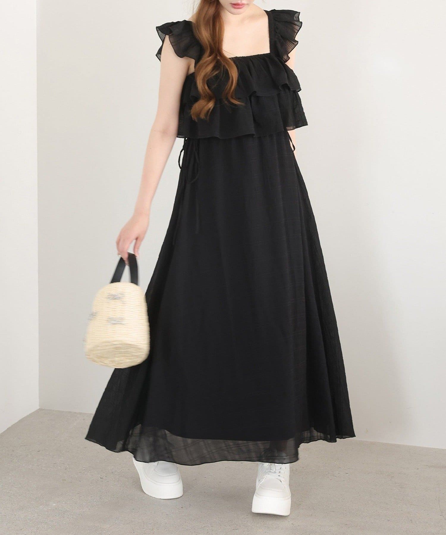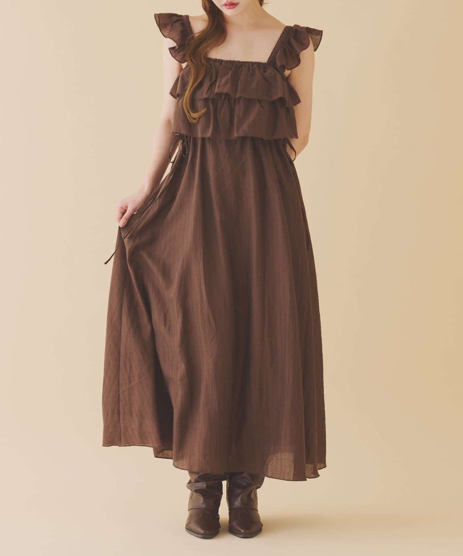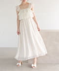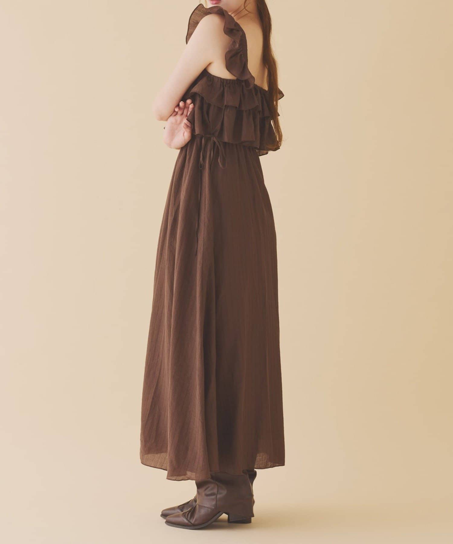 肩紐のフリルやふんわりと広がるフレアシルエットが