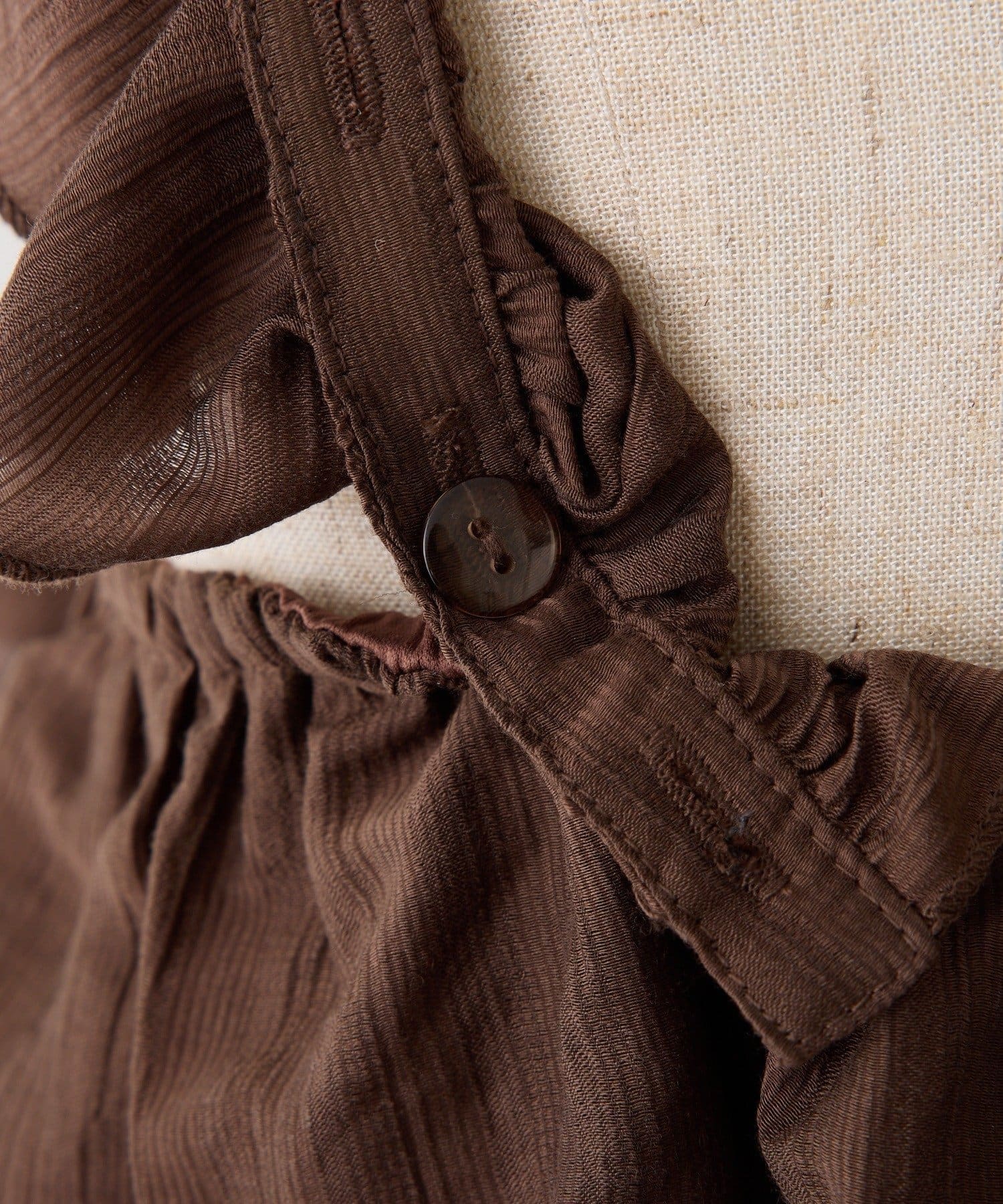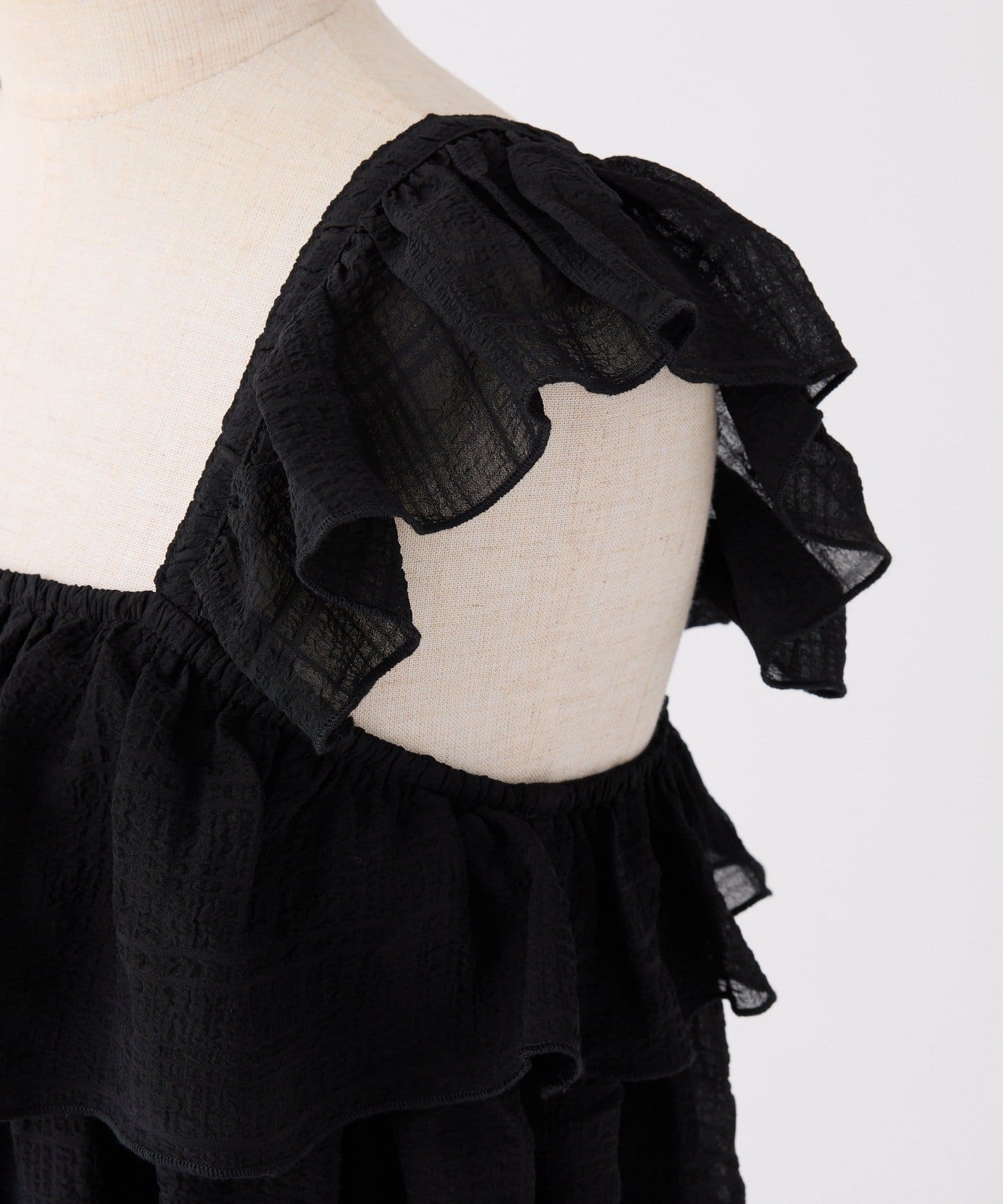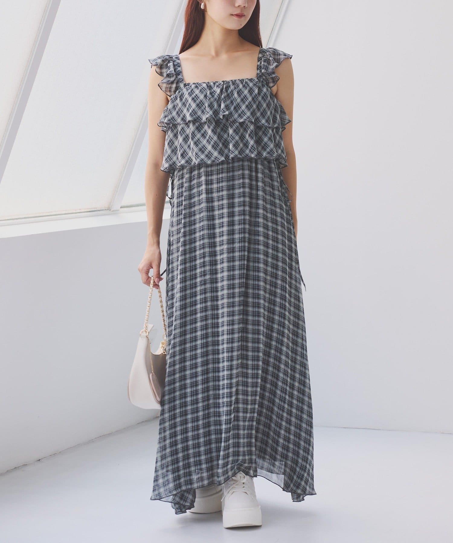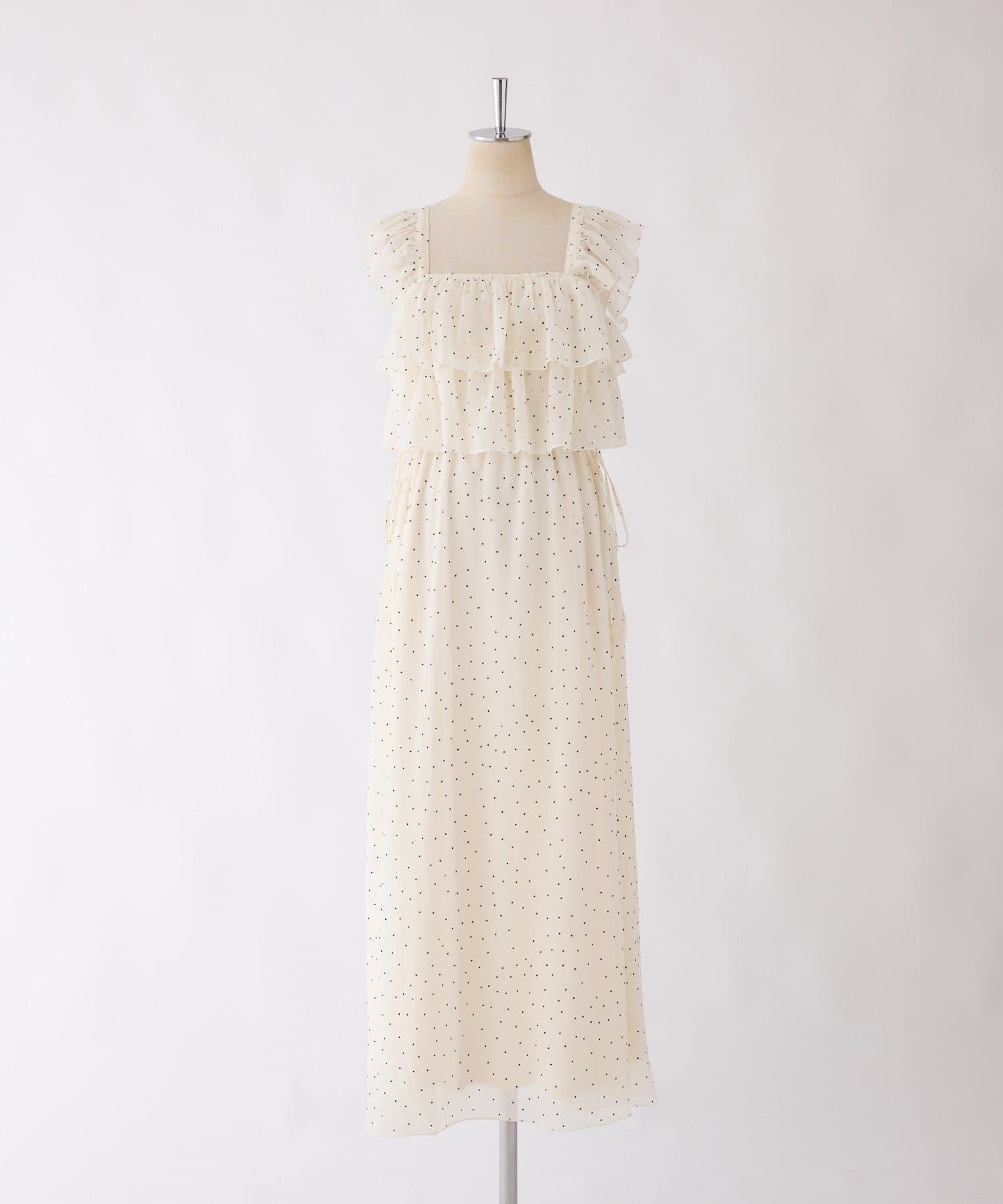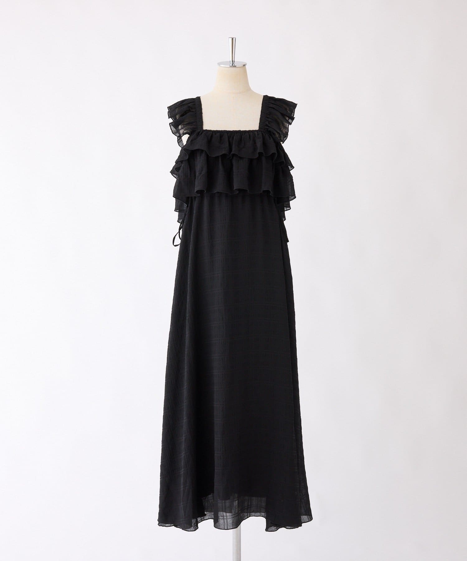 肩紐のフリルやふんわりと広がるフレアシルエットが