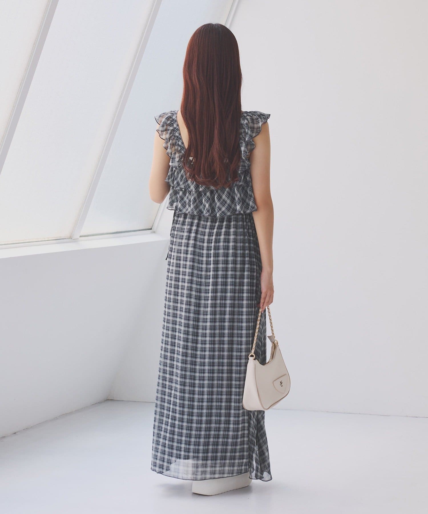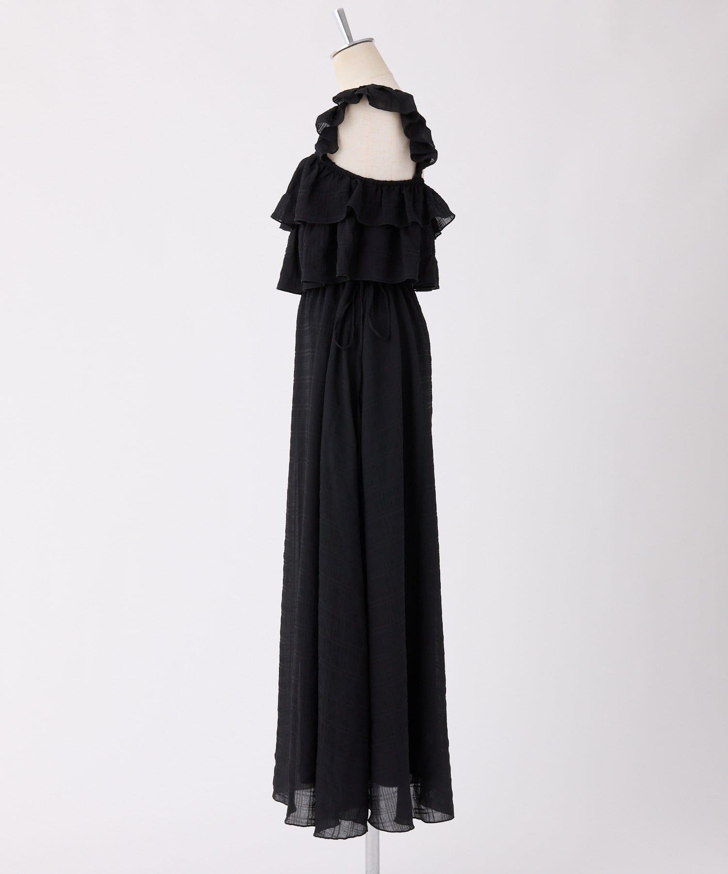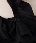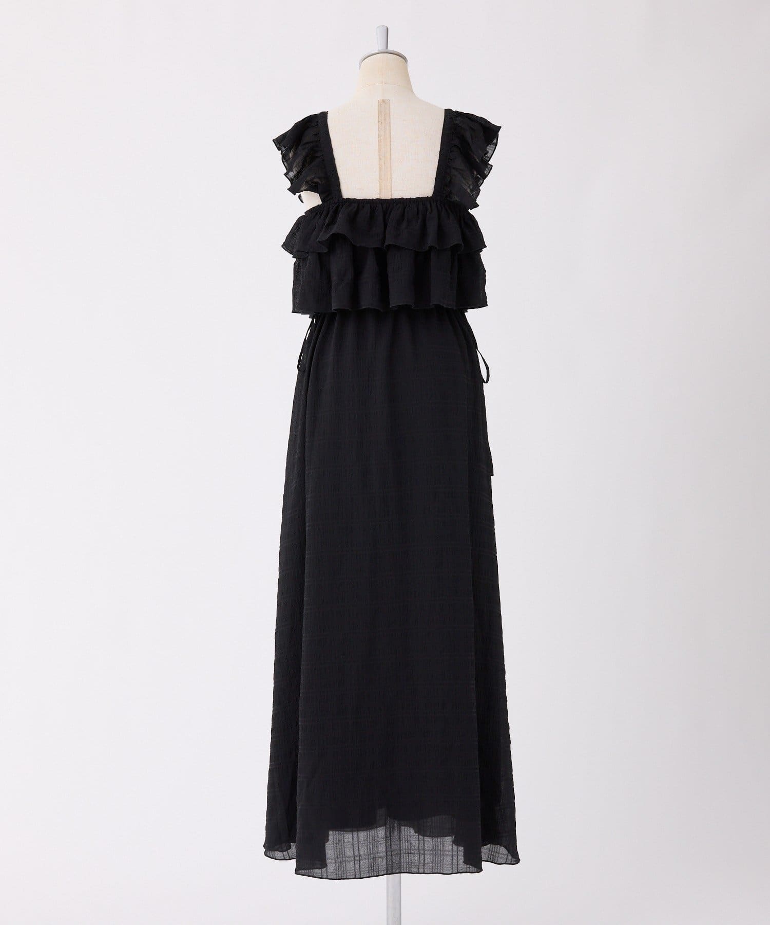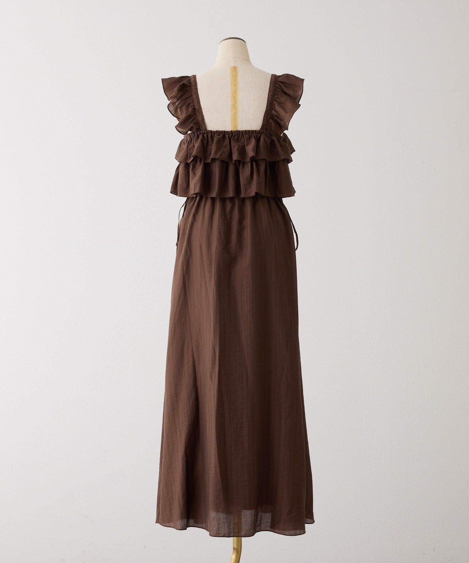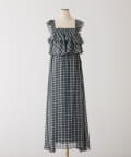 肩紐のフリルやふんわりと広がるフレアシルエットが