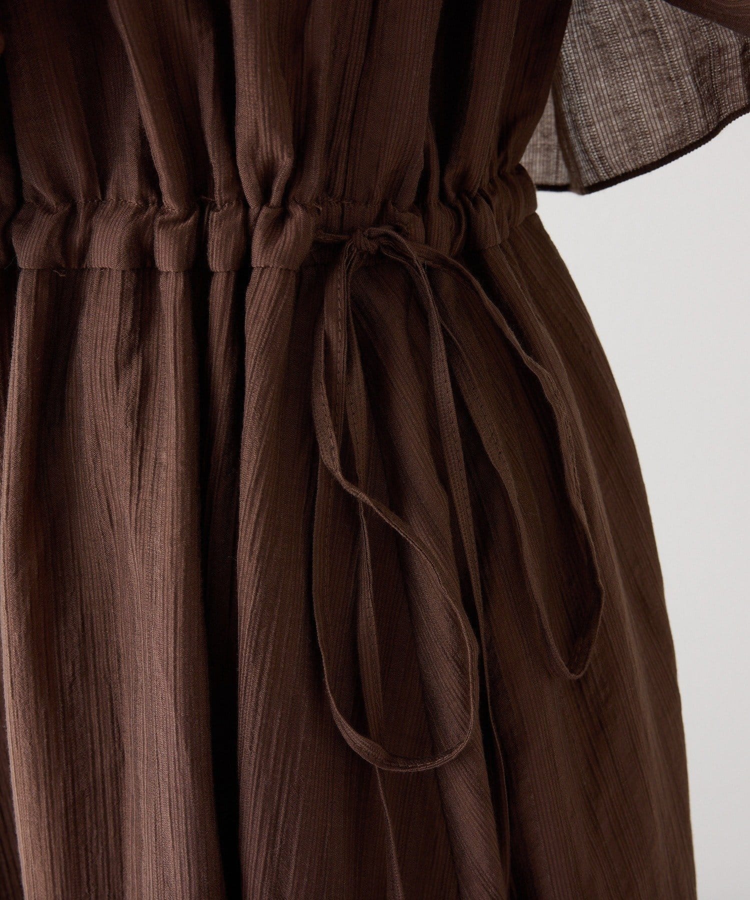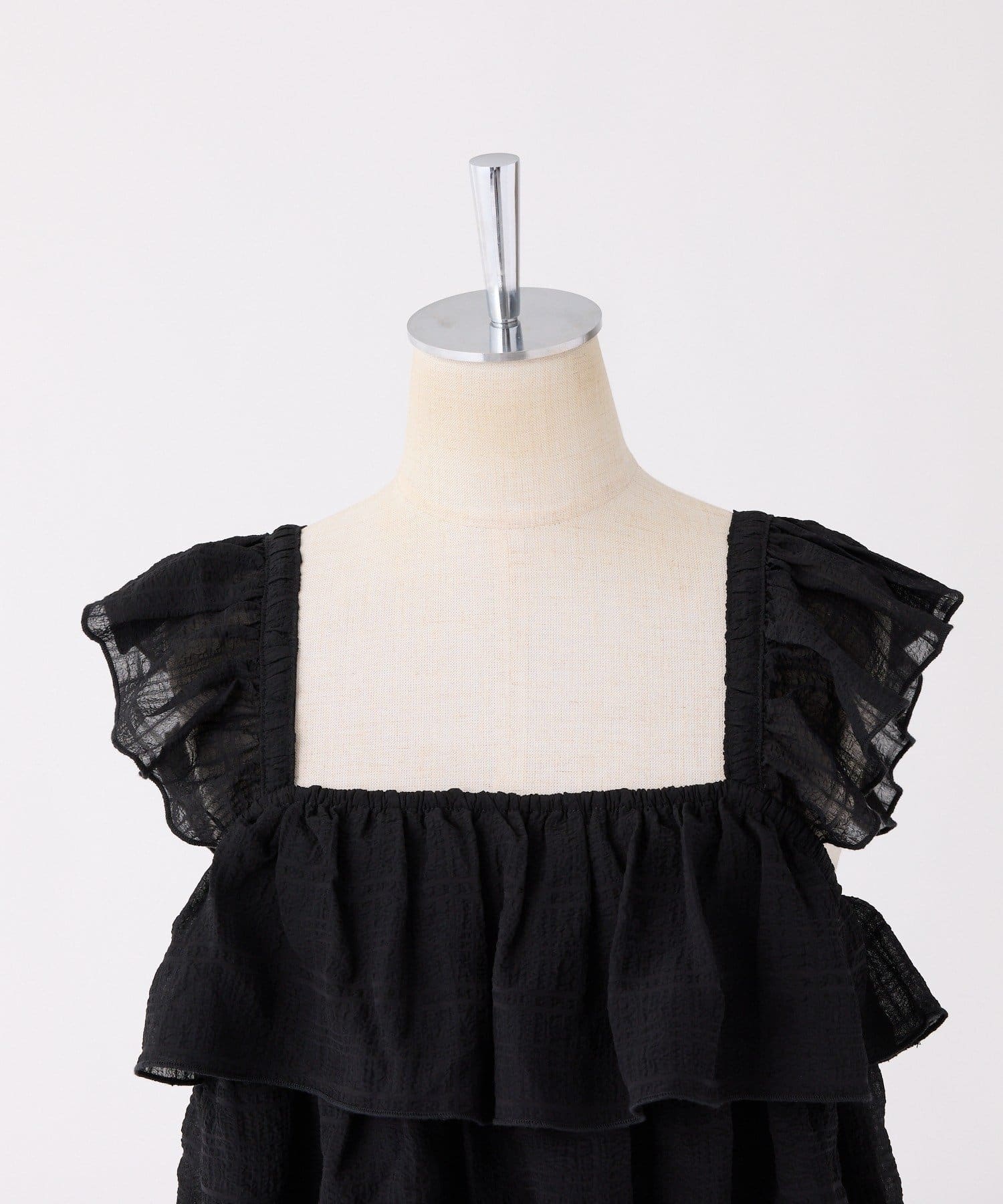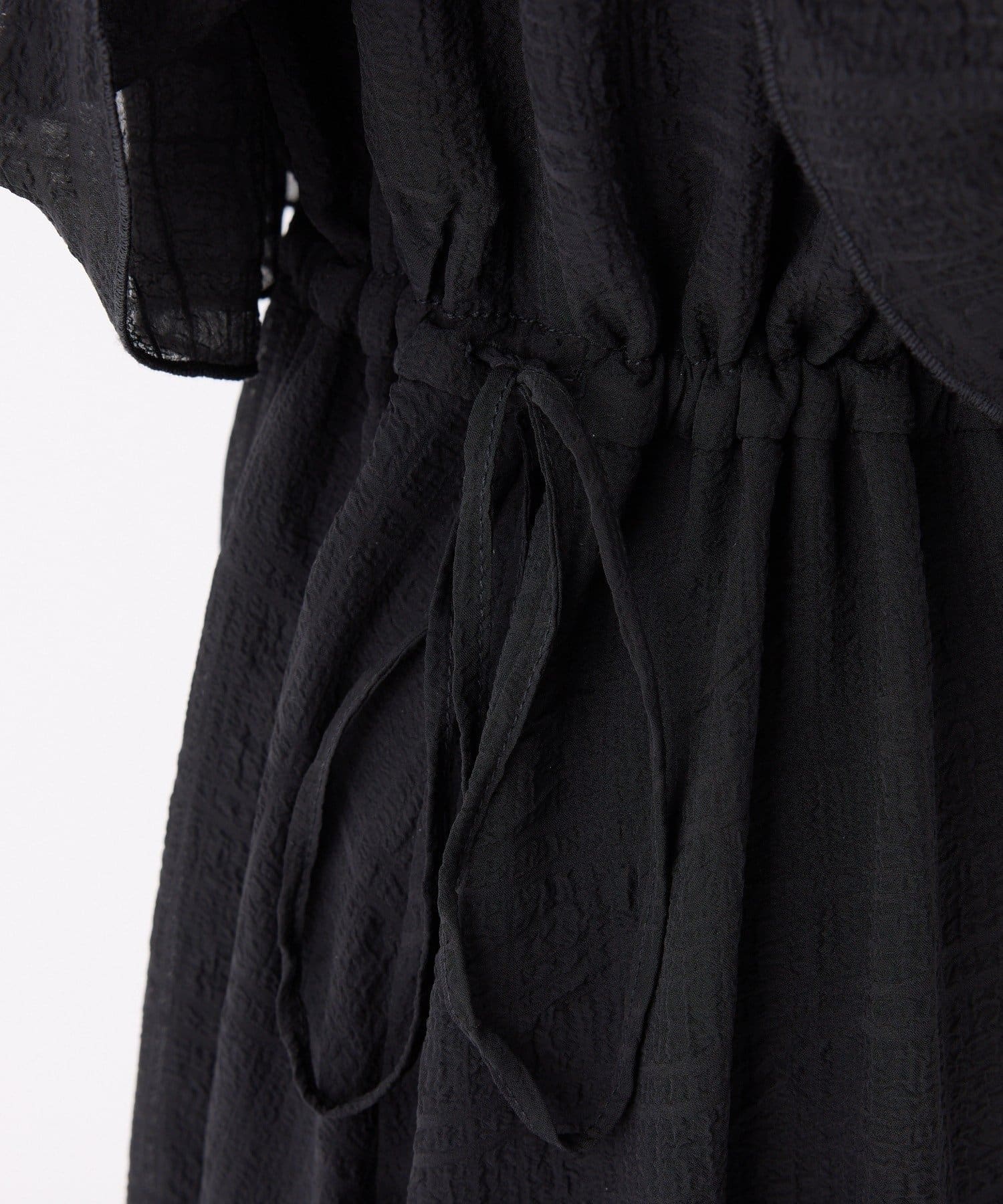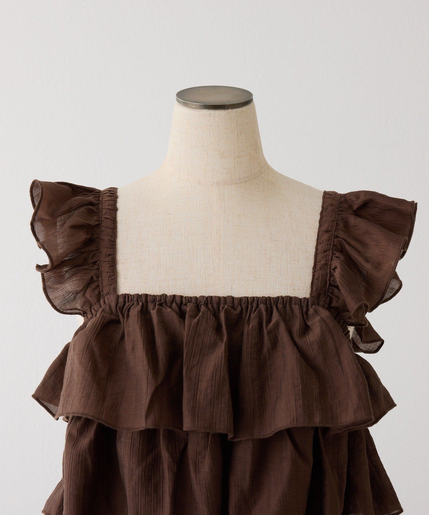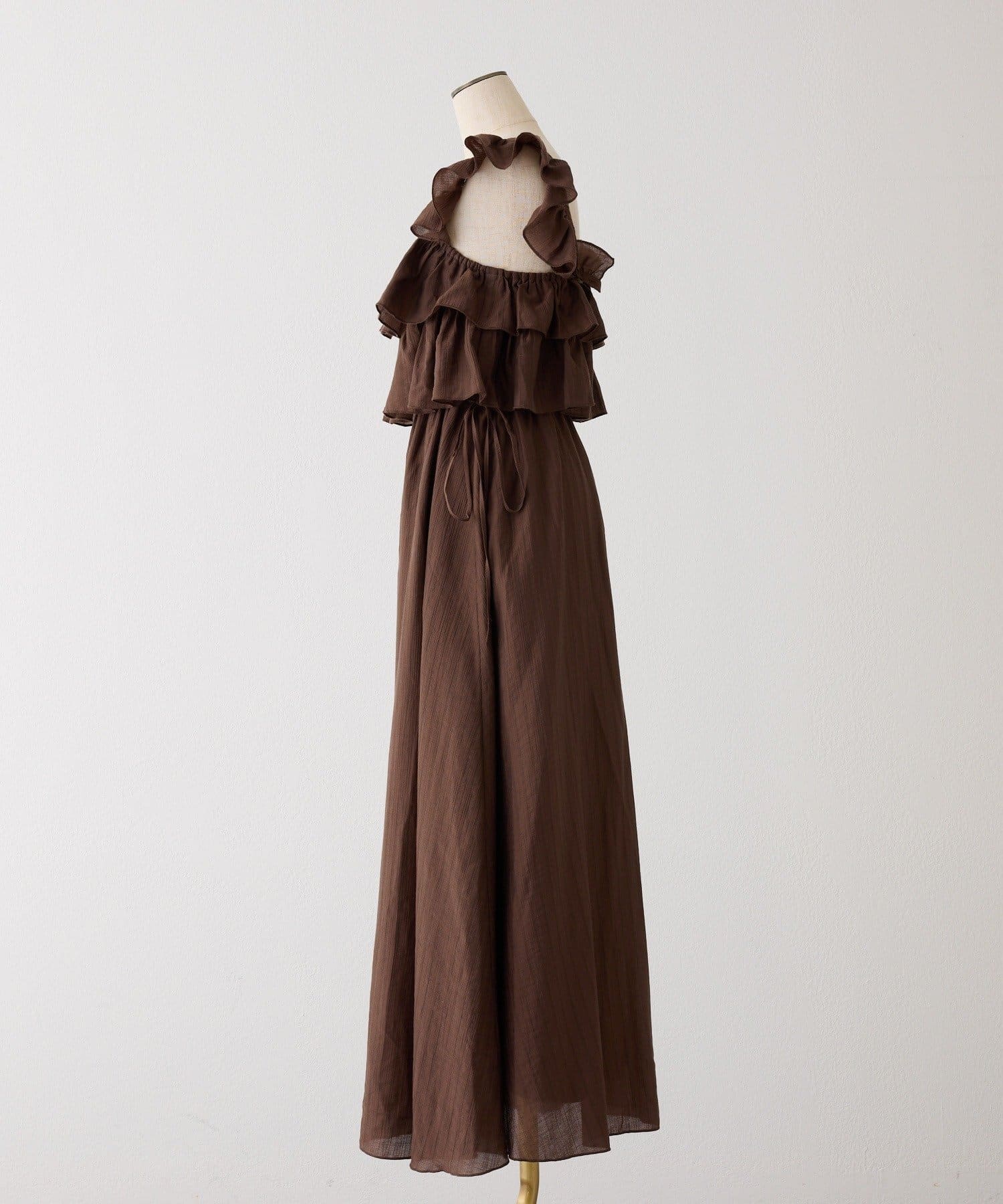 肩紐のフリルやふんわりと広がるフレアシルエットが