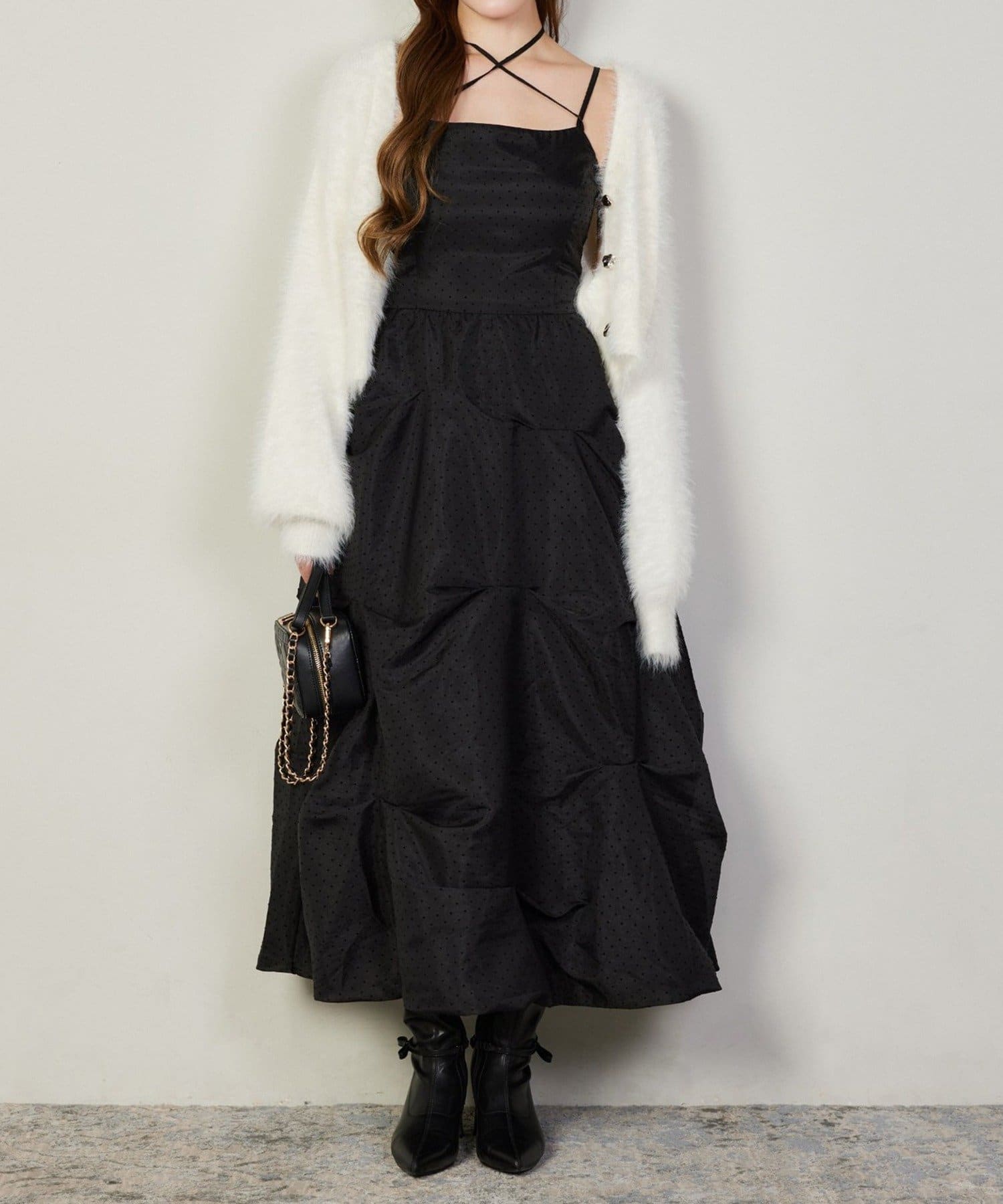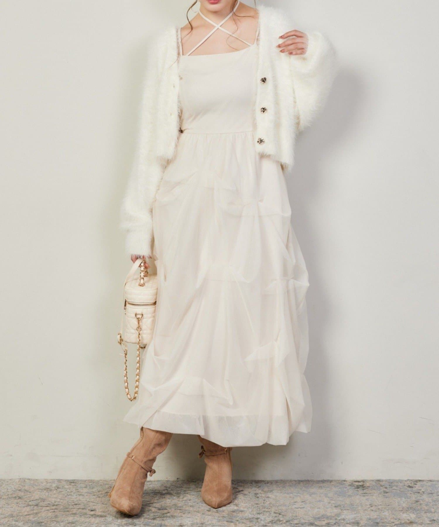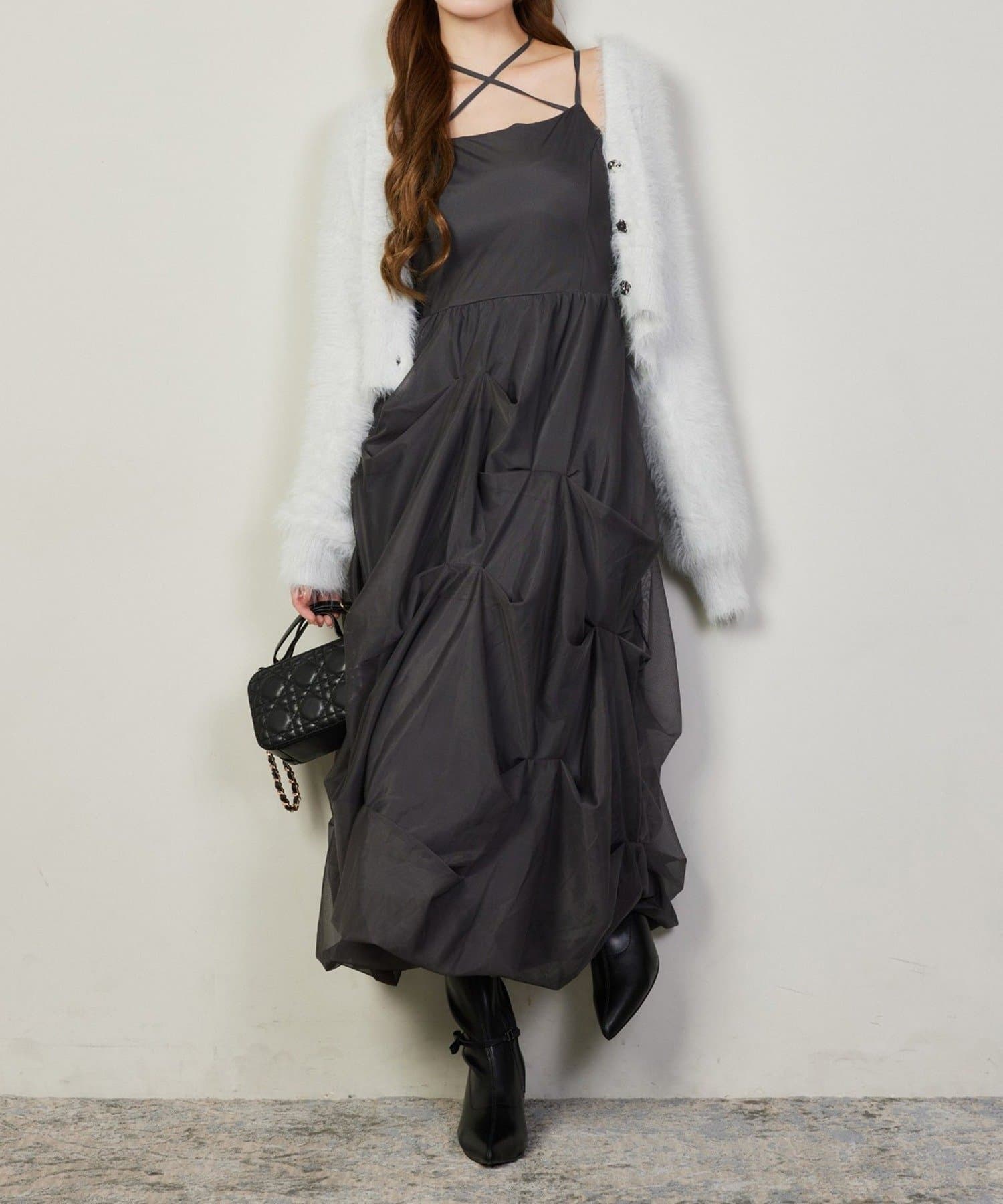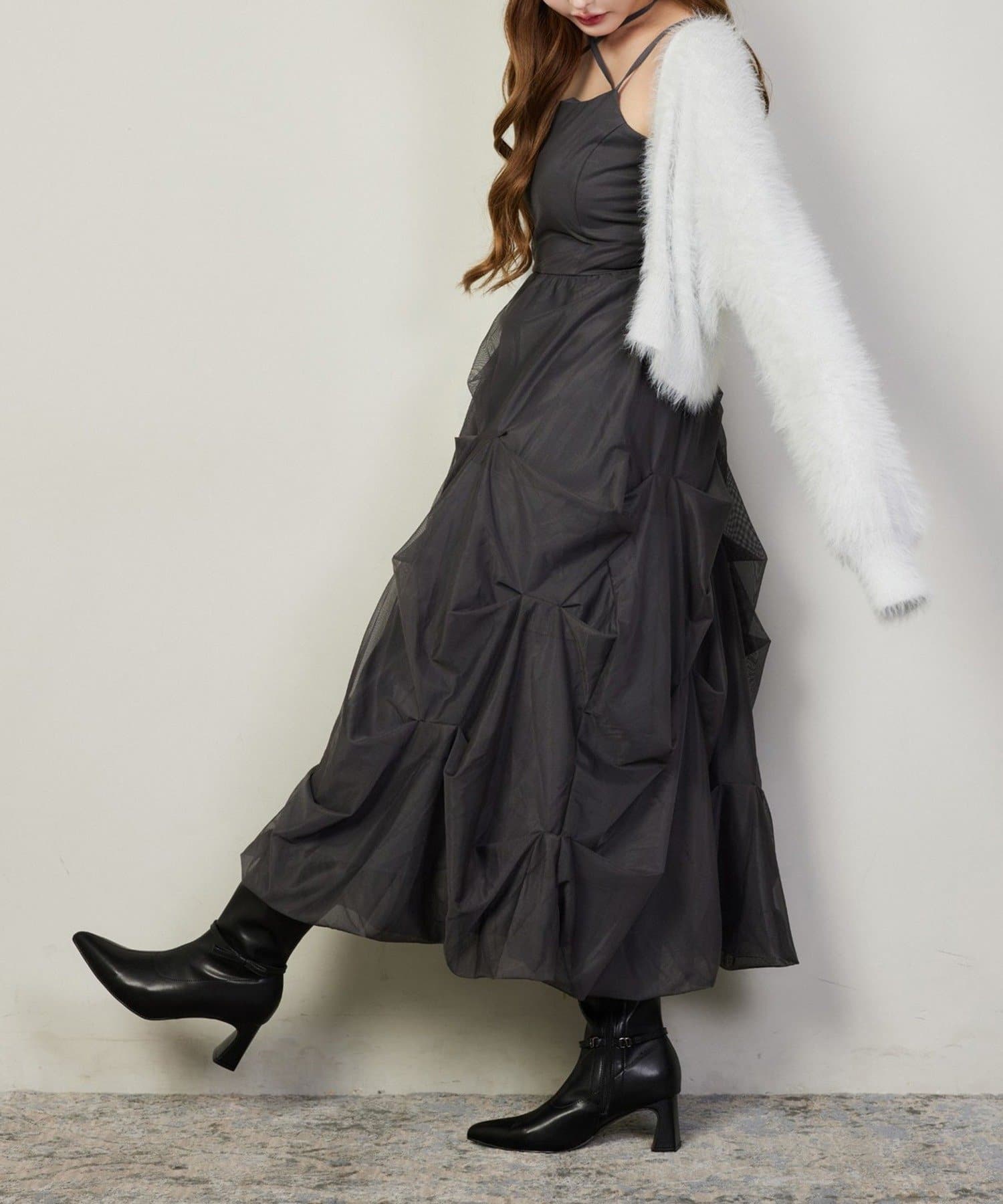 ふんわりと広がる3段バルーンデザインが華やかなキャミロングワンピ。