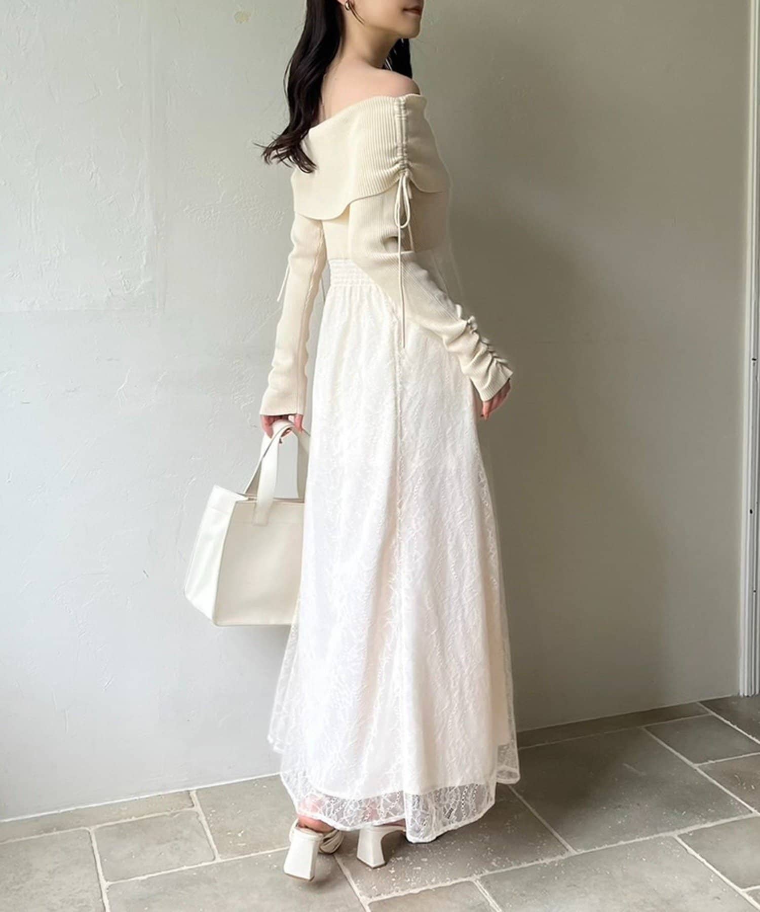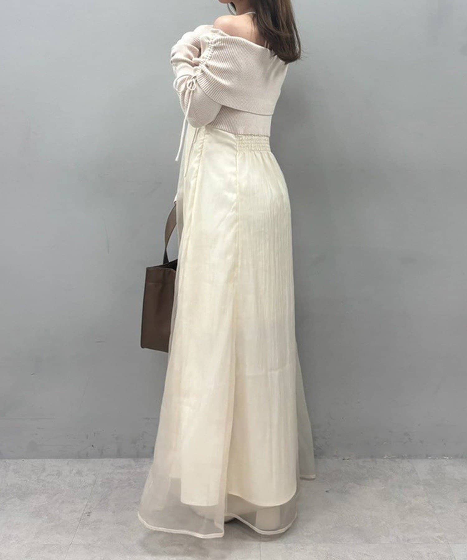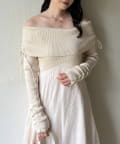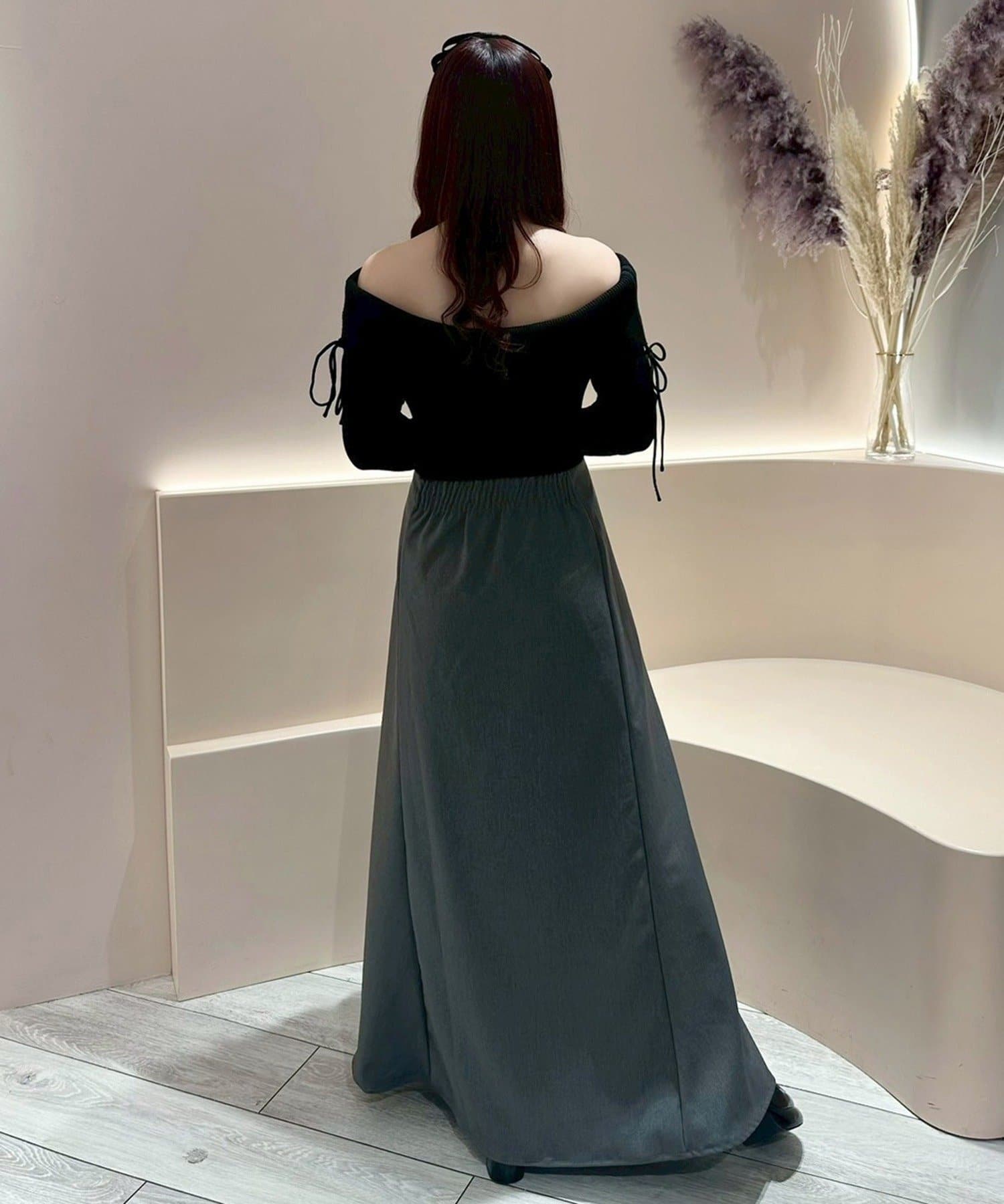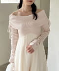 トップス部分はデコルテを綺麗に見せるオフショル仕様で、ほどよくフィットして女性らしい印象に。