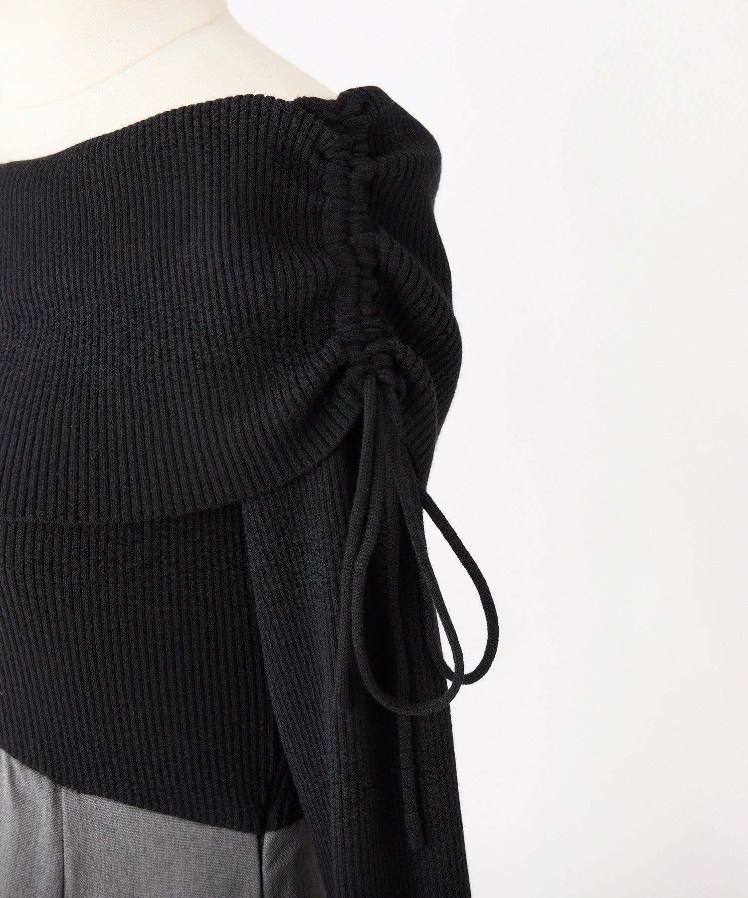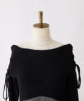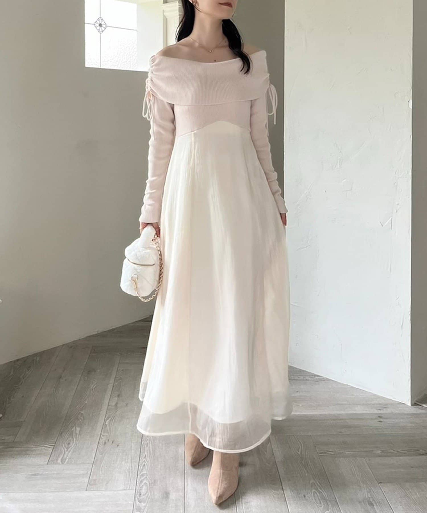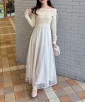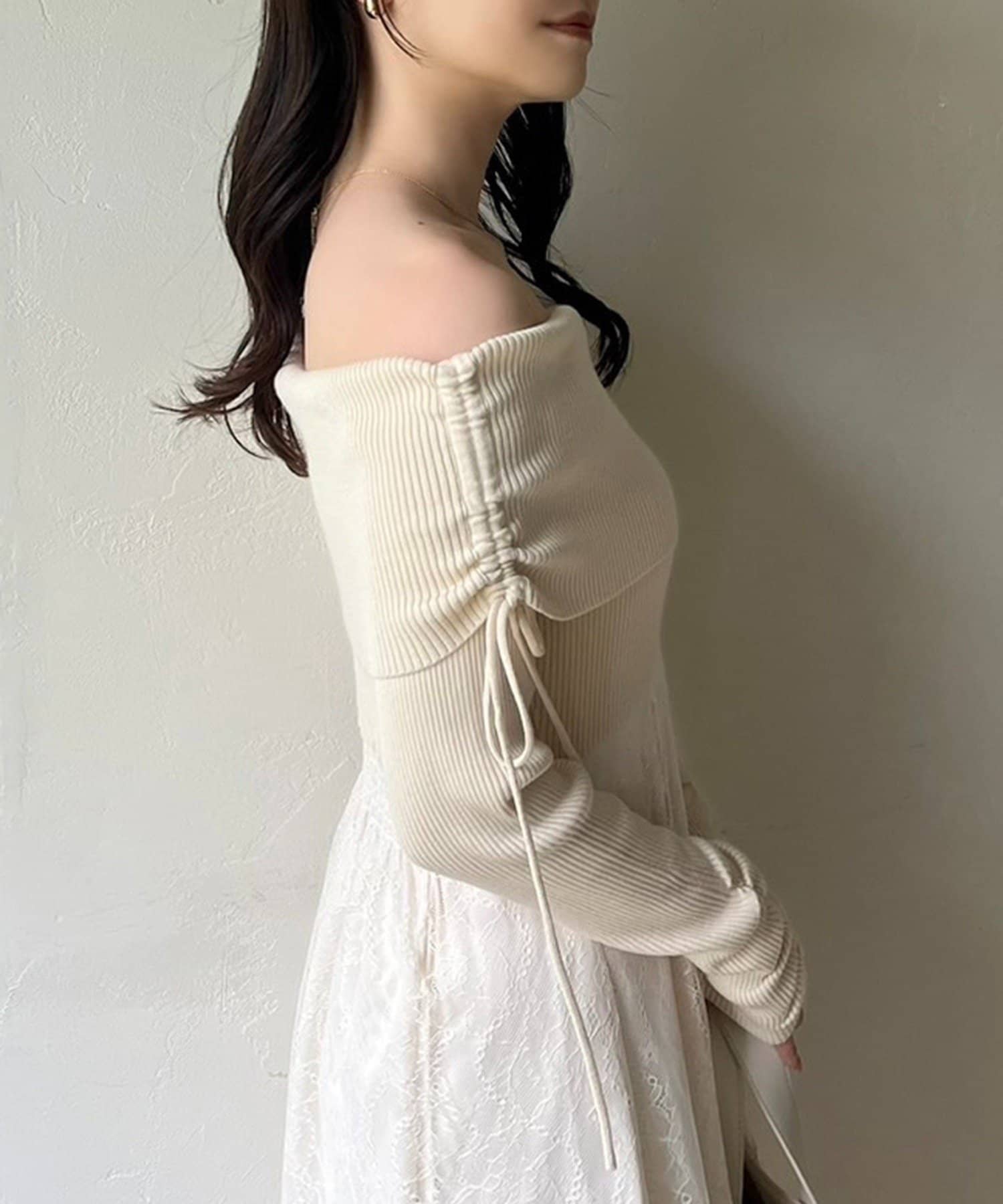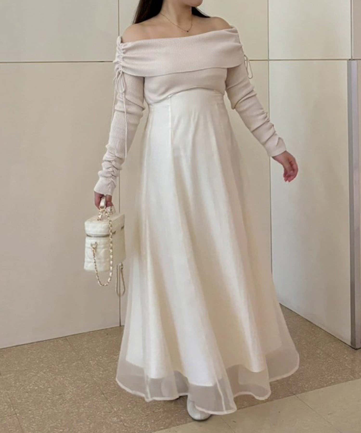 トップス部分はデコルテを綺麗に見せるオフショル仕様で、ほどよくフィットして女性らしい印象に。