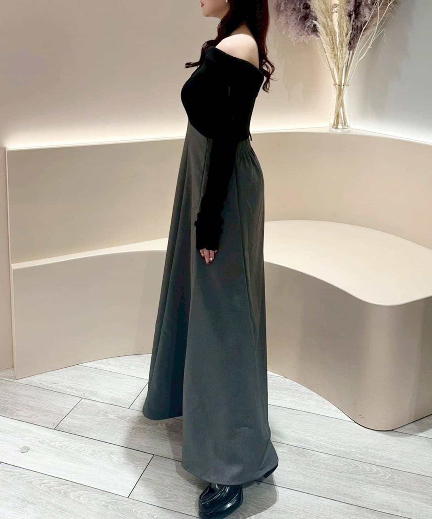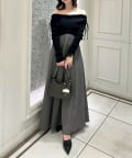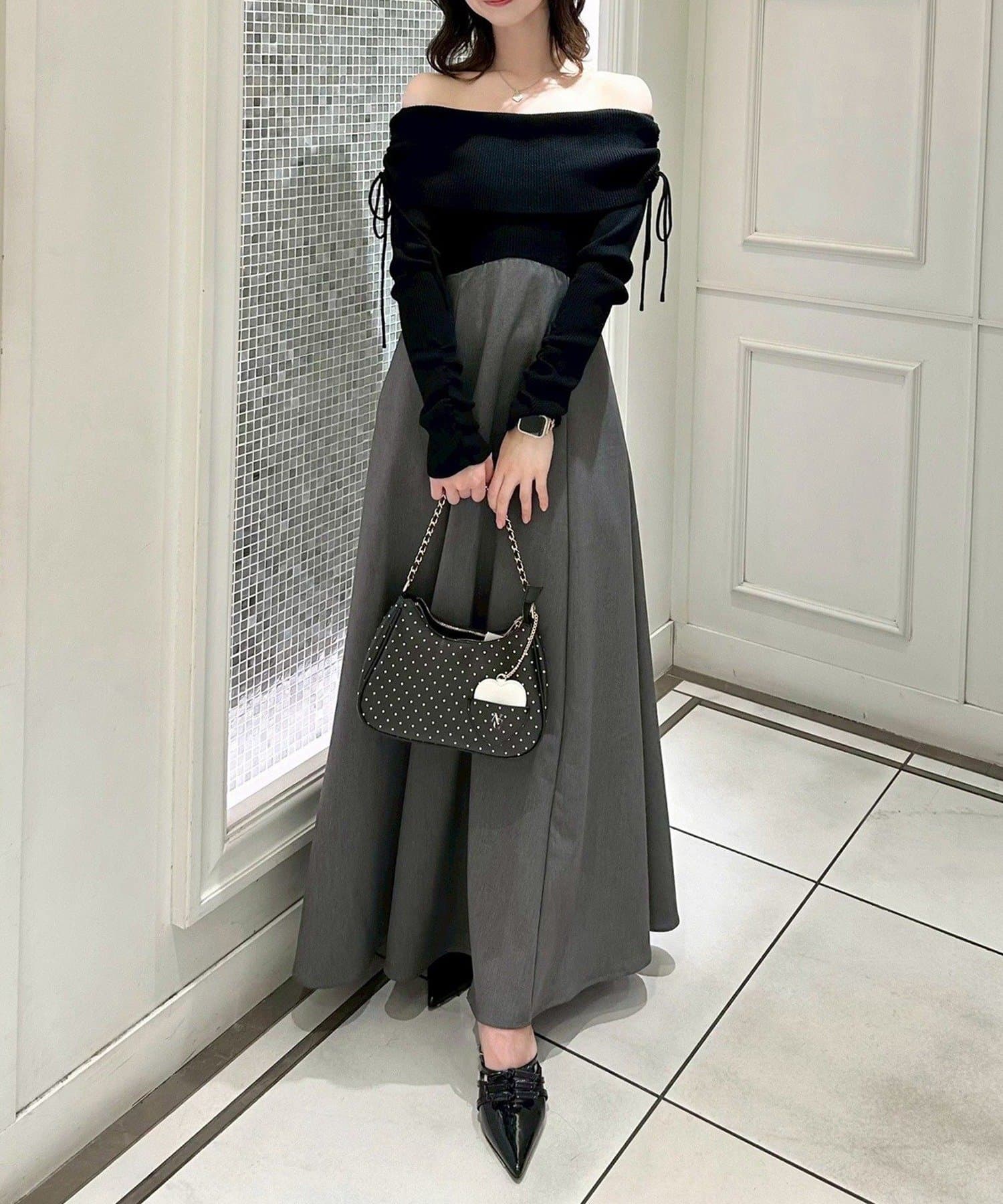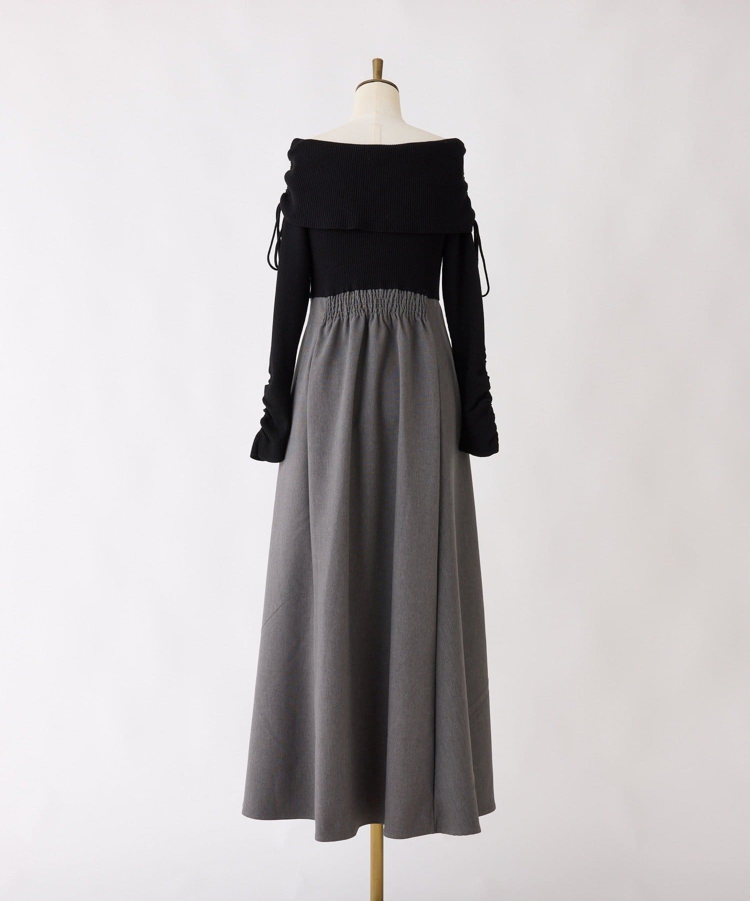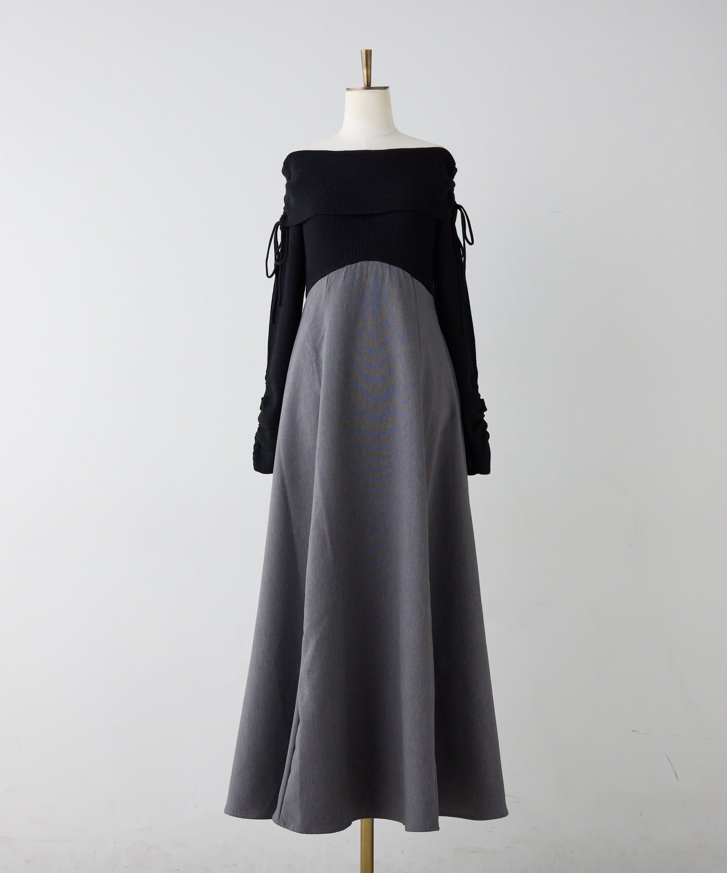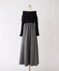 オフショルニットとマーメイドシルエットのワングスカートを組み合わせた、ドッキングデザインのワンピース。