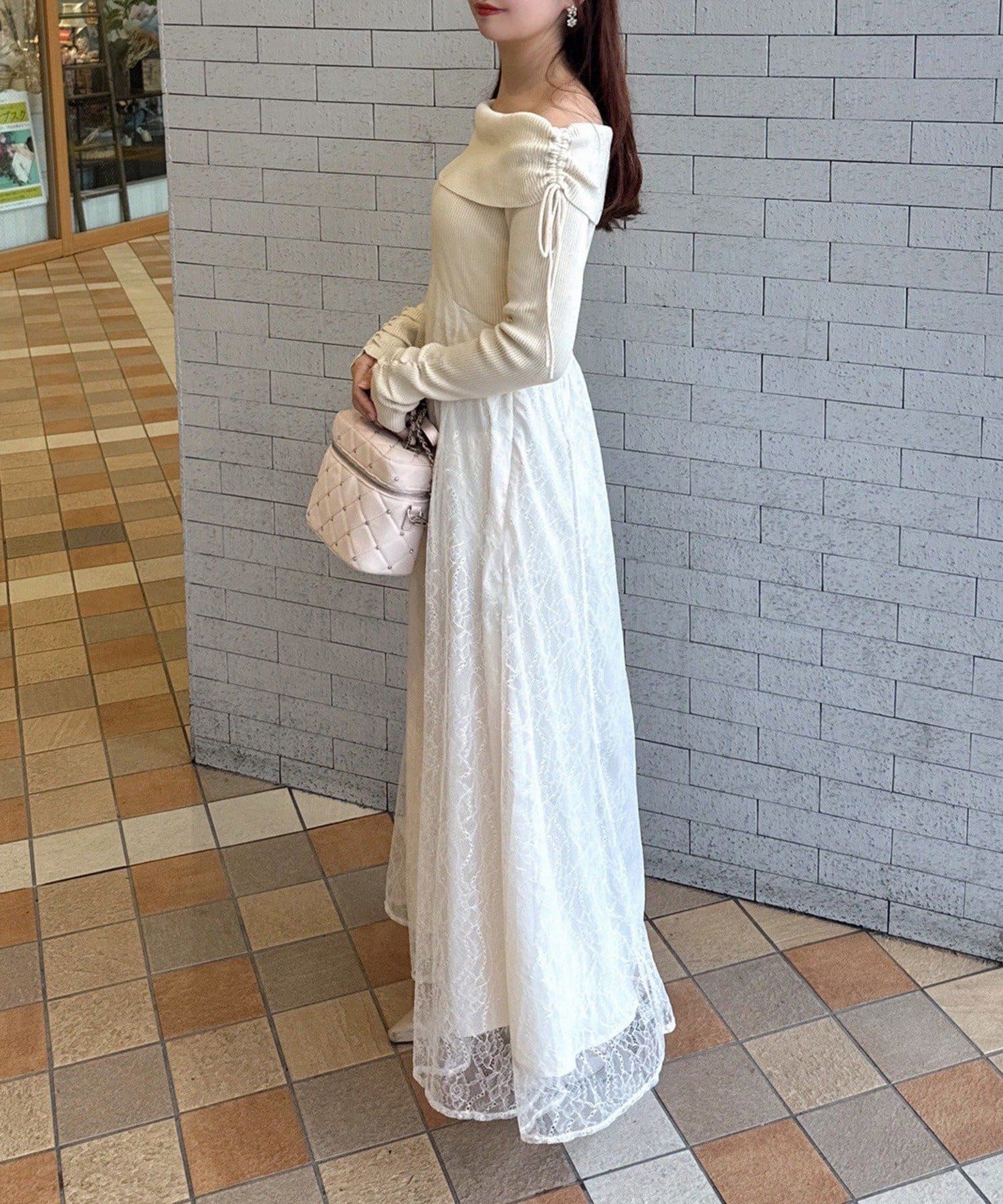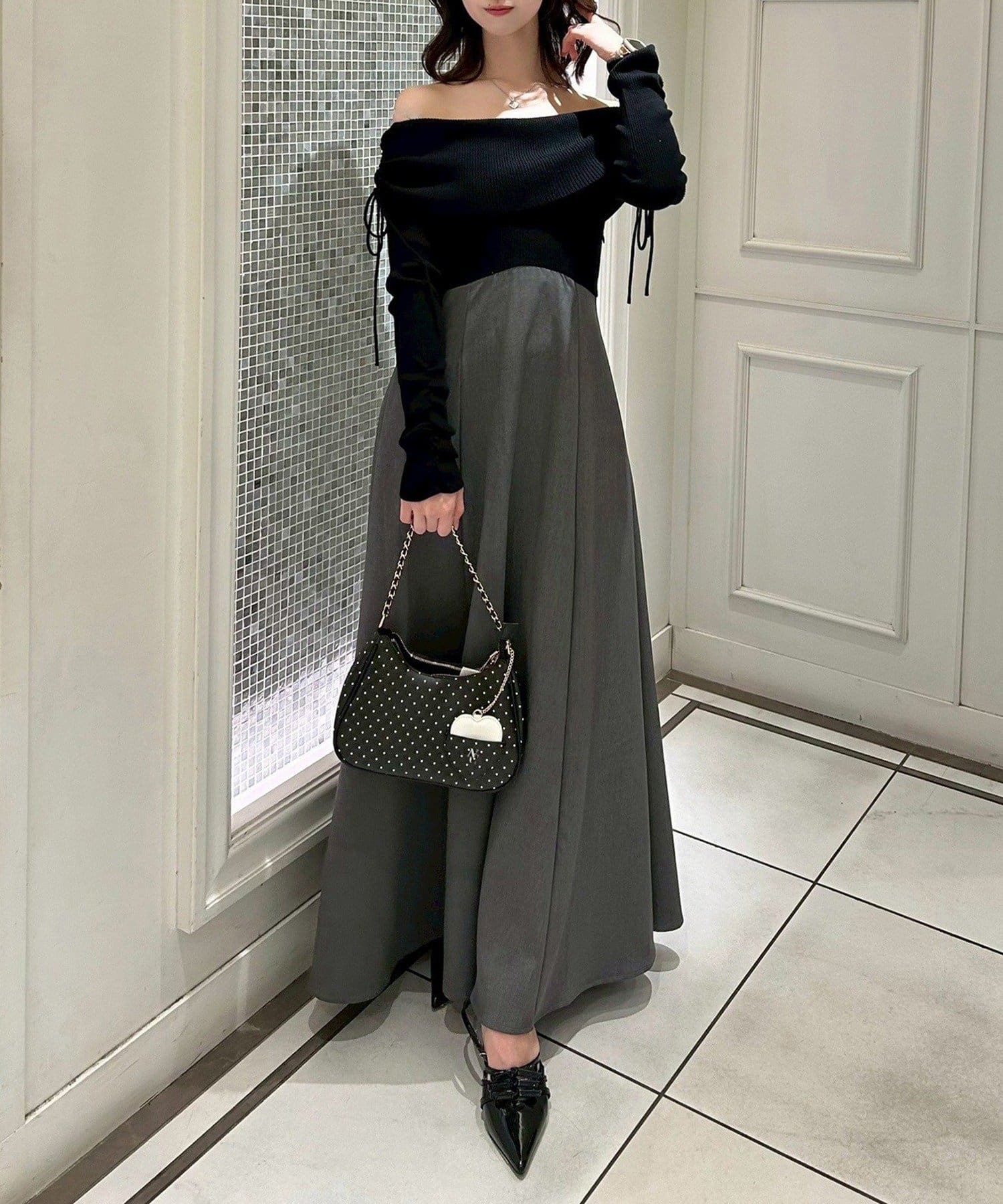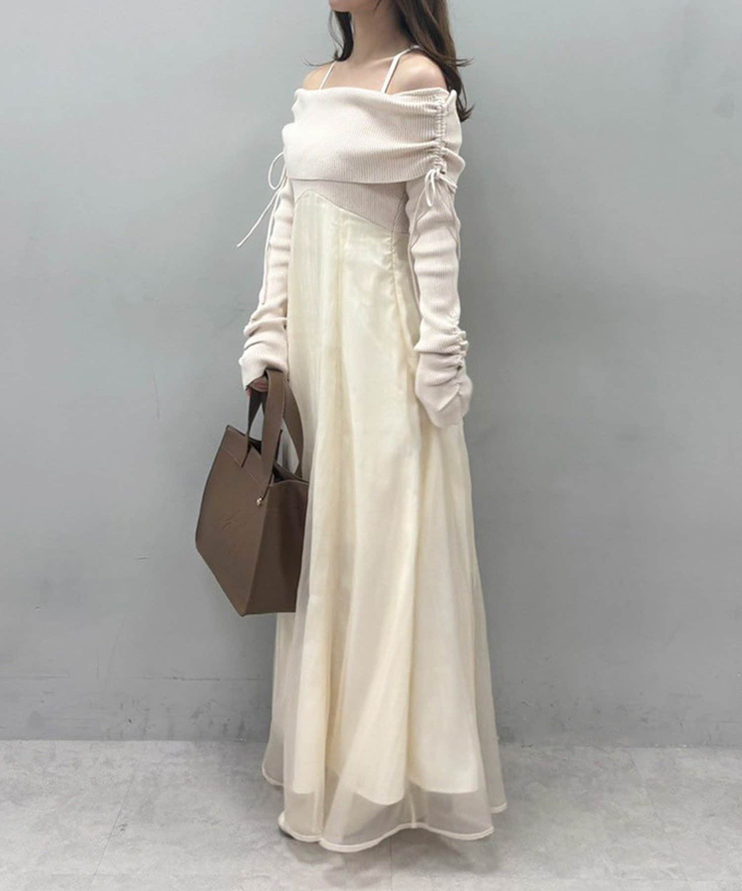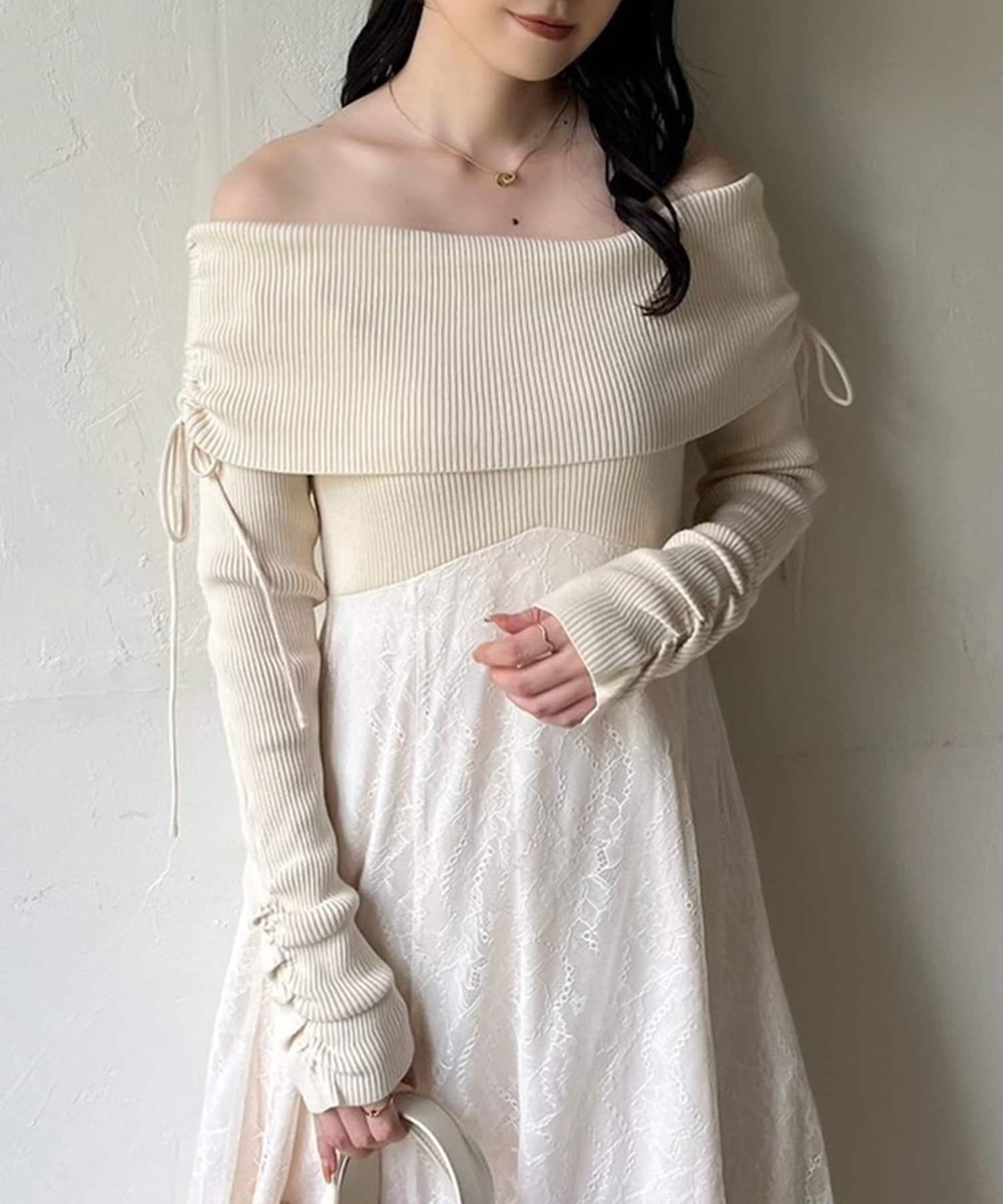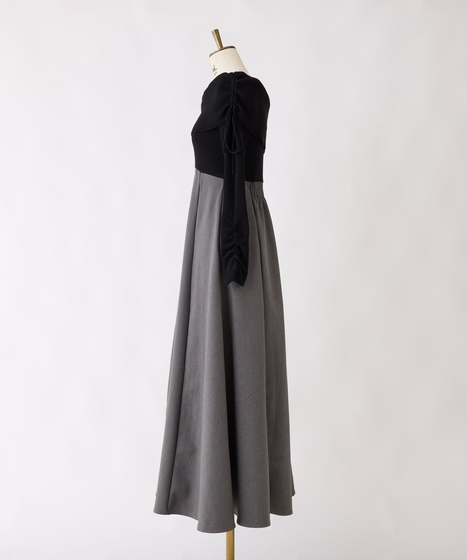 オフショルニットとマーメイドシルエットのワングスカートを組み合わせた、ドッキングデザインのワンピース。
