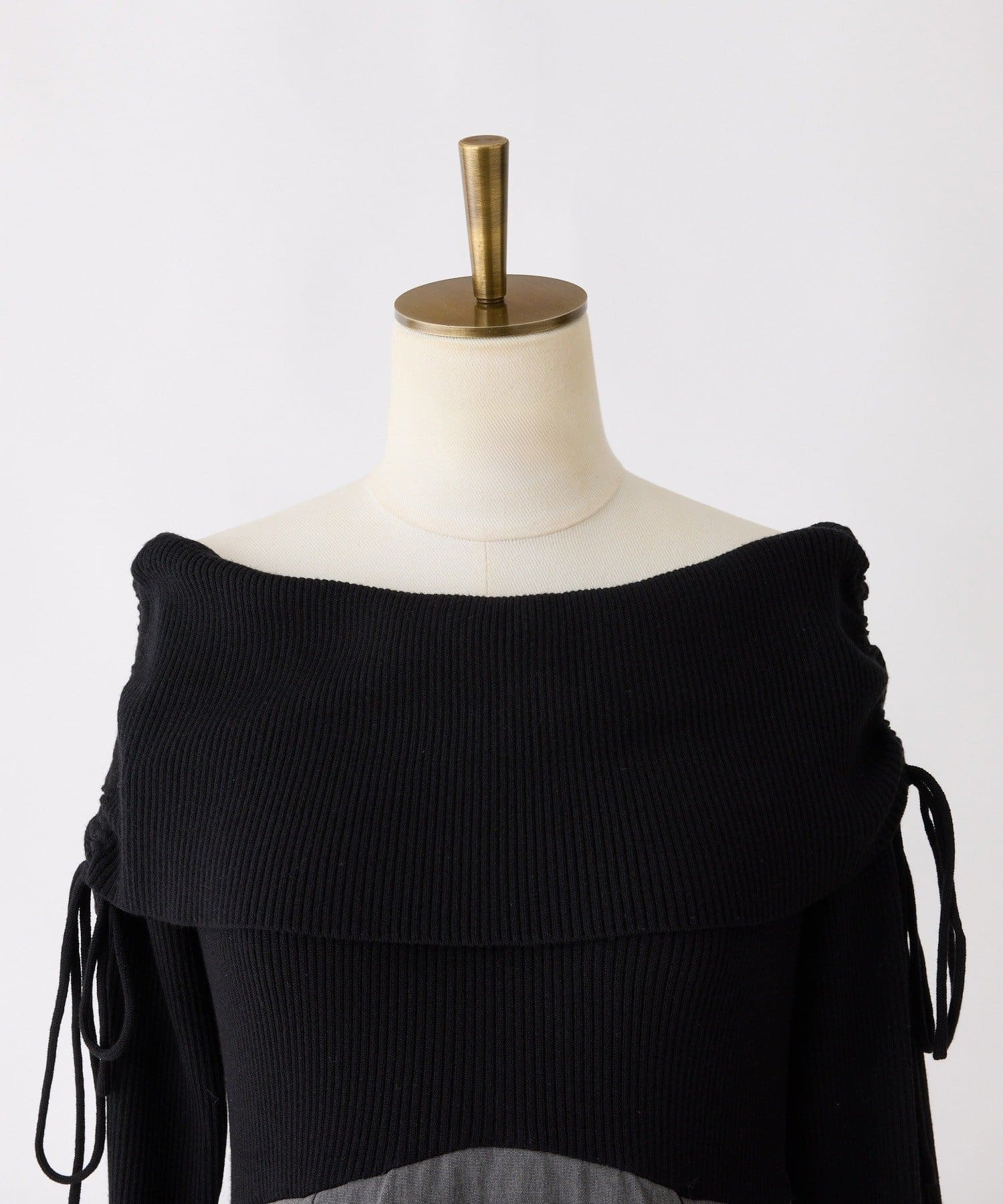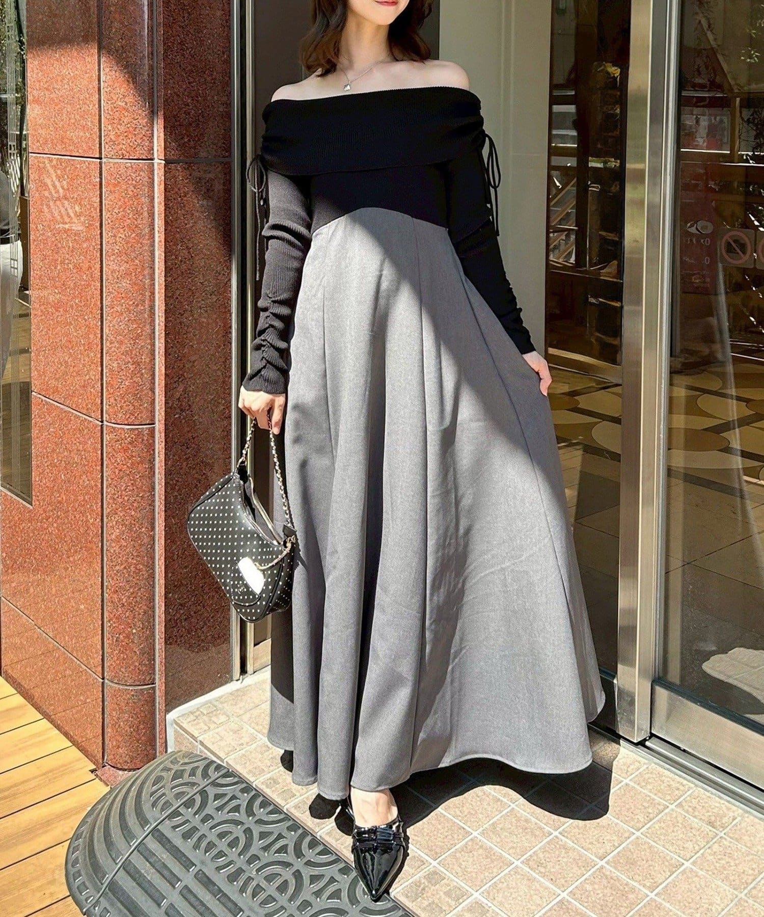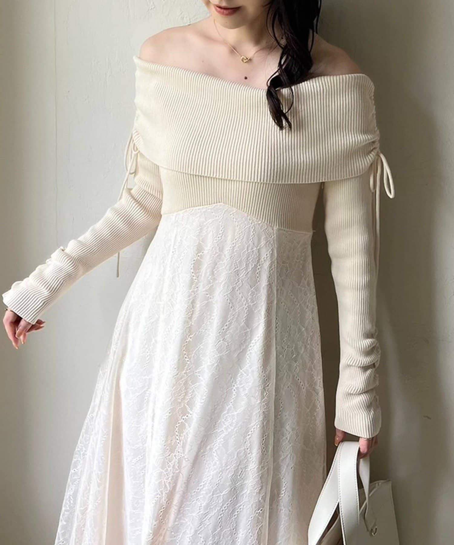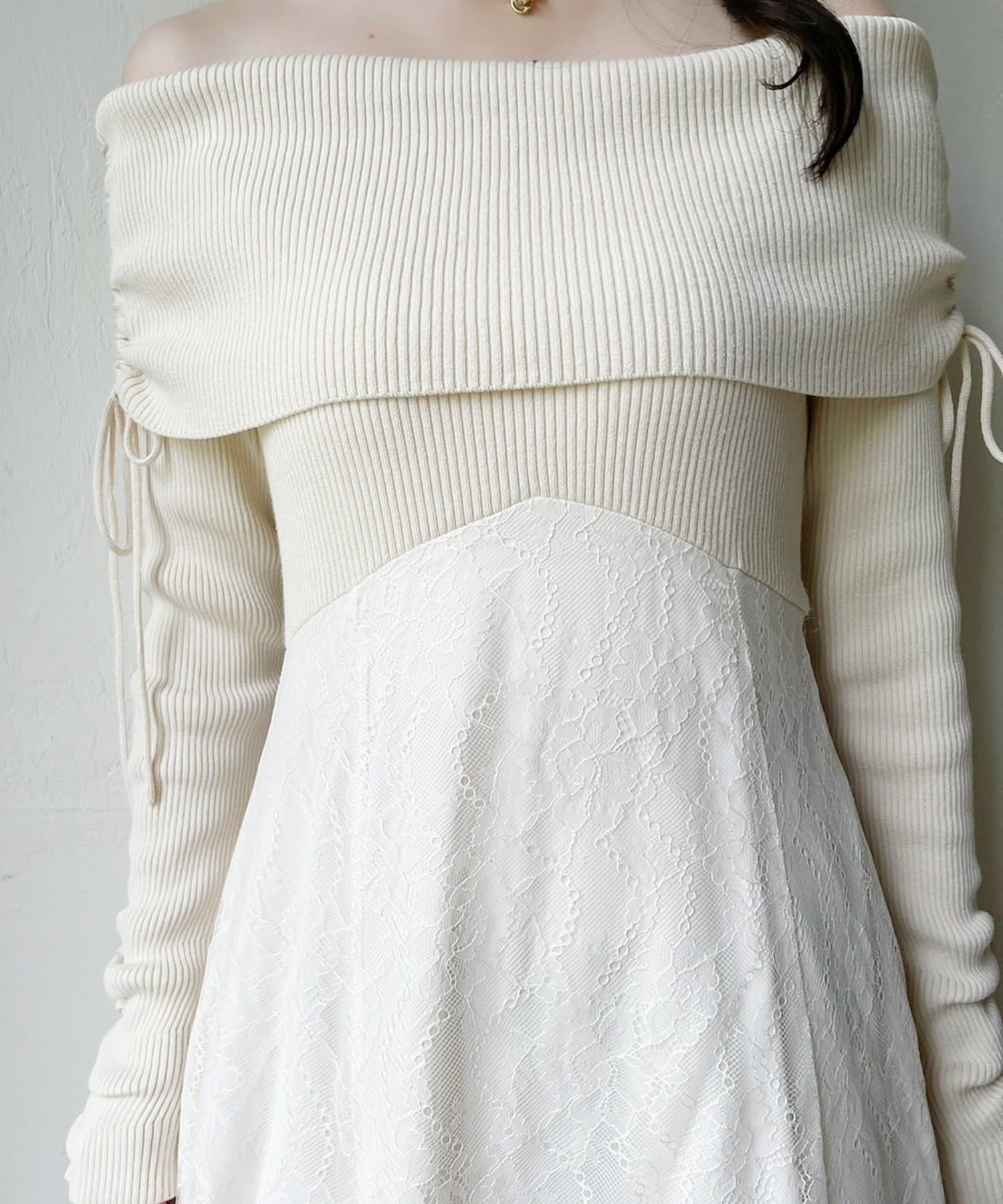 オフショルニットとマーメイドシルエットのワングスカートを組み合わせた、ドッキングデザインのワンピース。