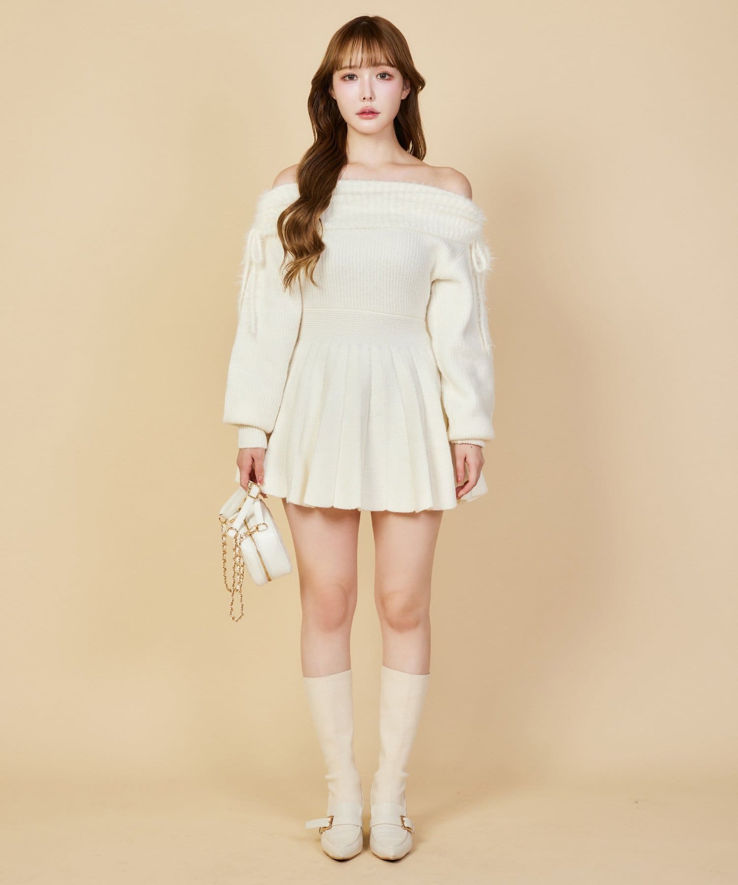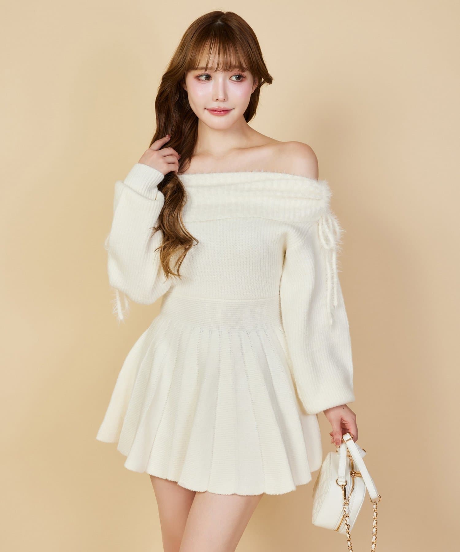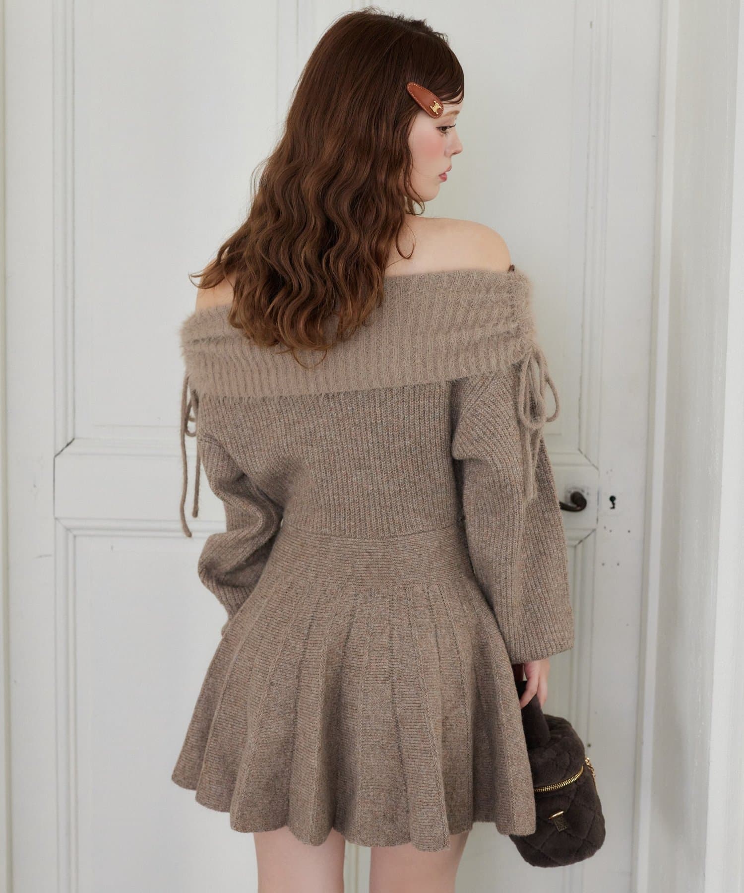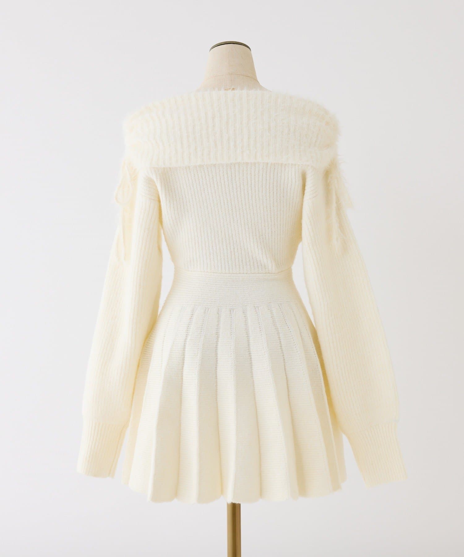 オフショルプリーツニットミニワンピ
