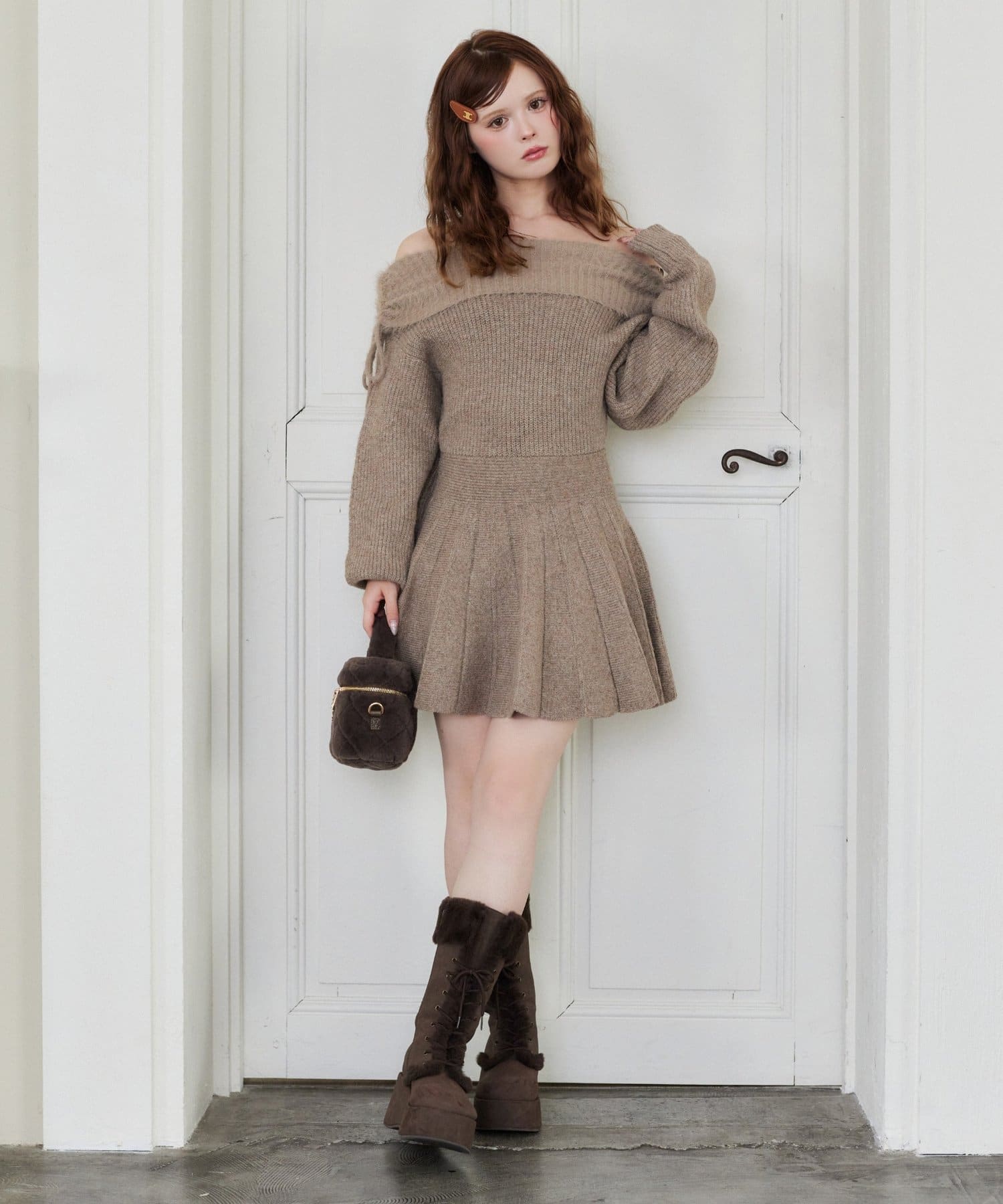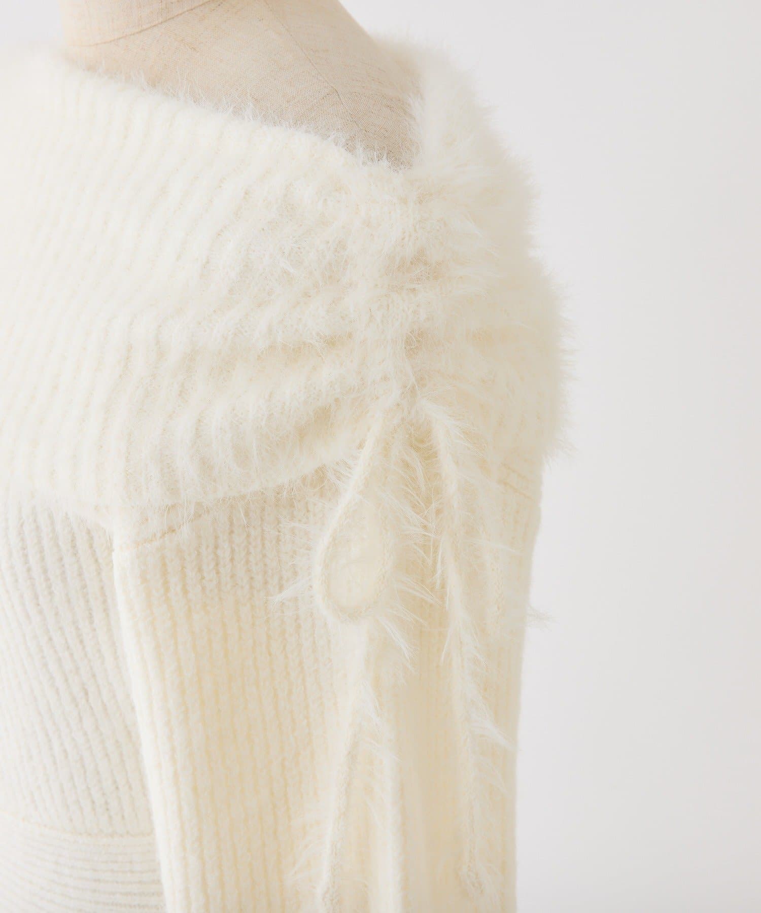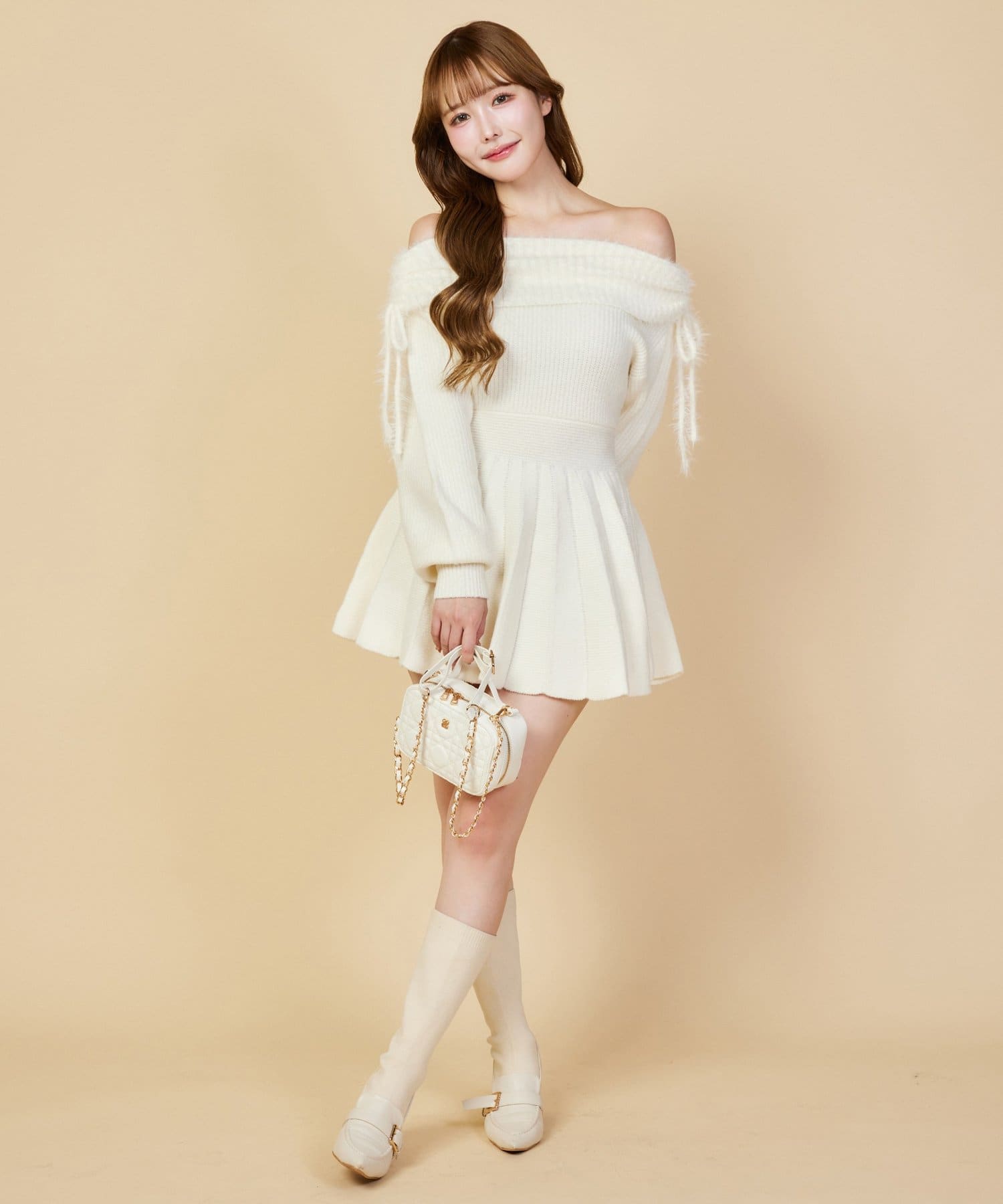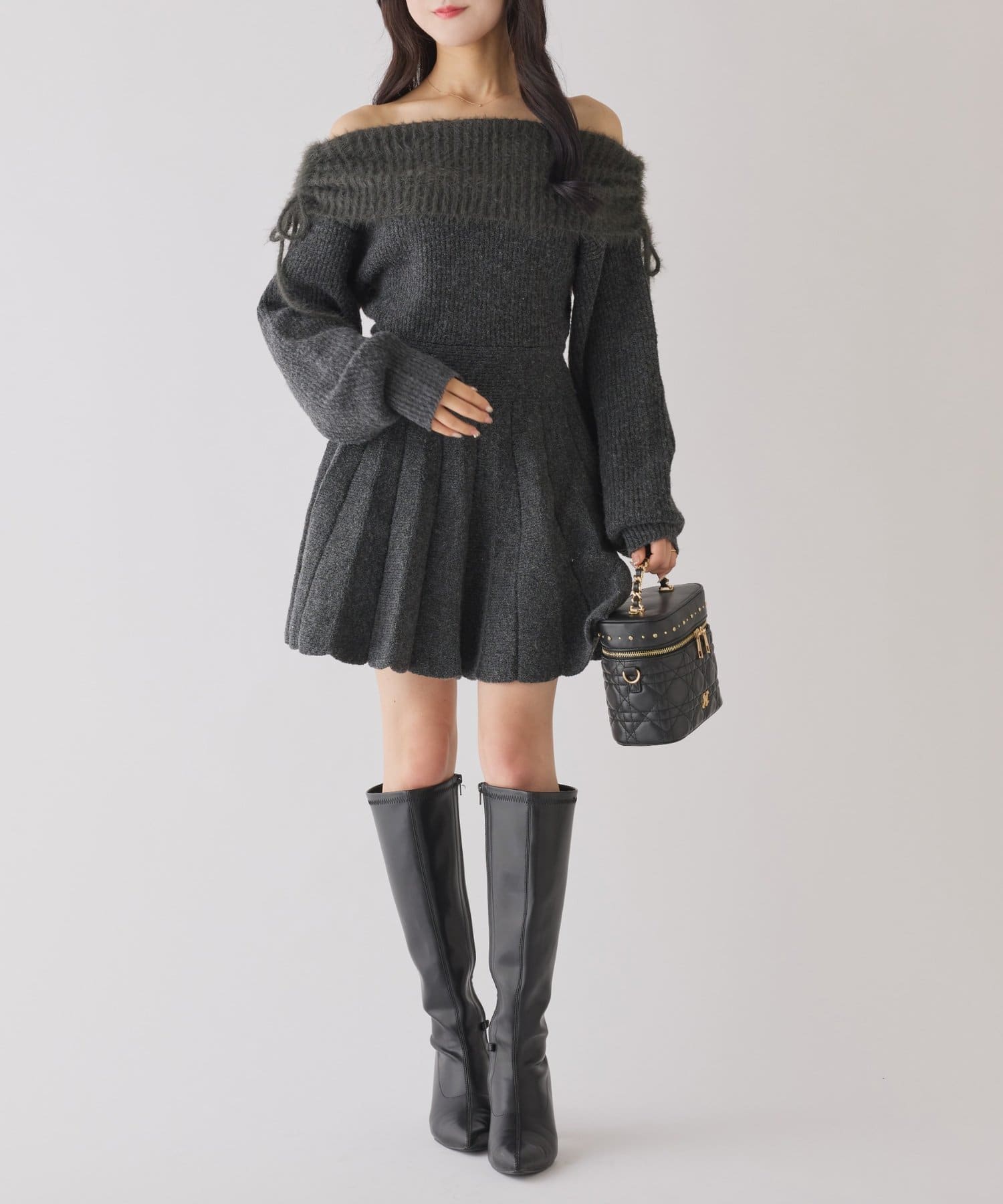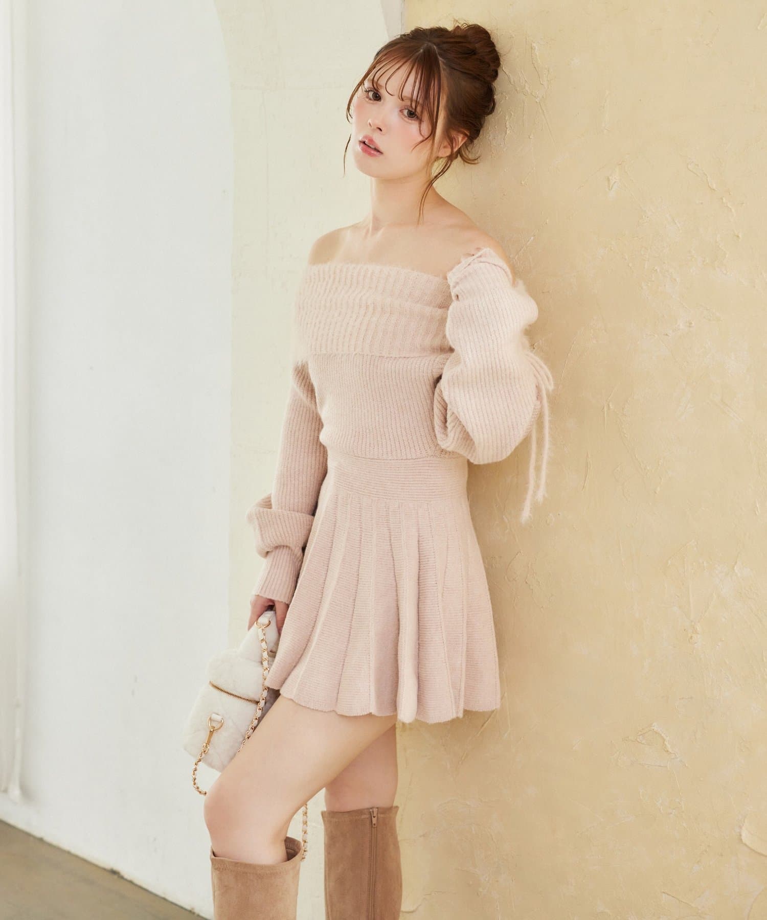 オフショルプリーツニットミニワンピ