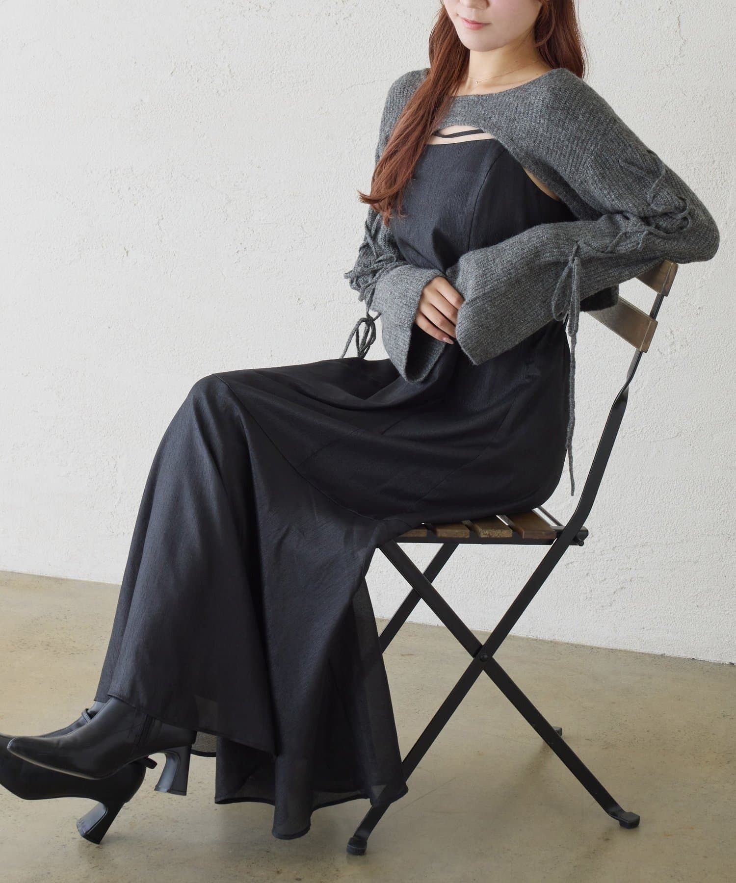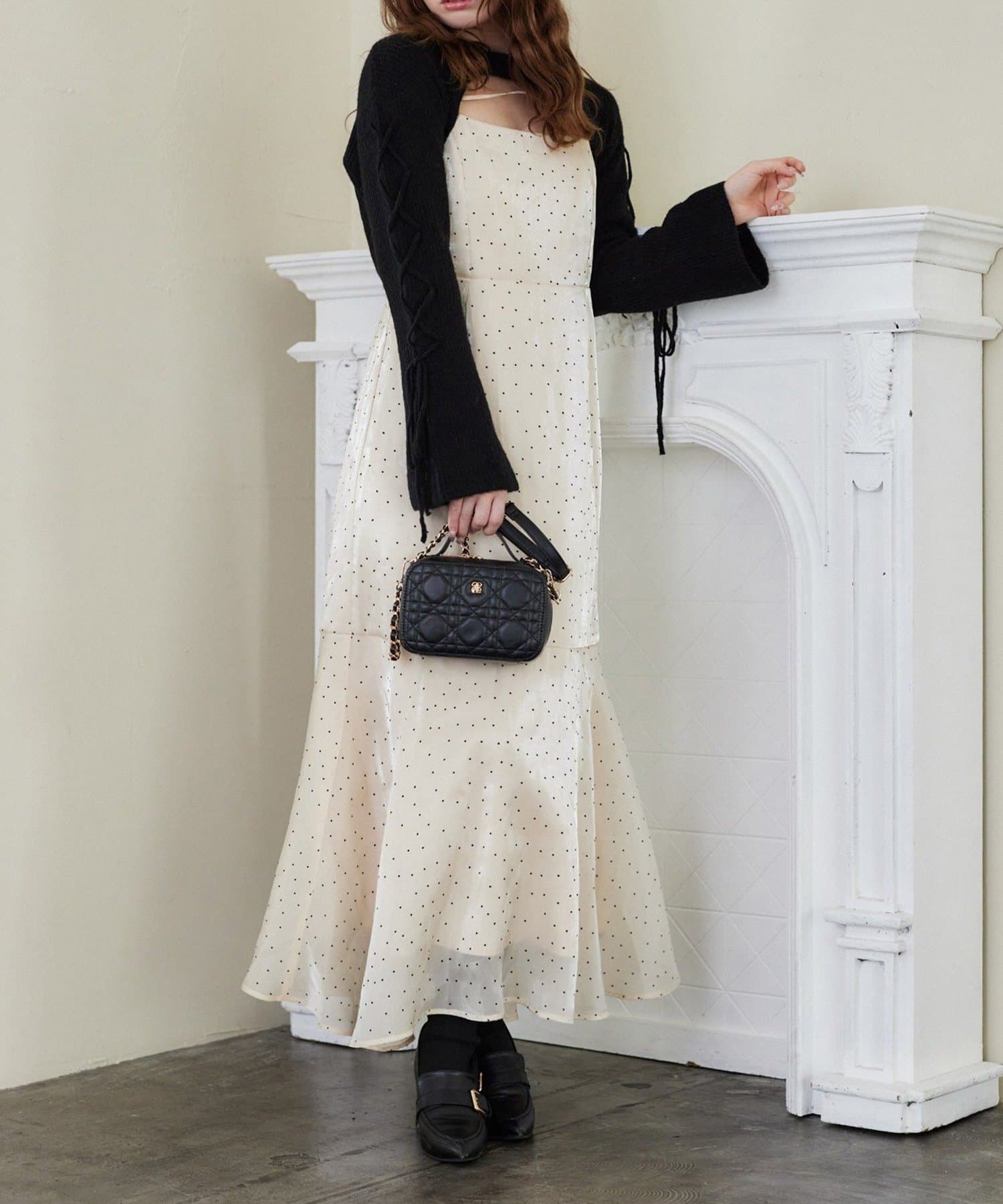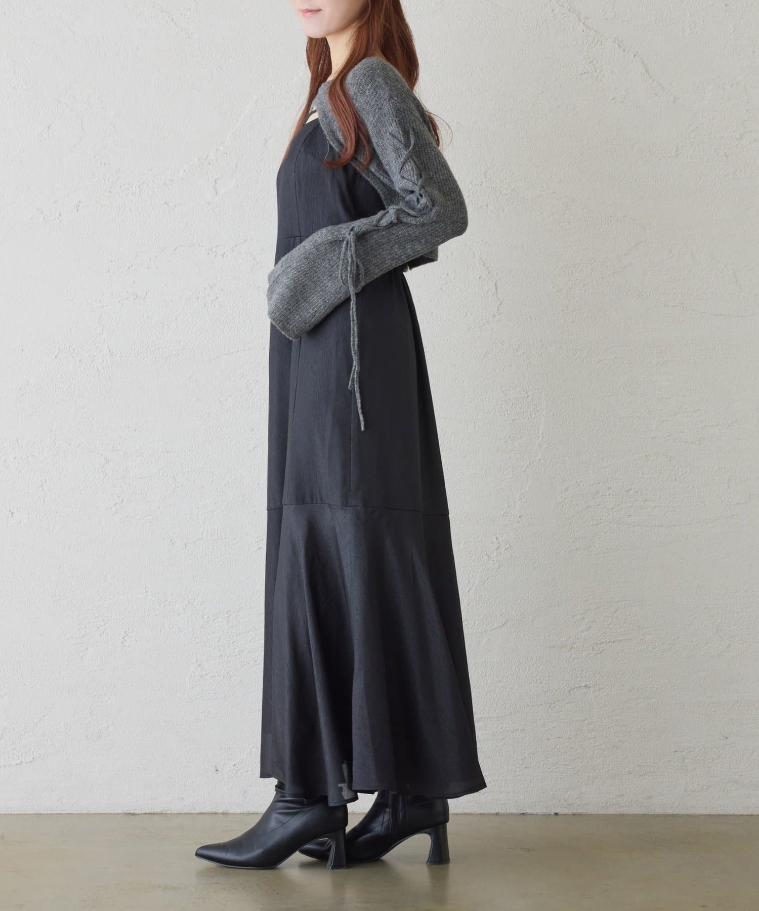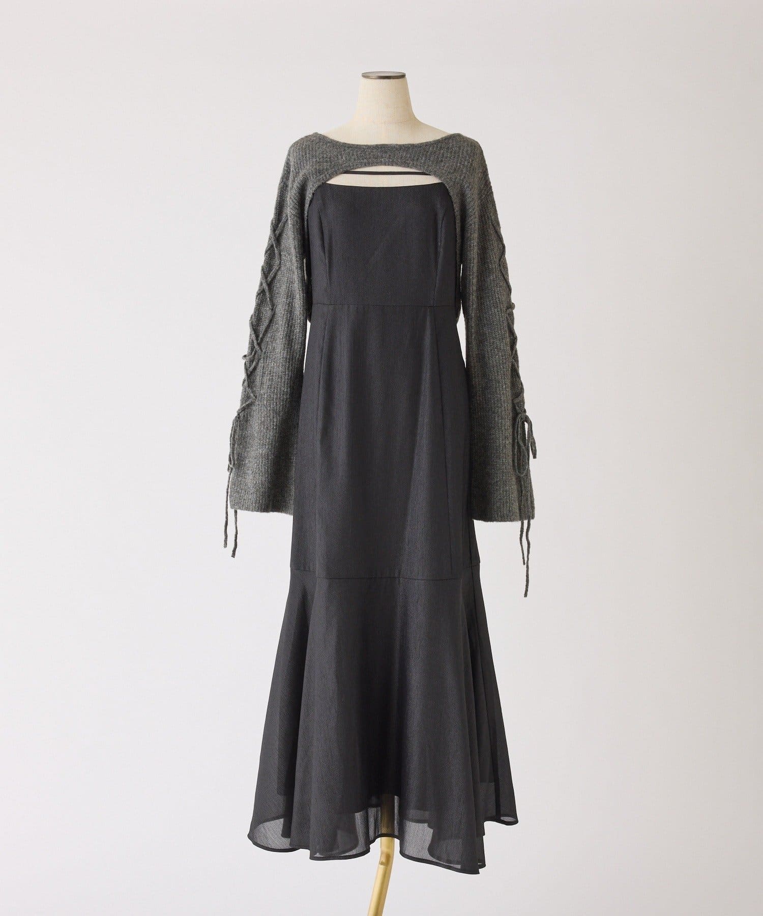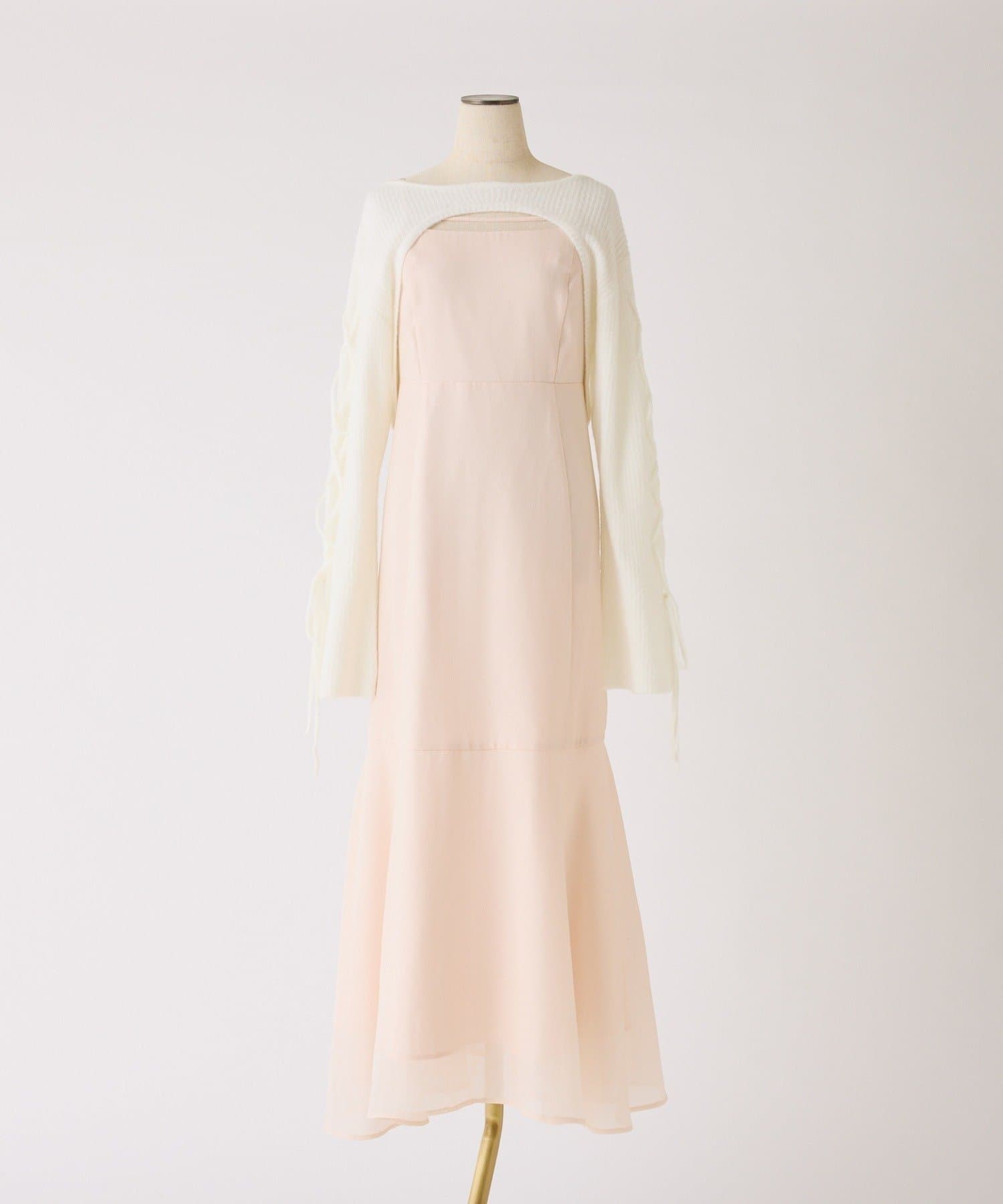 女性らしいマーメイドシルエットが魅力のキャミワンピースに、前後2WAYで着られるカーディガンがセットになったアイテム。