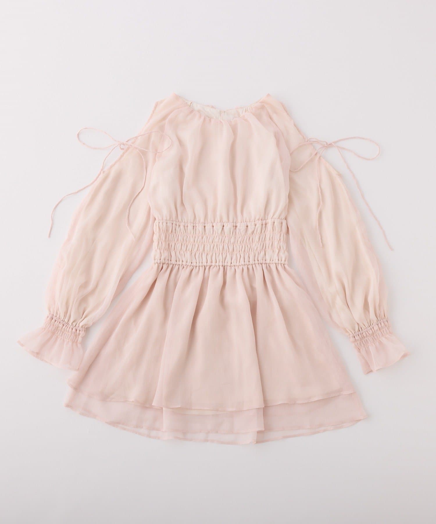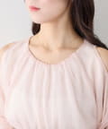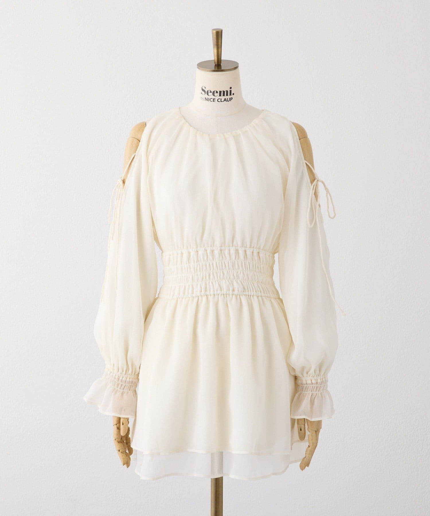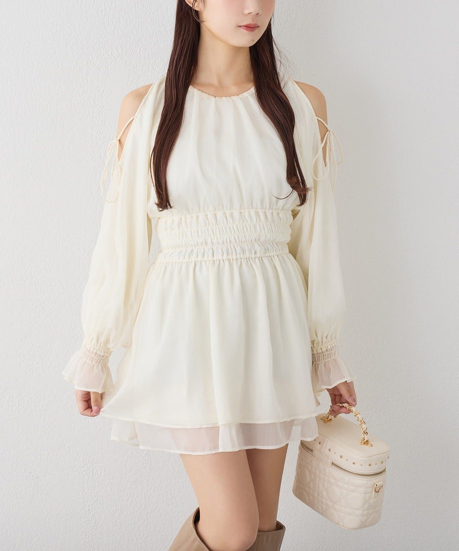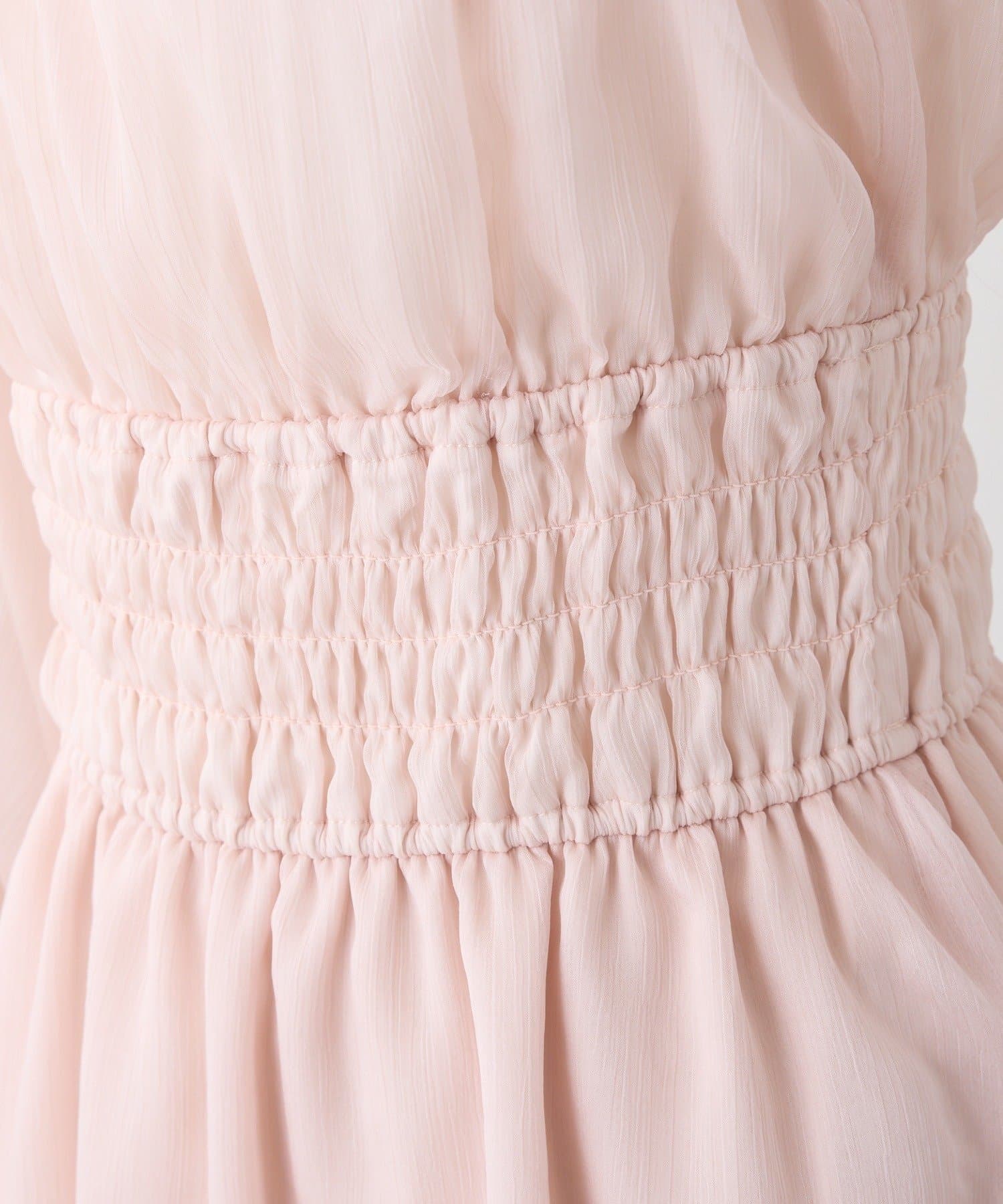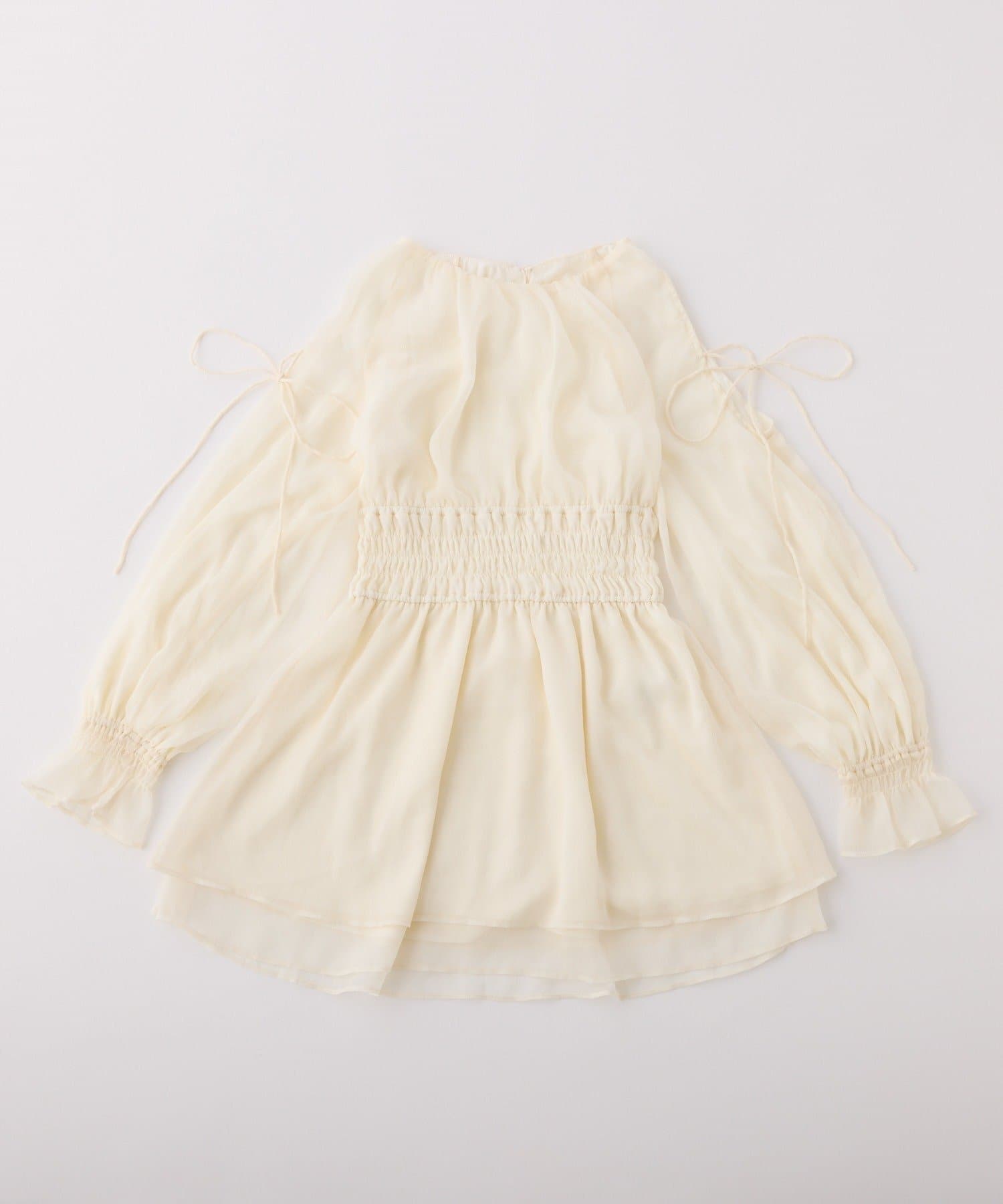 肩や腕まわりをすっきり見せつつ、ウエストのギャザーで女性らしいシルエットに仕上げました。