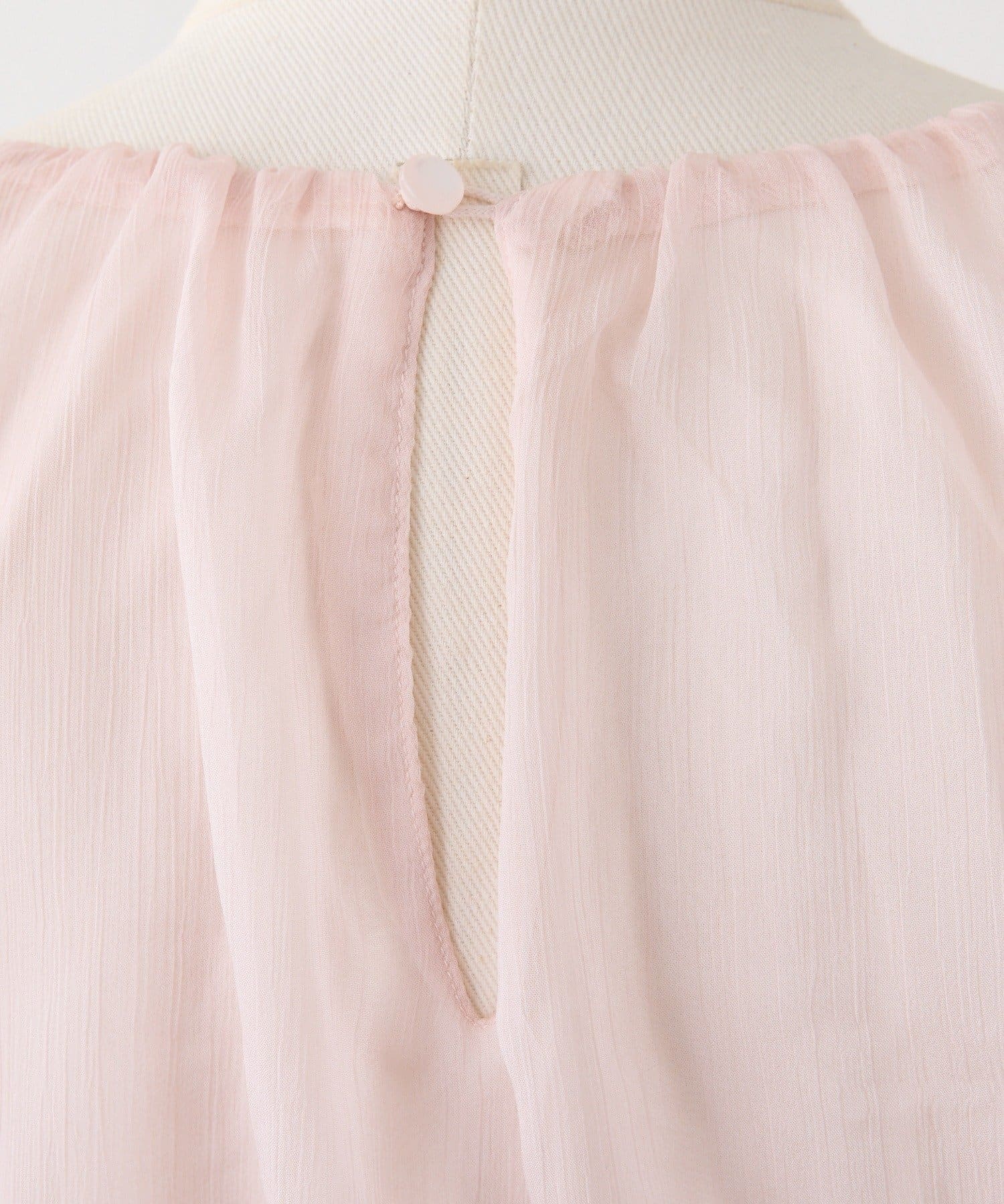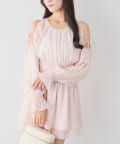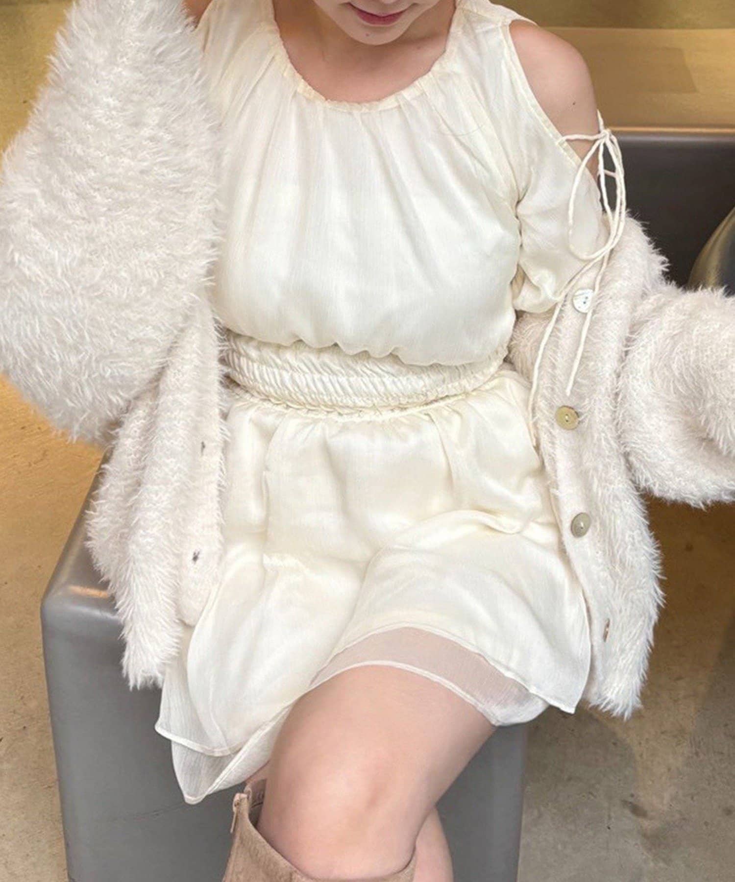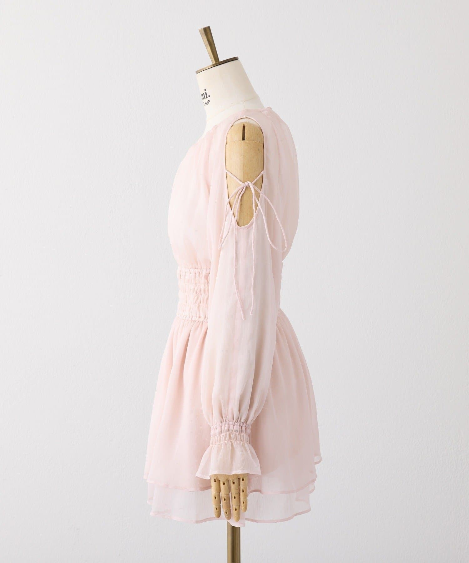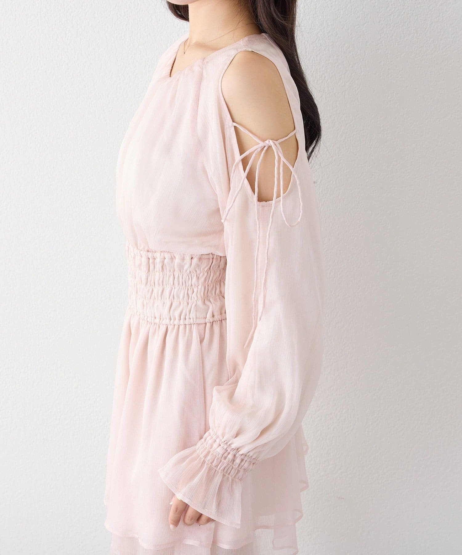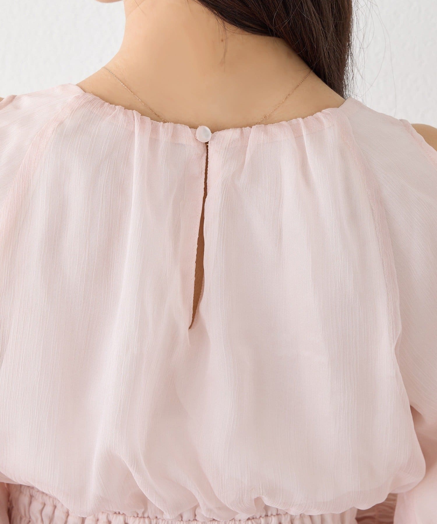 肩や腕まわりをすっきり見せつつ、ウエストのギャザーで女性らしいシルエットに仕上げました。