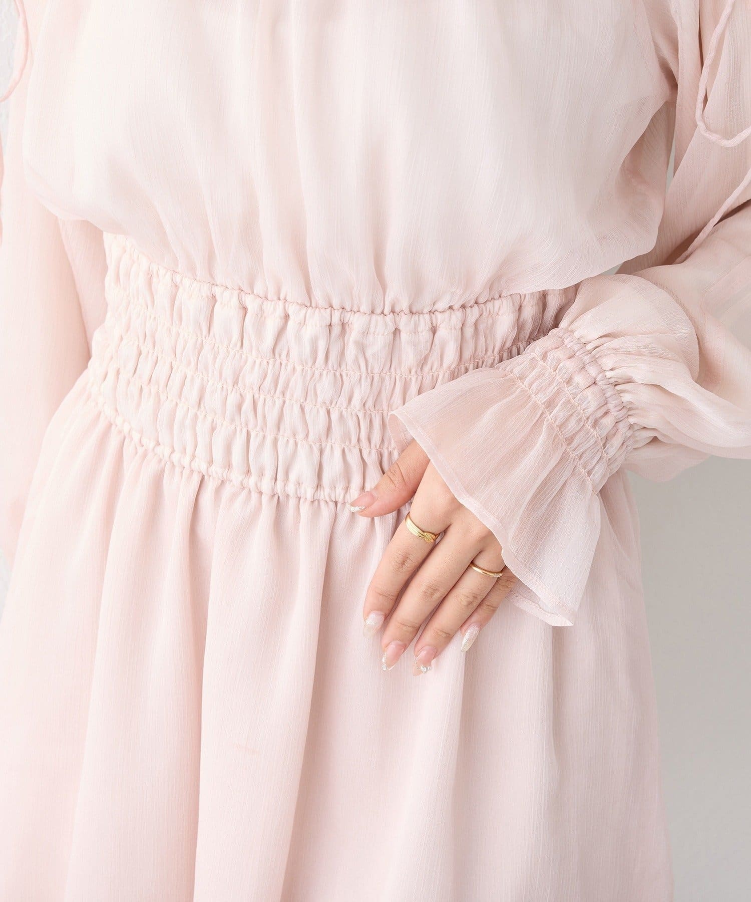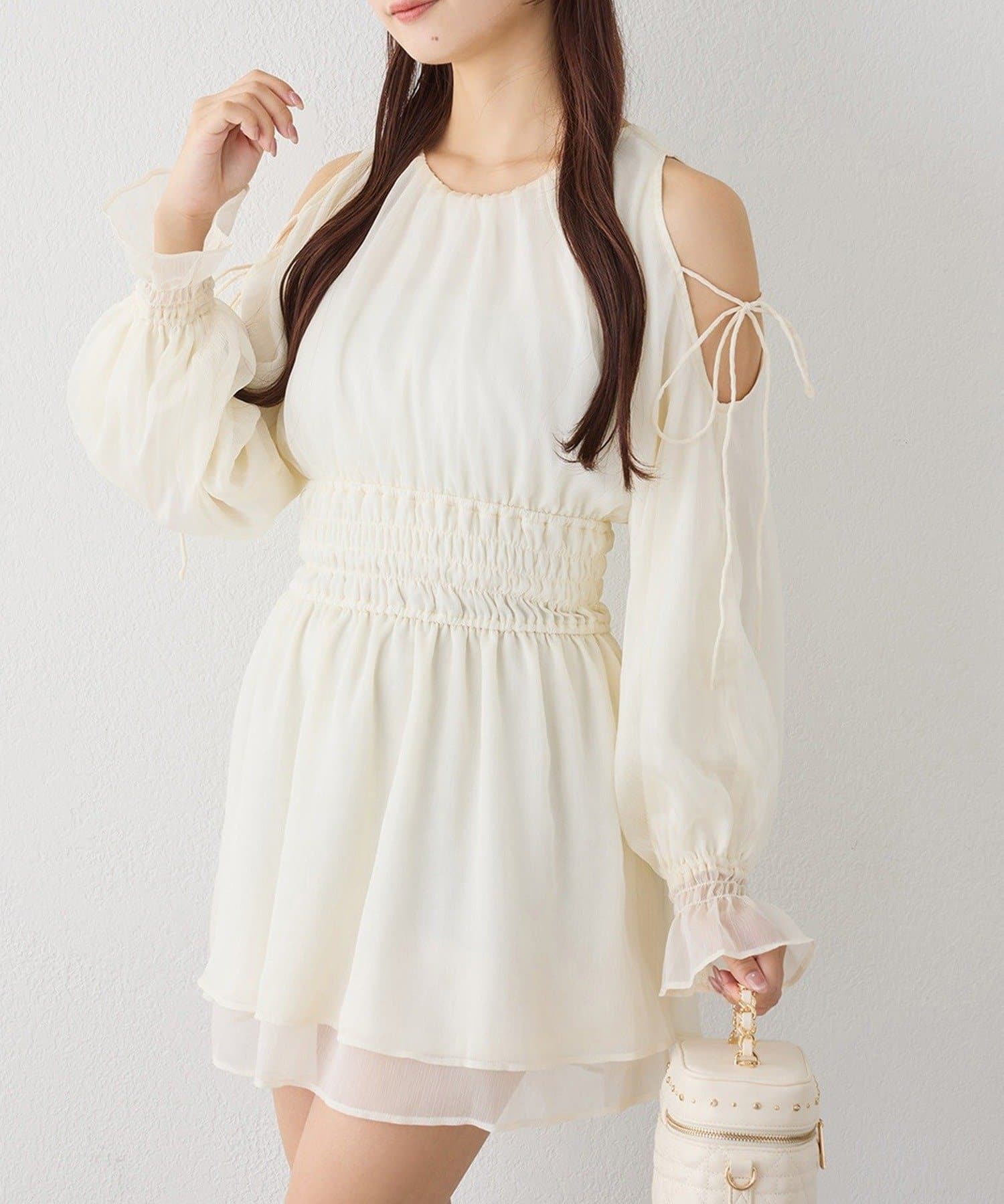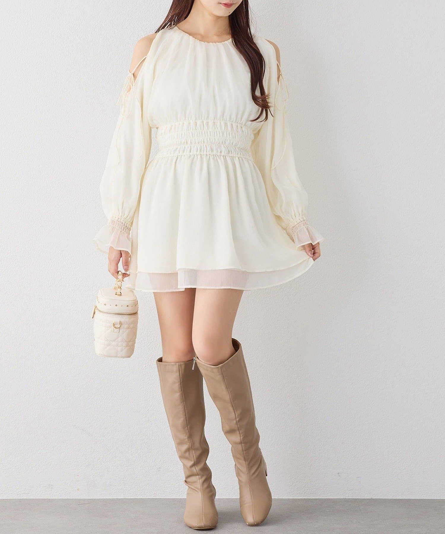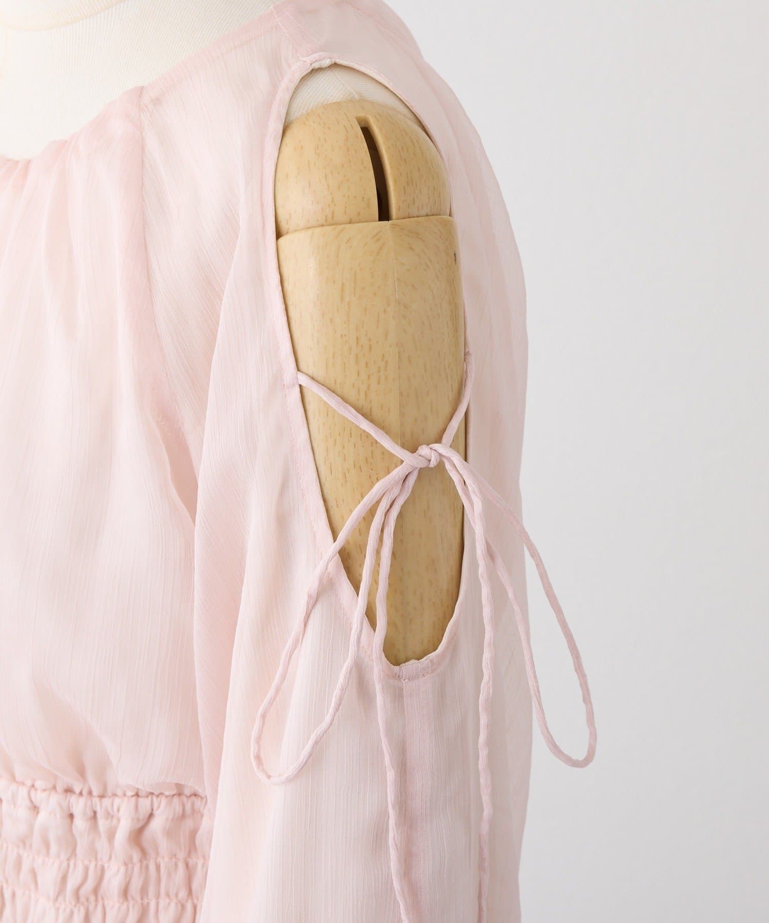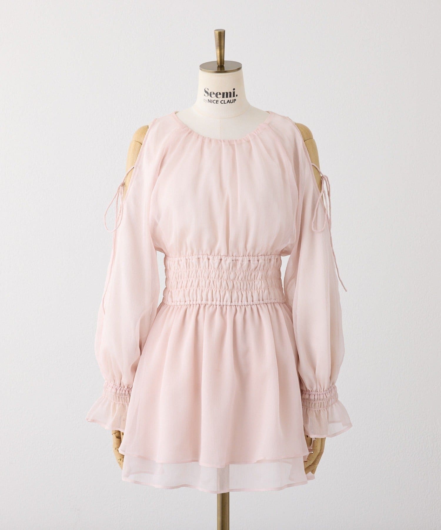 肩や腕まわりをすっきり見せつつ、ウエストのギャザーで女性らしいシルエットに仕上げました。