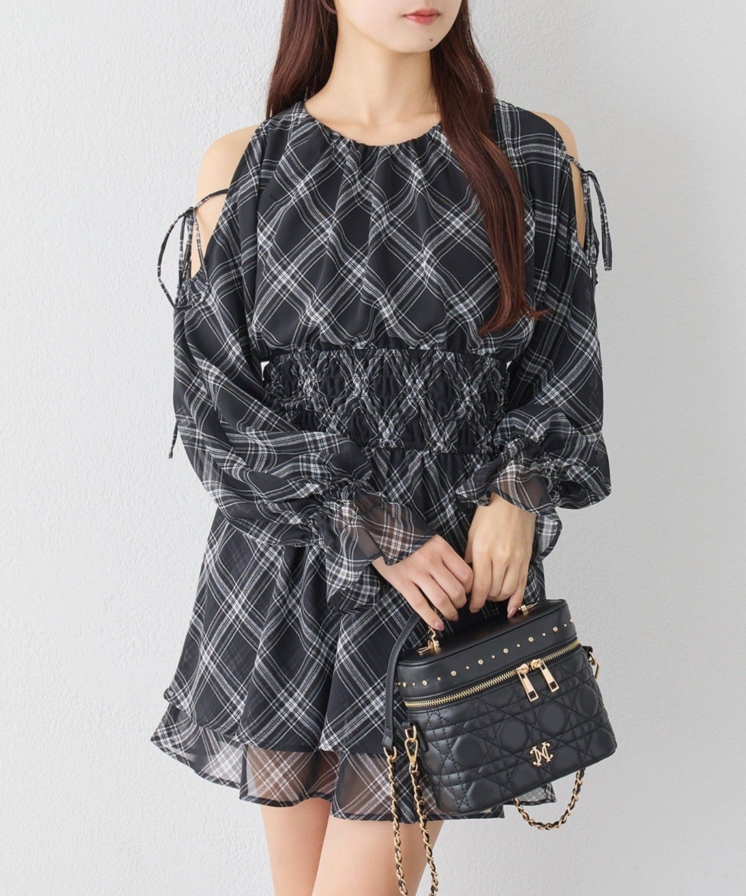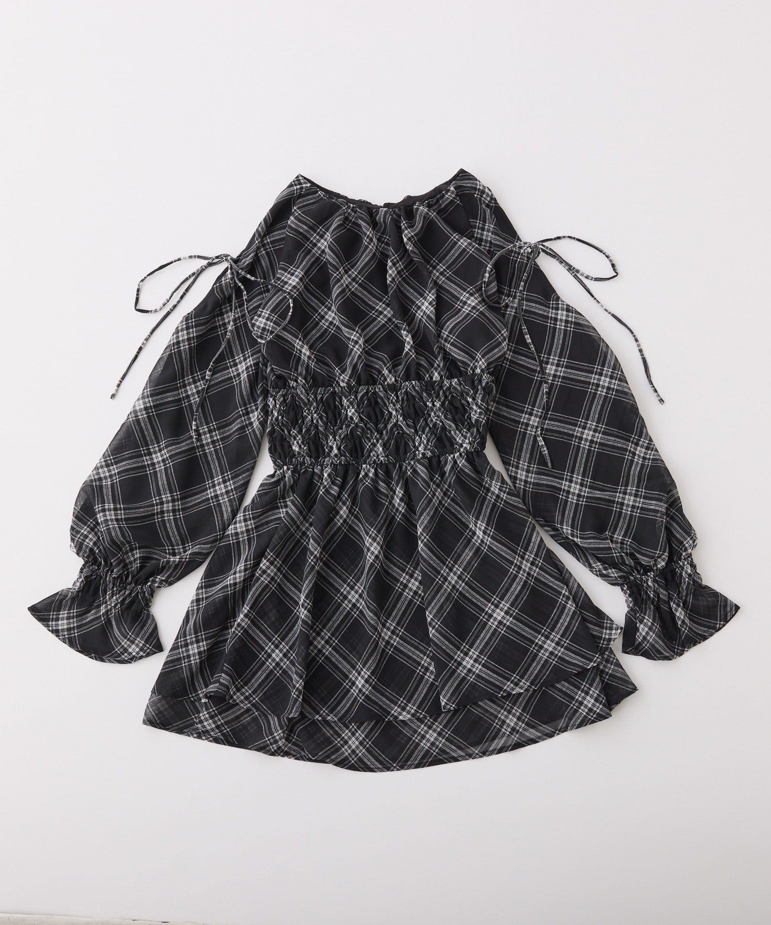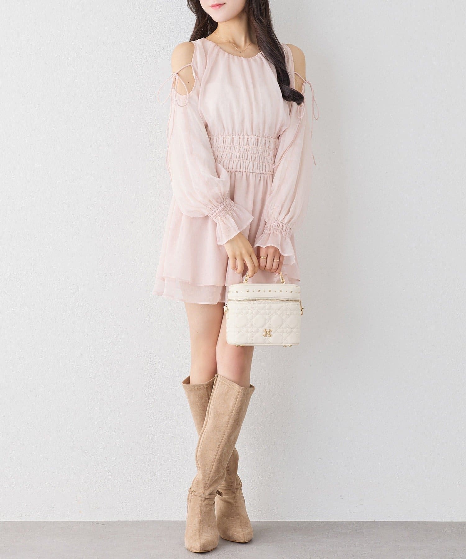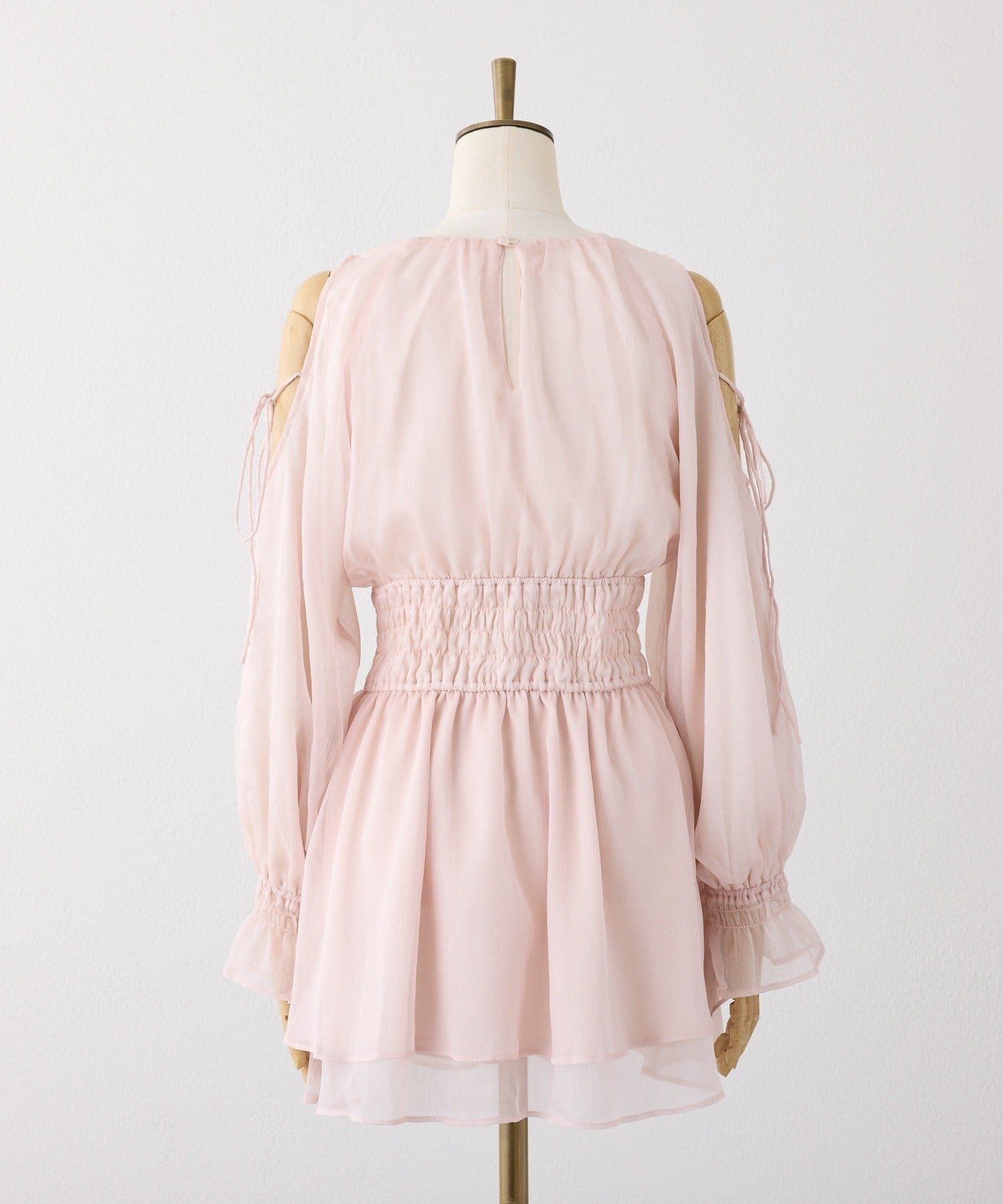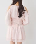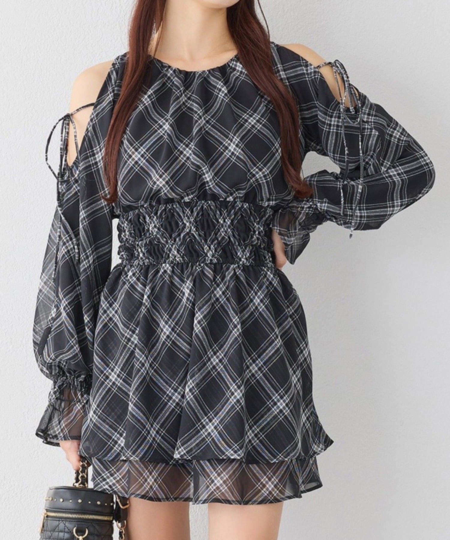 肩や腕まわりをすっきり見せつつ、ウエストのギャザーで女性らしいシルエットに仕上げました。