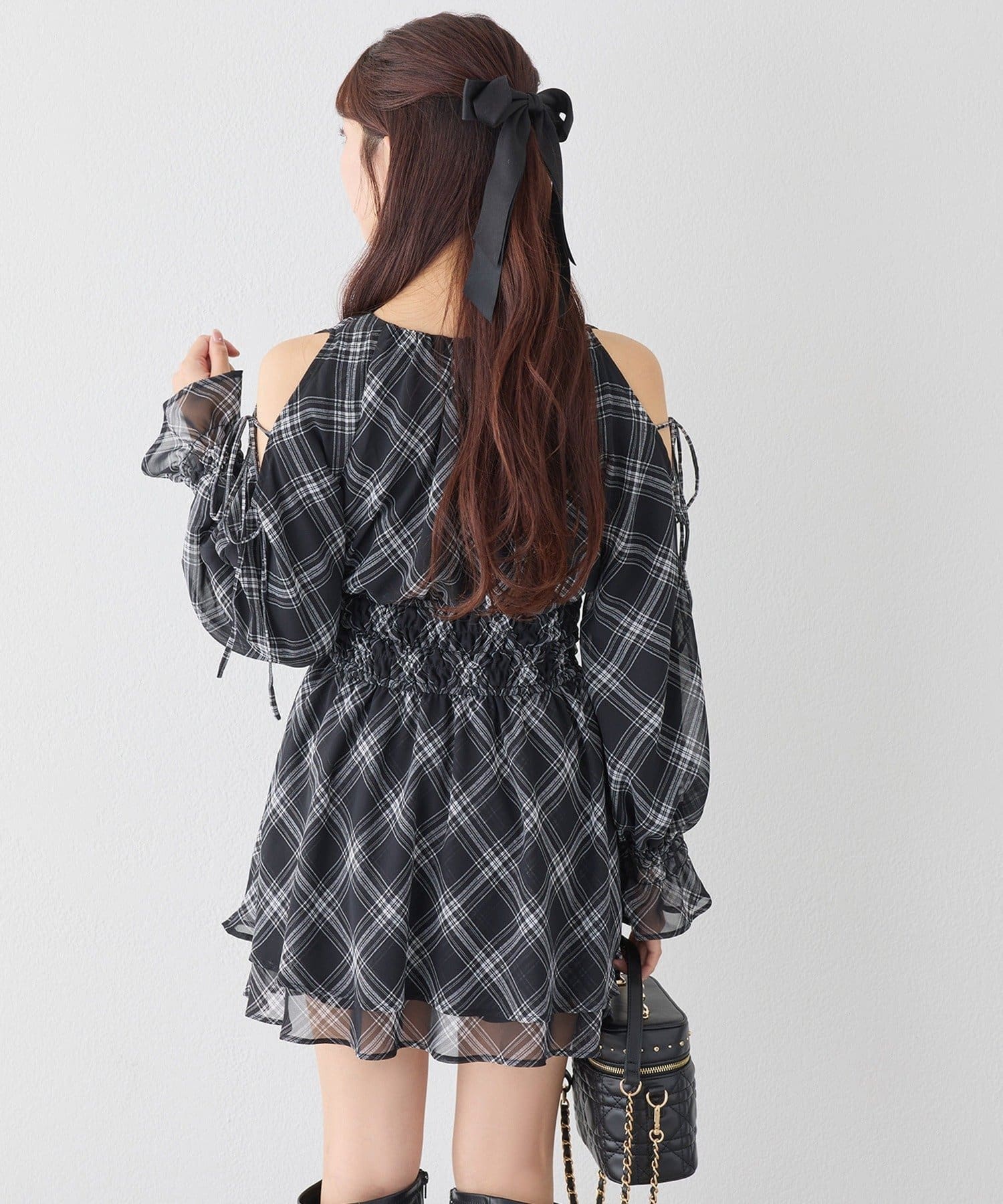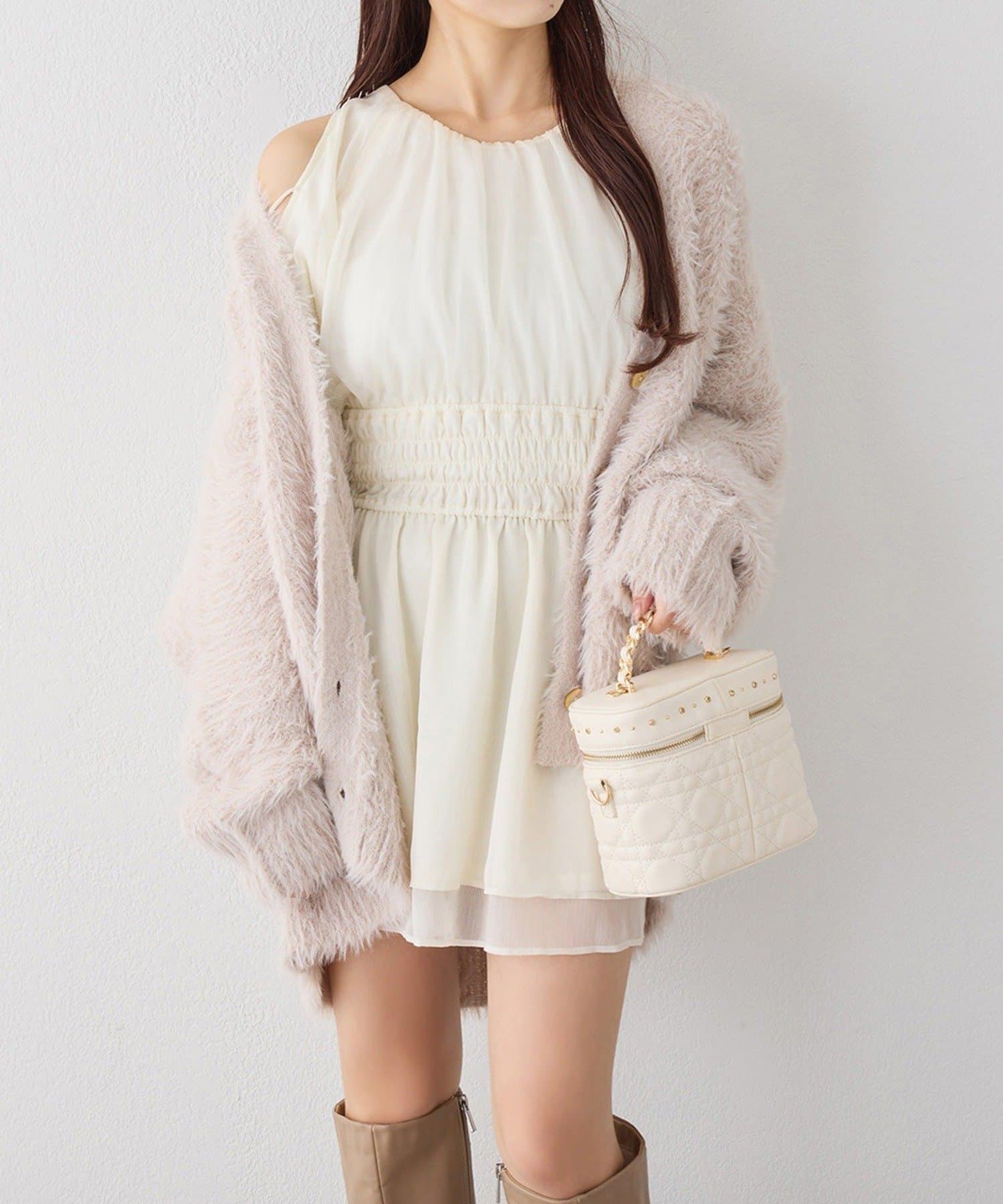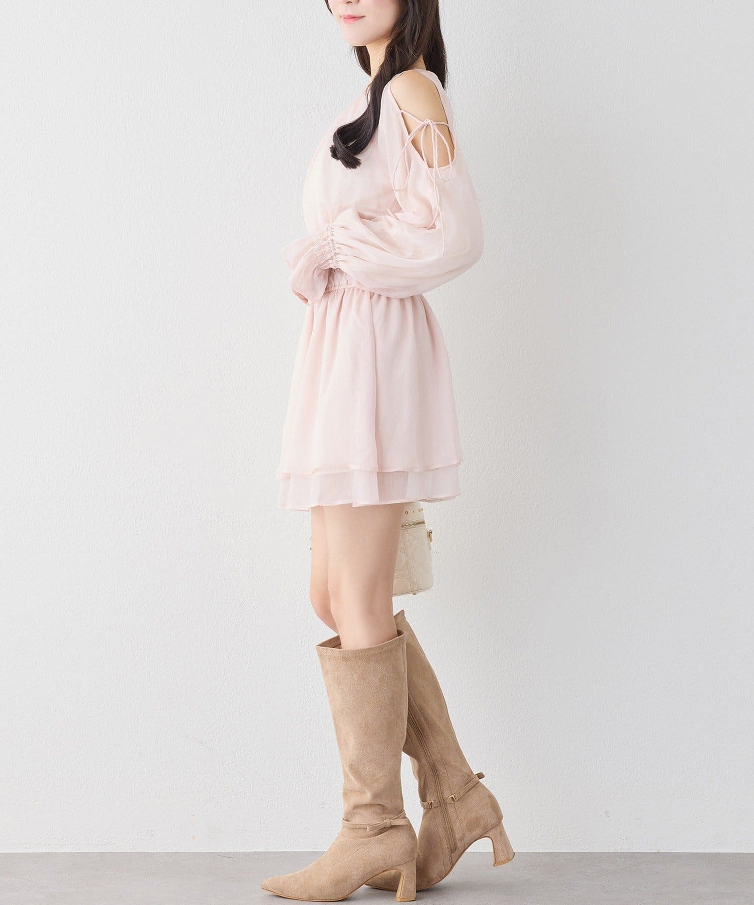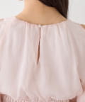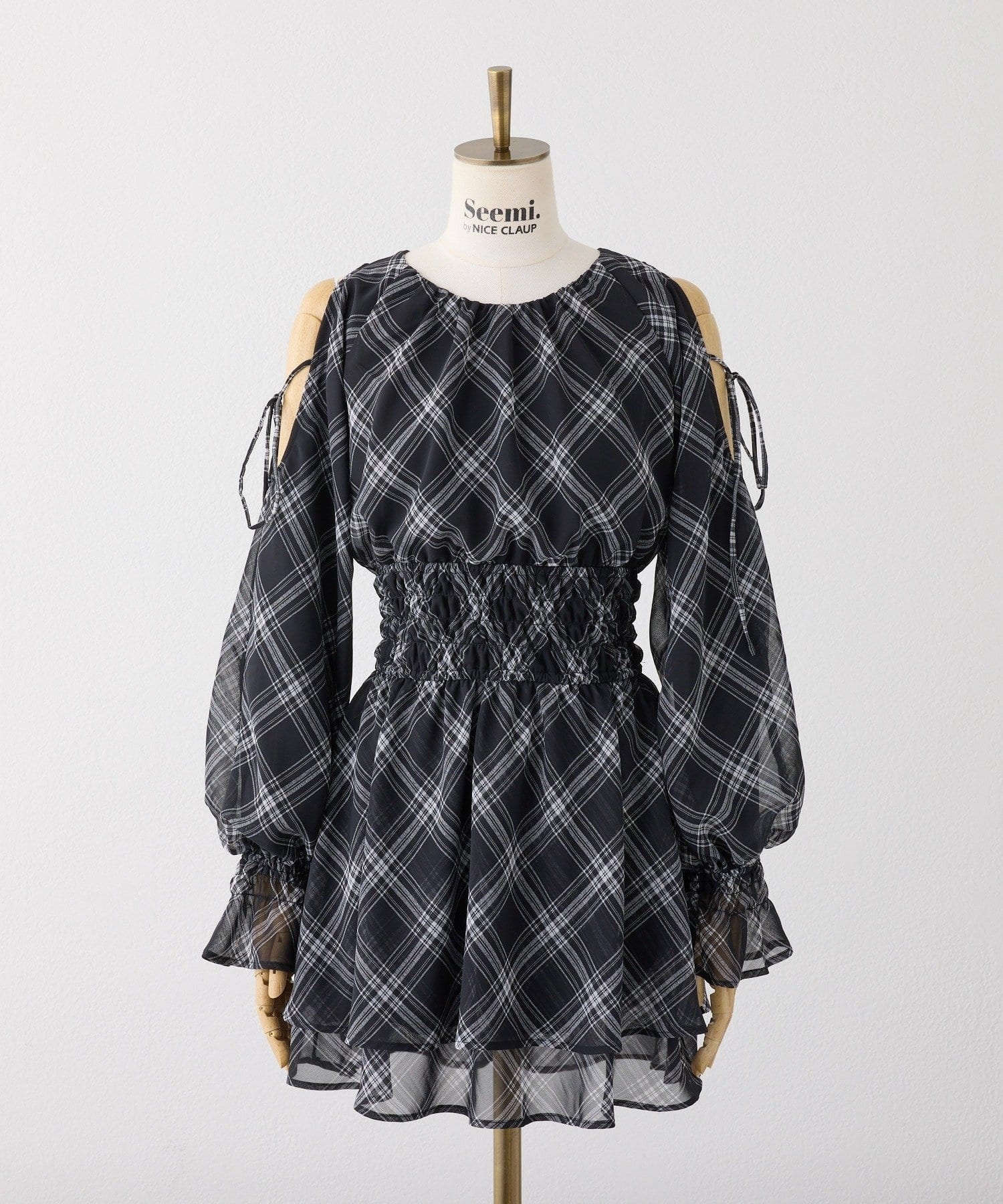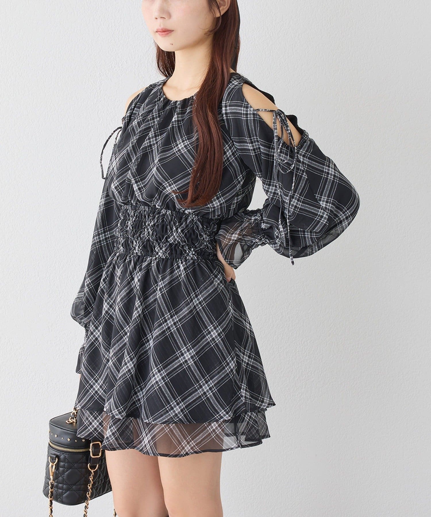 肩や腕まわりをすっきり見せつつ、ウエストのギャザーで女性らしいシルエットに仕上げました。