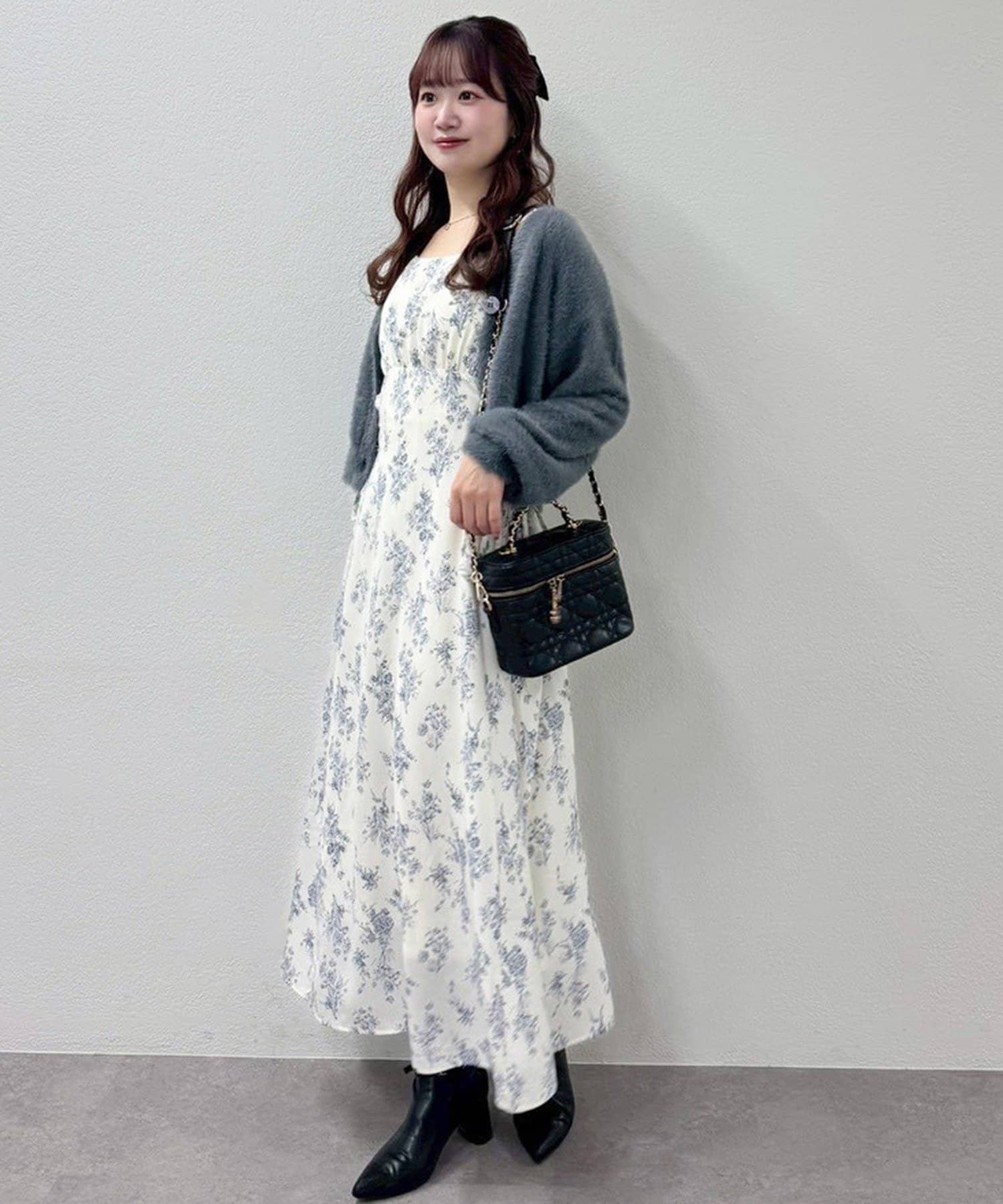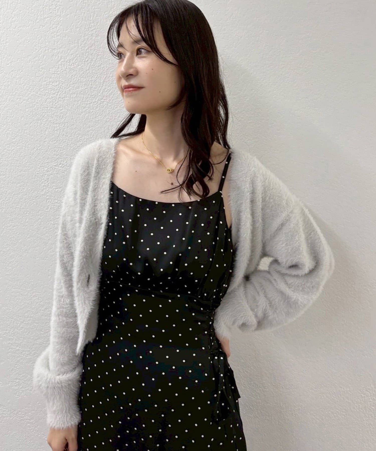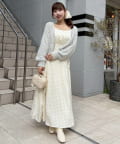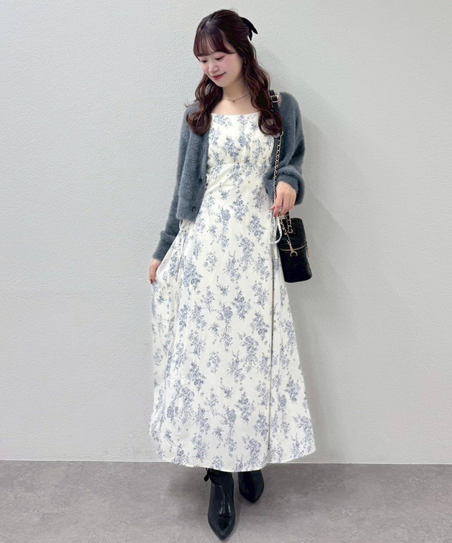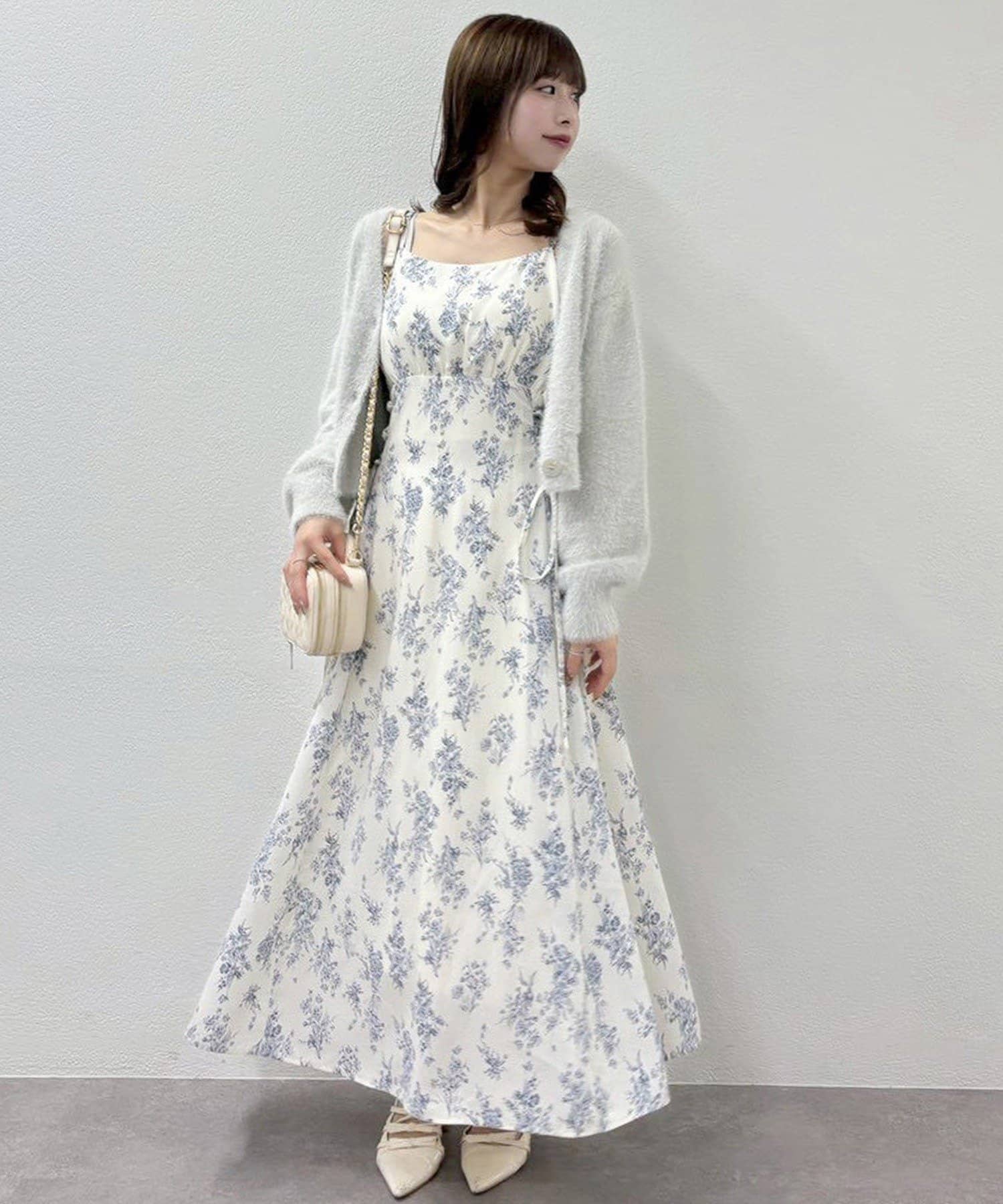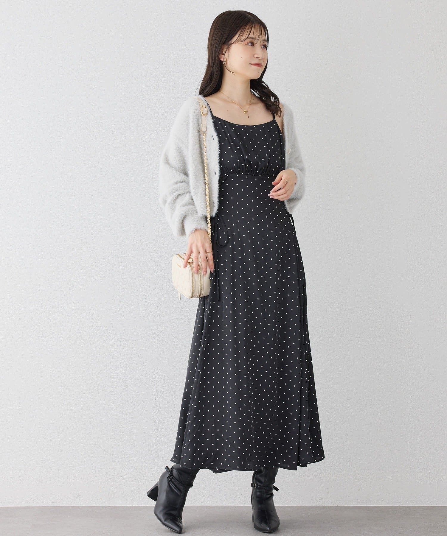 ワンピースにロングカーディガンを羽織れば、リラックス感のあるフェミニンスタイルに。