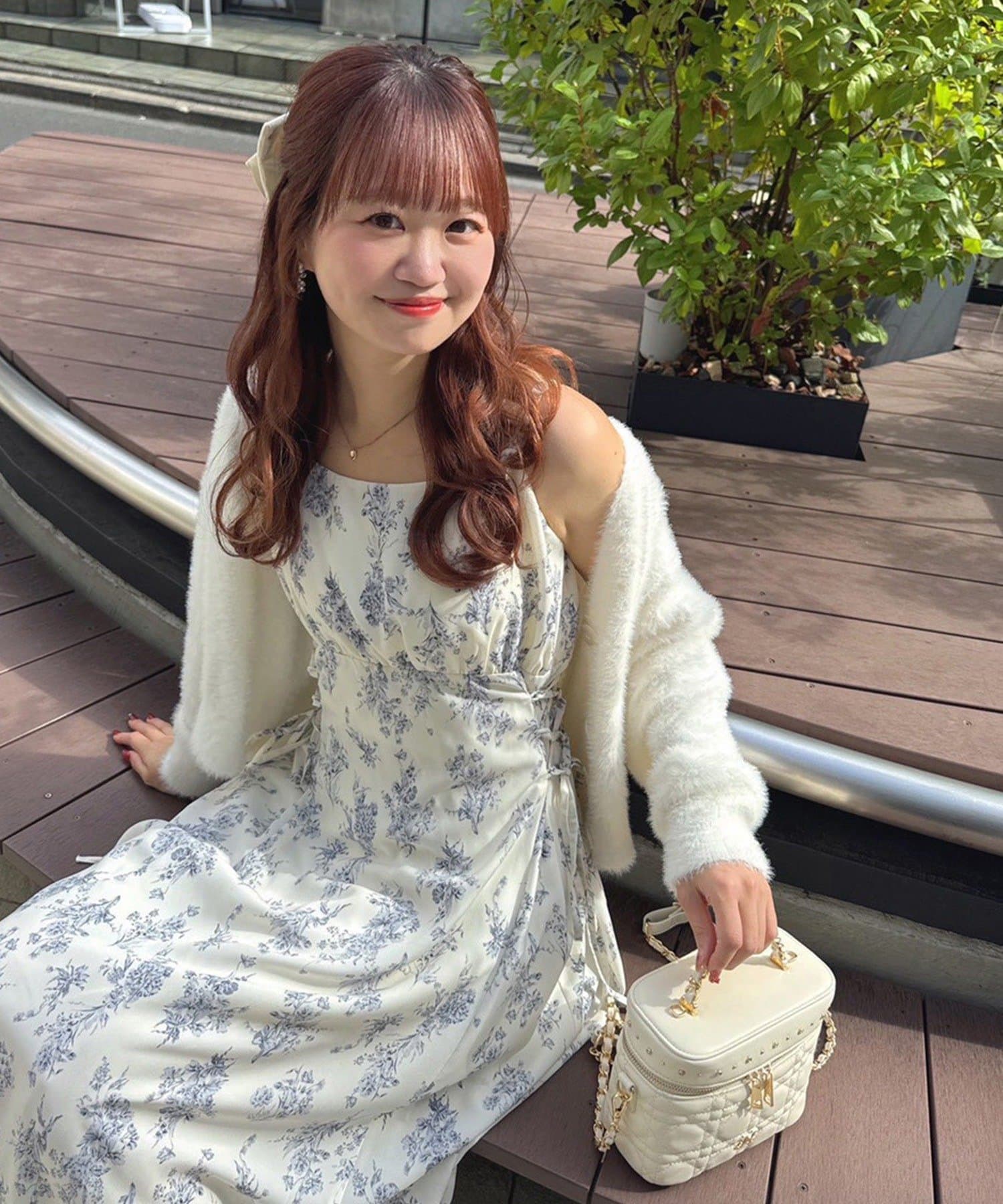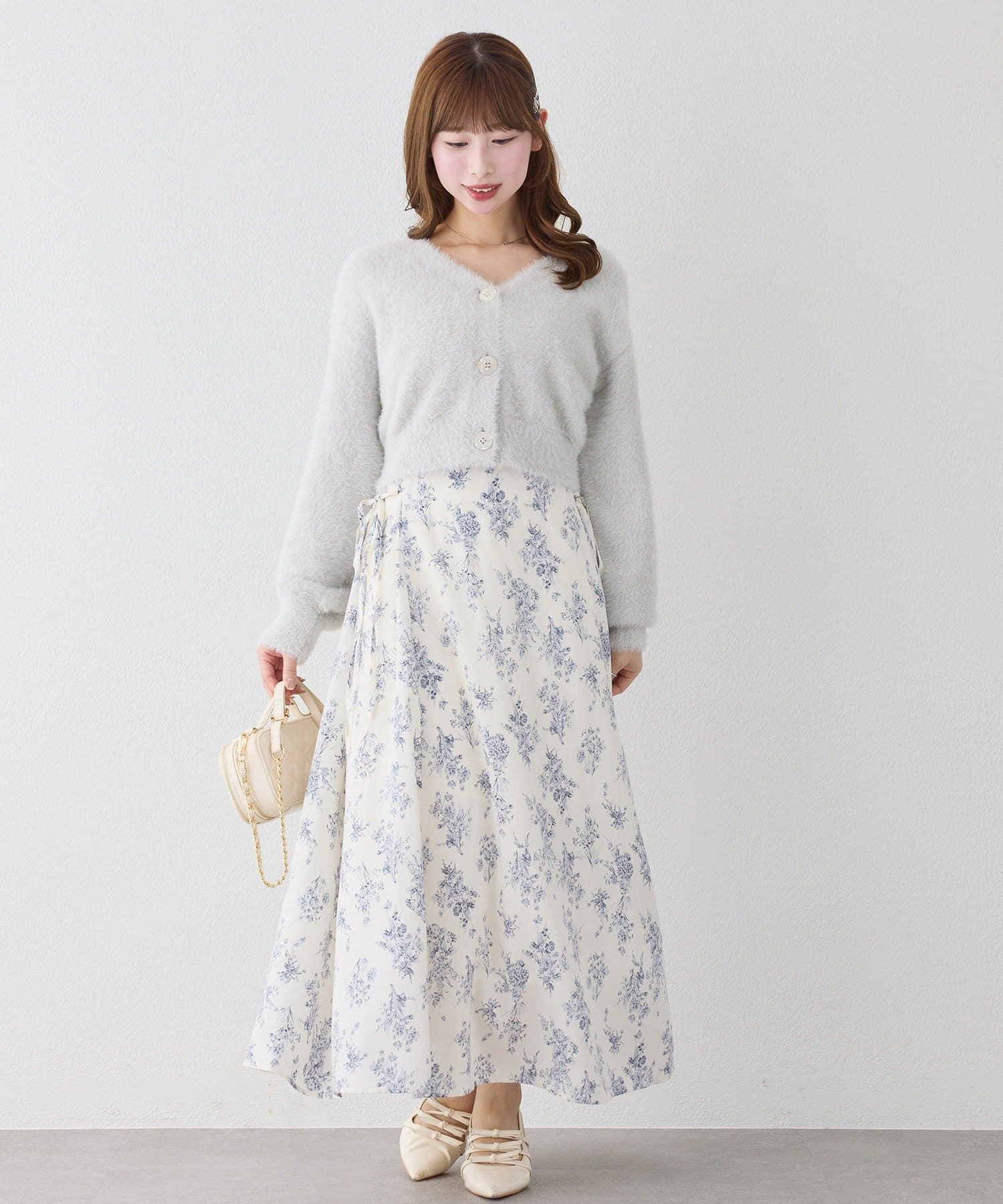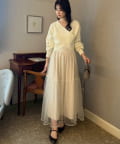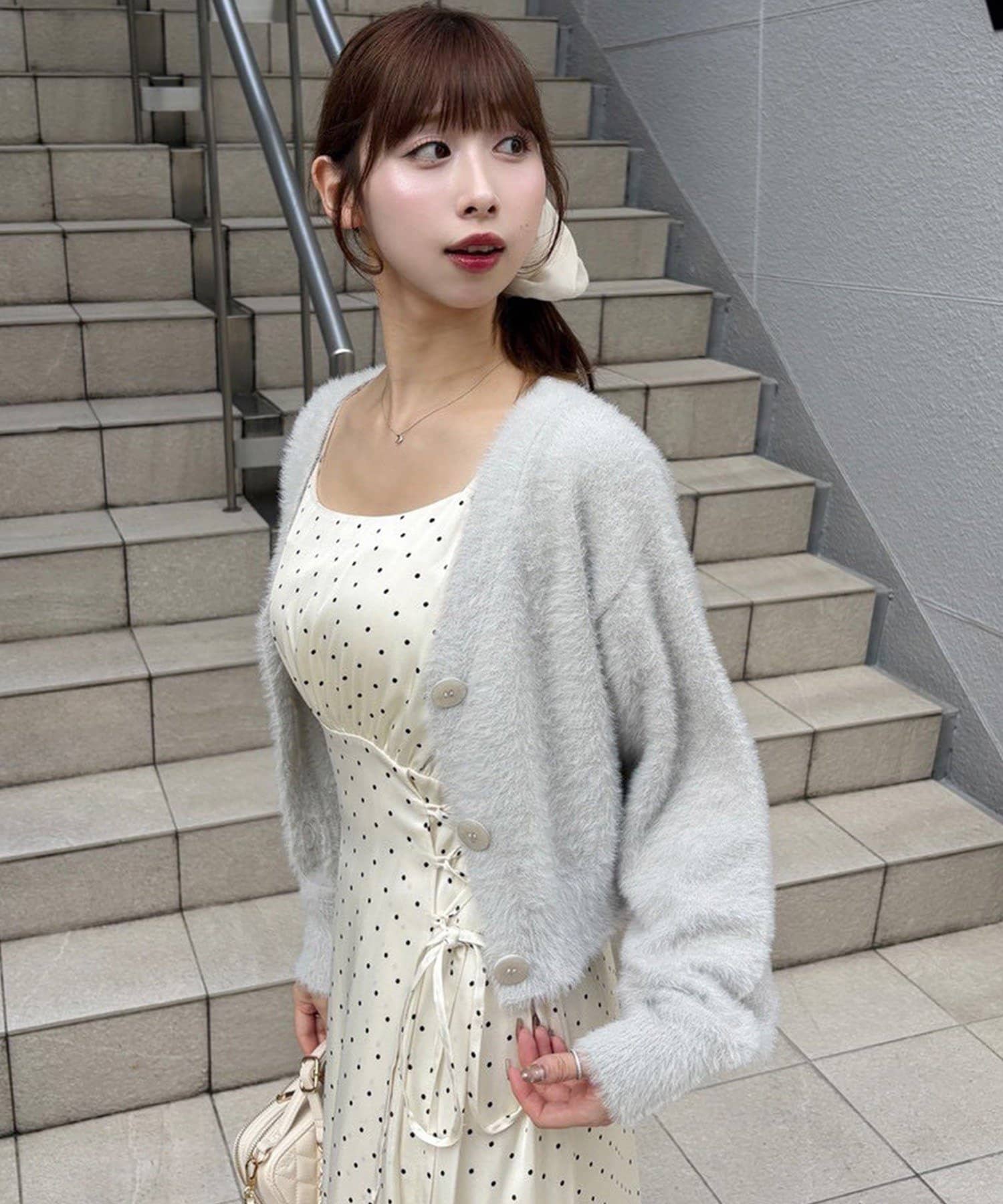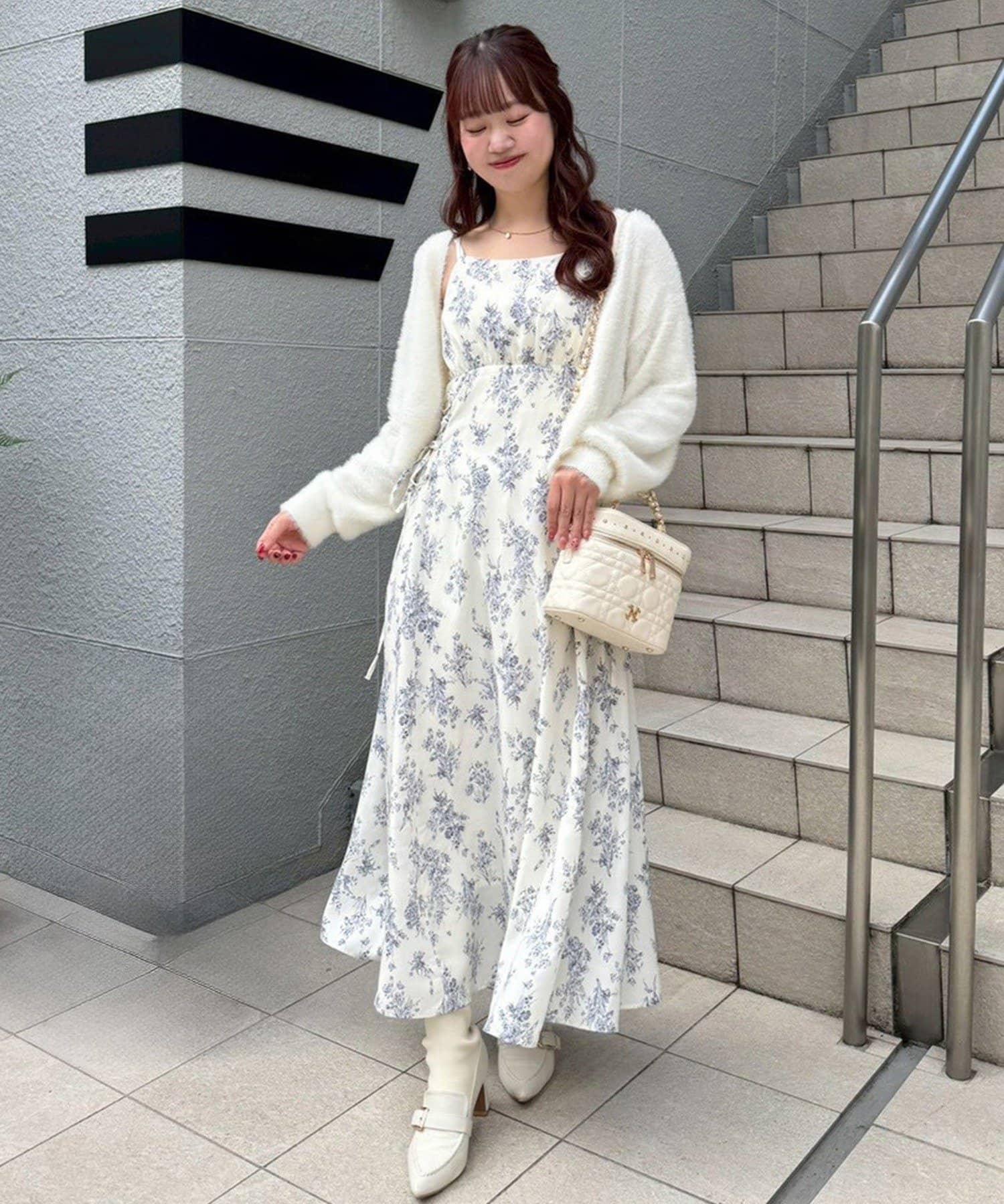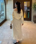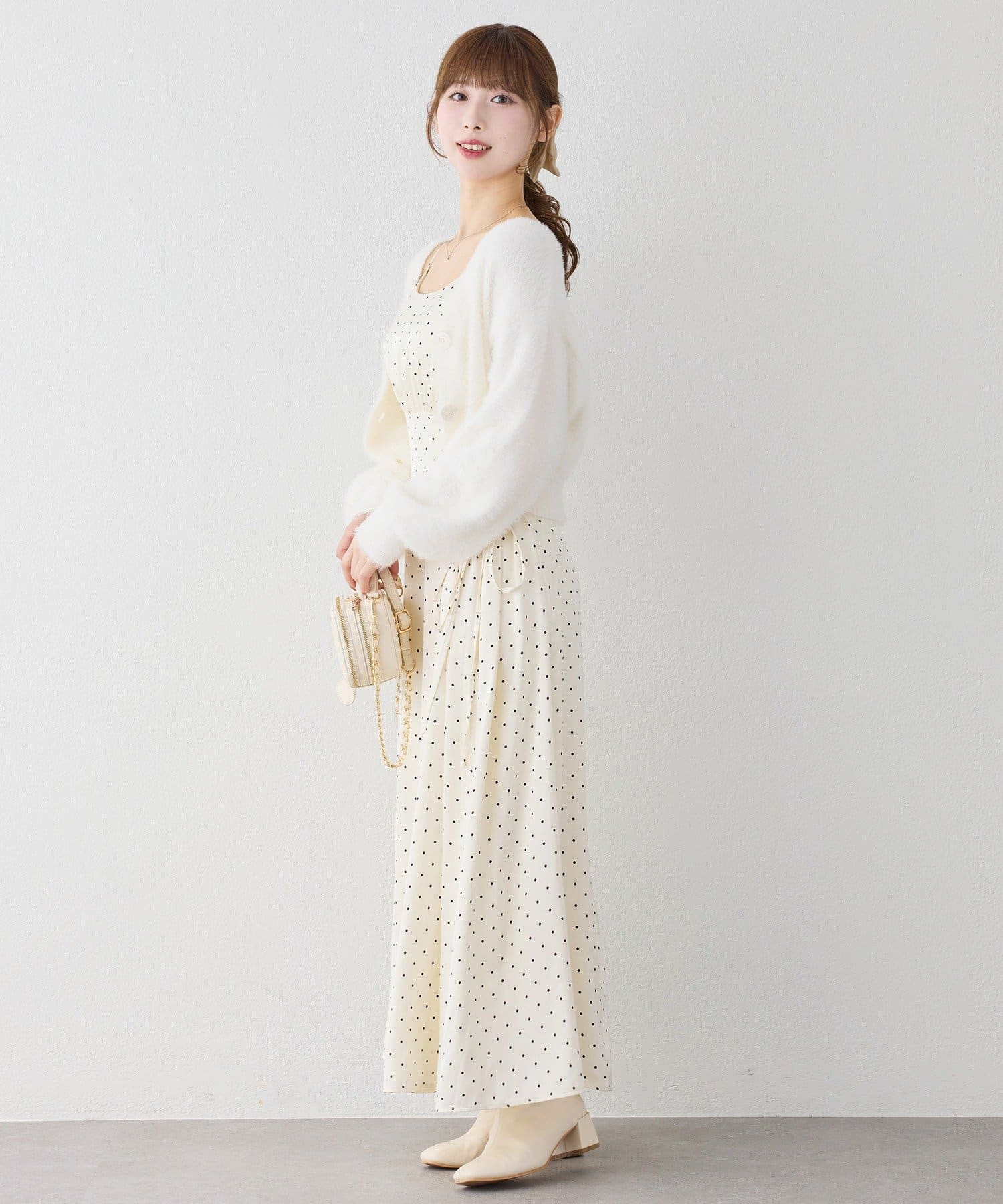 ワンピースにロングカーディガンを羽織れば、リラックス感のあるフェミニンスタイルに。