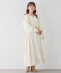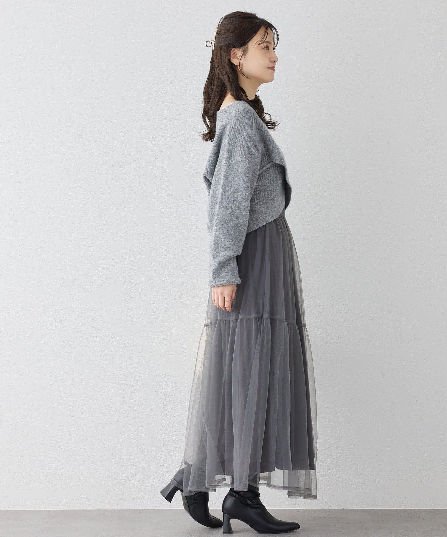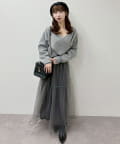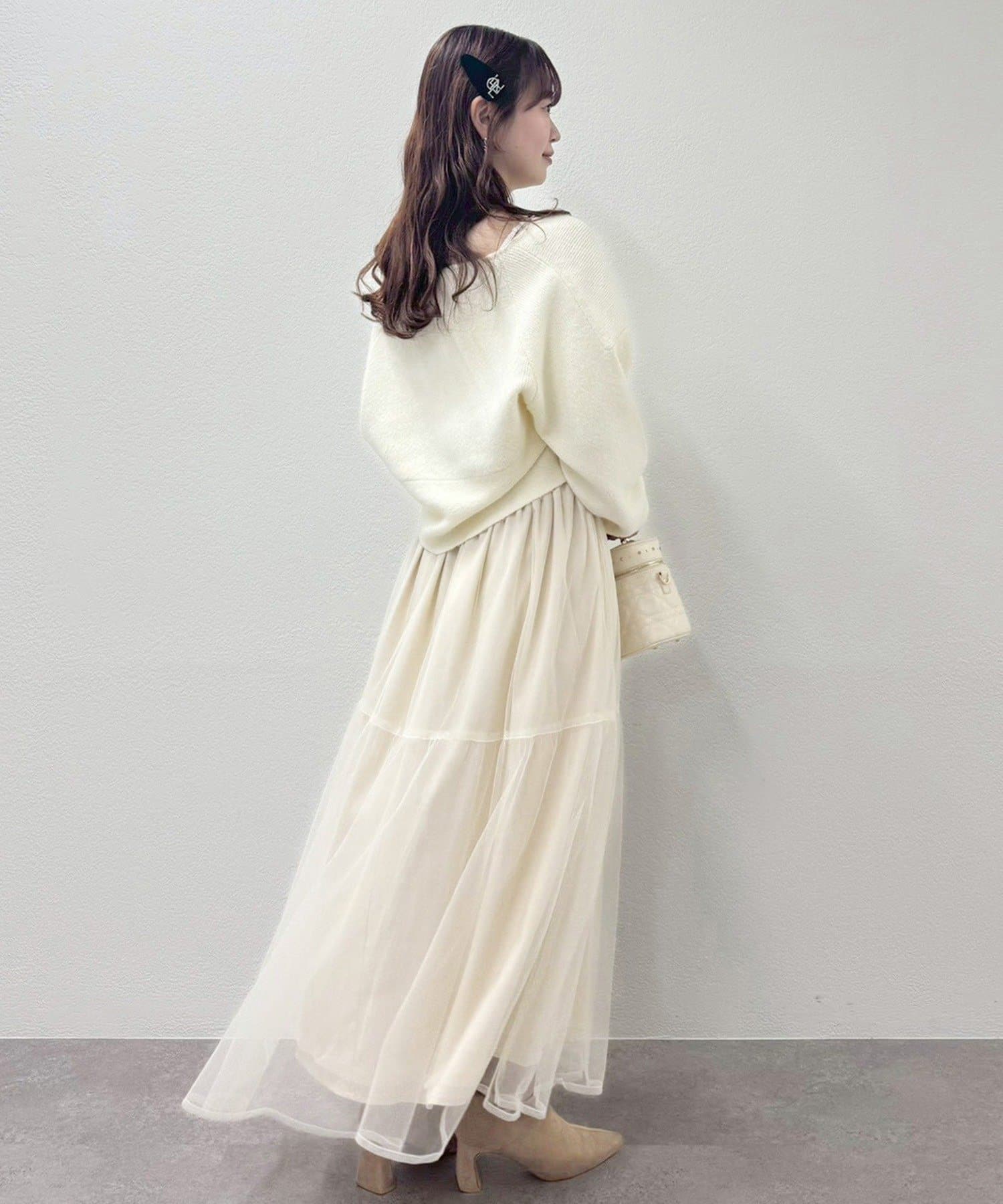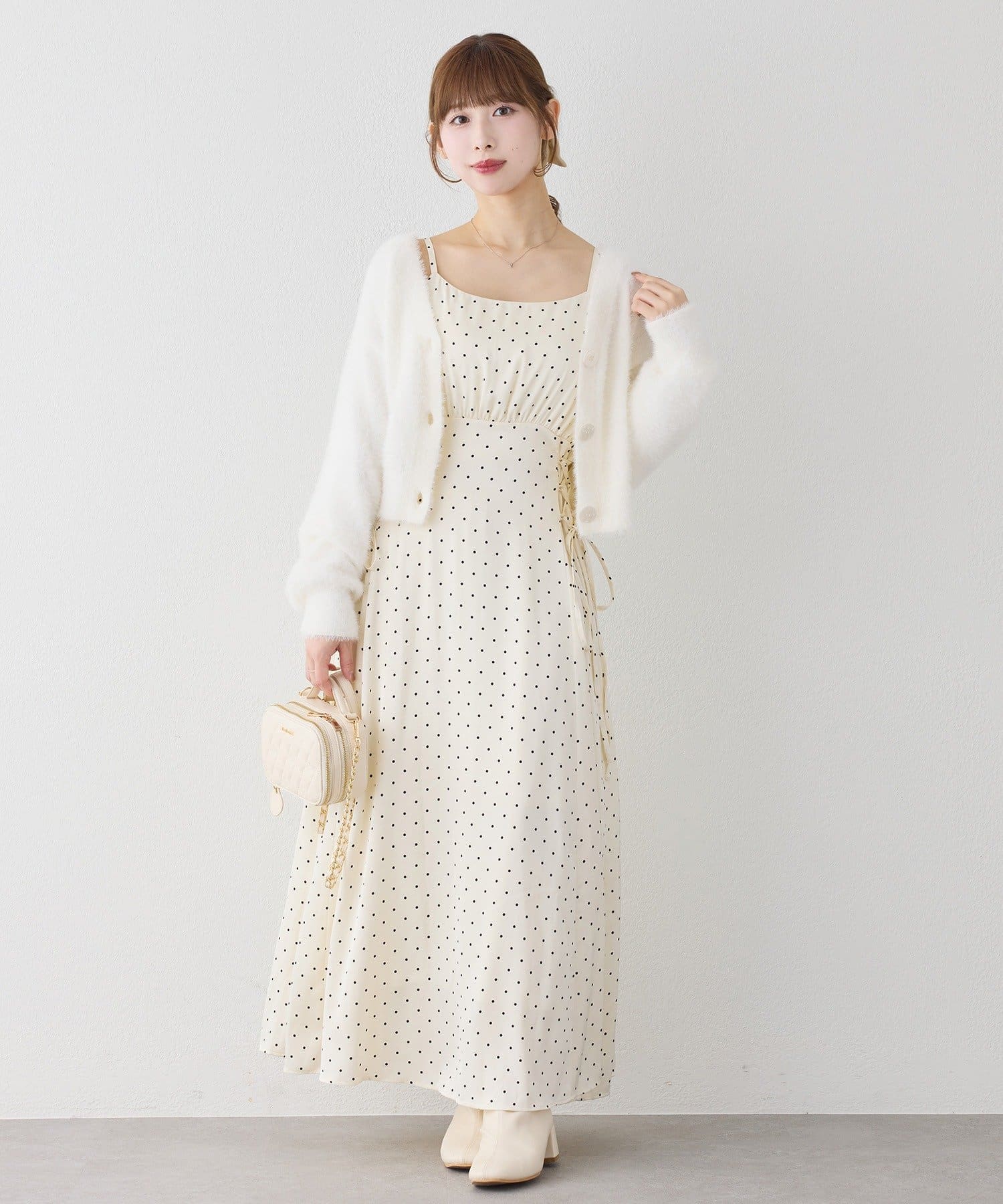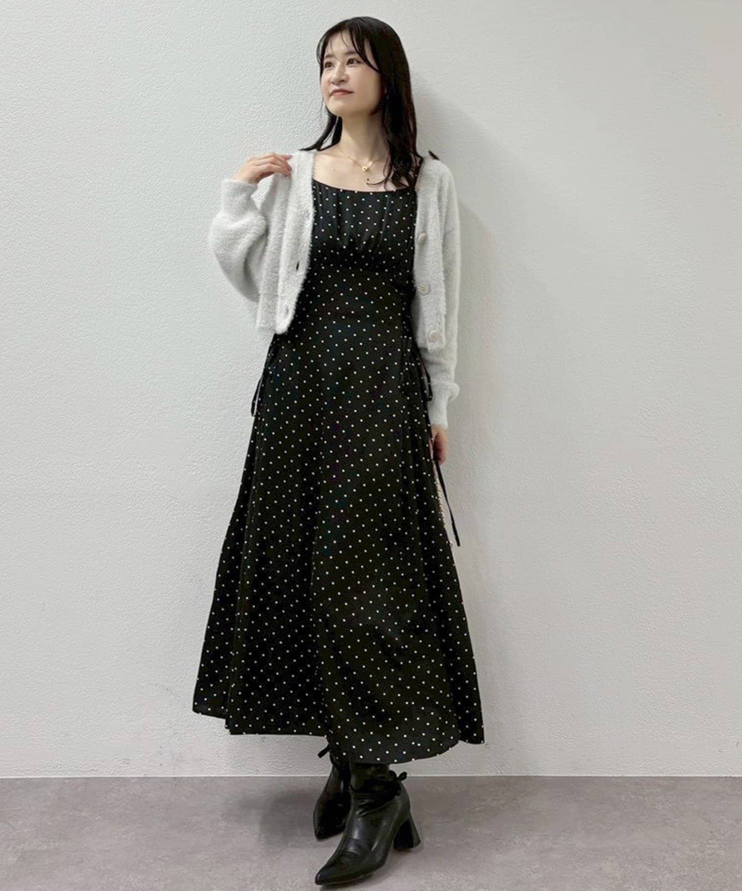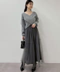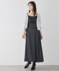 クロスデザインニットと、サイドレースアップがポイントのキャミロングワンピースのセットアイテム。
