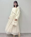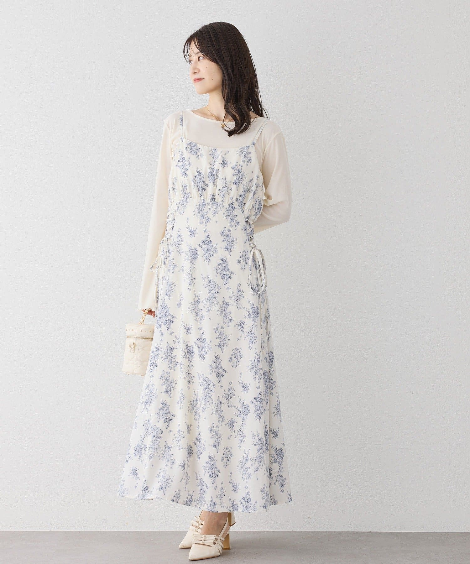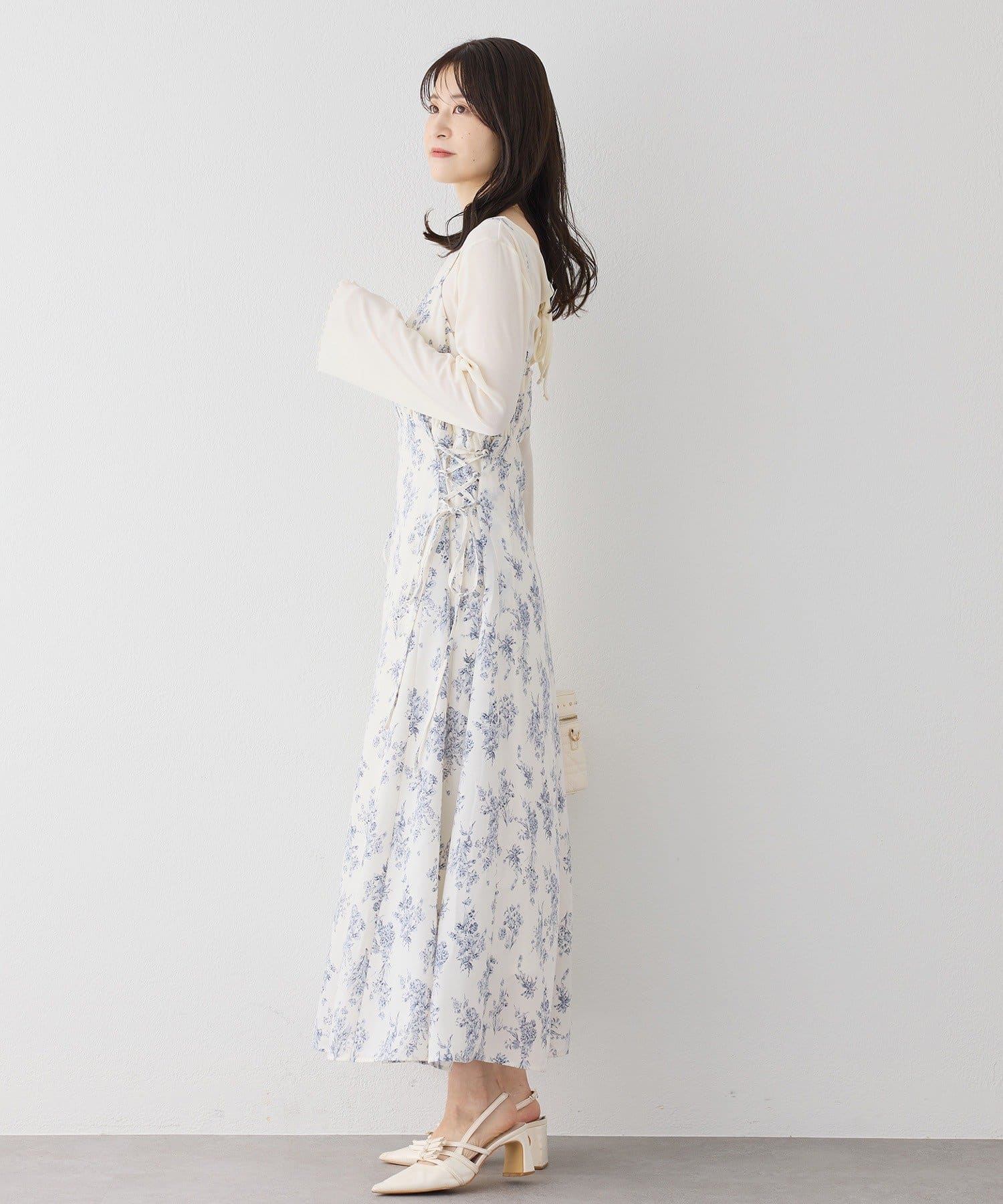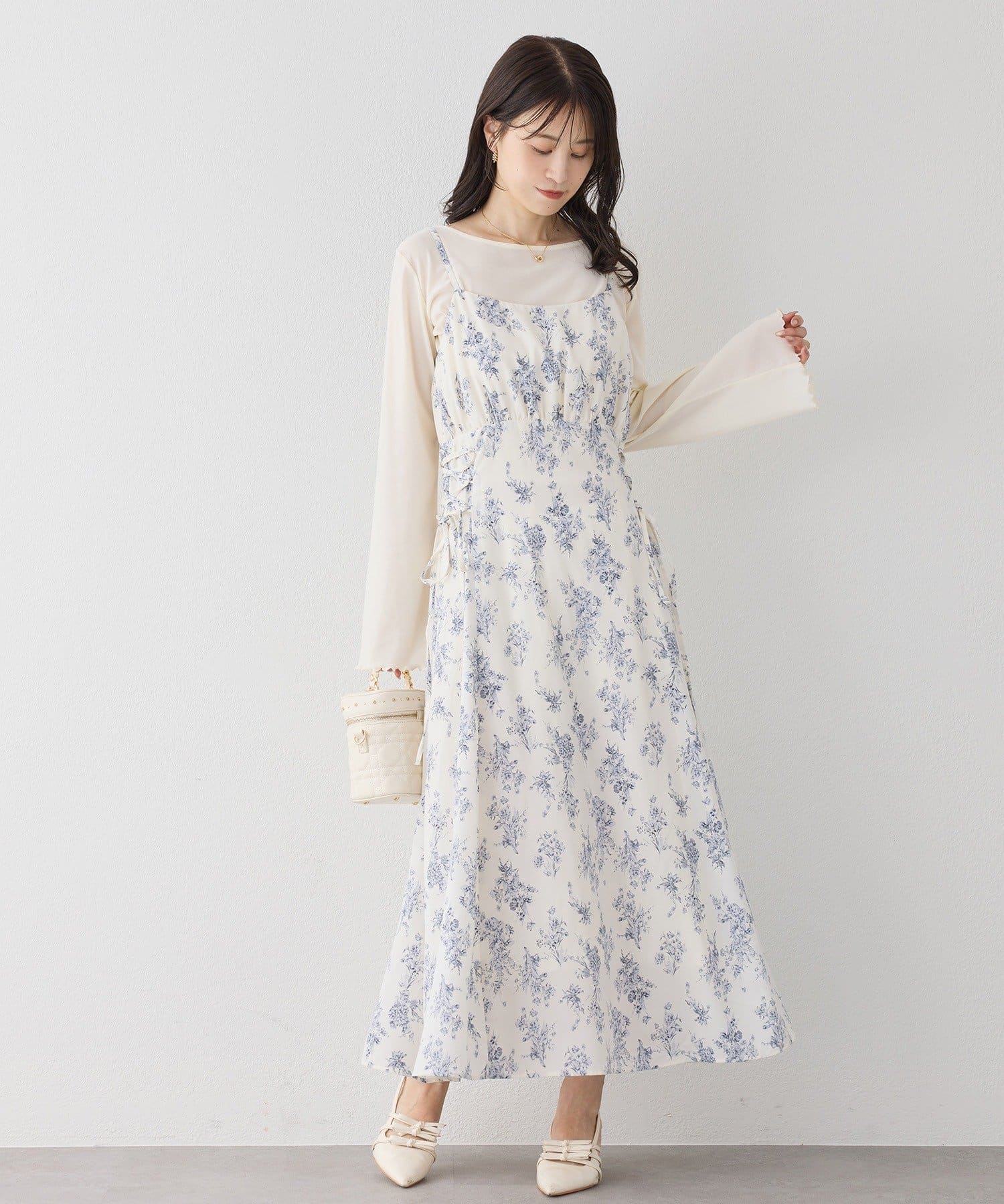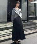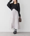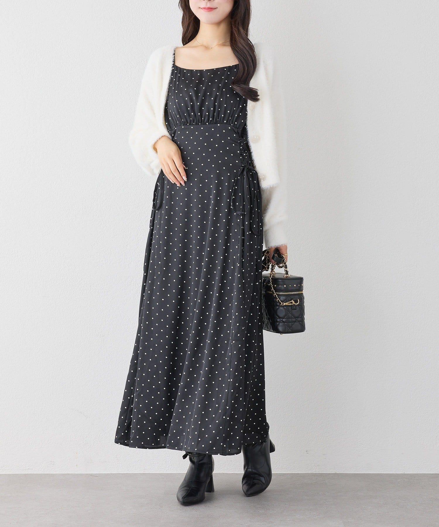 クロスデザインニットと、サイドレースアップがポイントのキャミロングワンピースのセットアイテム。