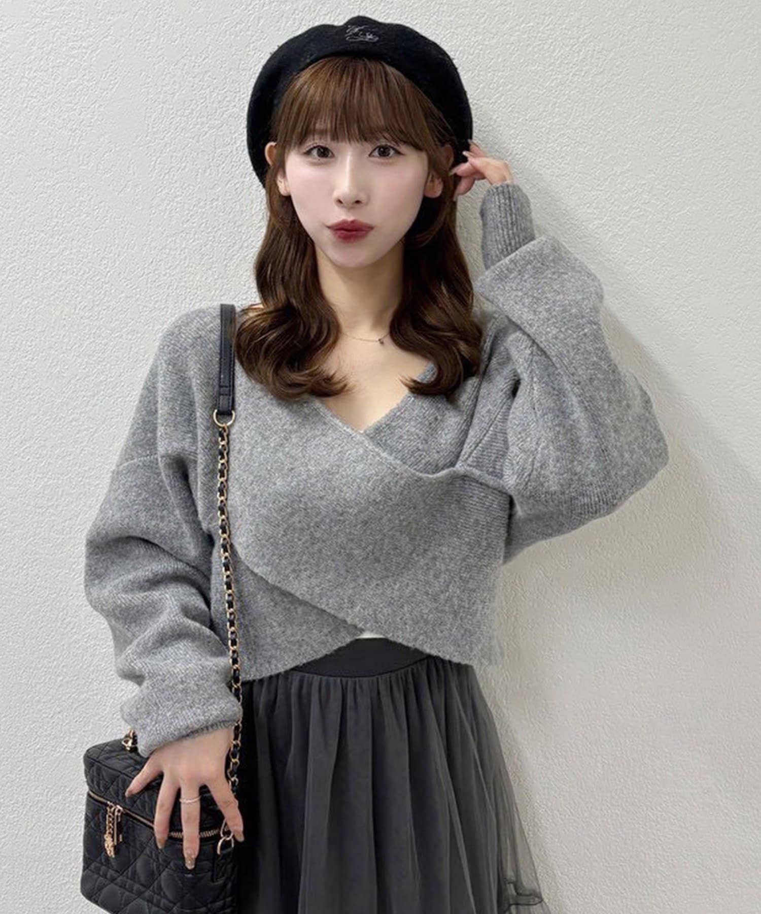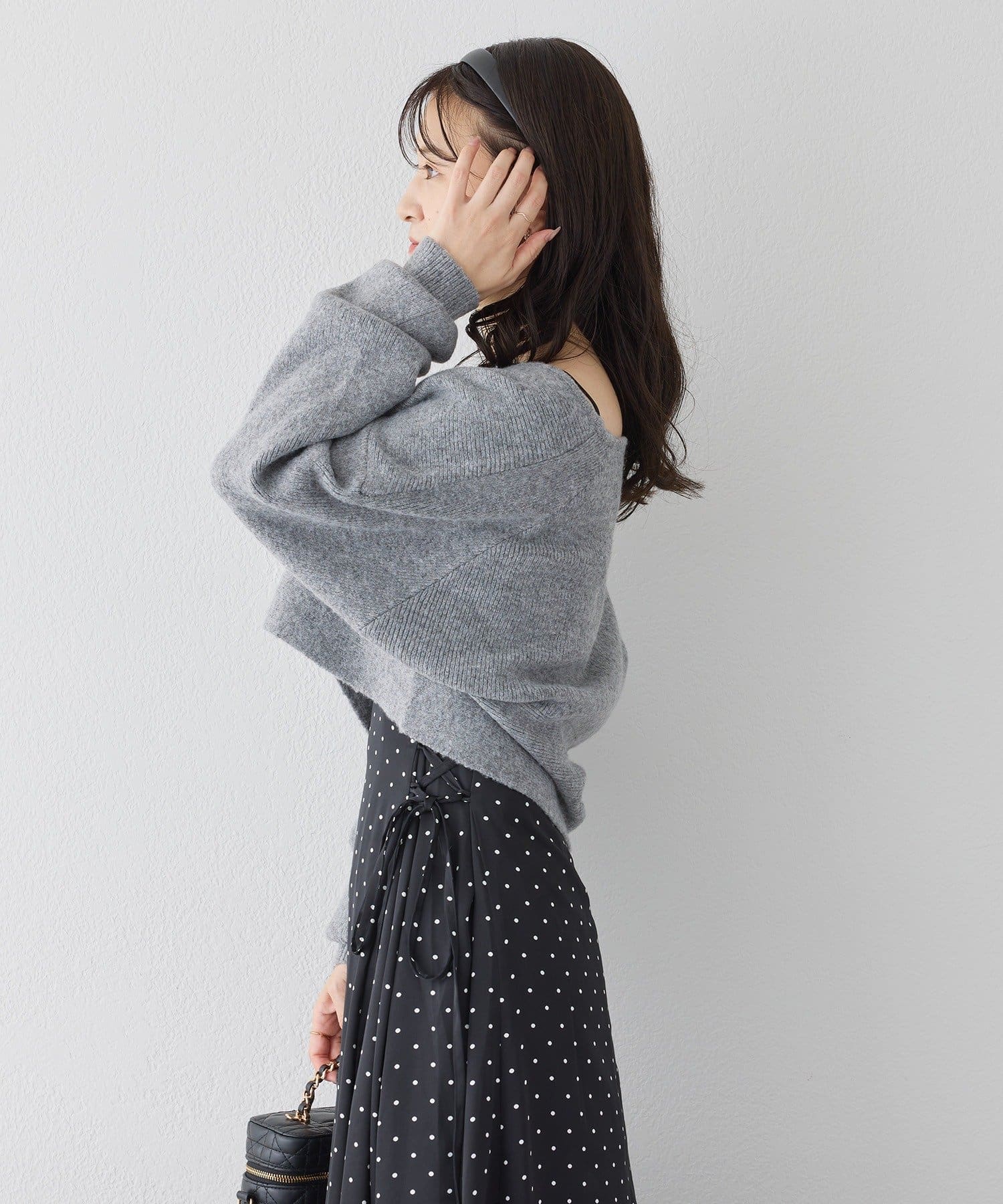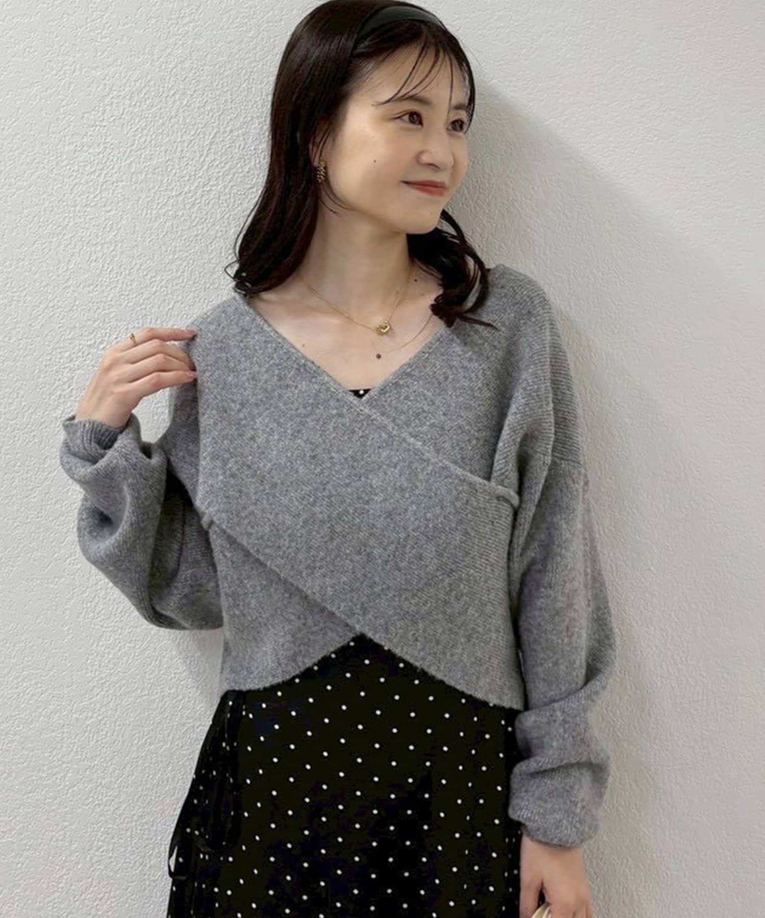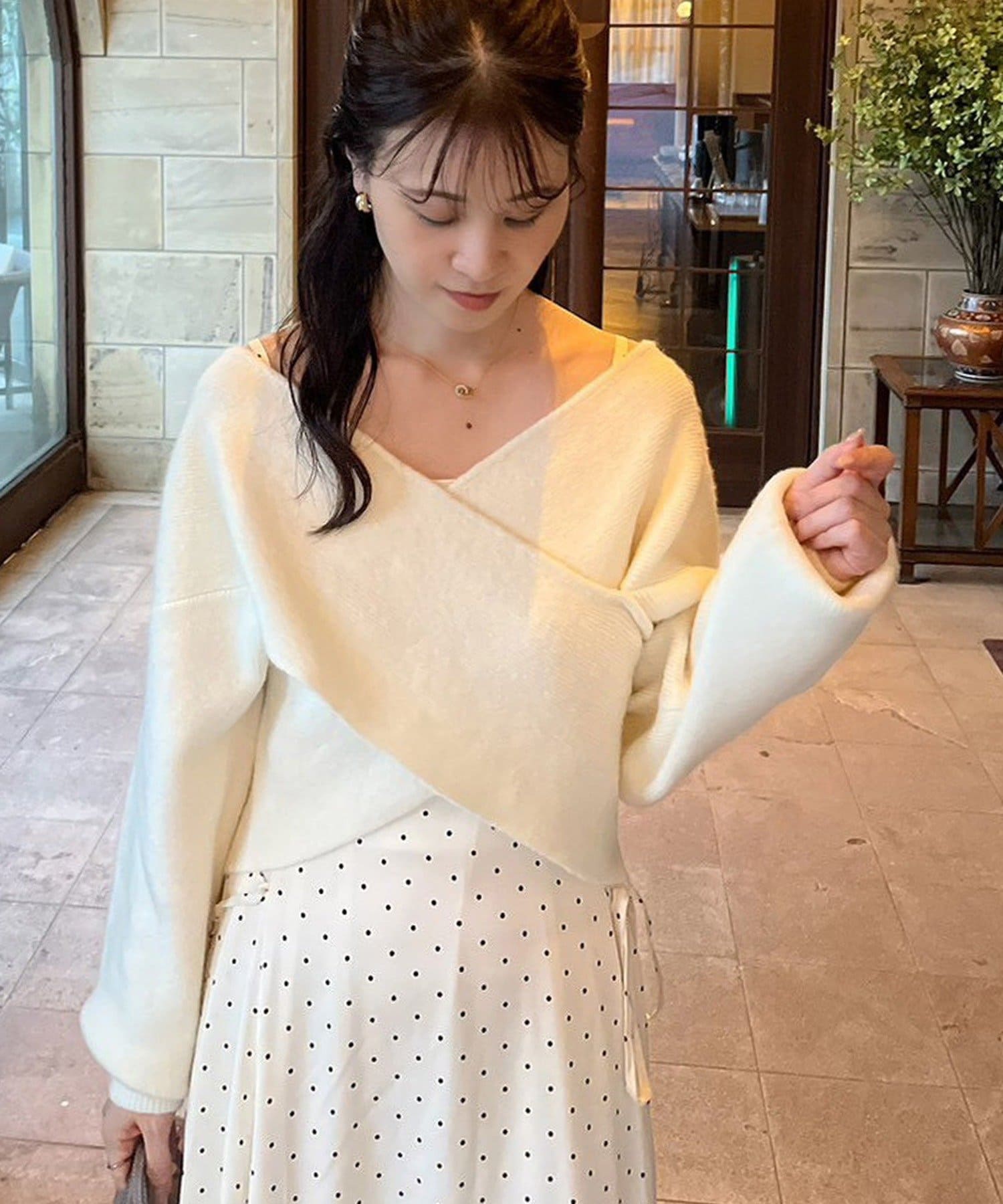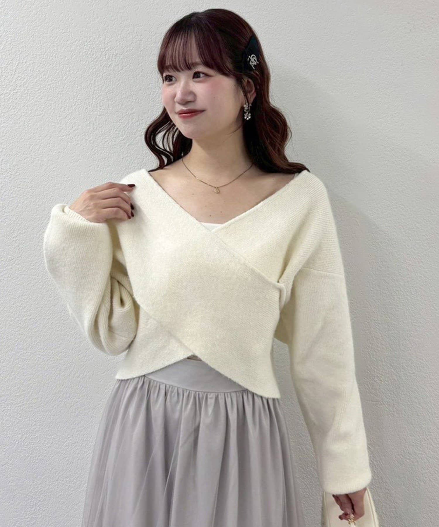ニットは程よくフィットするクロスデザインで女性らしい印象に、