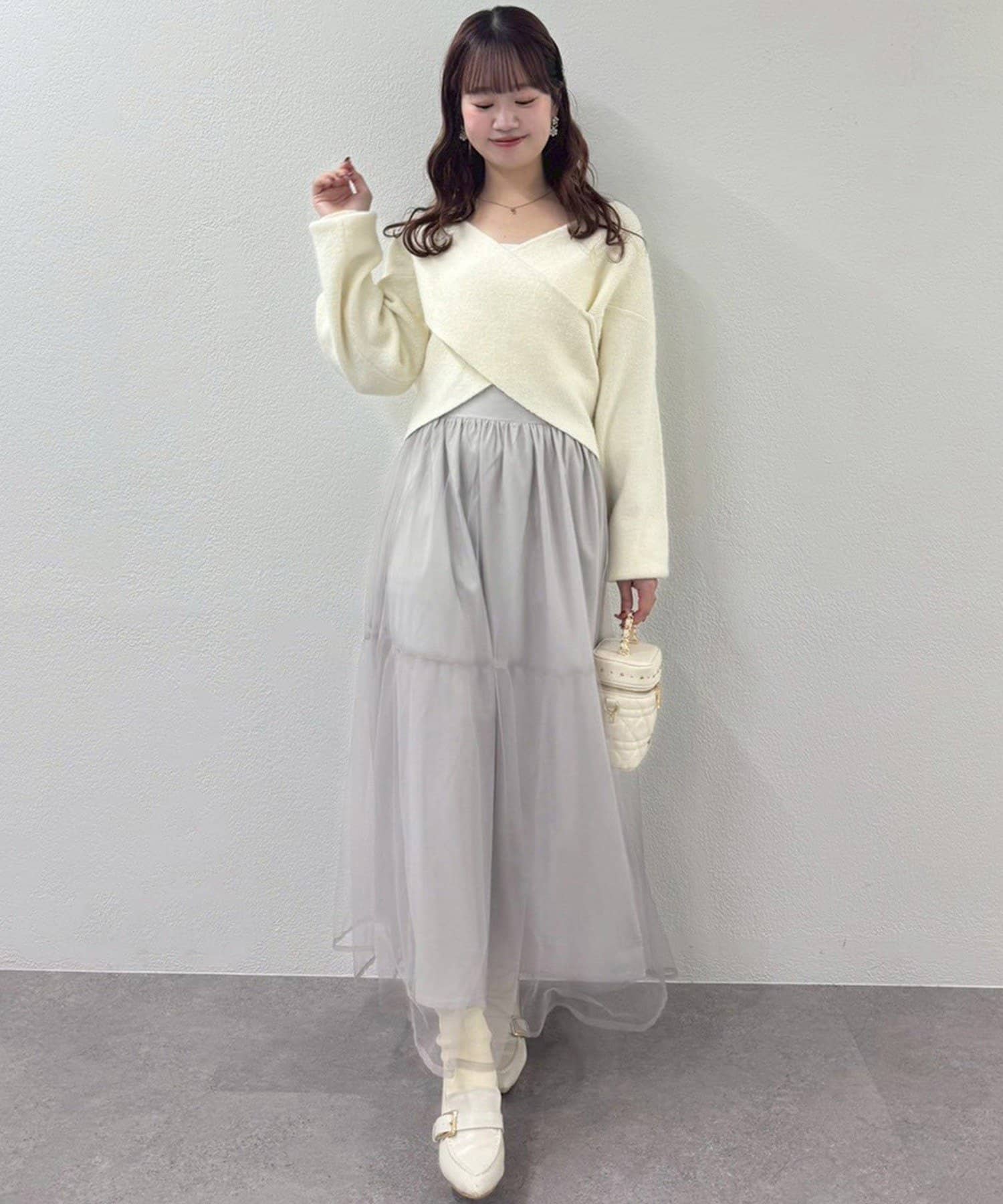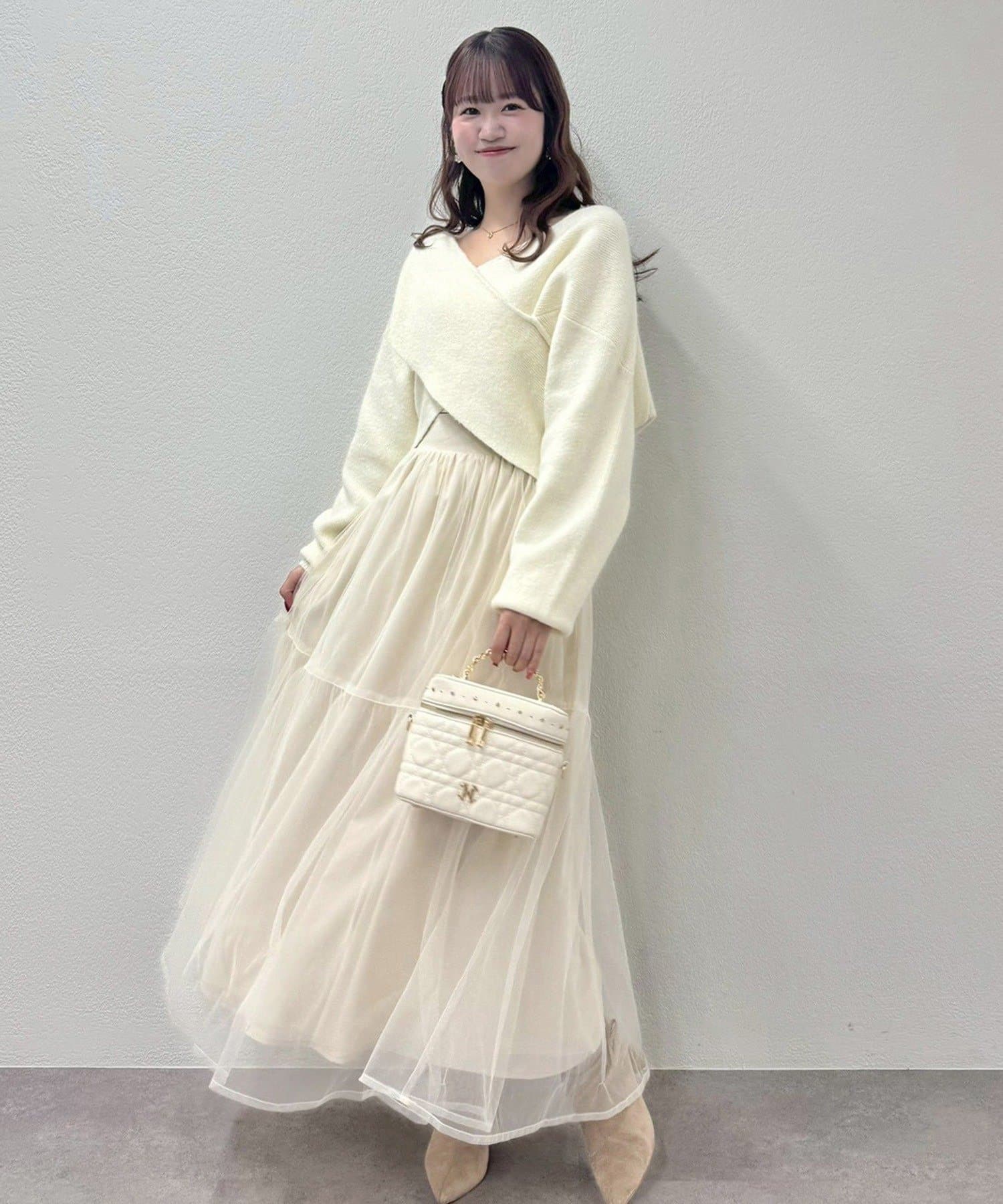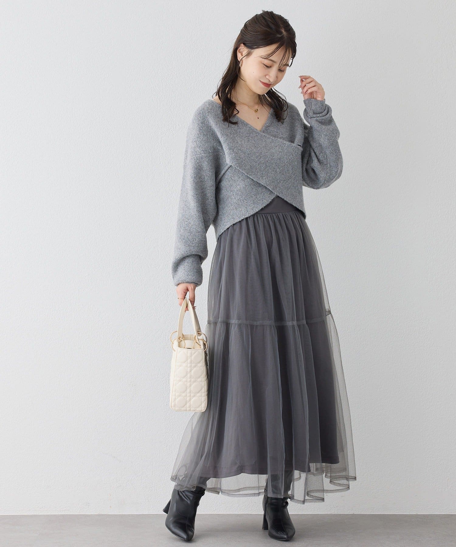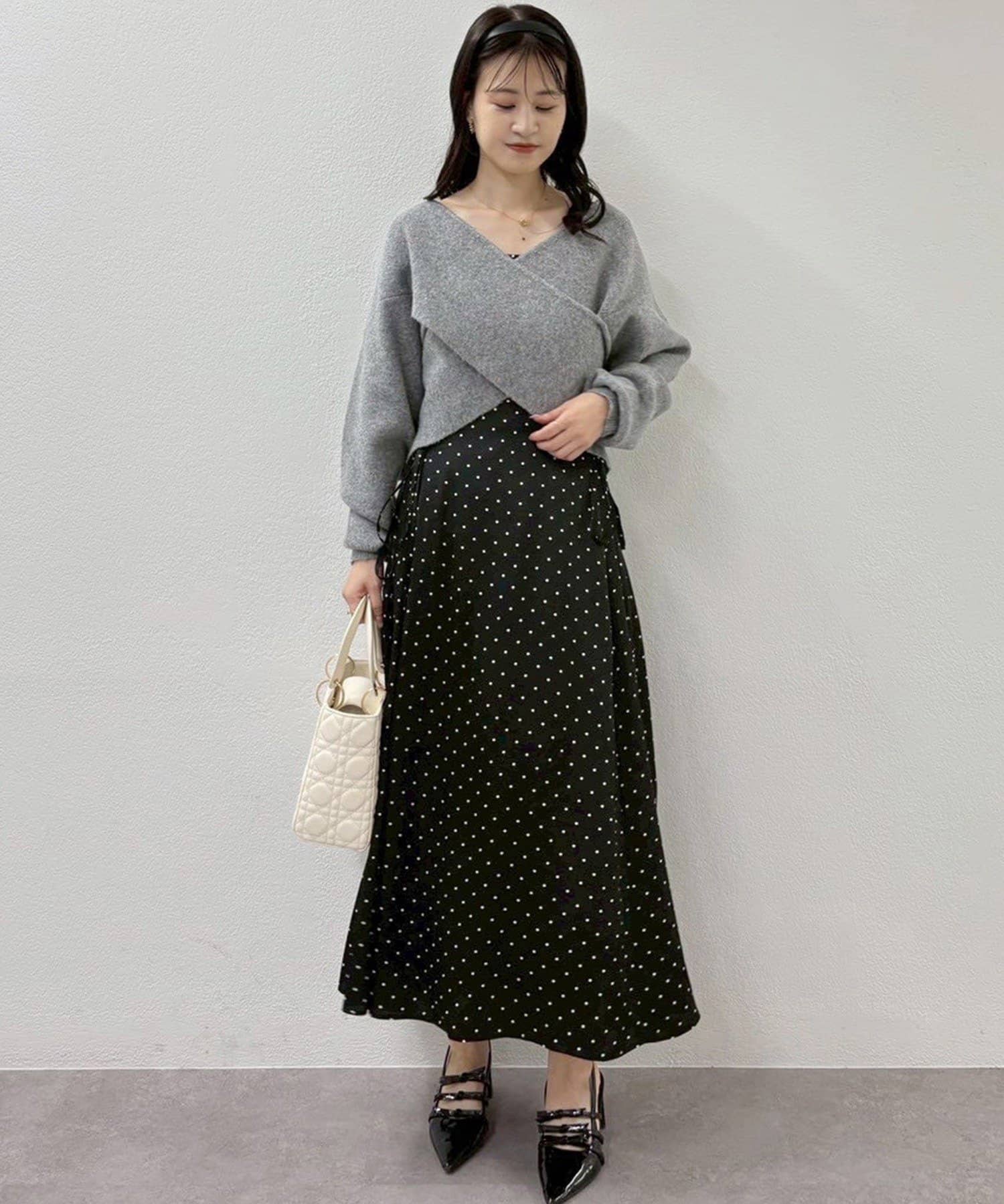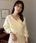 ニットは程よくフィットするクロスデザインで女性らしい印象に、