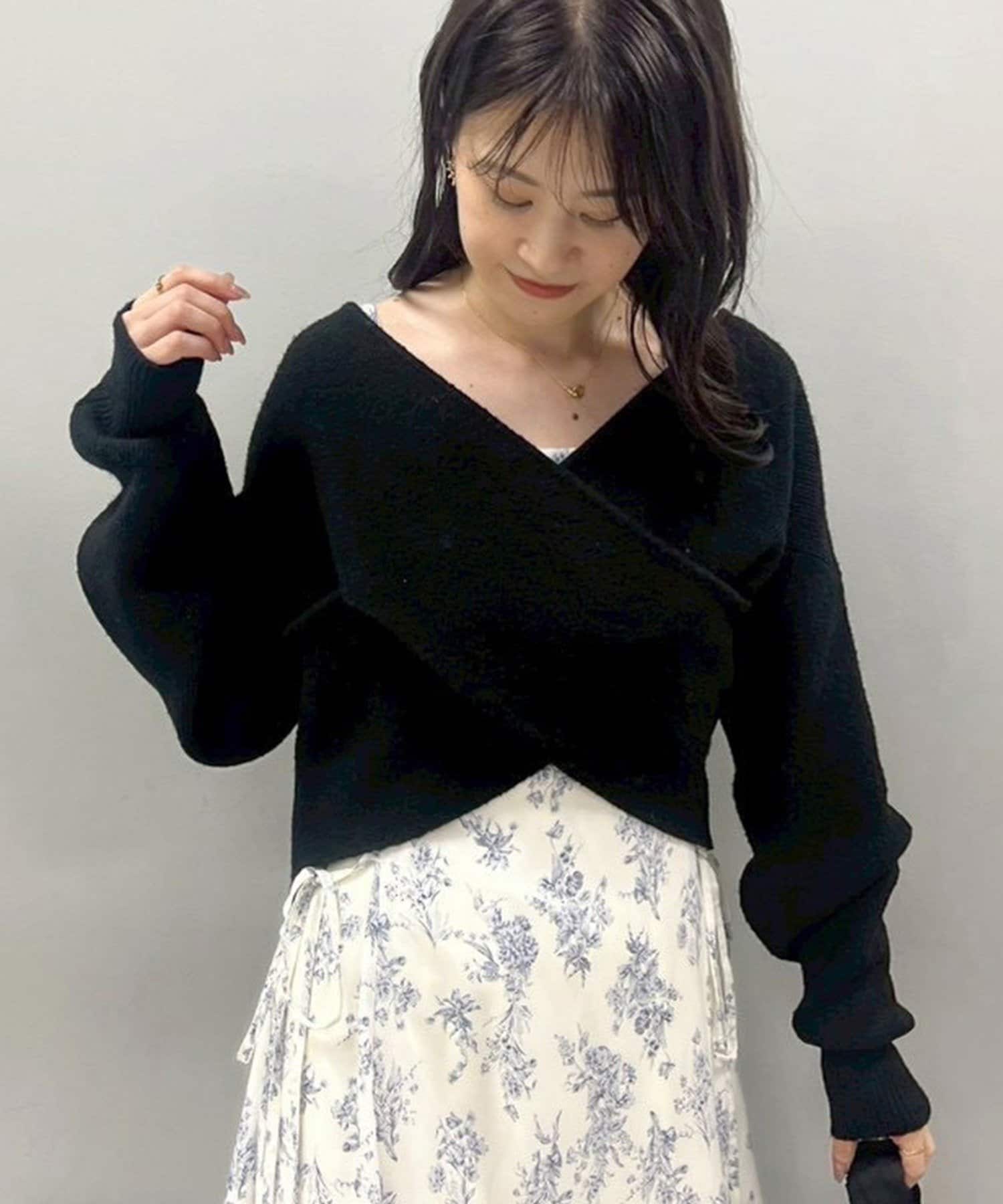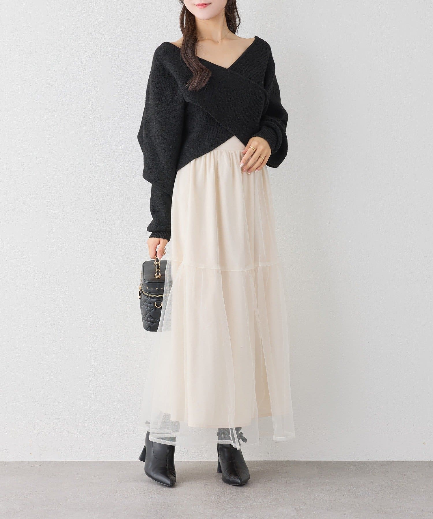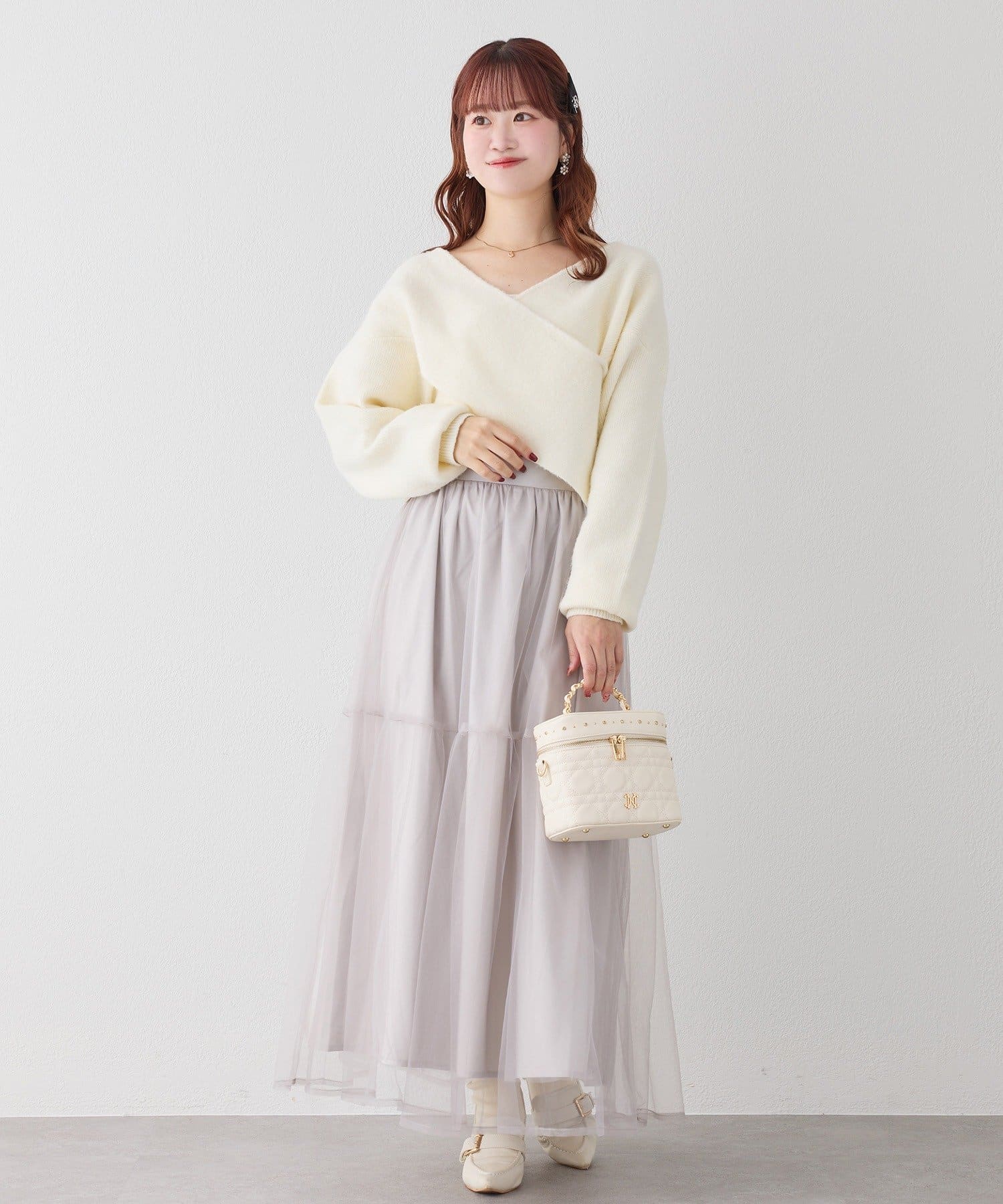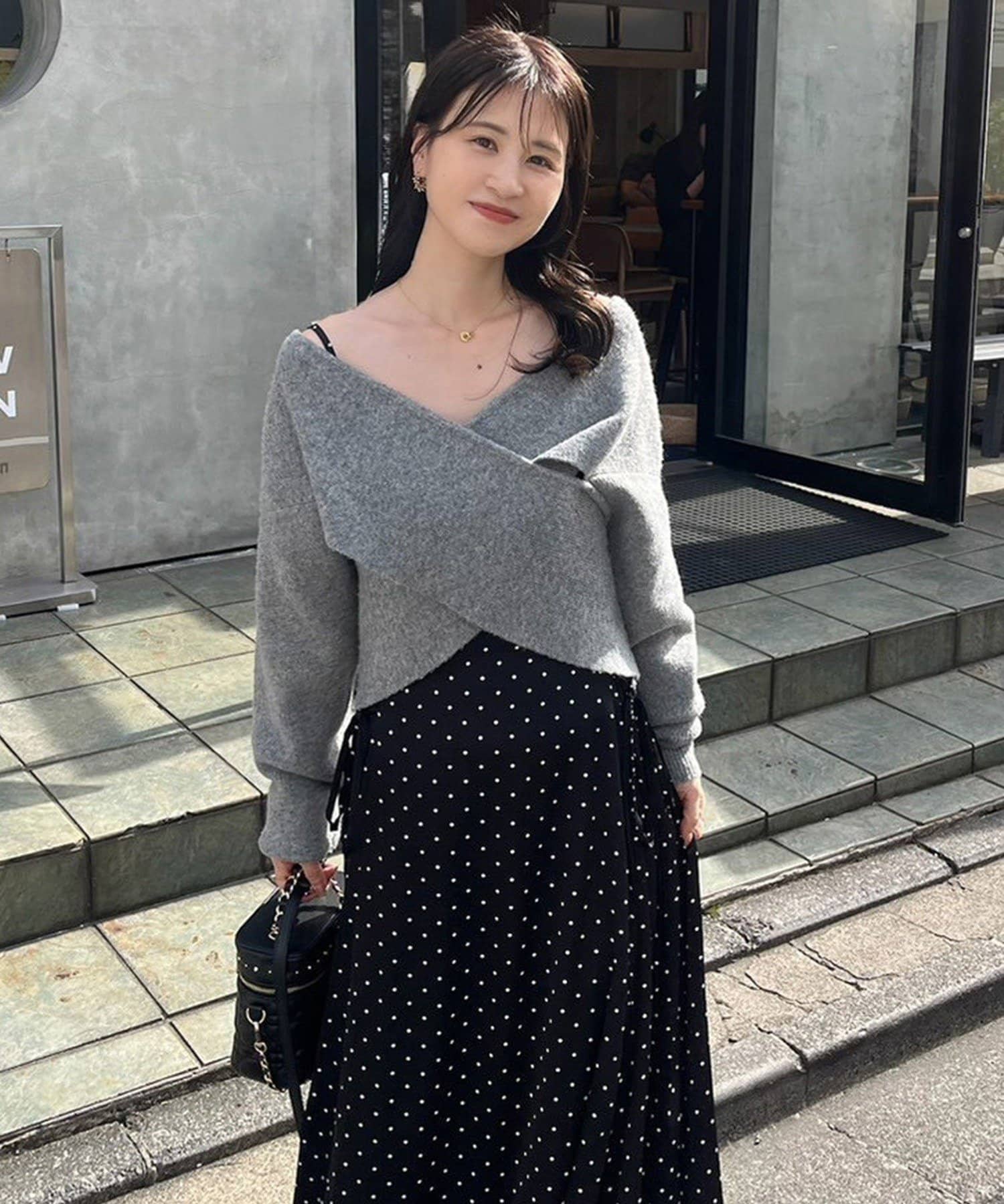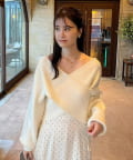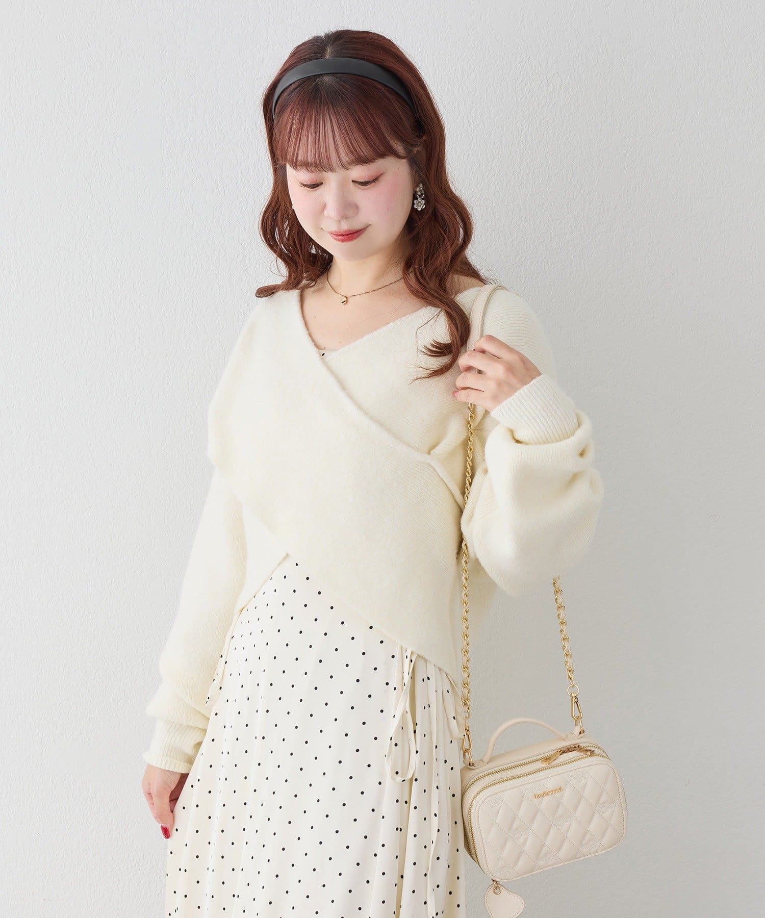 ニットは程よくフィットするクロスデザインで女性らしい印象に、