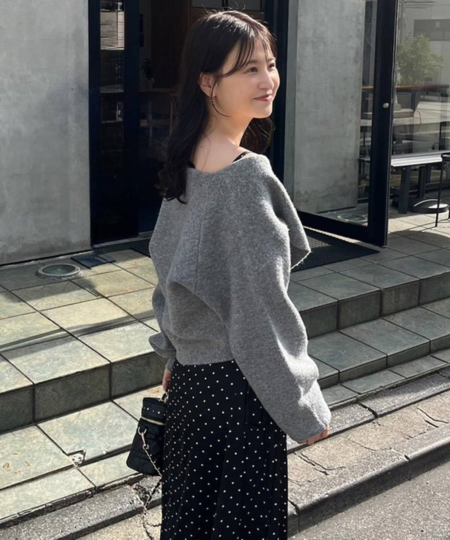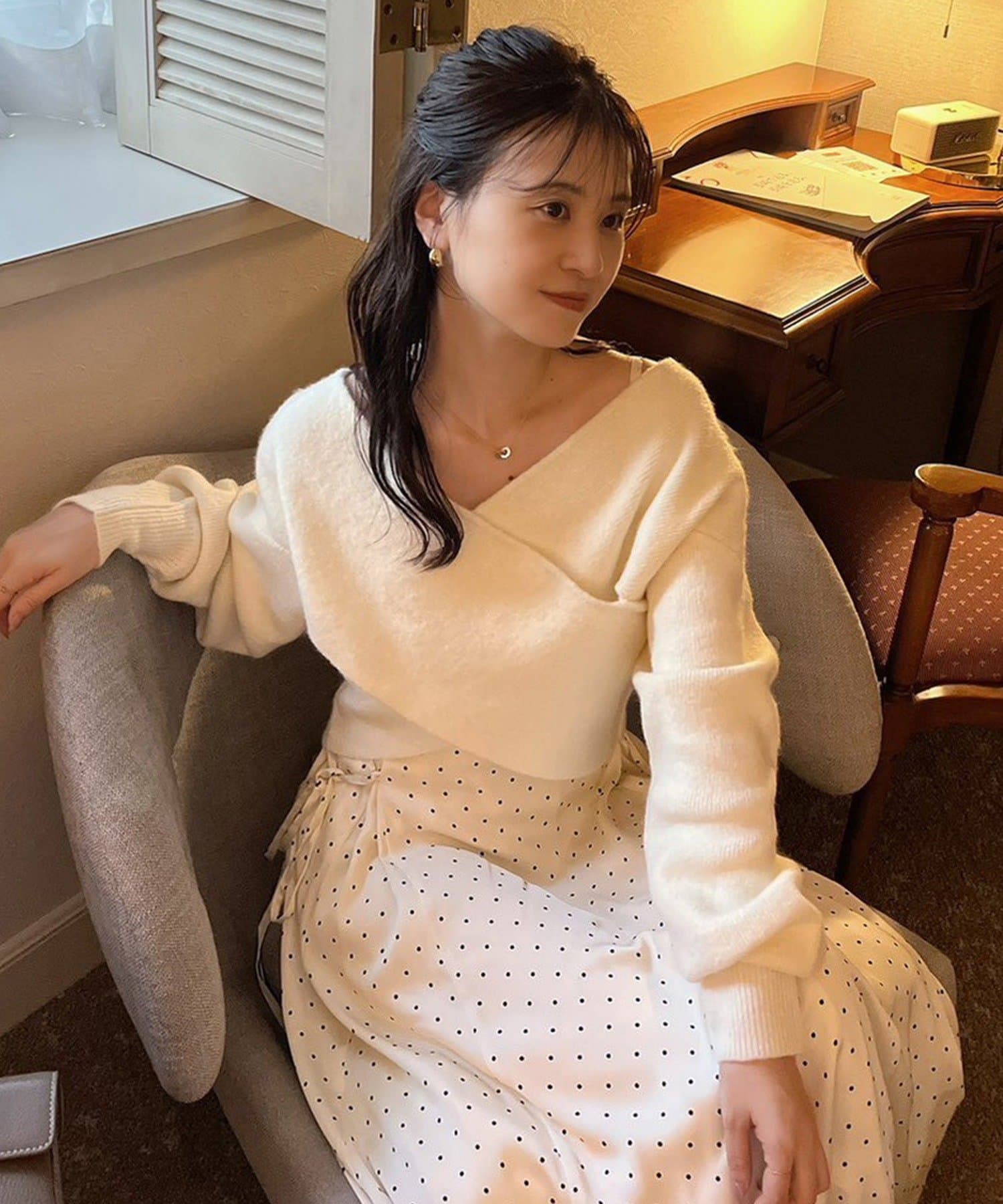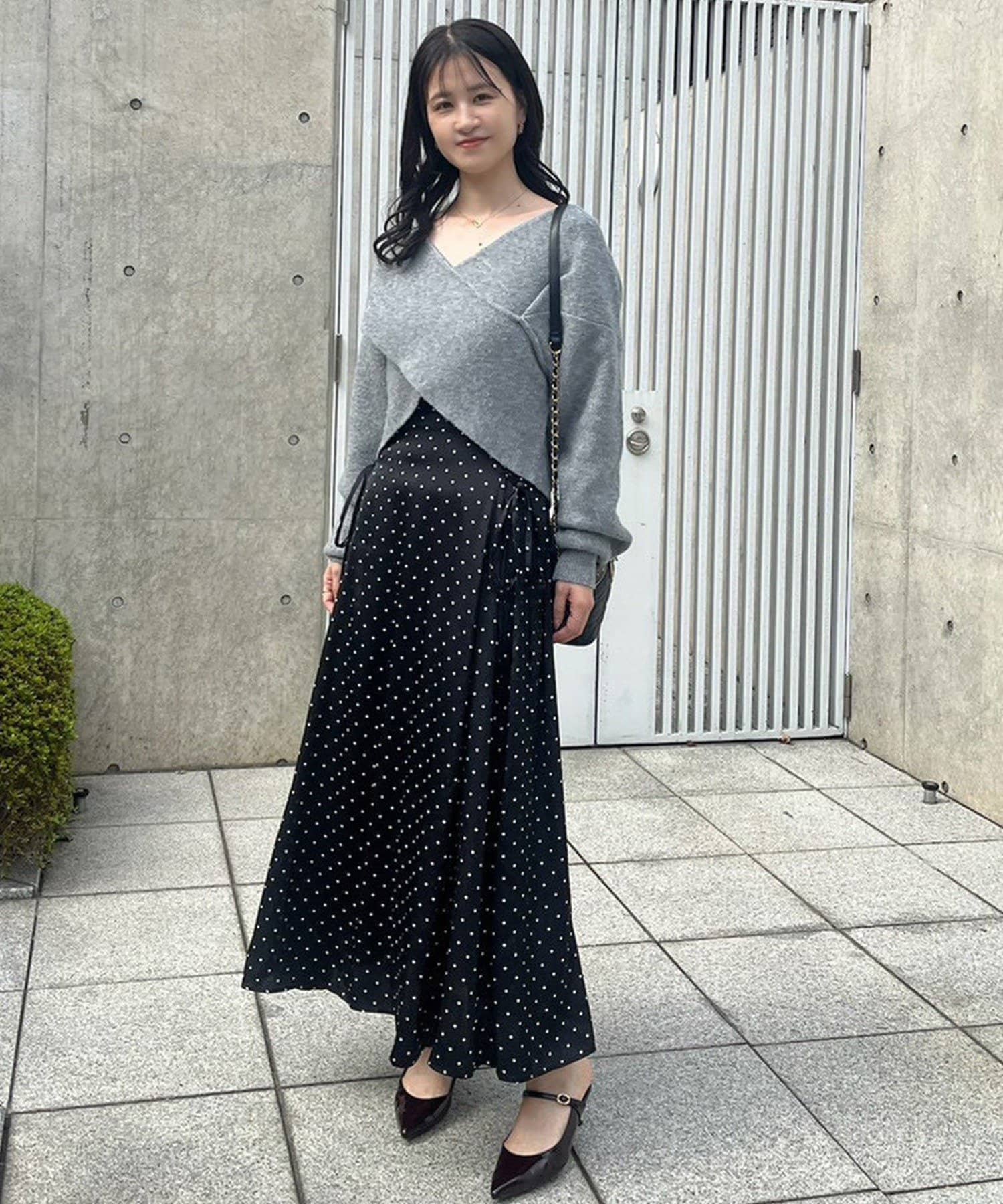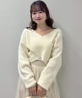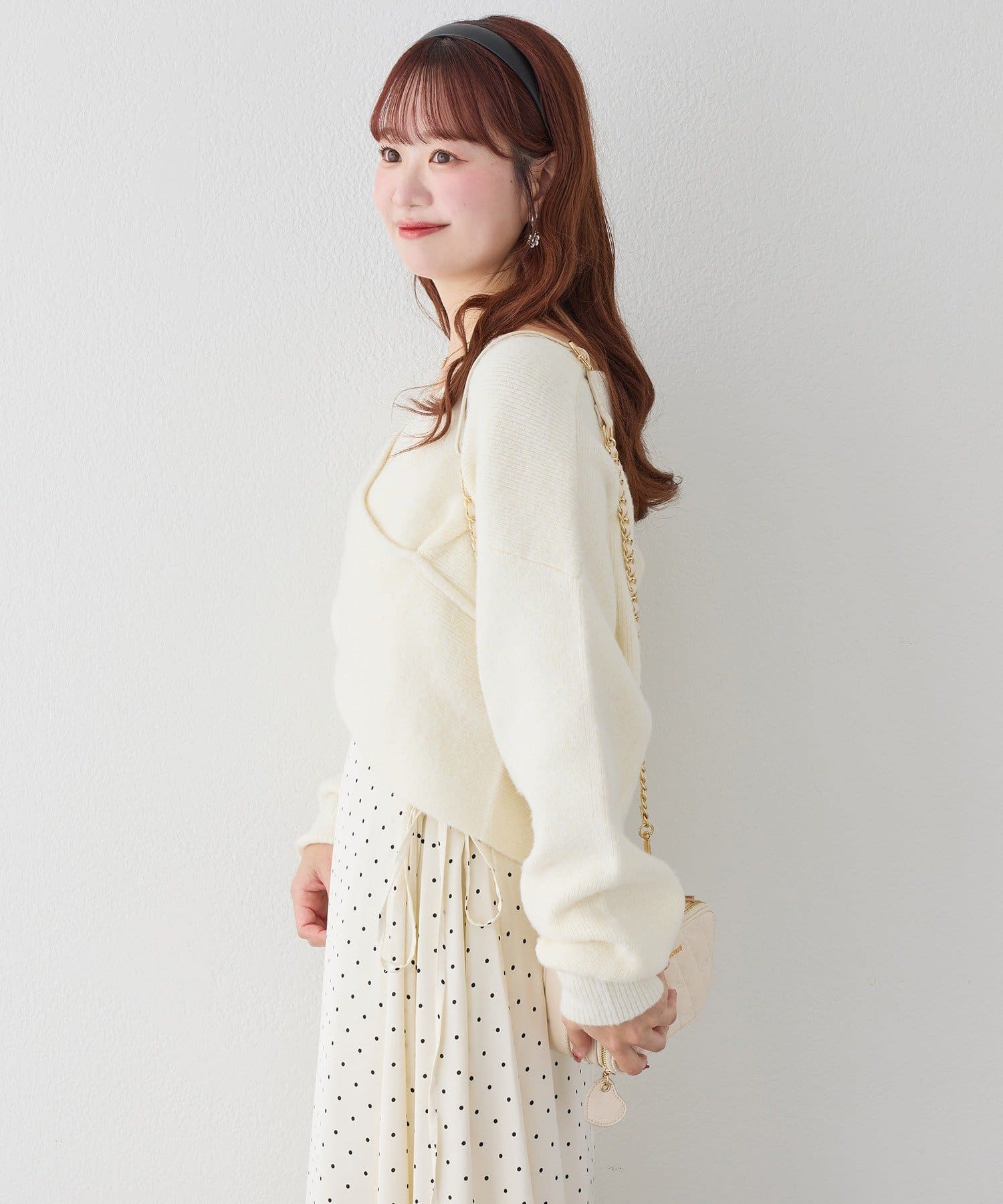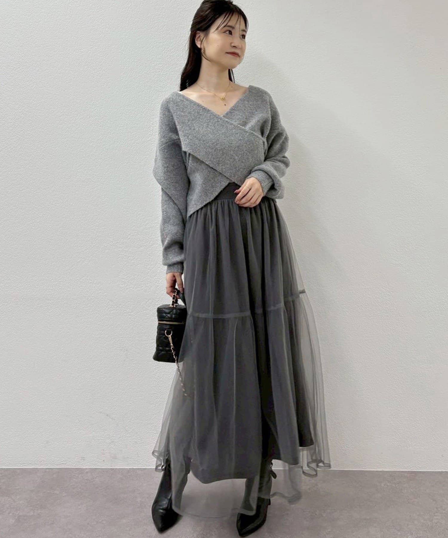 ニットは程よくフィットするクロスデザインで女性らしい印象に、