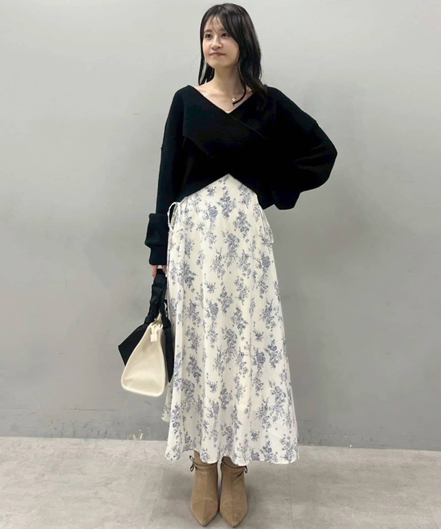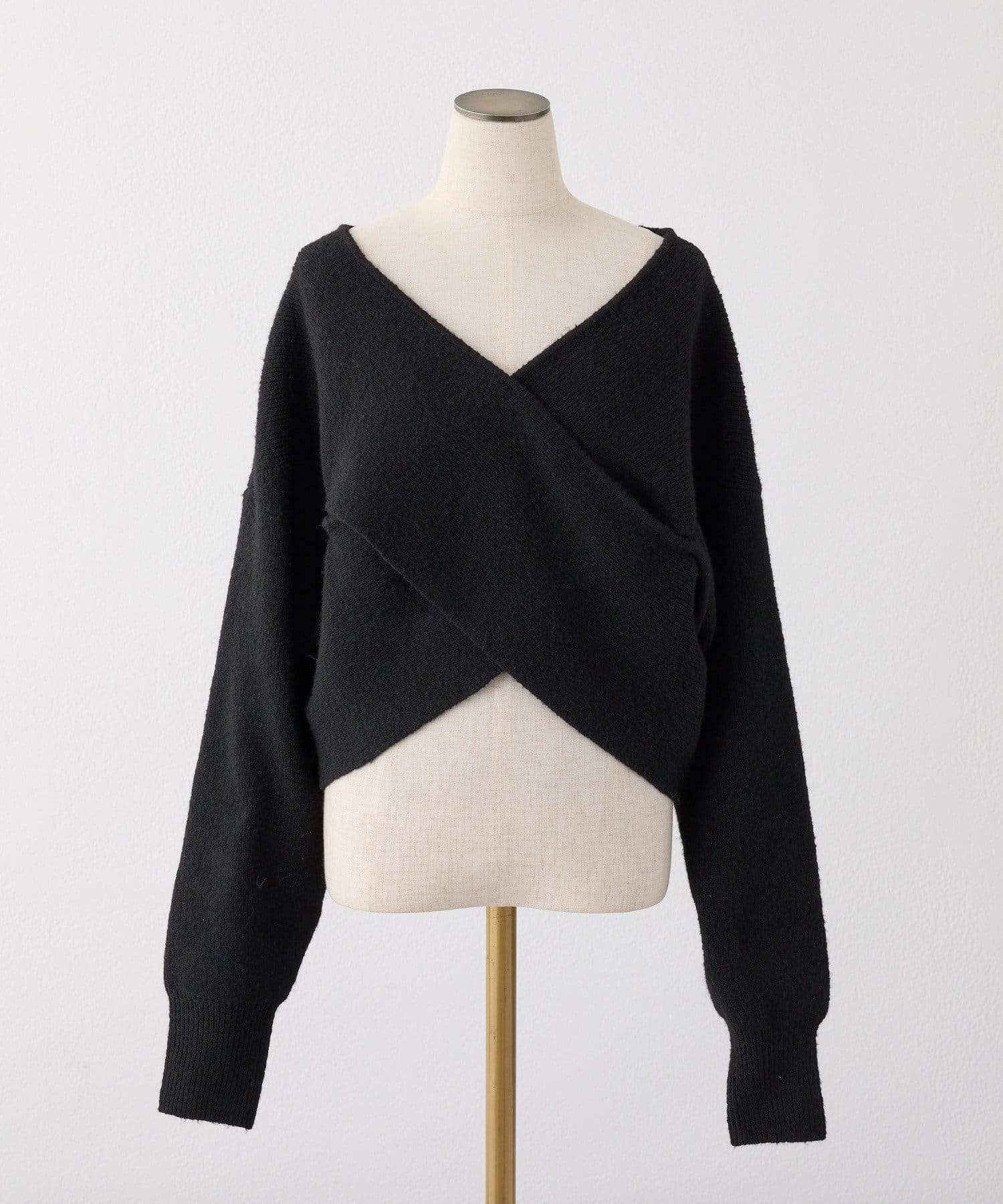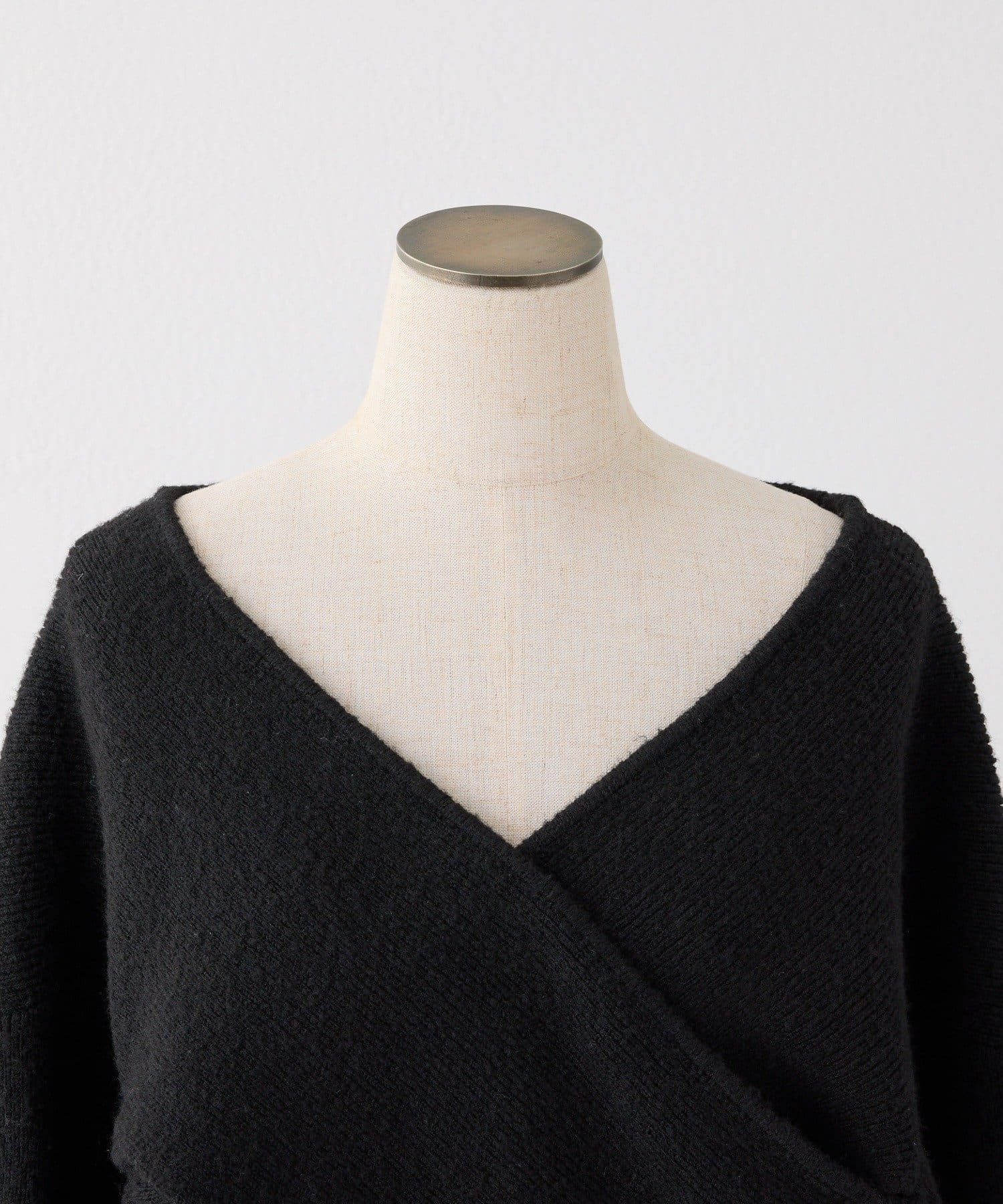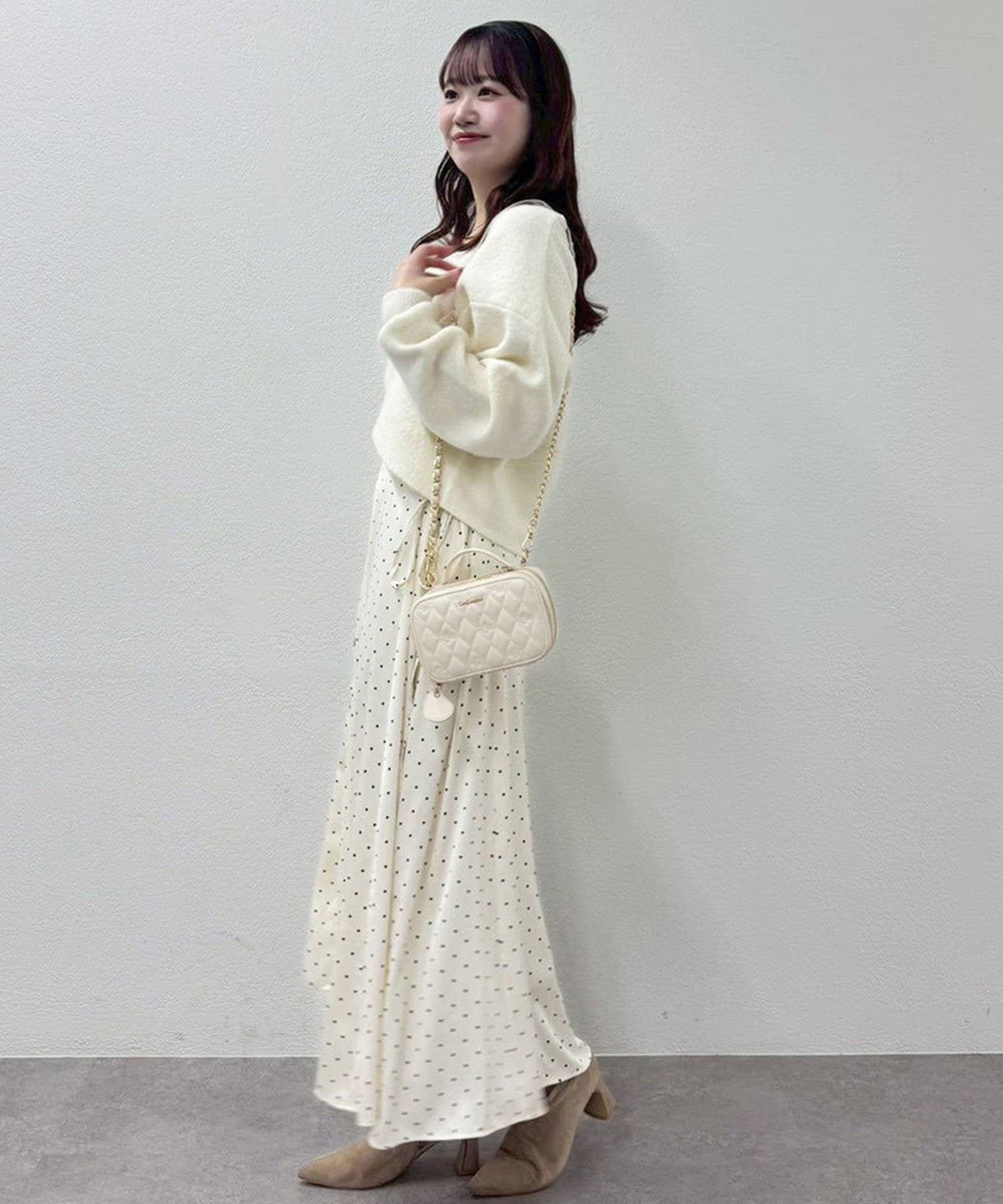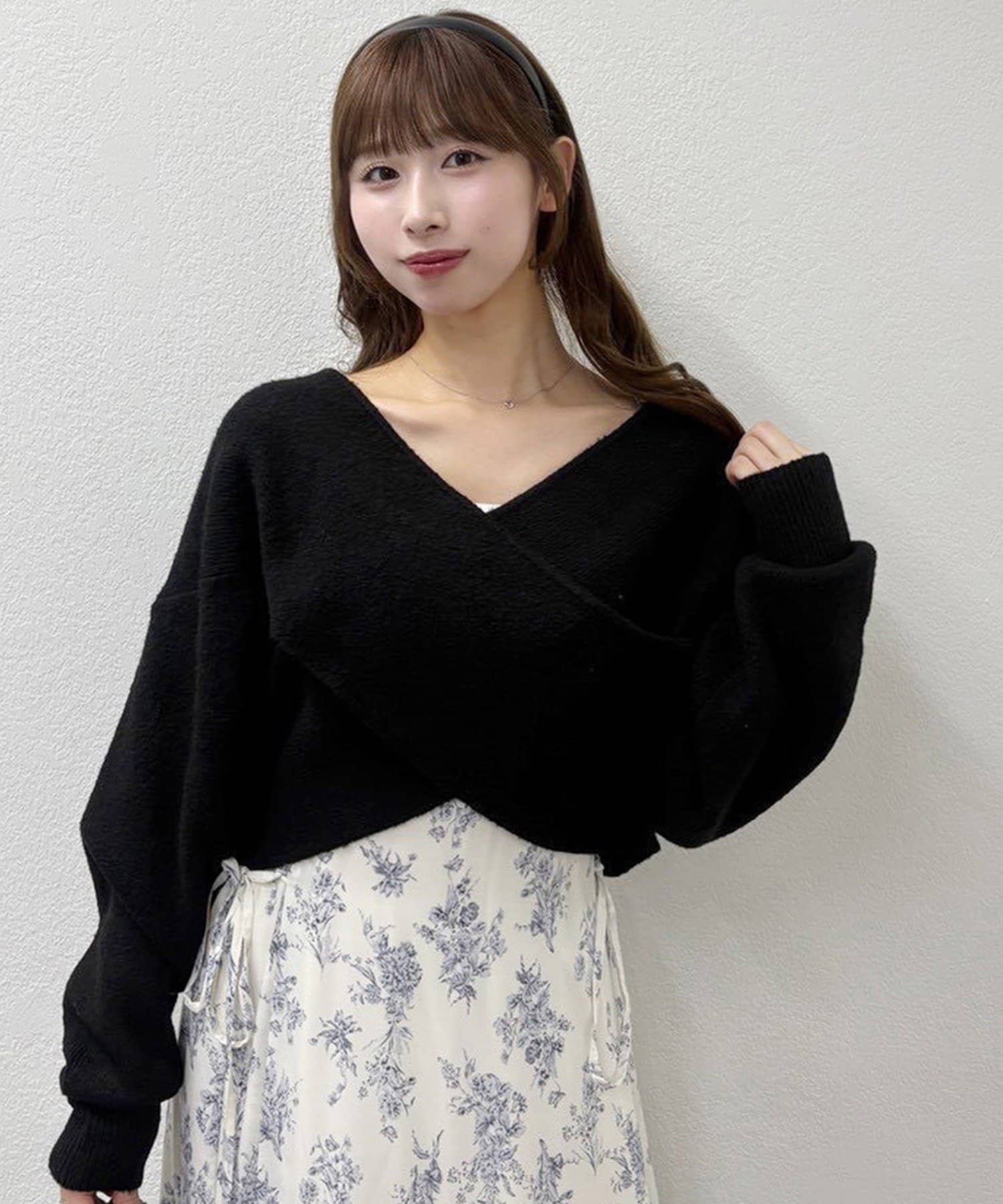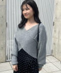 ニットは程よくフィットするクロスデザインで女性らしい印象に、