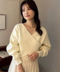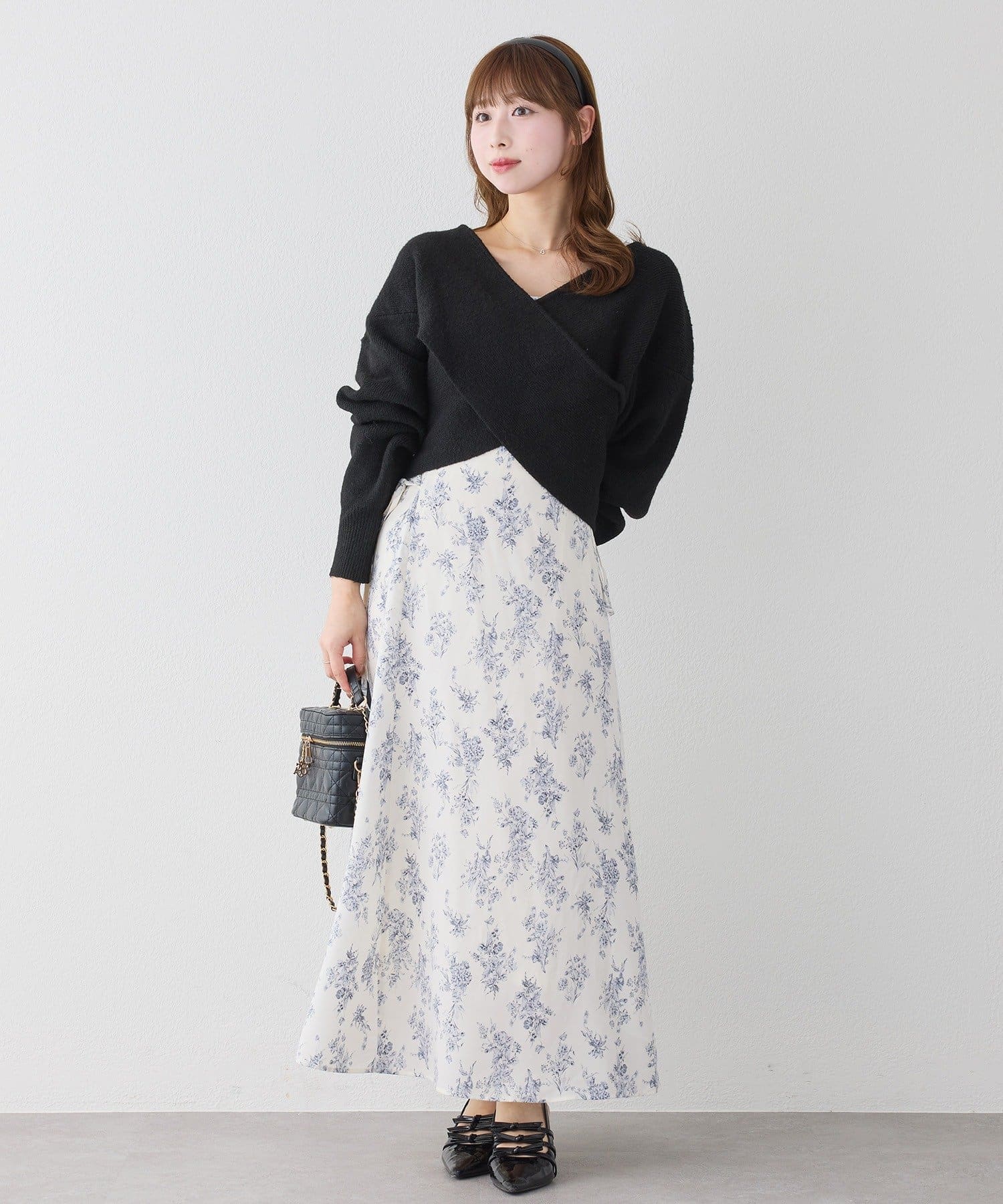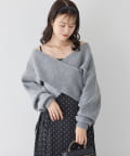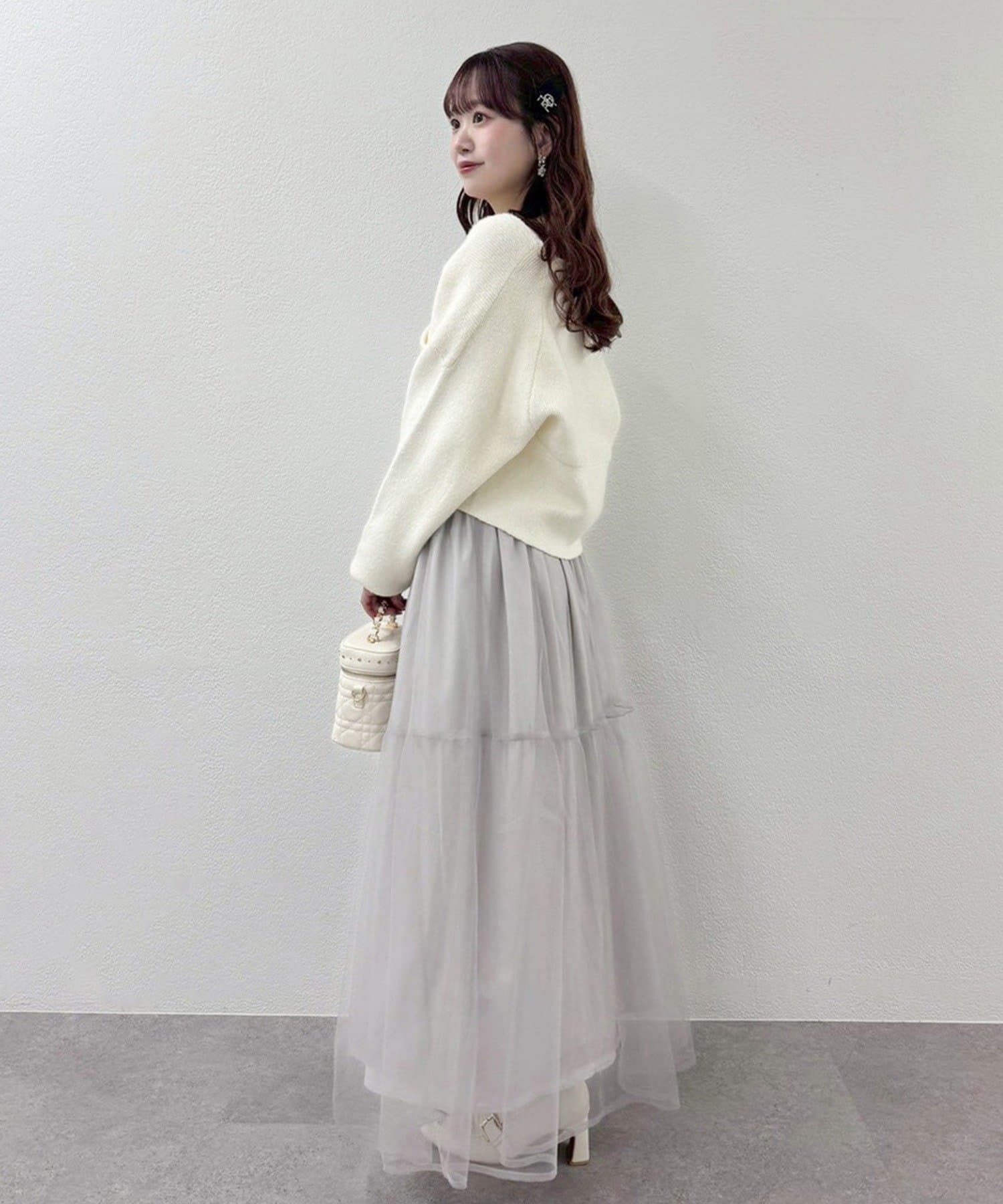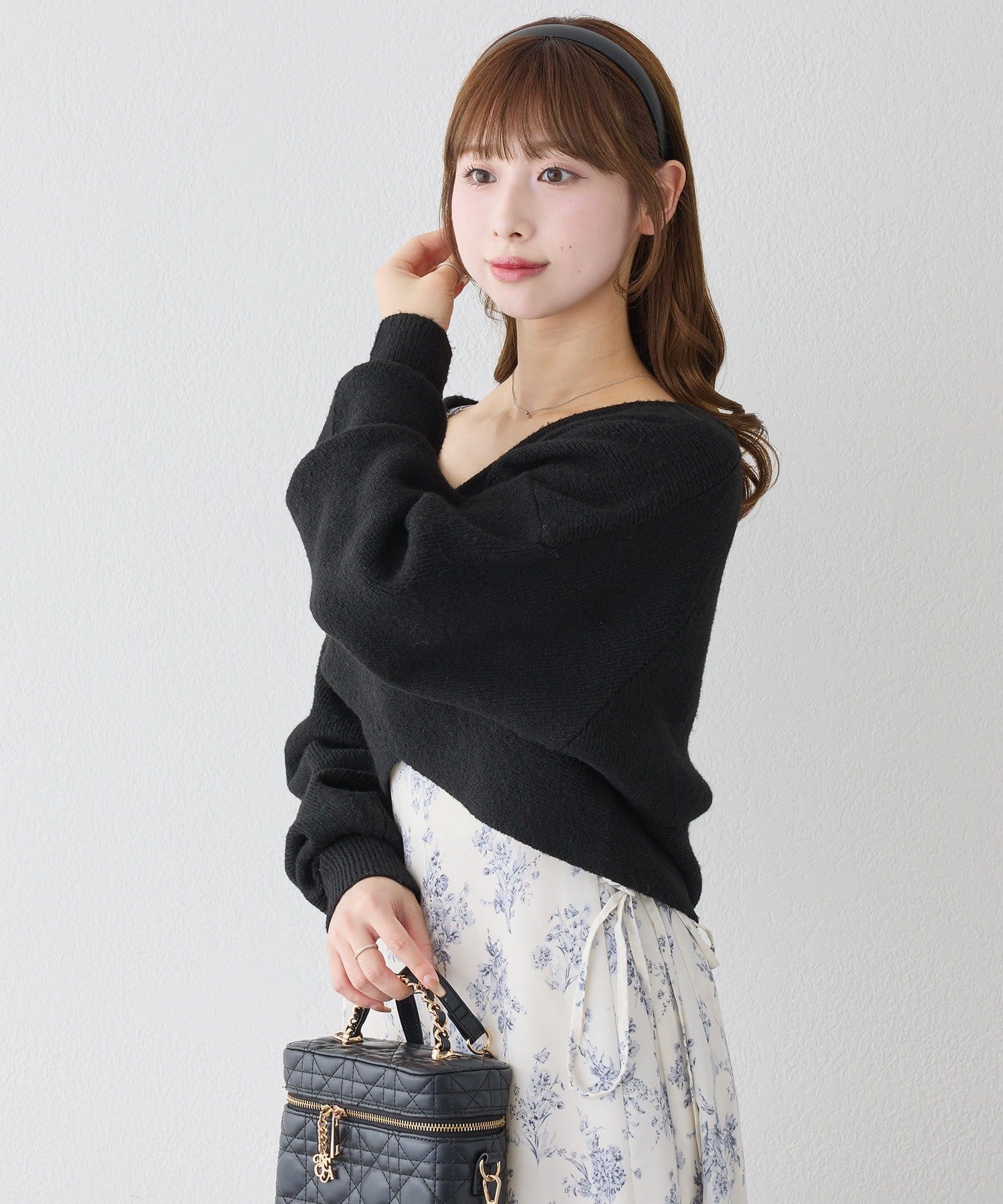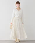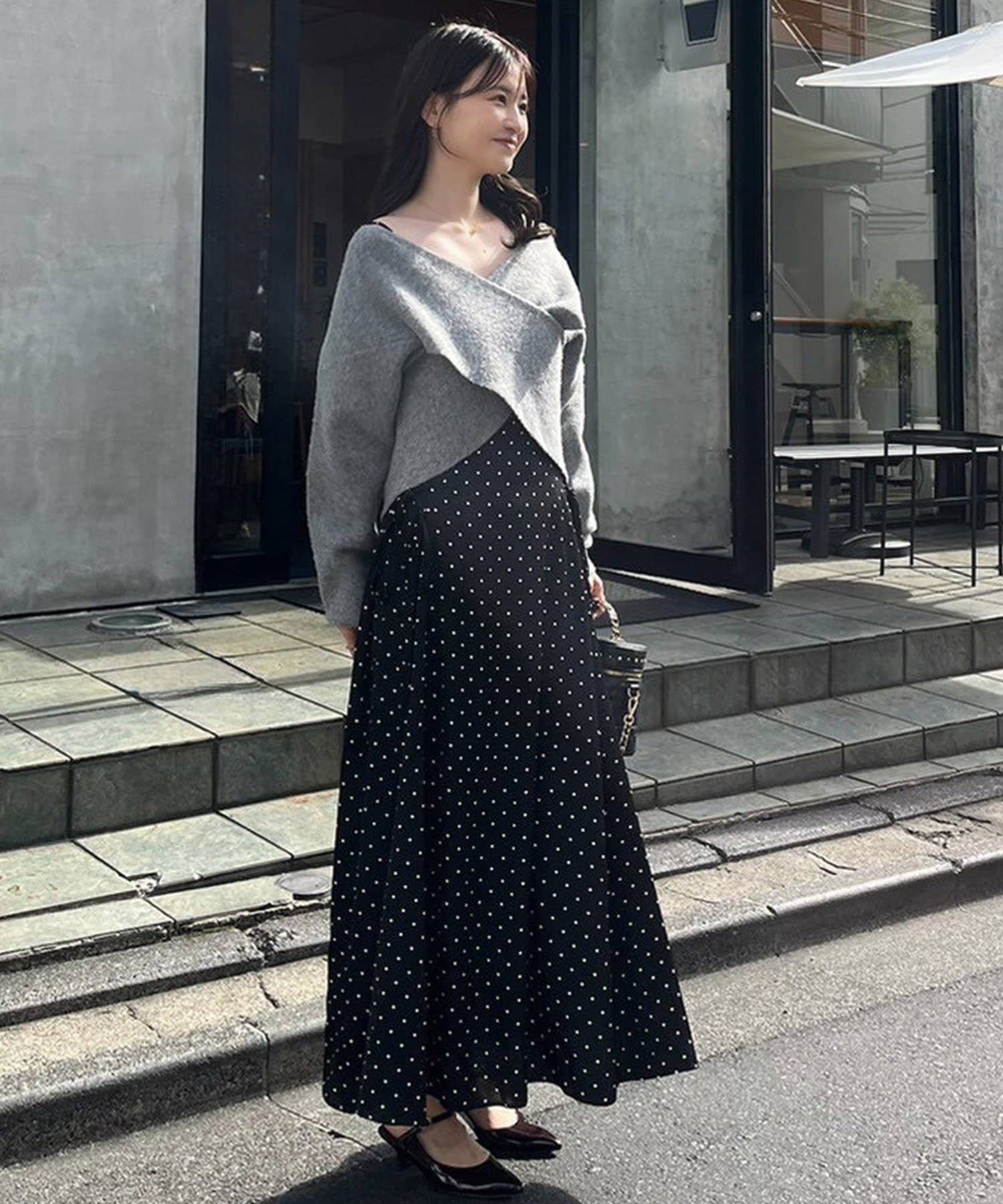 ニットは程よくフィットするクロスデザインで女性らしい印象に、