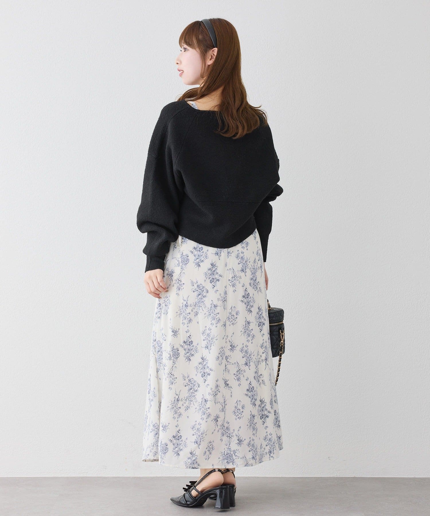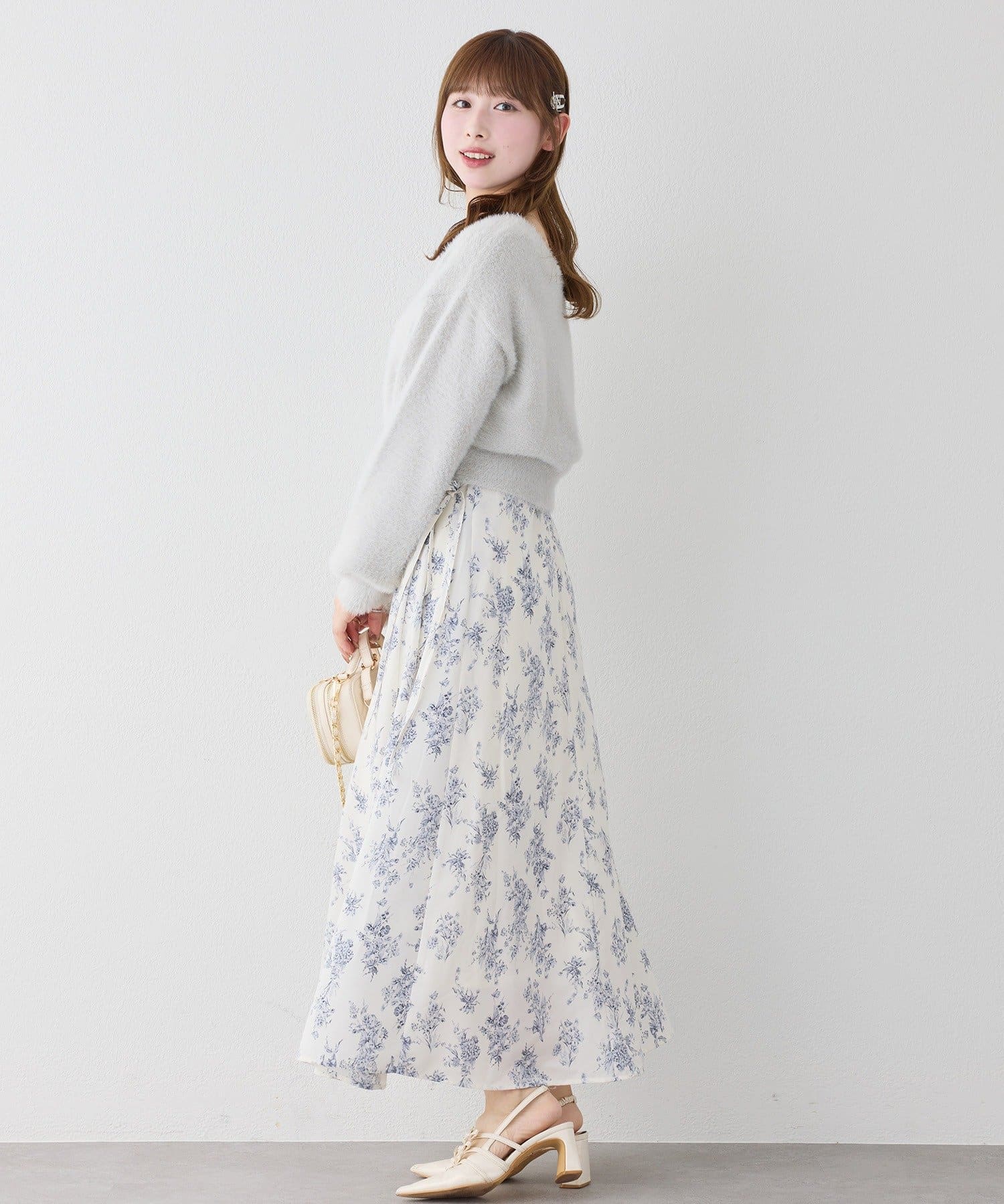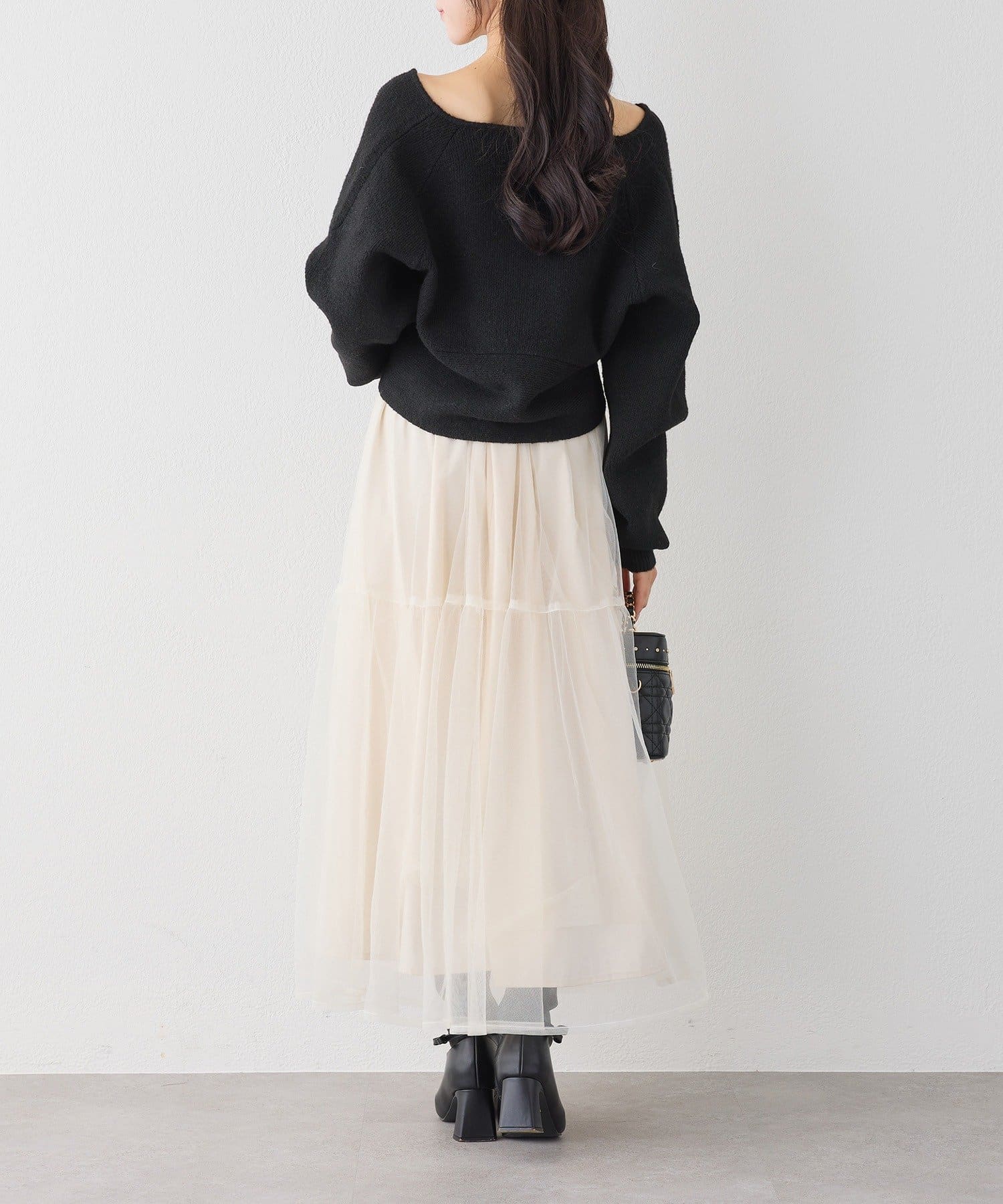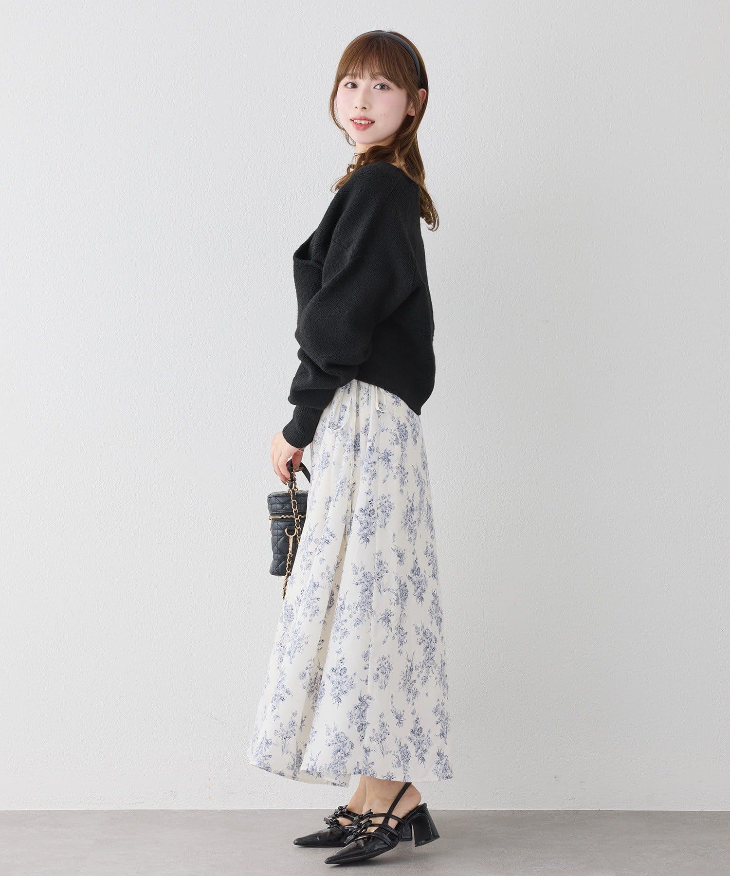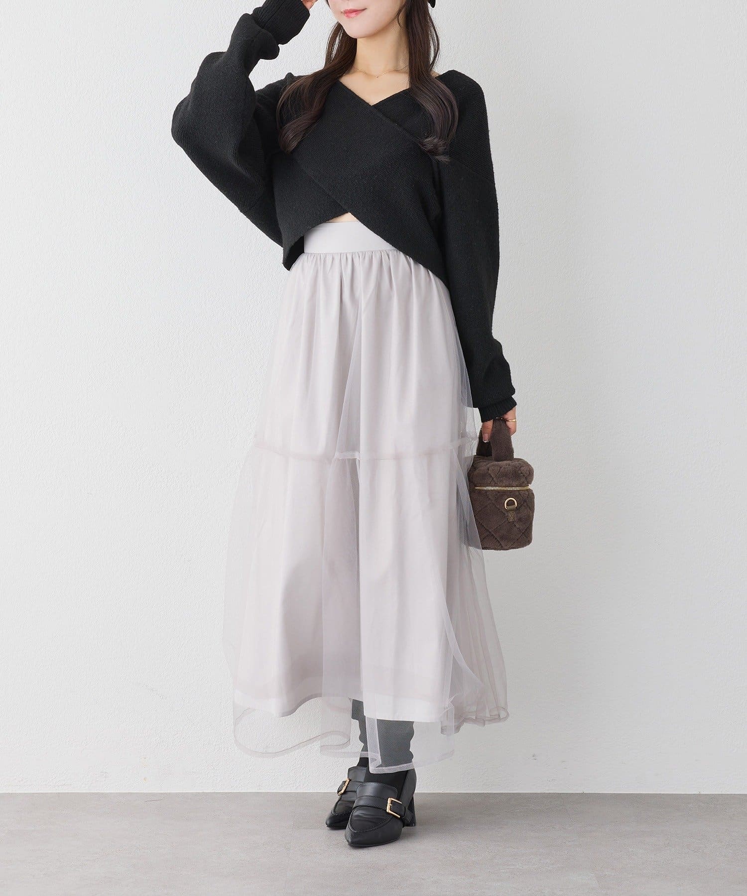 ニットは程よくフィットするクロスデザインで女性らしい印象に、