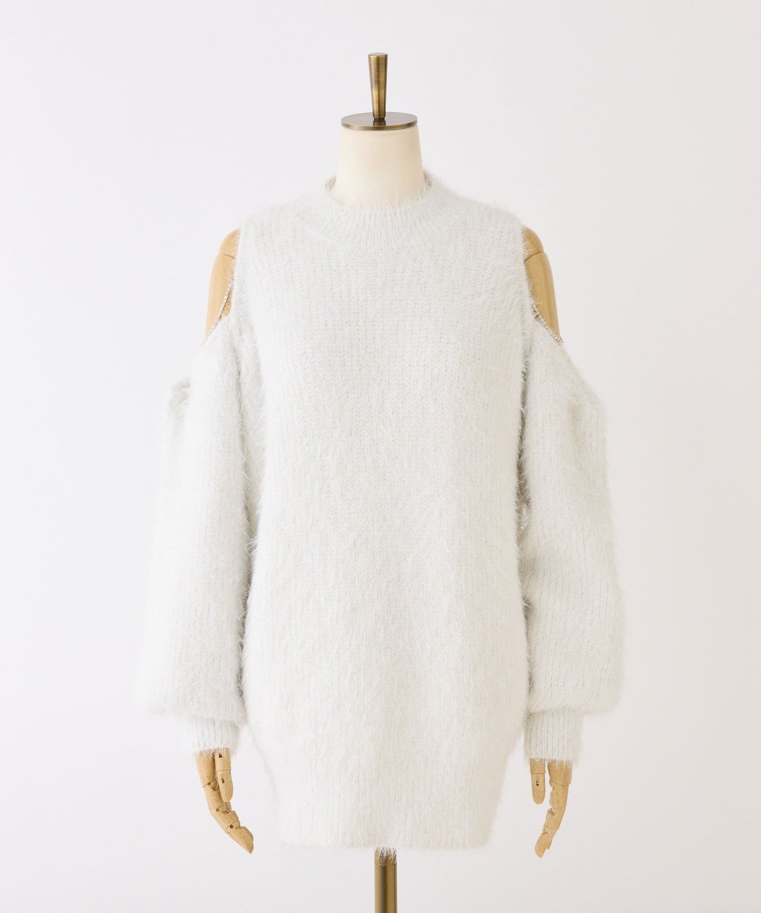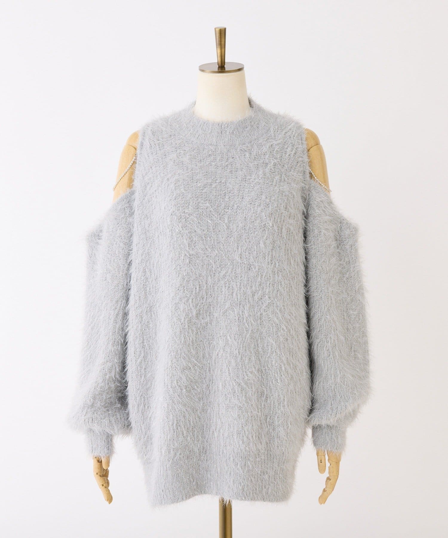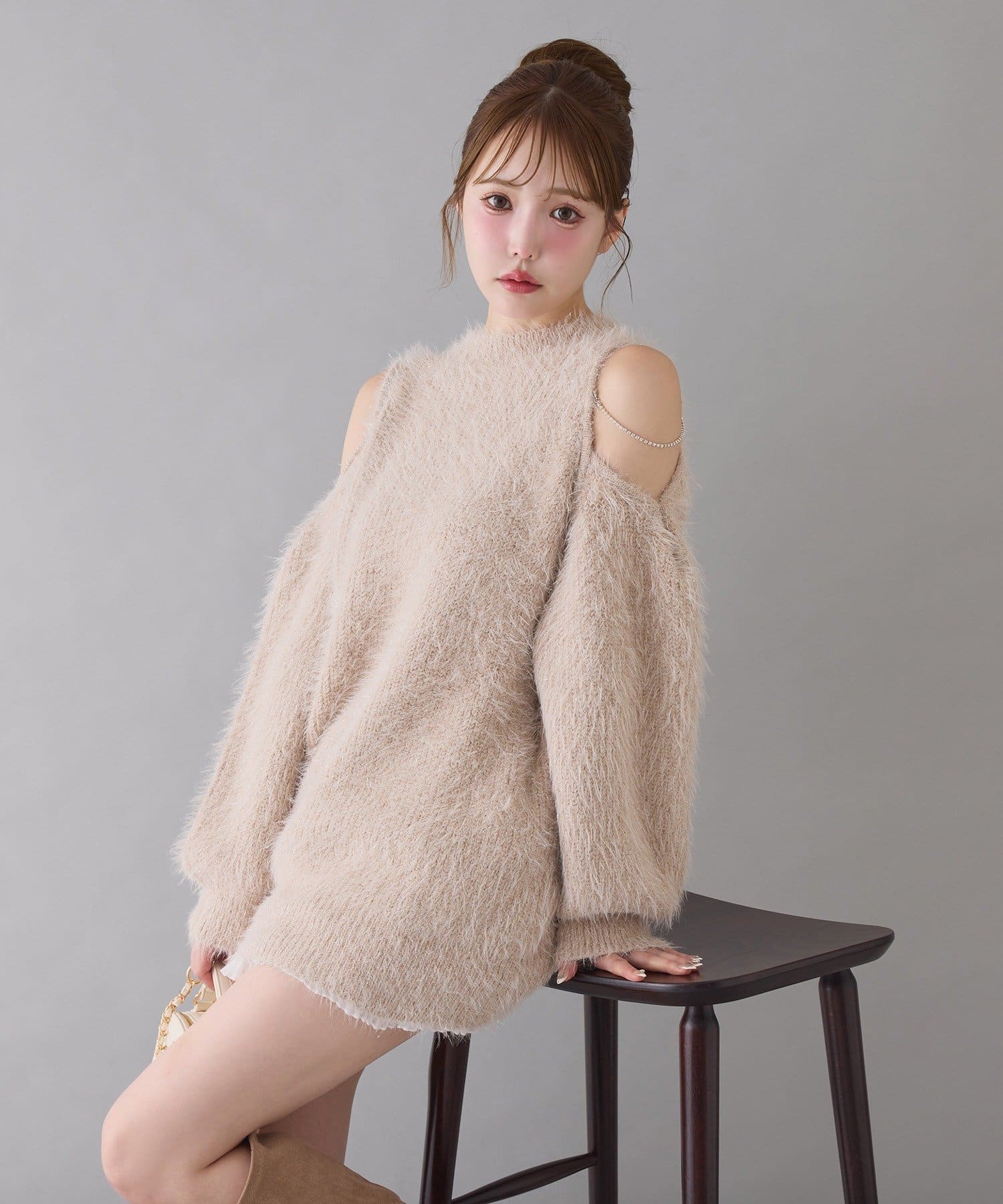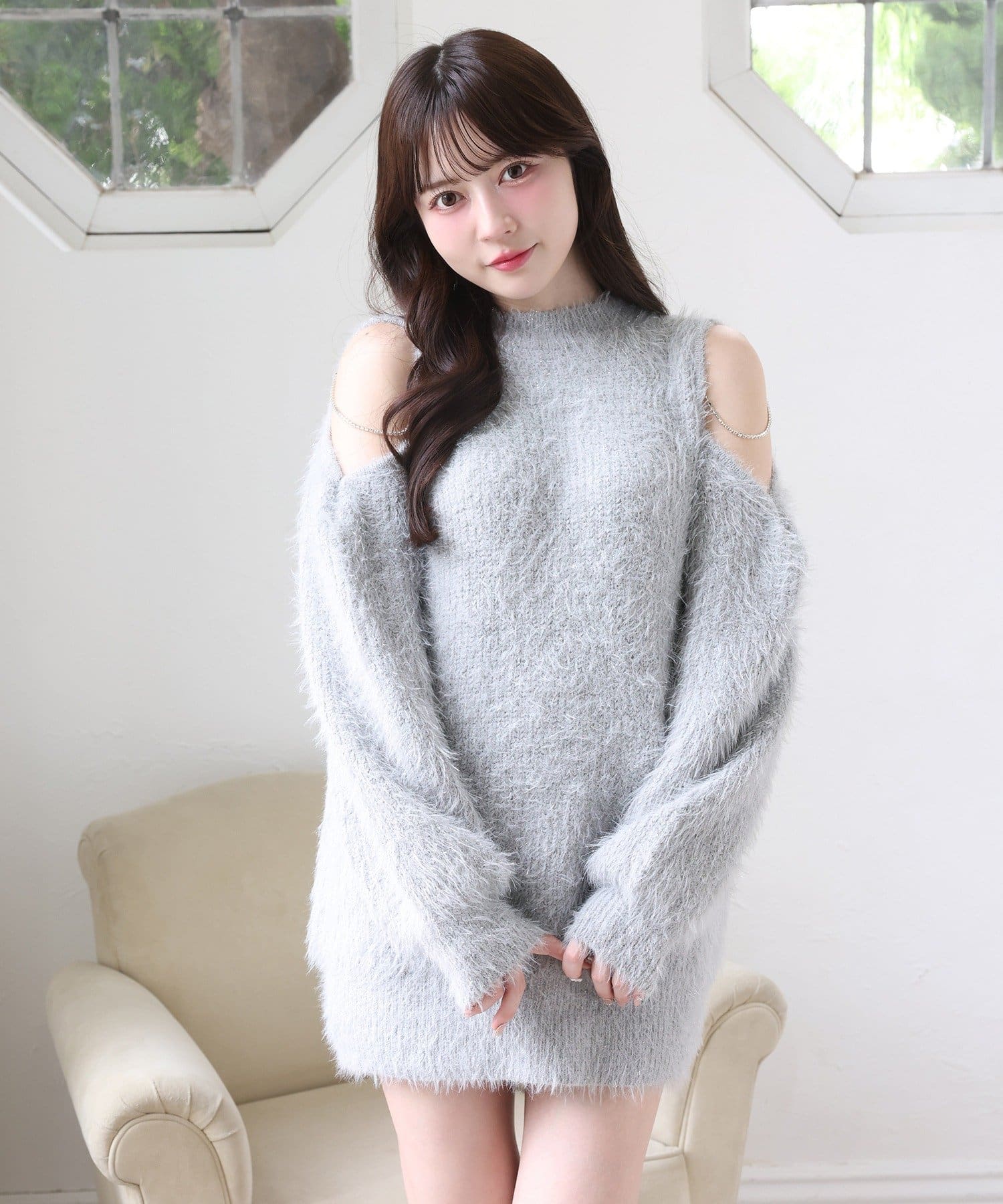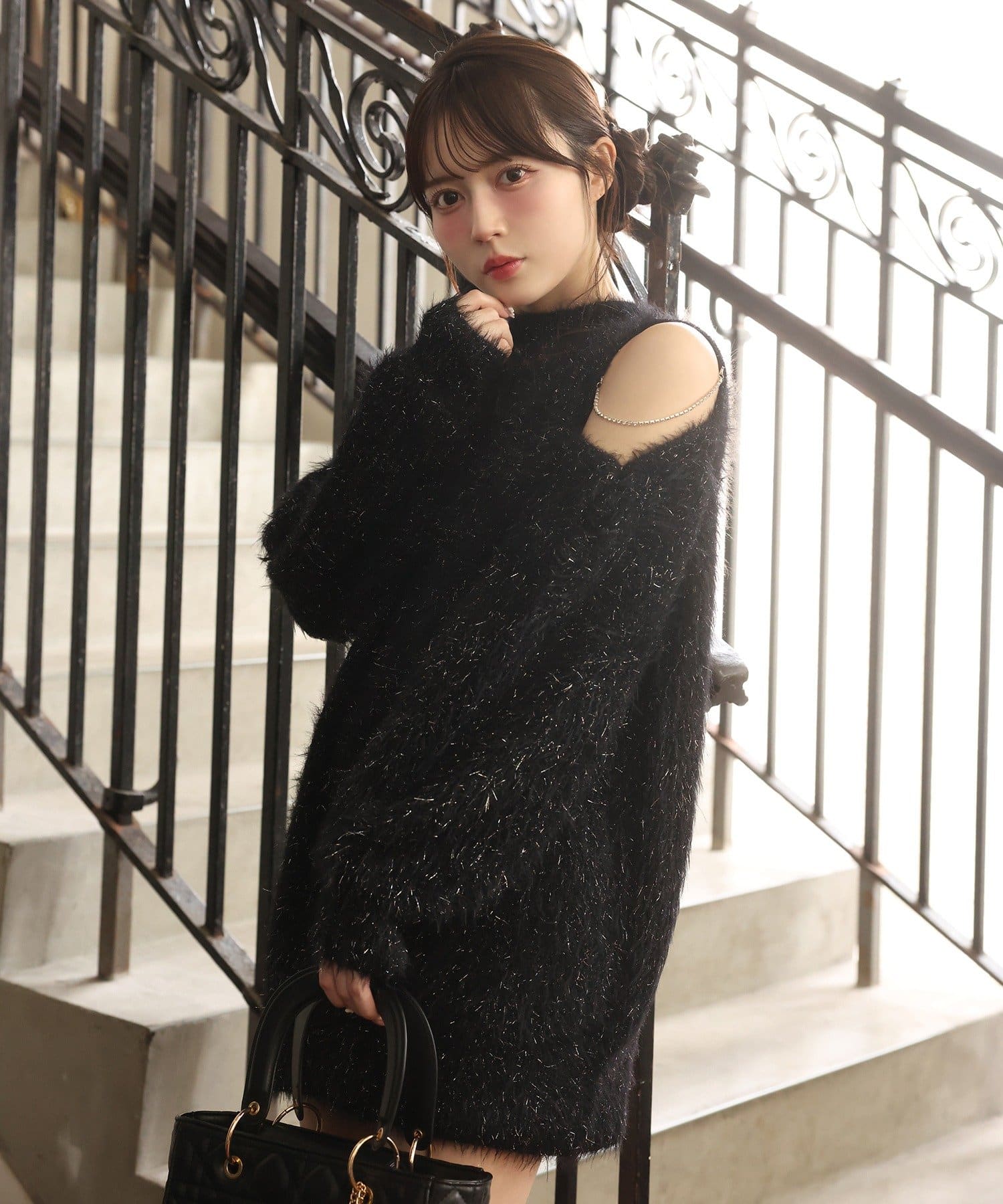 肩あきデザインにキラキラチェーンをあしらったミニニットワンピース。