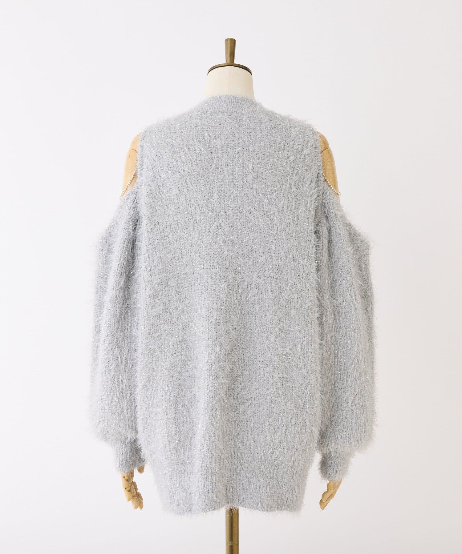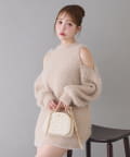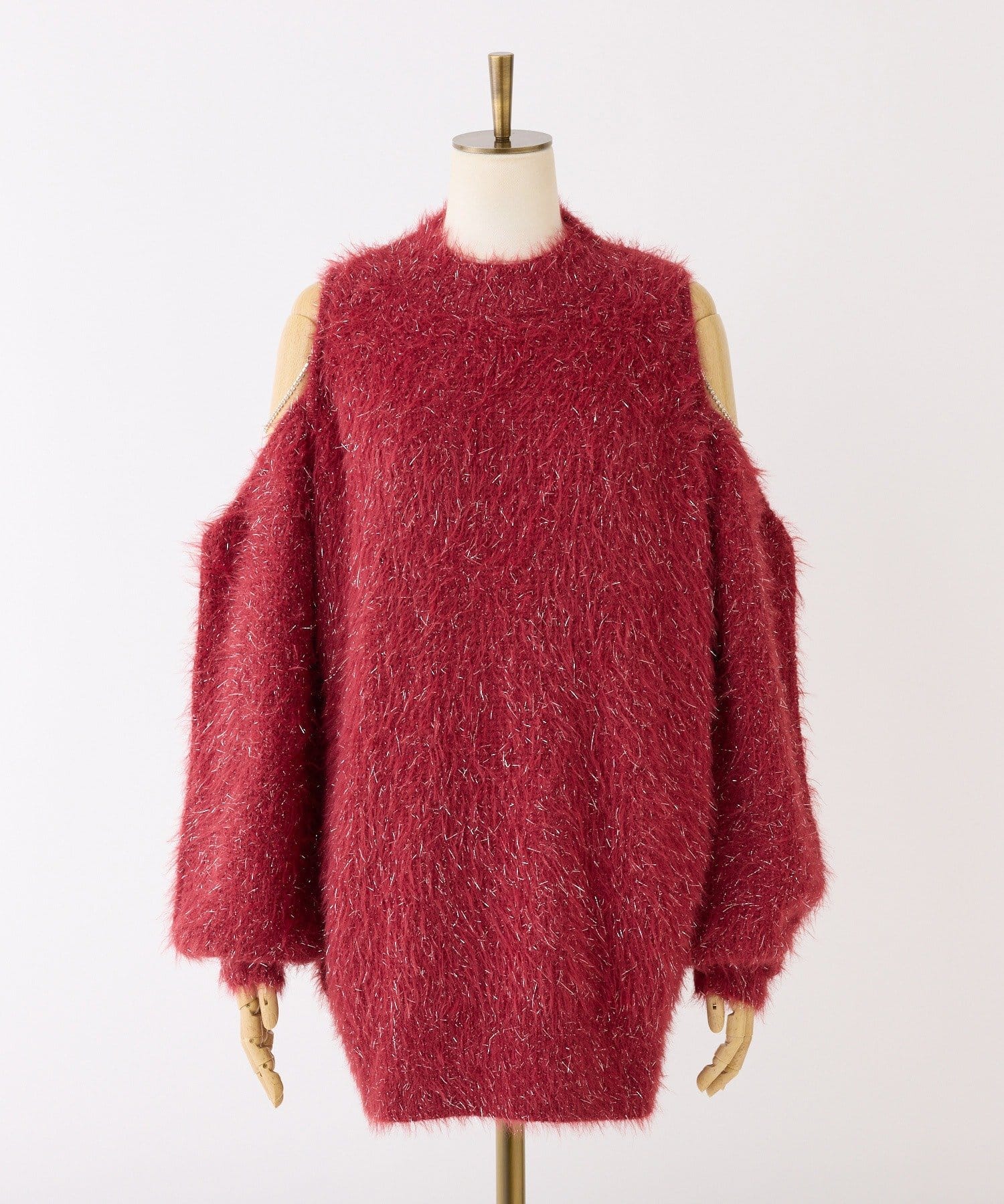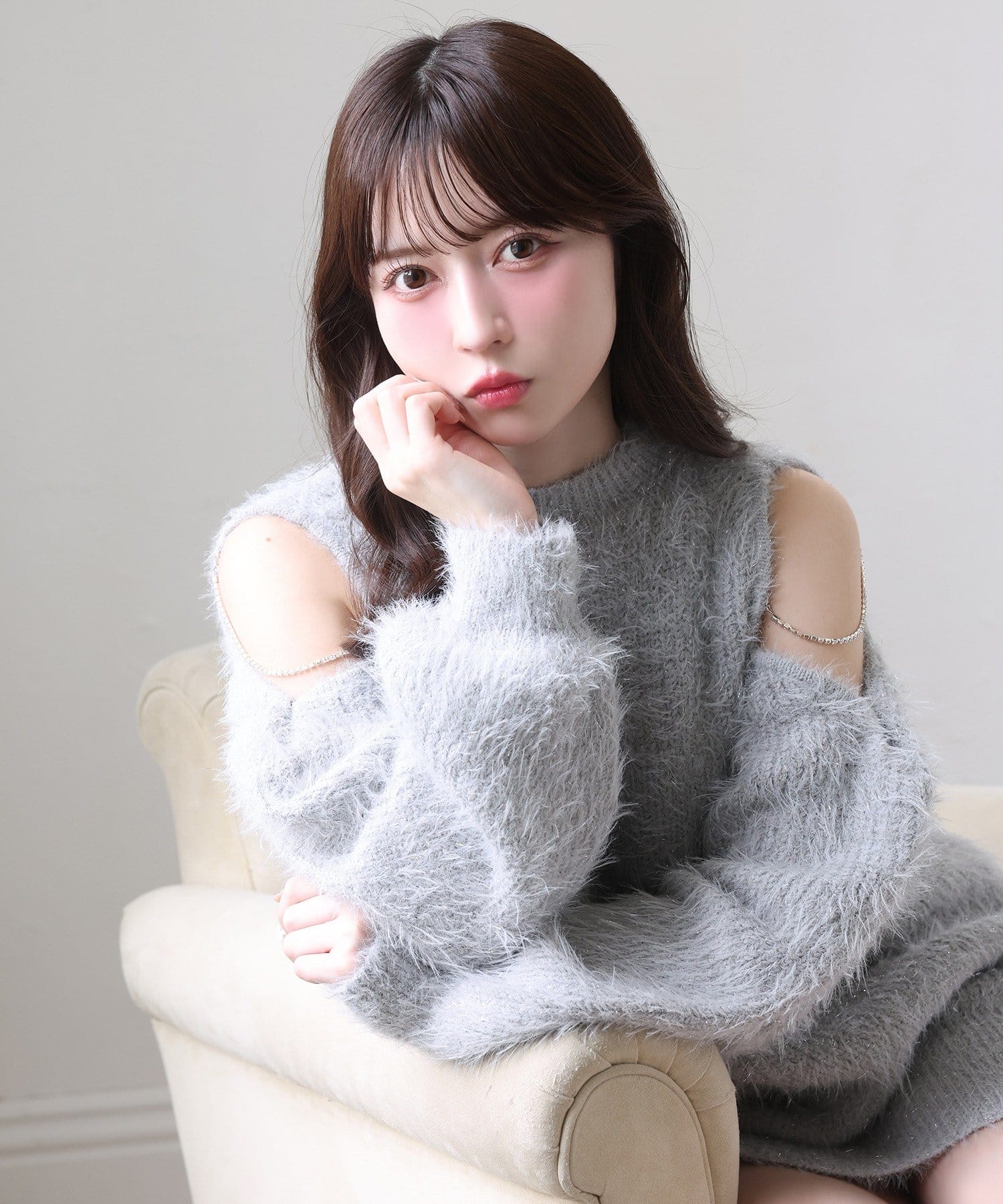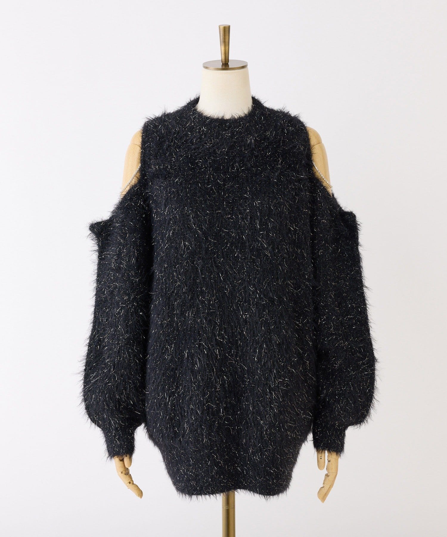 肩あきデザインにキラキラチェーンをあしらったミニニットワンピース。