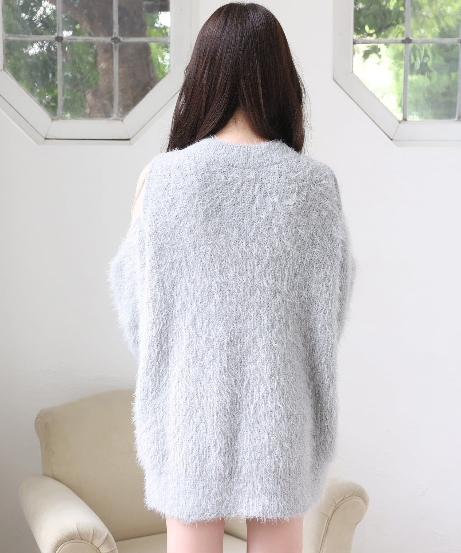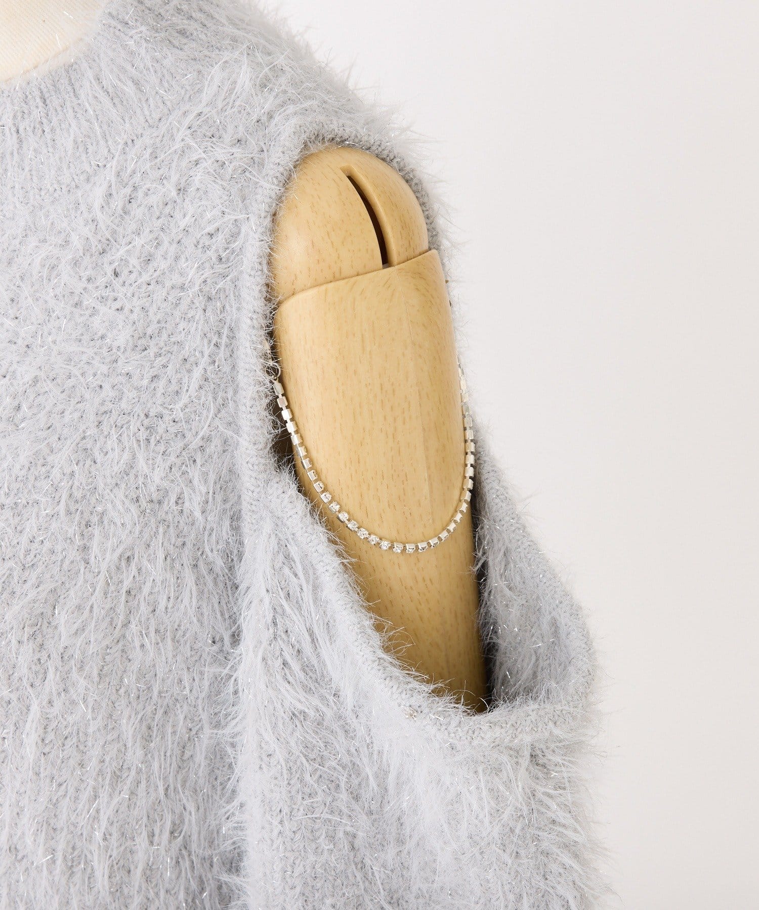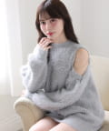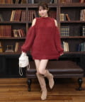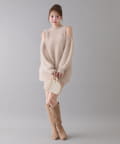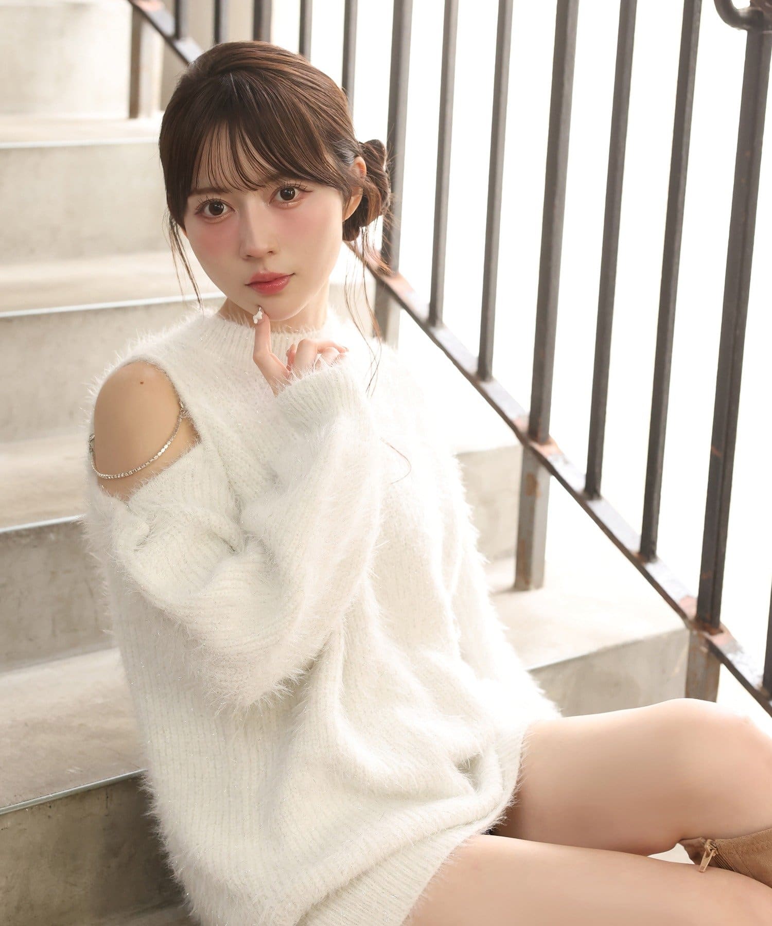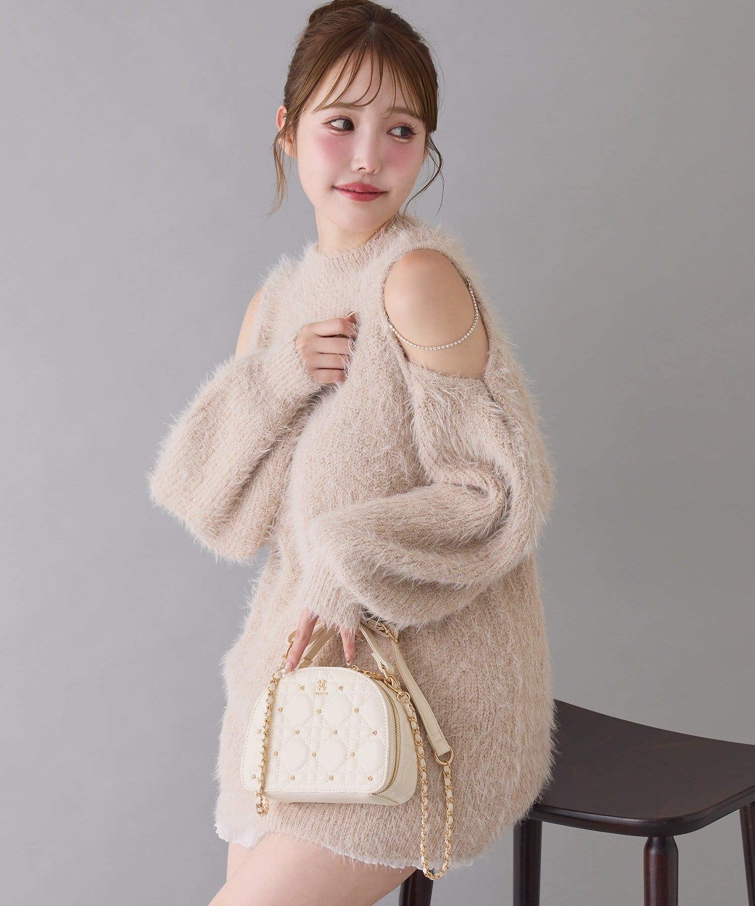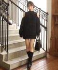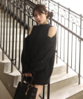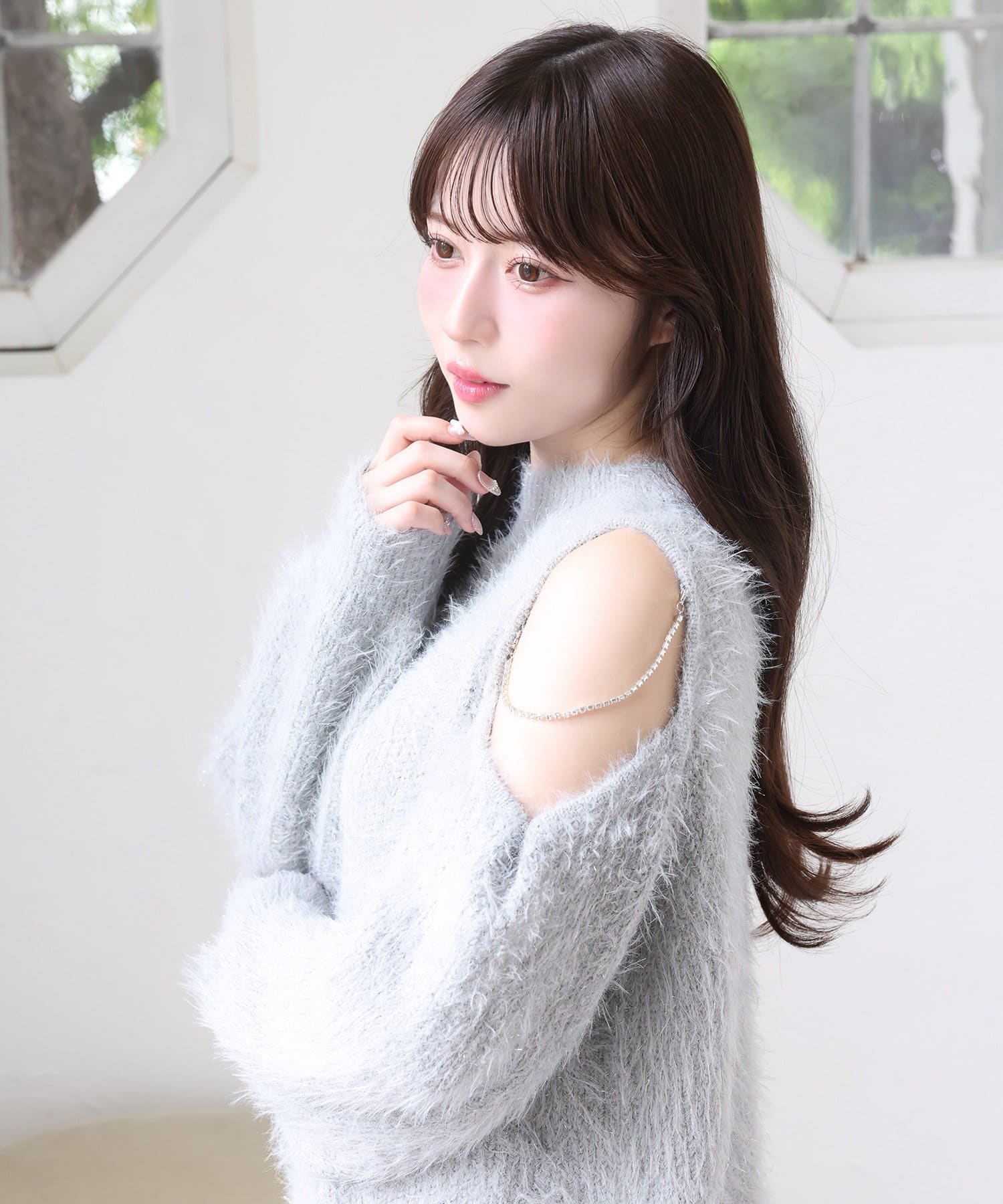 肩あきデザインにキラキラチェーンをあしらったミニニットワンピース。