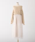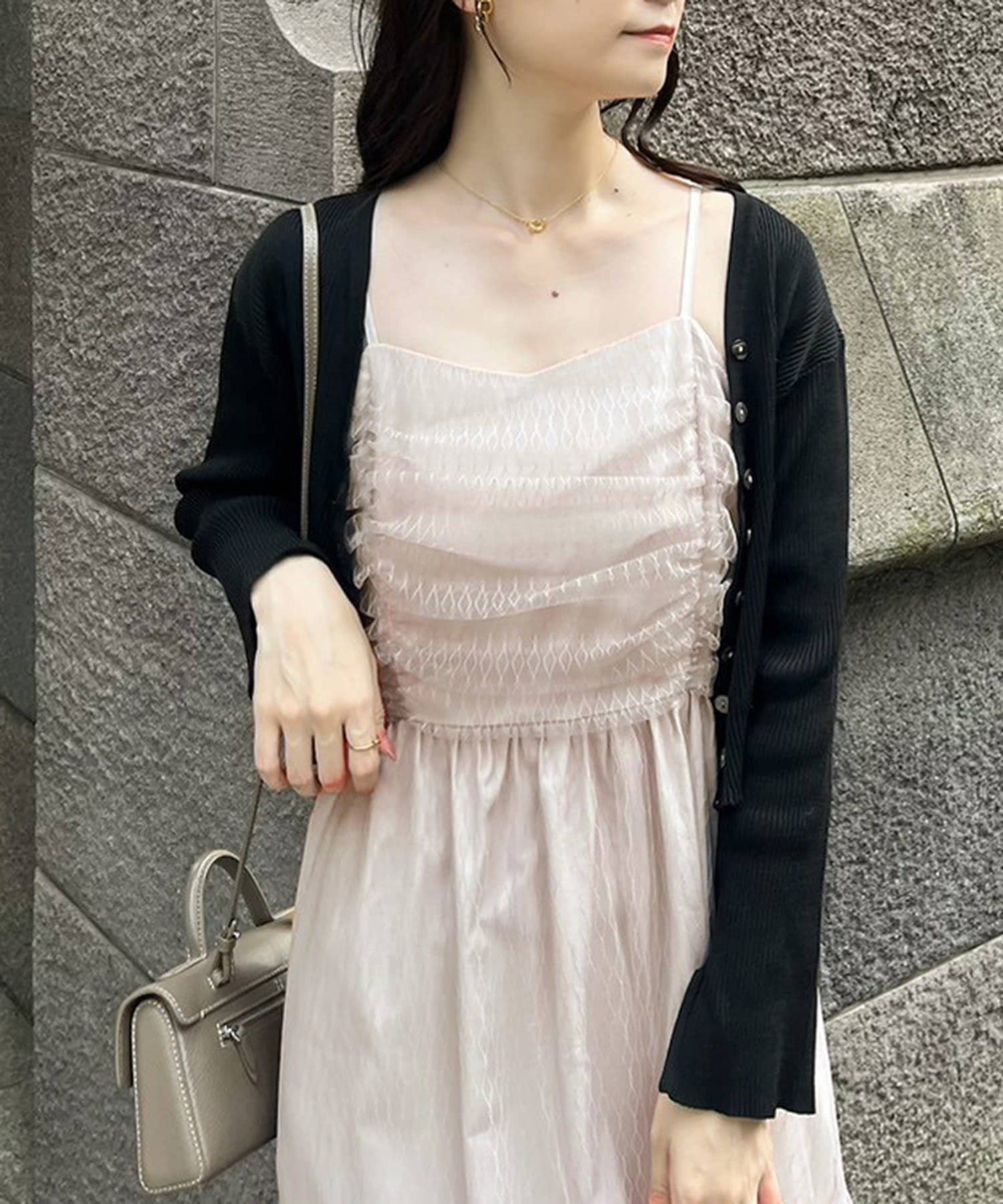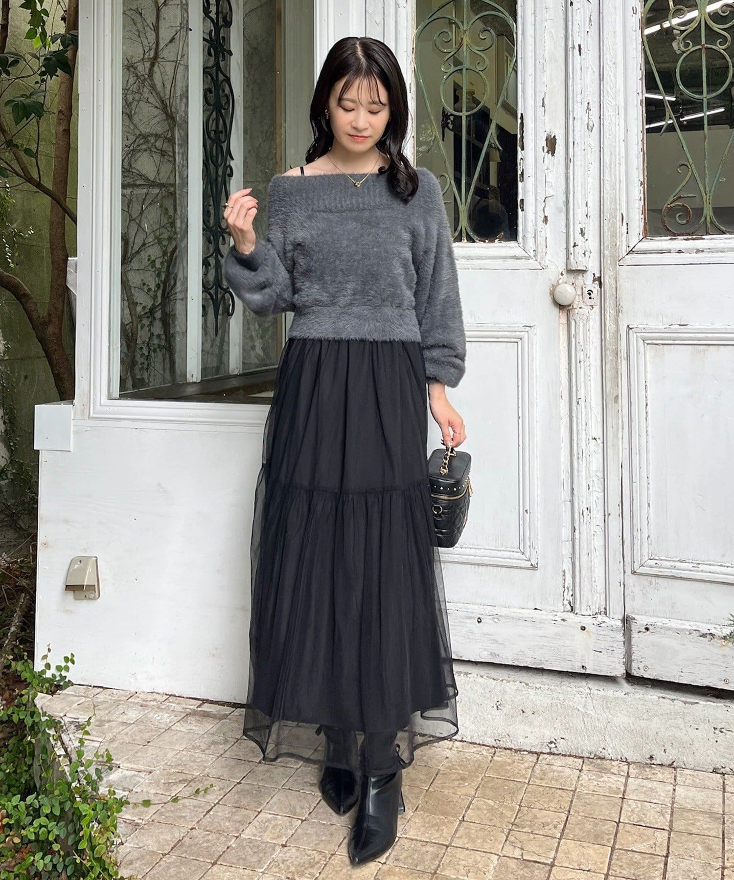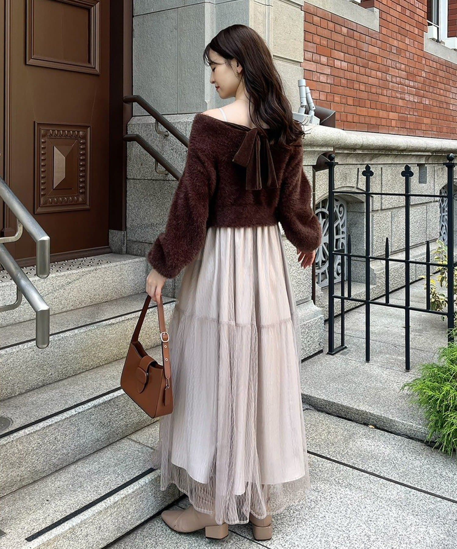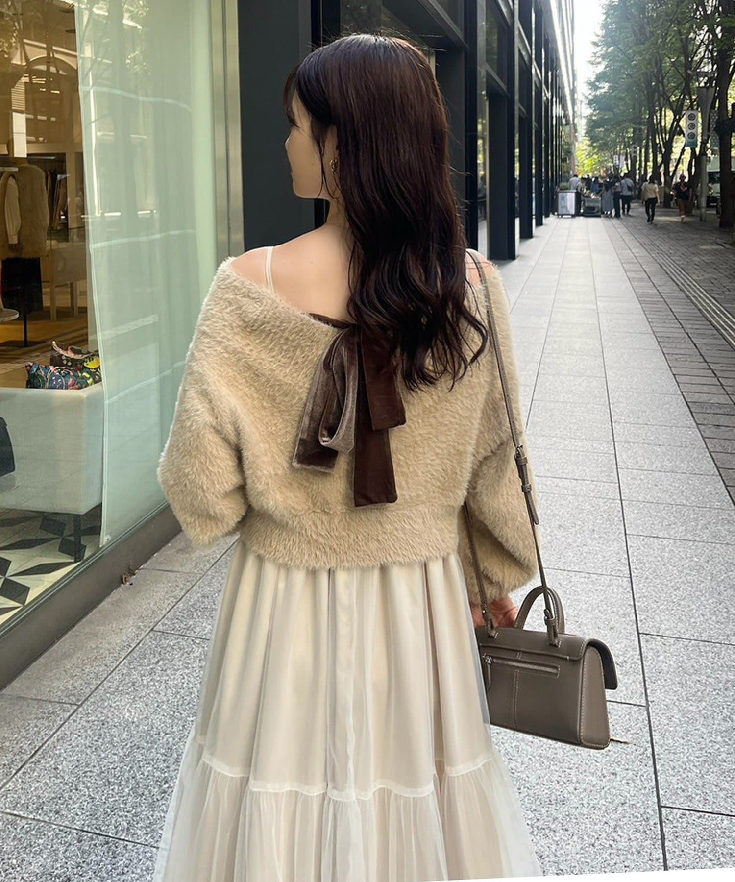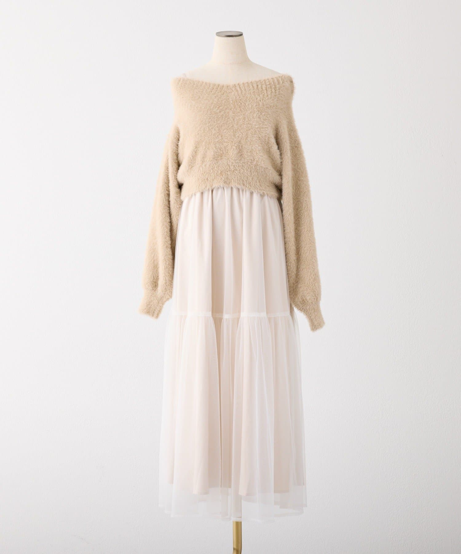 チュール重ねのキャミワンピースと、フェザー素材のショートニットがセットになった主役級アイテム。