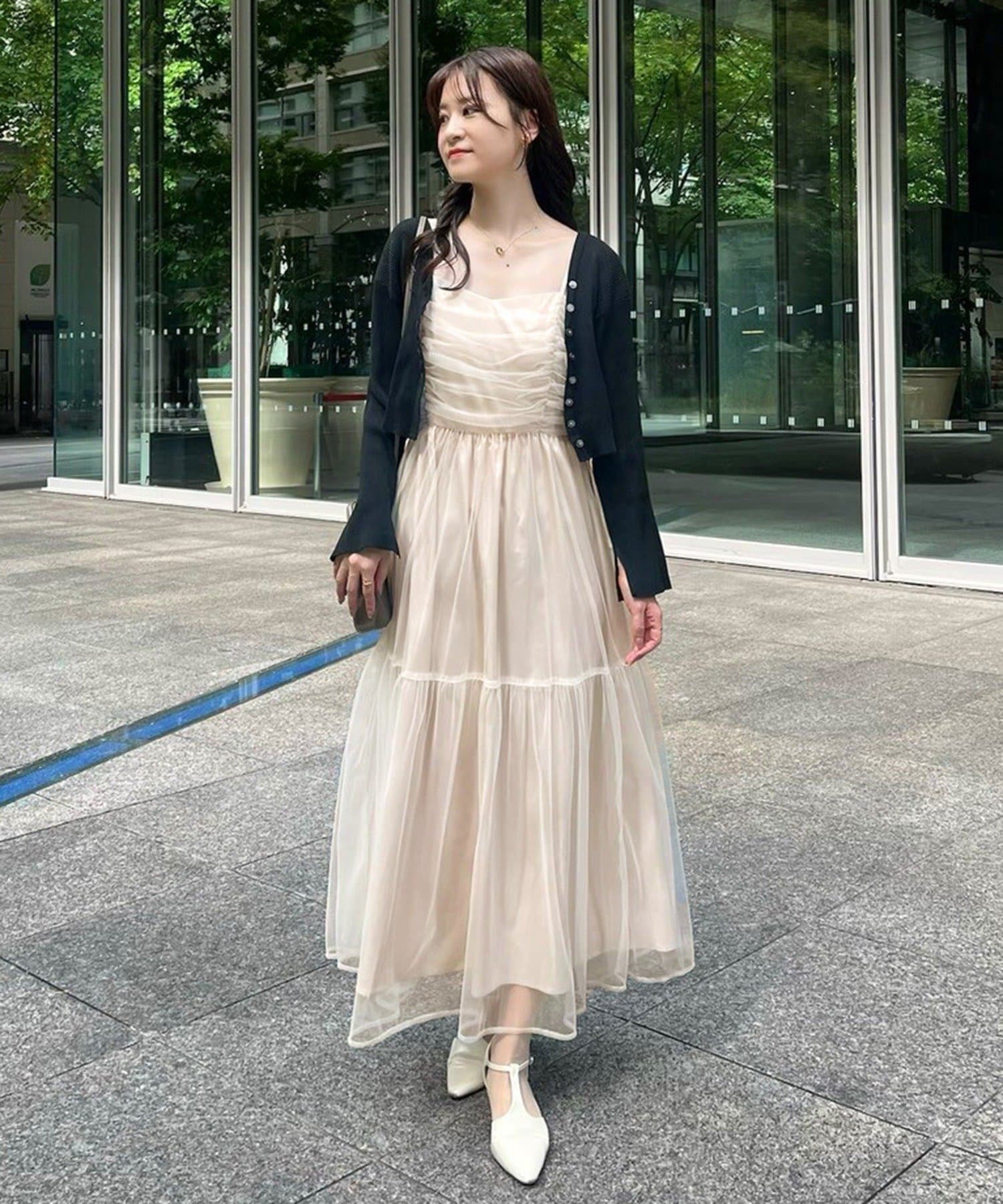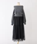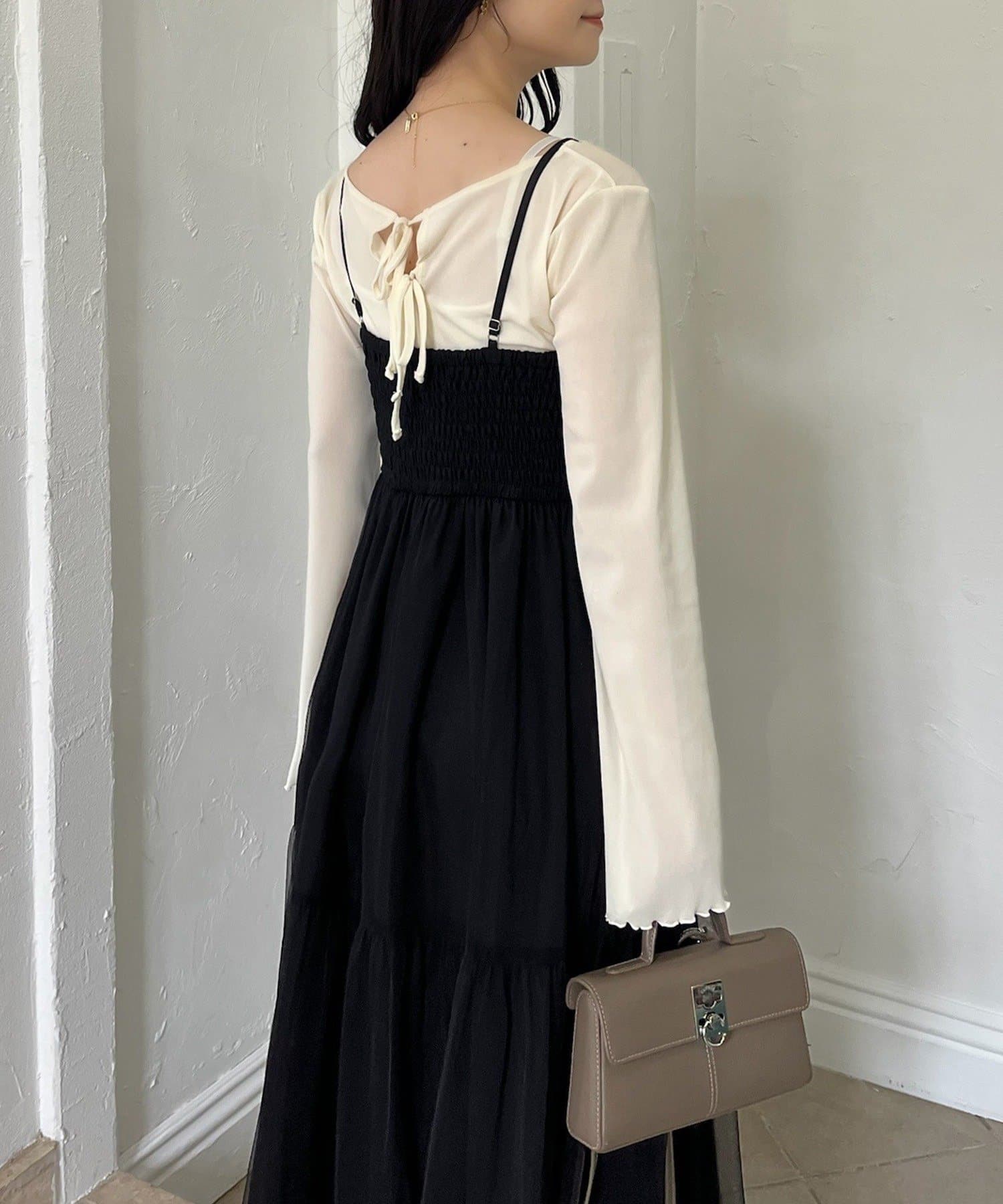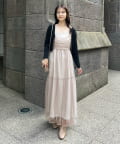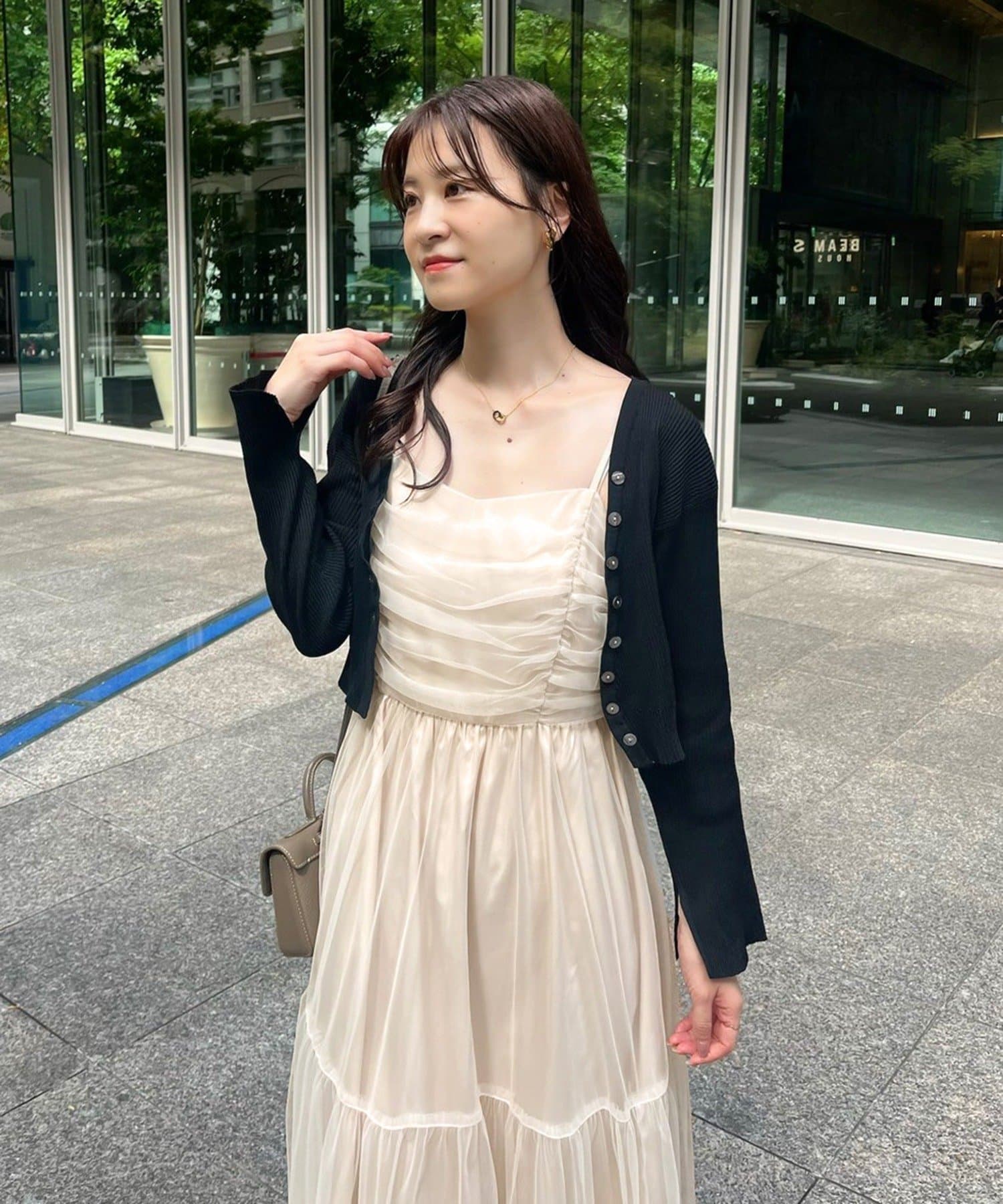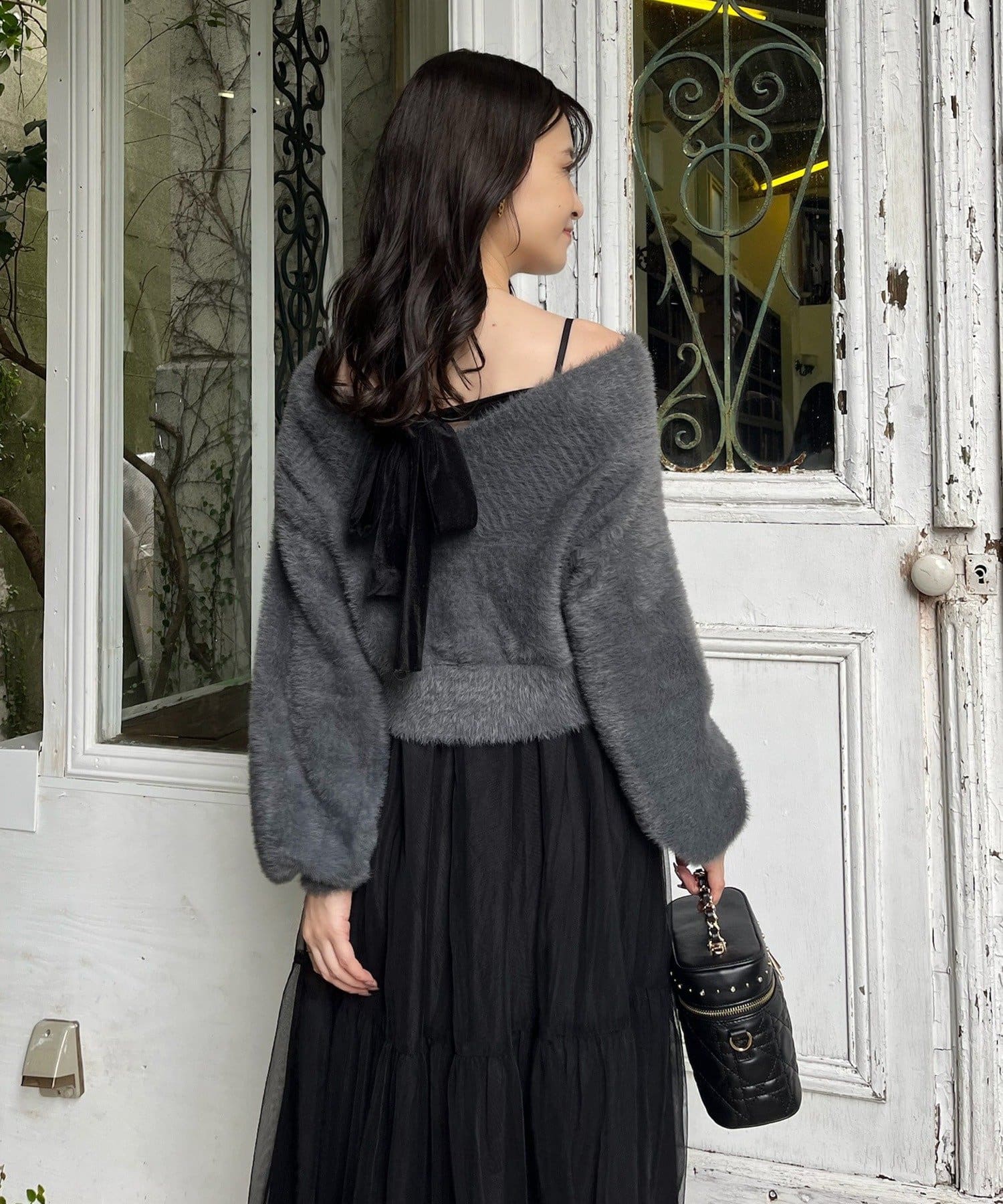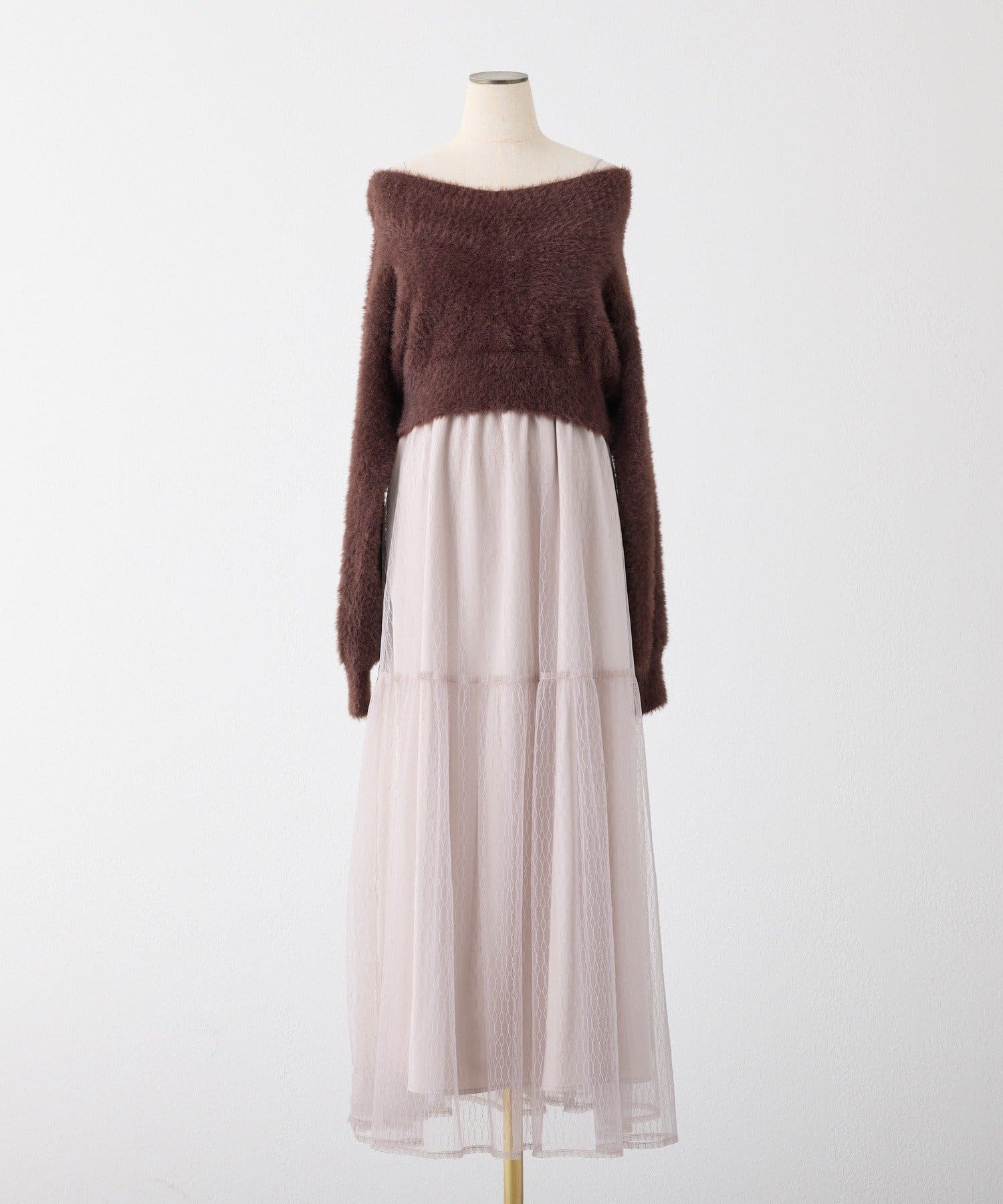 チュール重ねのキャミワンピースと、フェザー素材のショートニットがセットになった主役級アイテム。