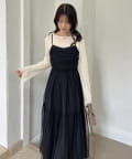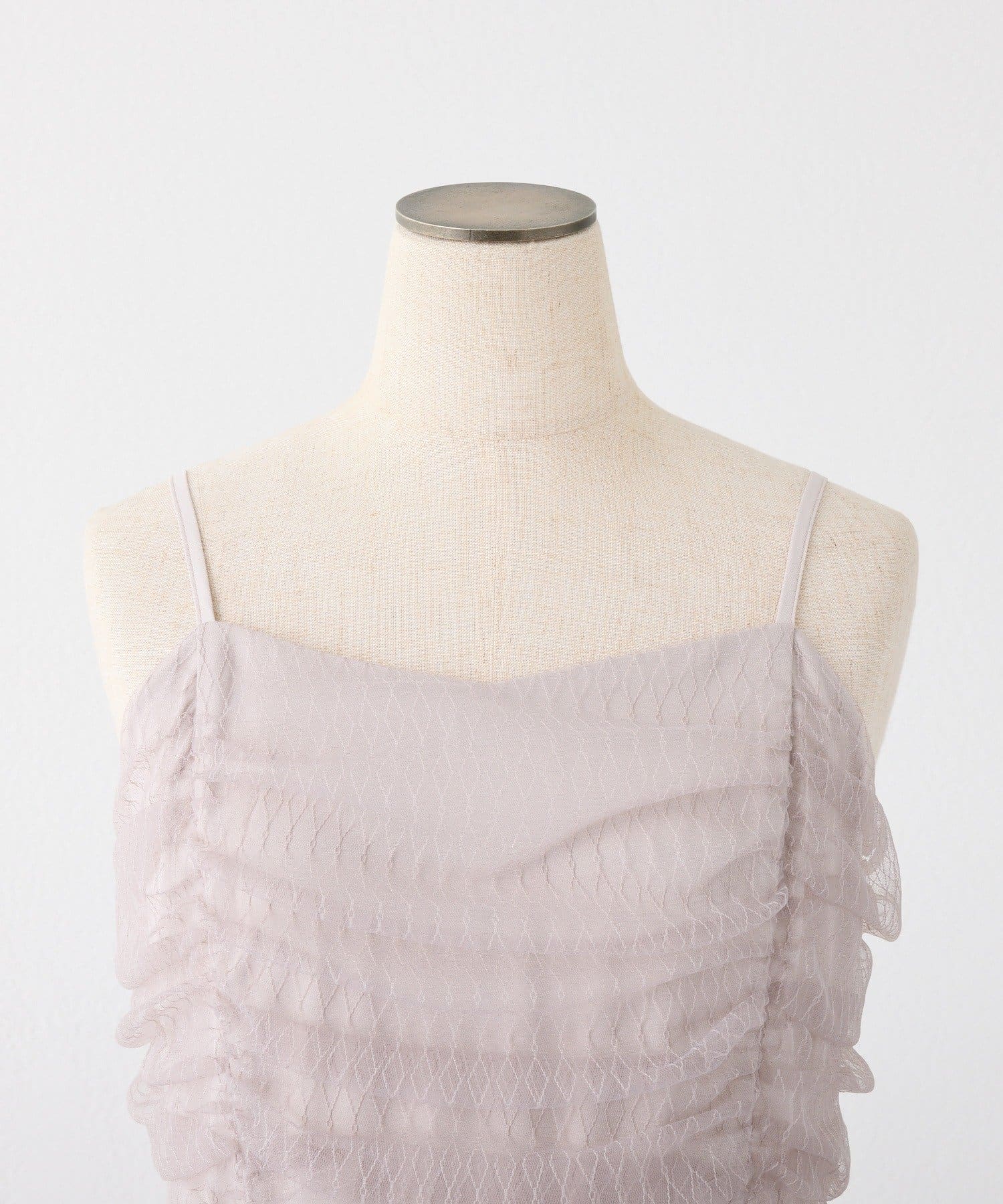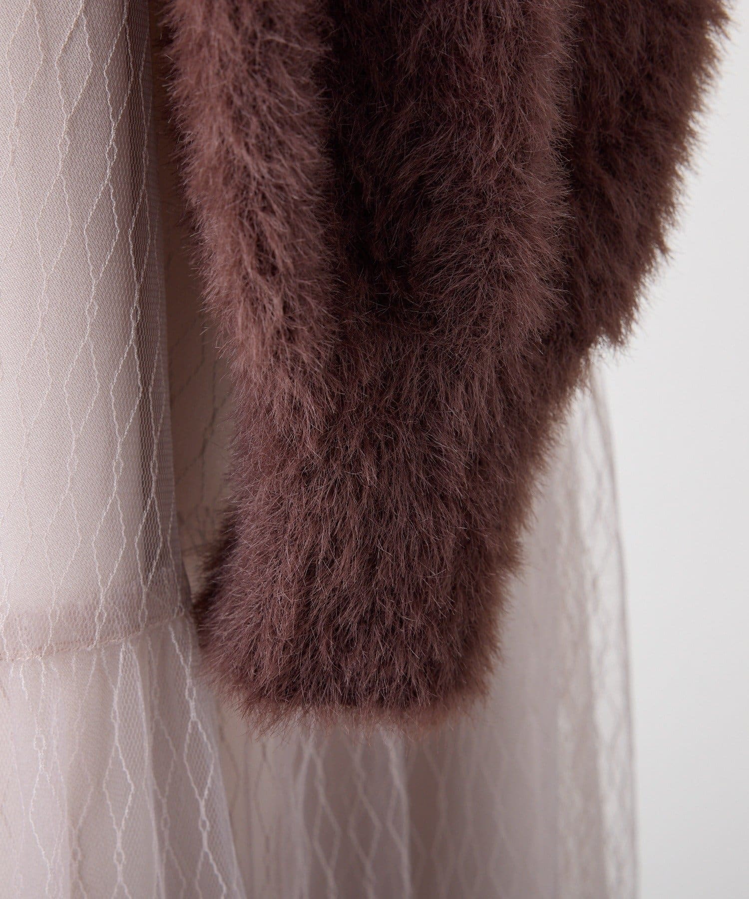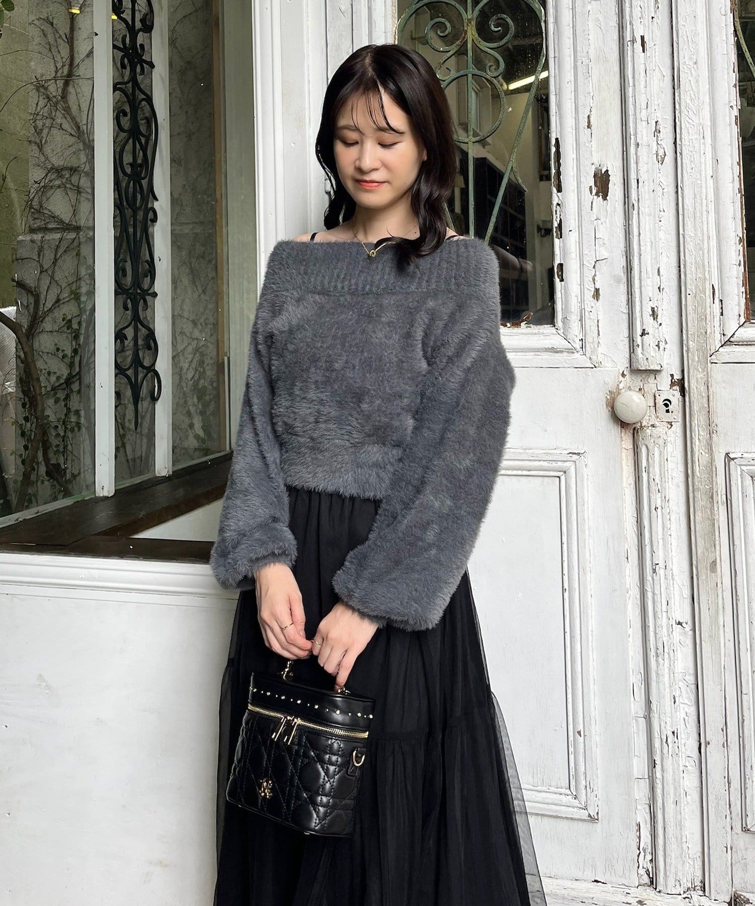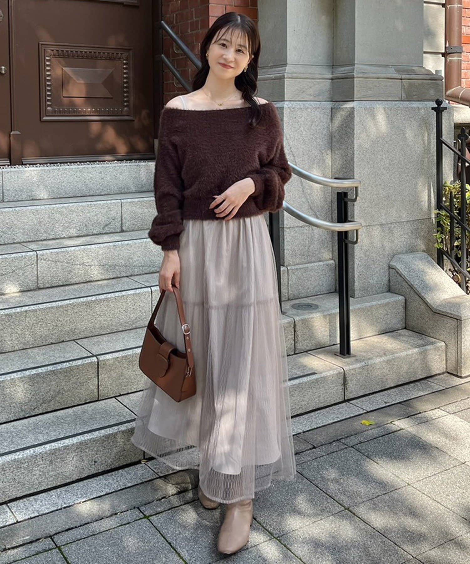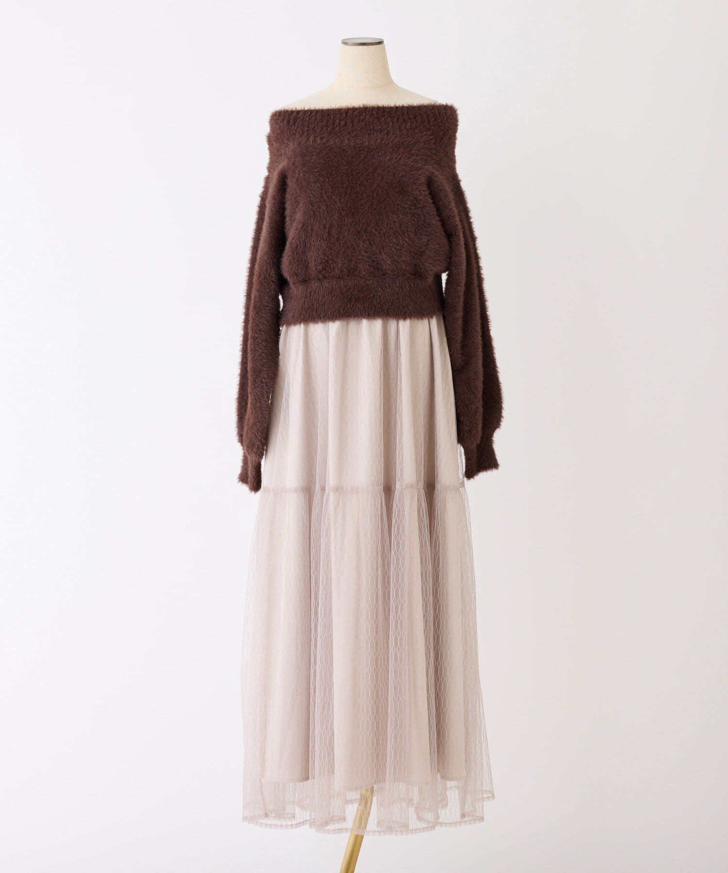 チュール重ねのキャミワンピースと、フェザー素材のショートニットがセットになった主役級アイテム。