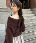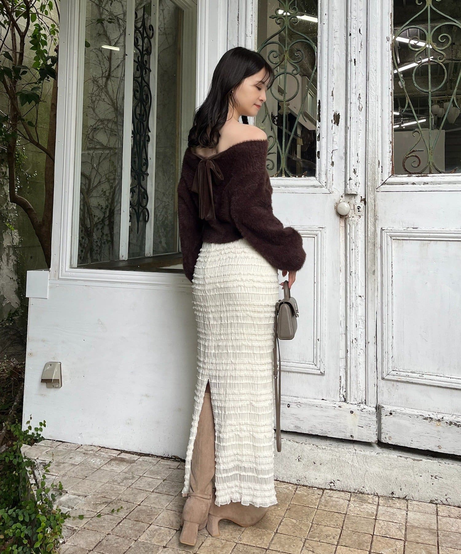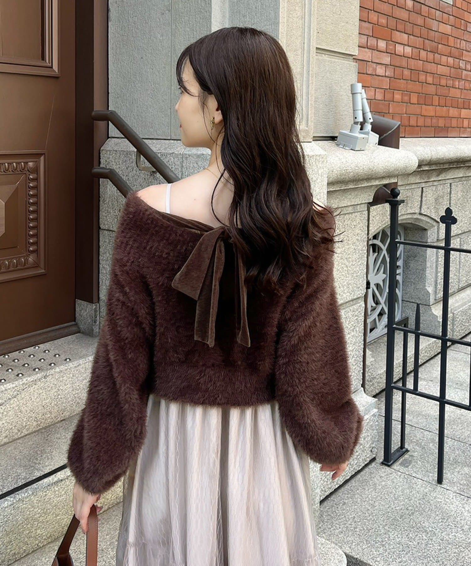 ニットをオフショルで着て、アップヘアにするとフェザーとリボンが映える推し活コーデに◎