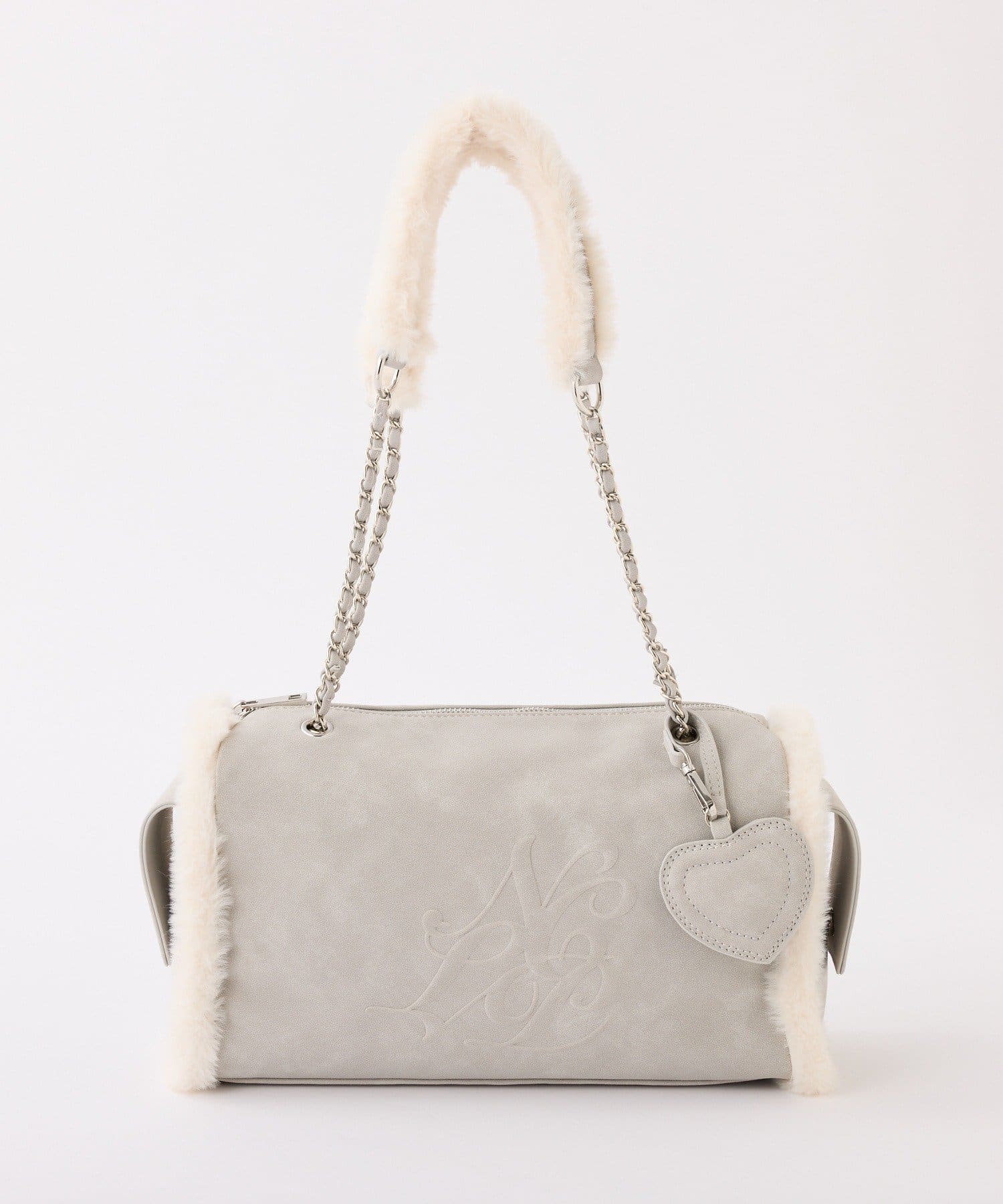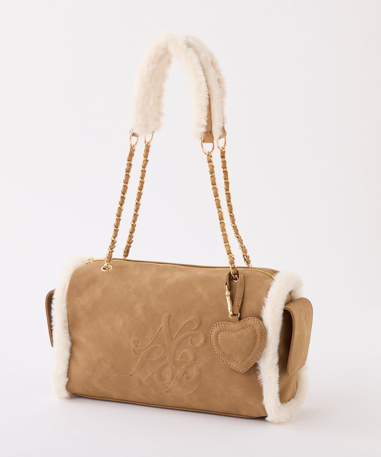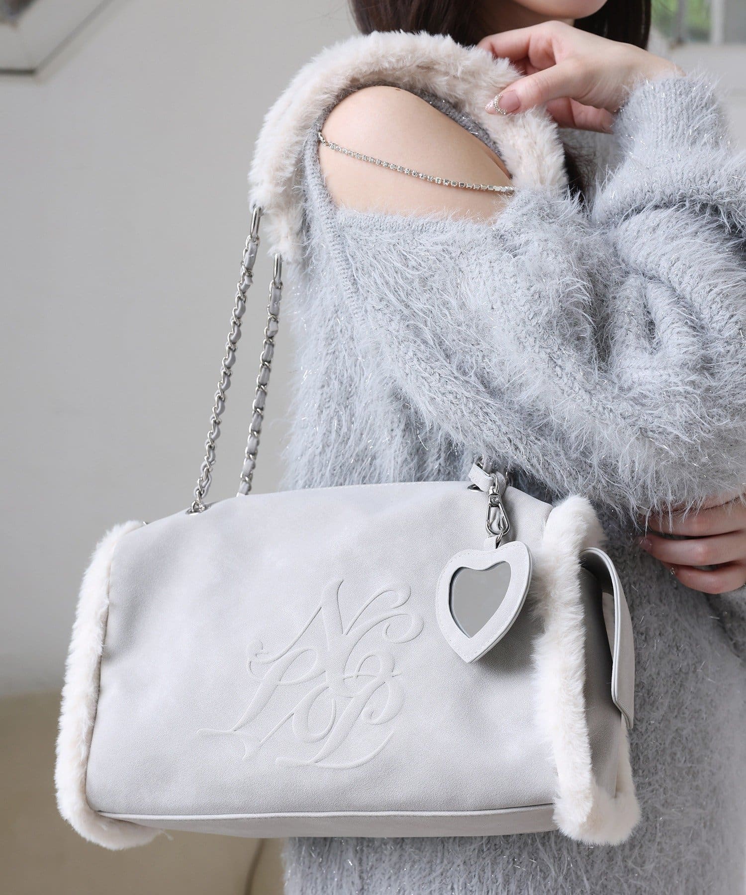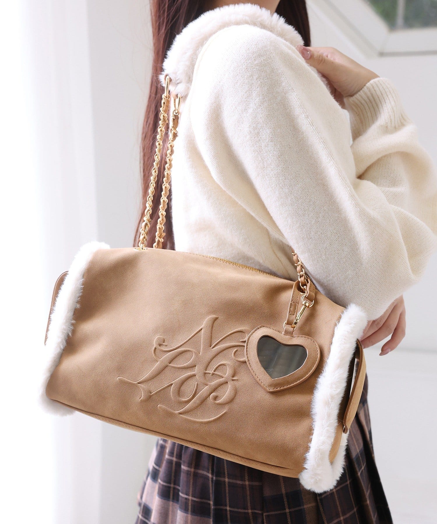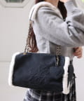 ふんわりとしたムートン素材に、エンボス加工でアクセントを効かせたバッグ。