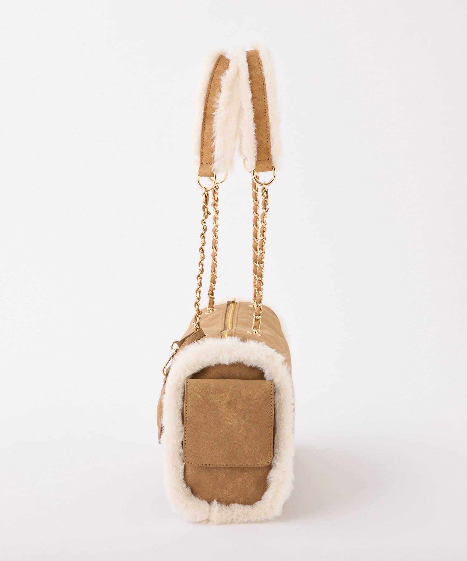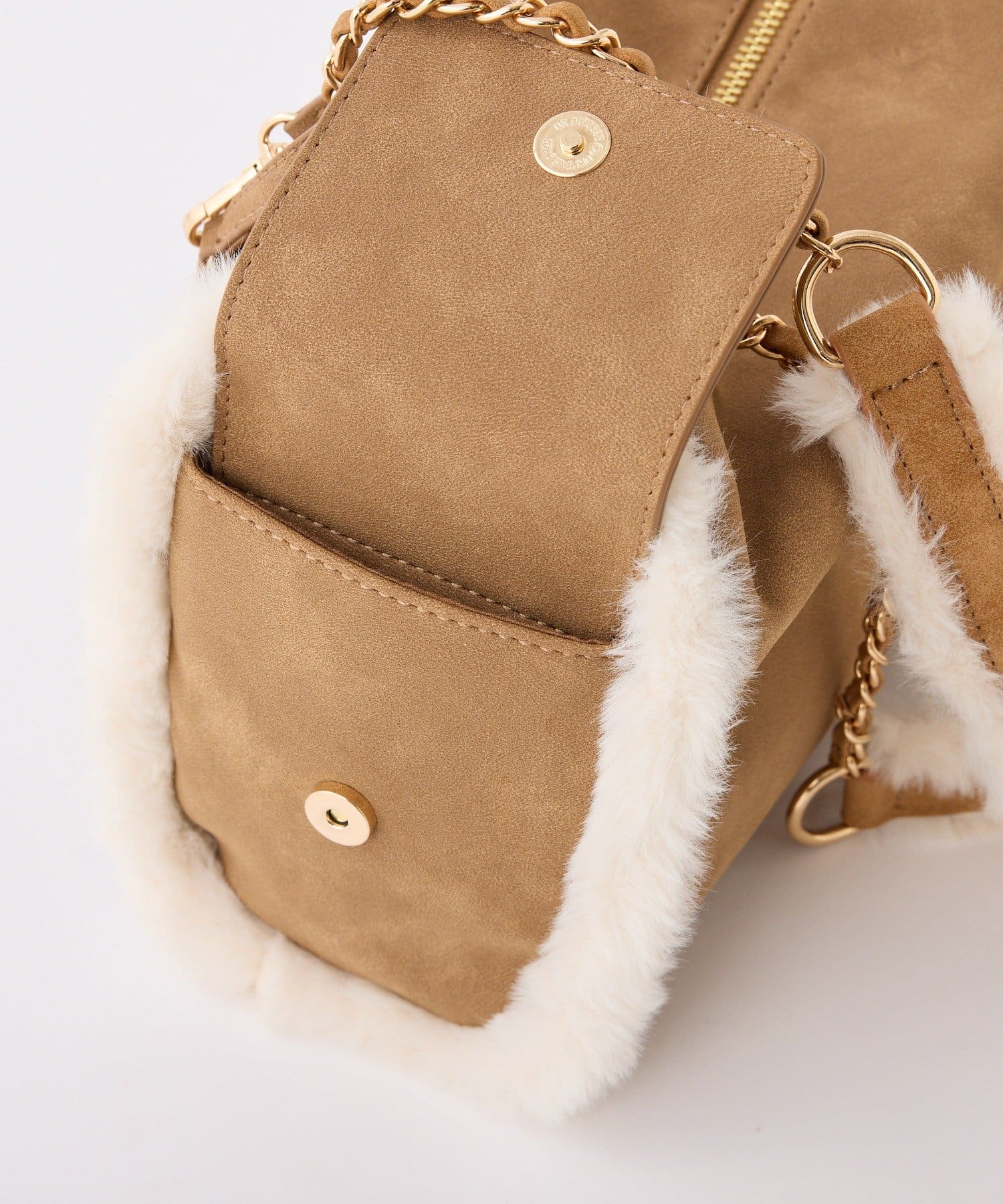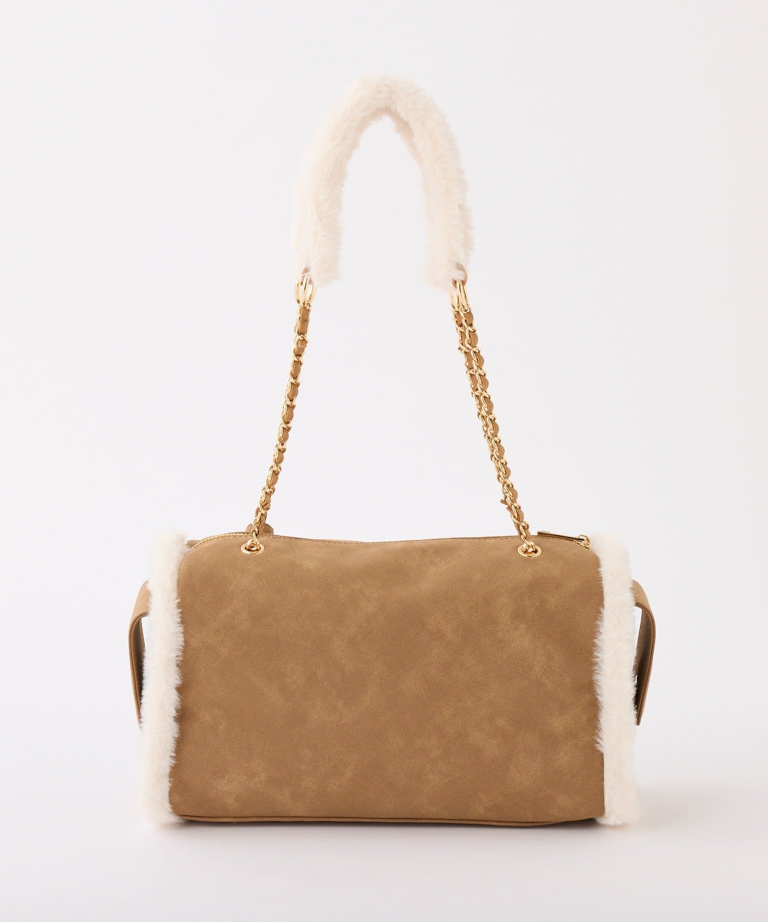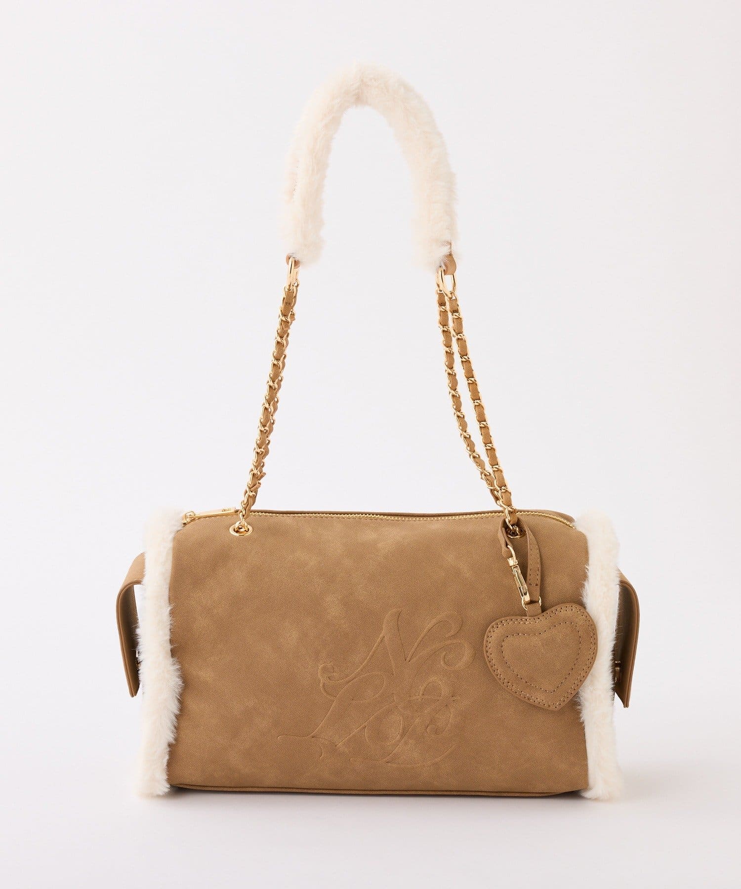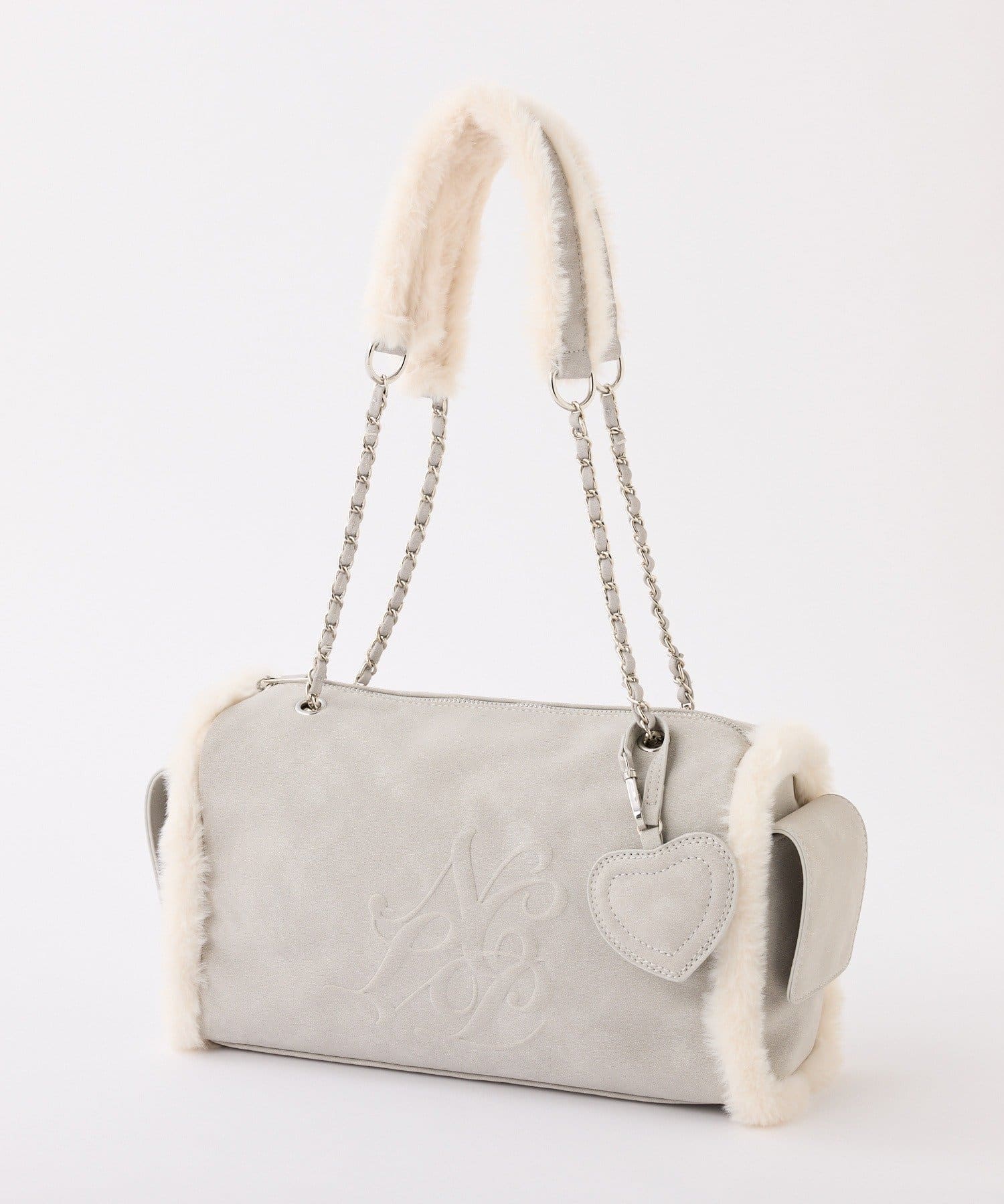 ふんわりとしたムートン素材に、エンボス加工でアクセントを効かせたバッグ。