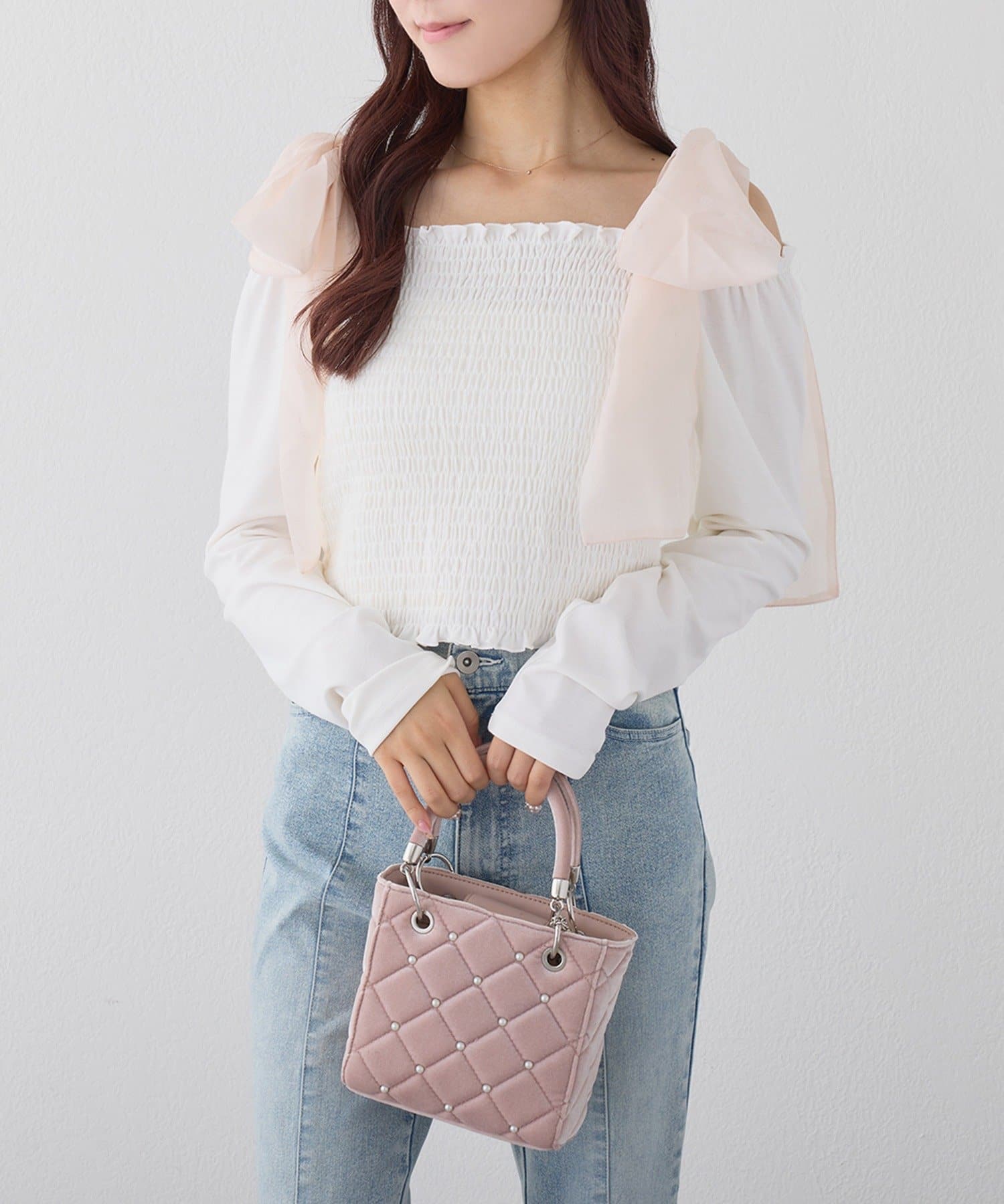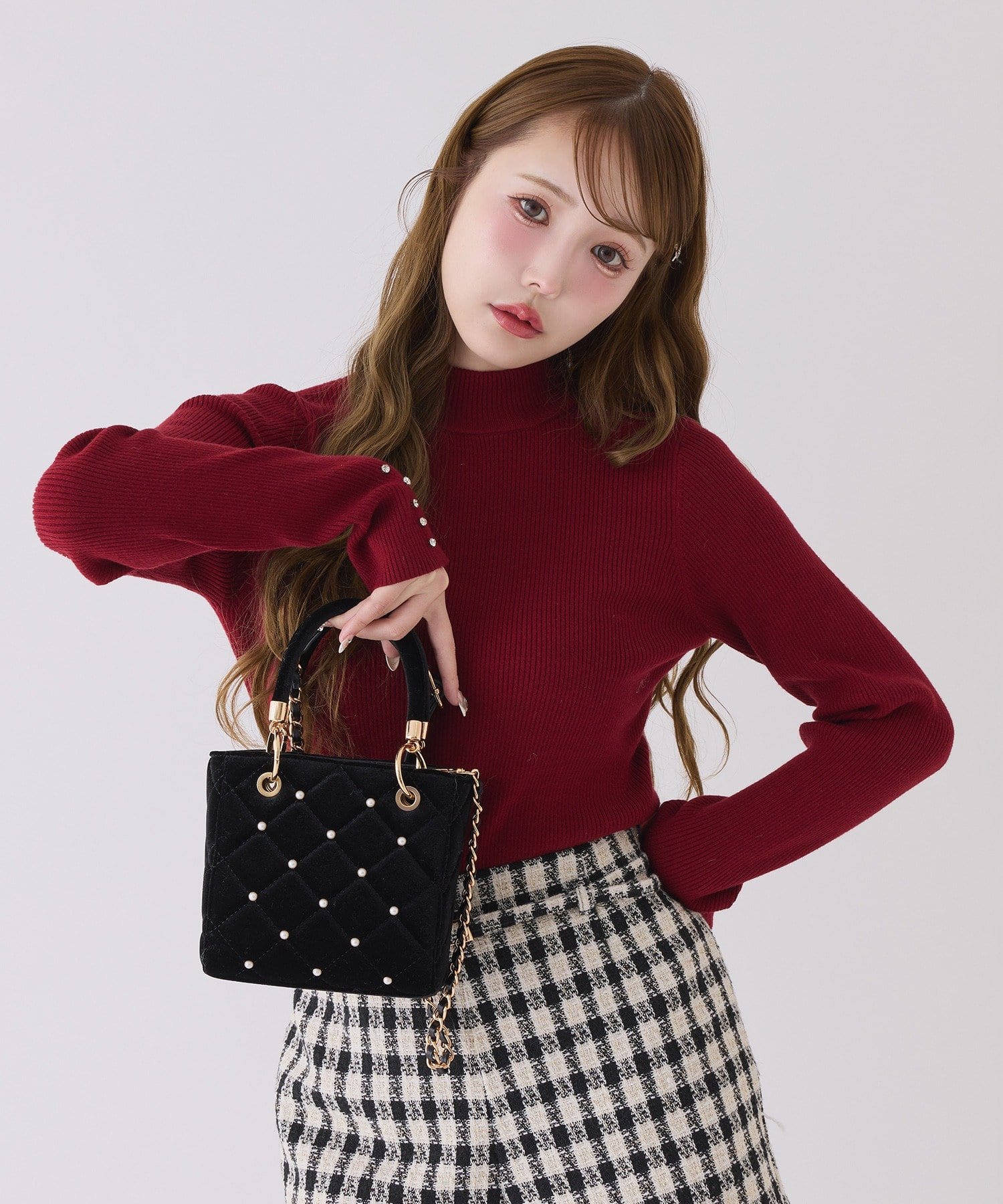 キルティングデザインにスタッズを施したスクエア型ミニバッグ。