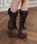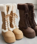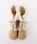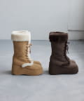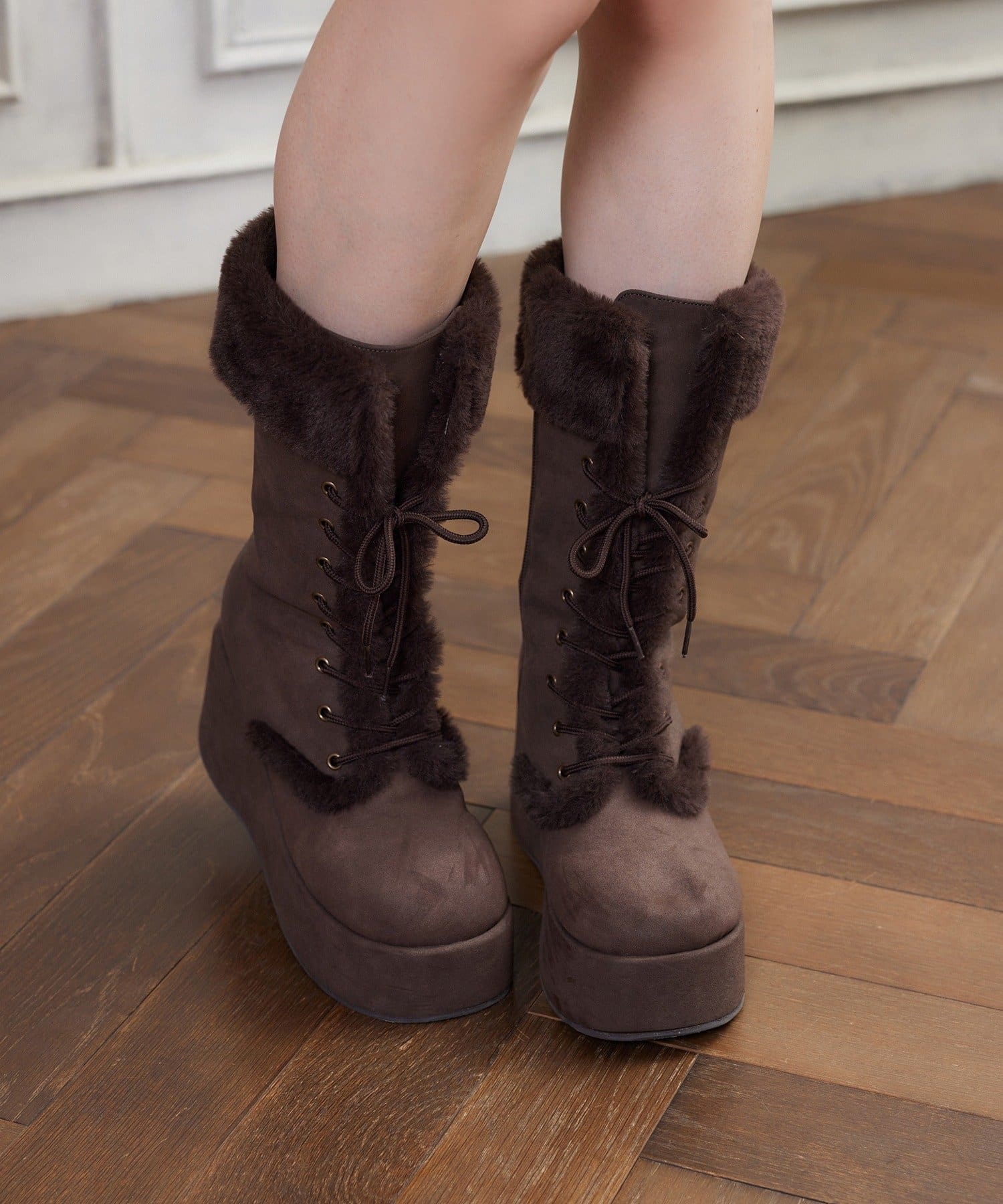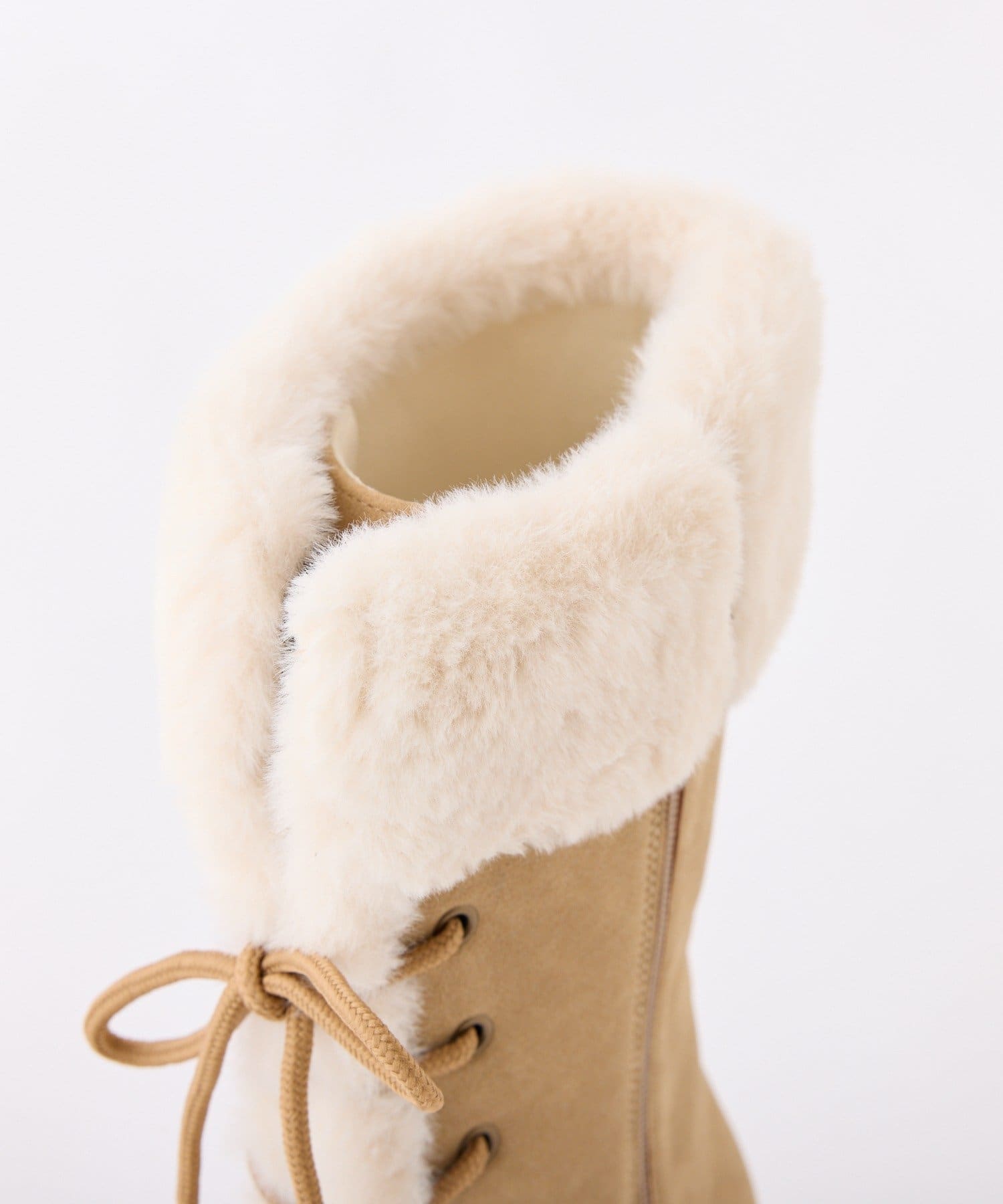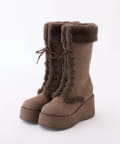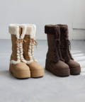 もこもこ感が可愛いムートン素材と、存在感のある厚底ソールがポイントのレースアップブーツ。