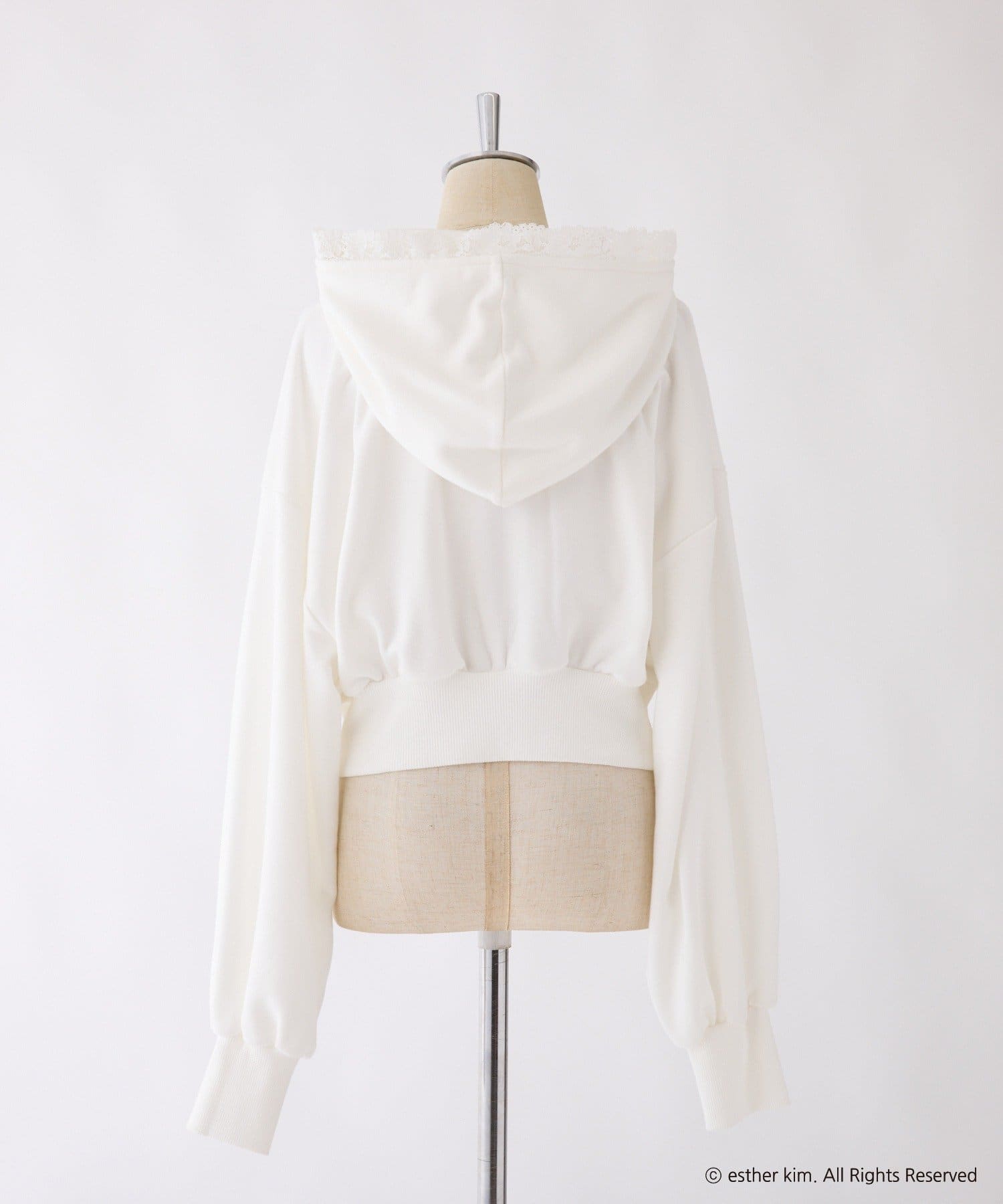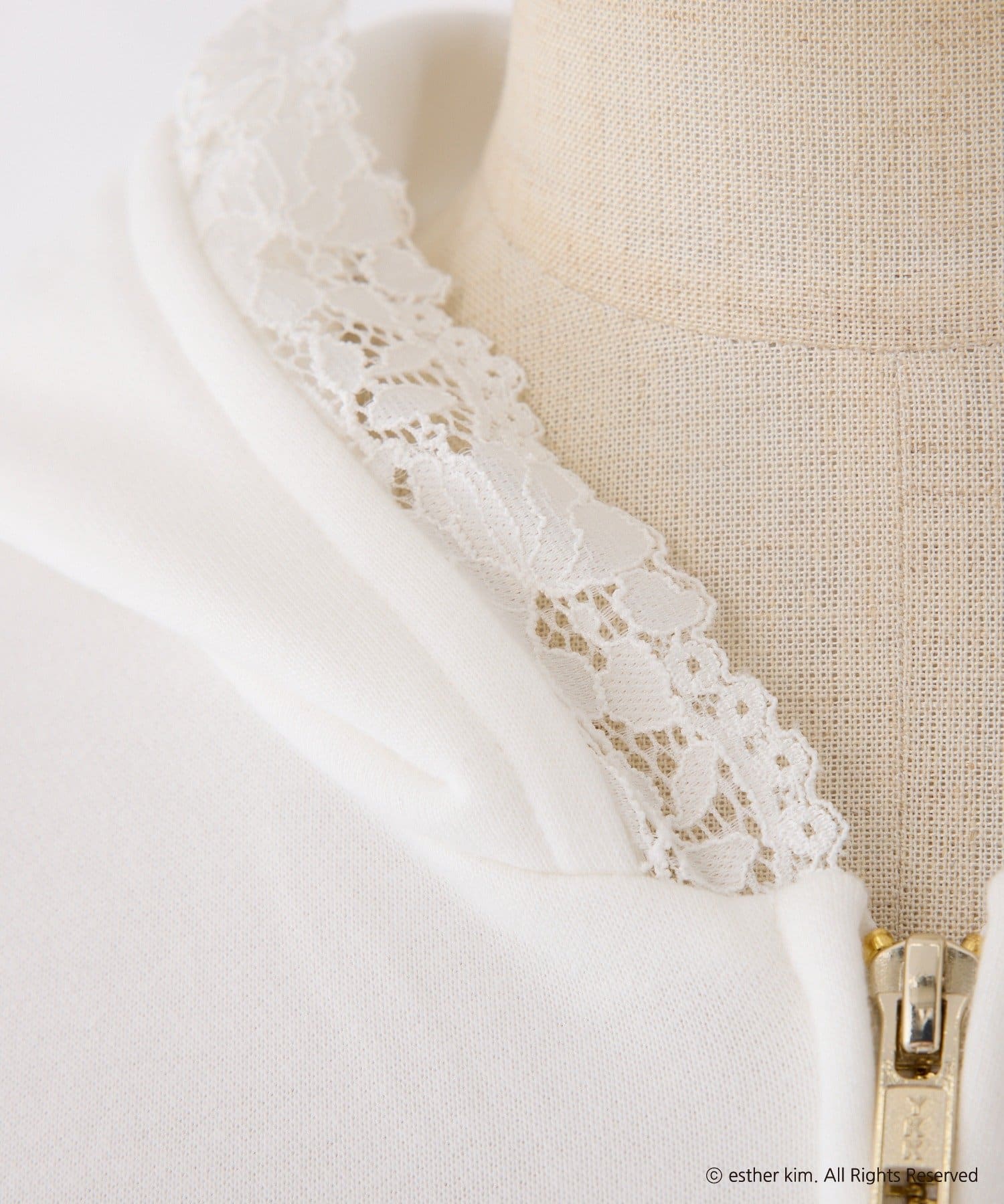 フード部分にあしらわれたレースが、カジュアルなアイテムに甘さをプラスしてくれます。