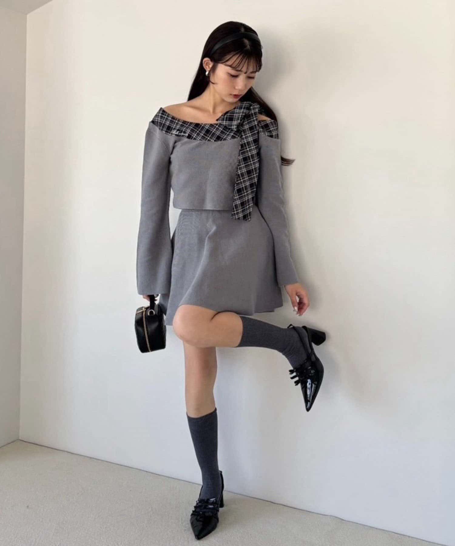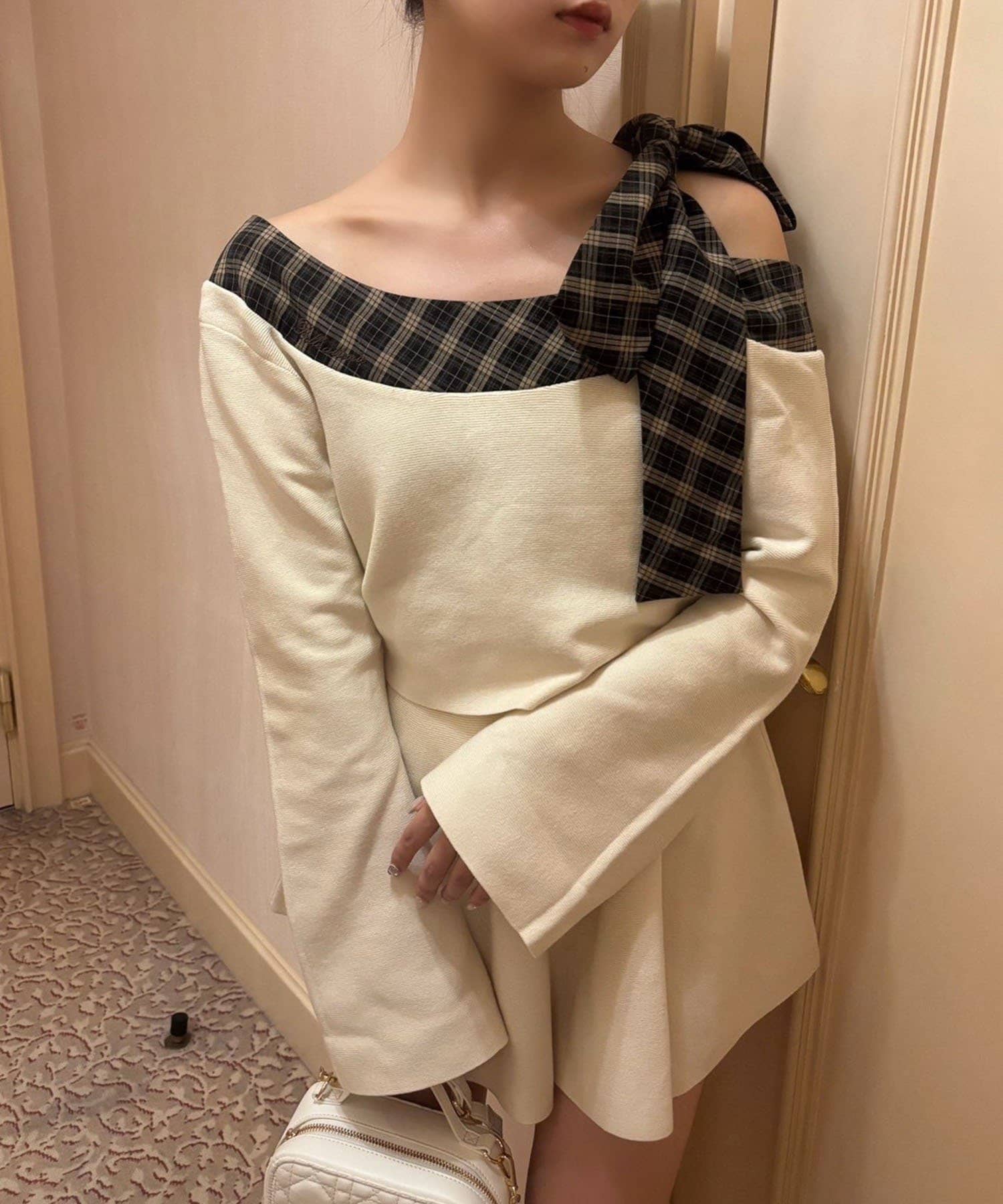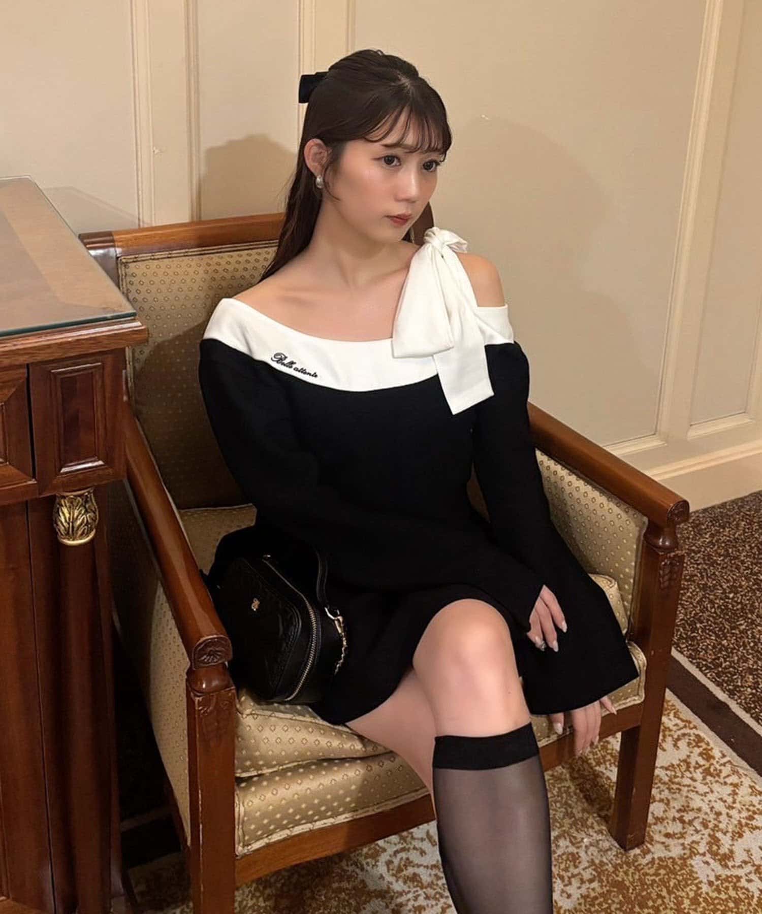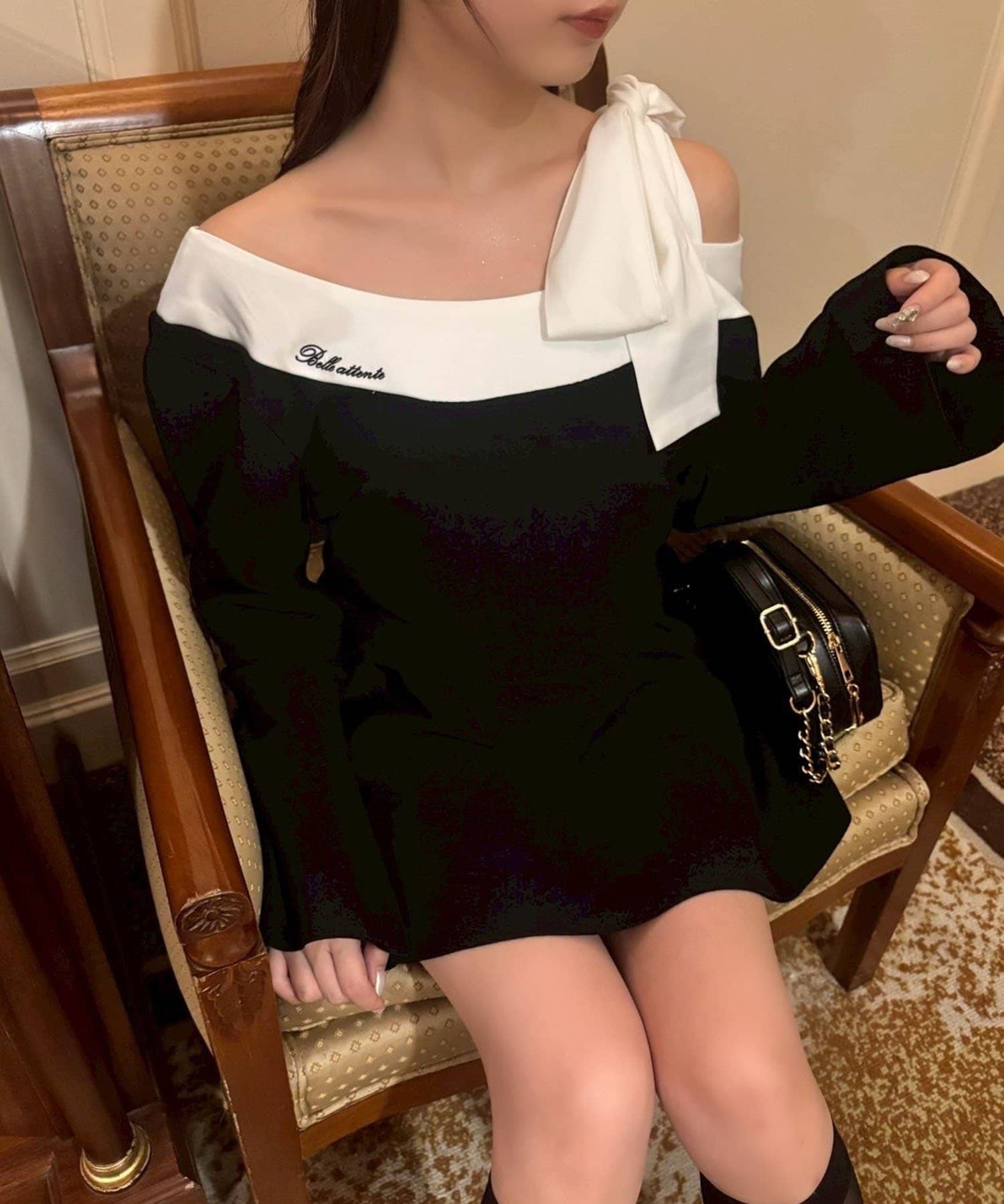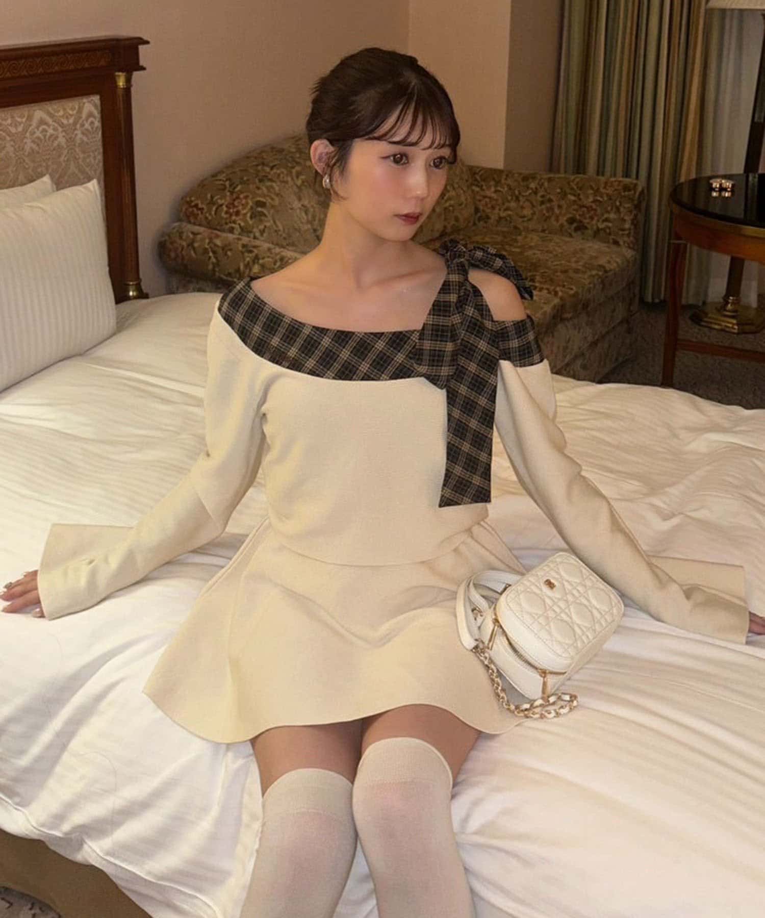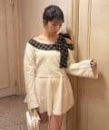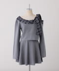 トップスはワンショルダー仕様で、デコルテを美しく見せてくれ、程よい抜け感も演出できます。