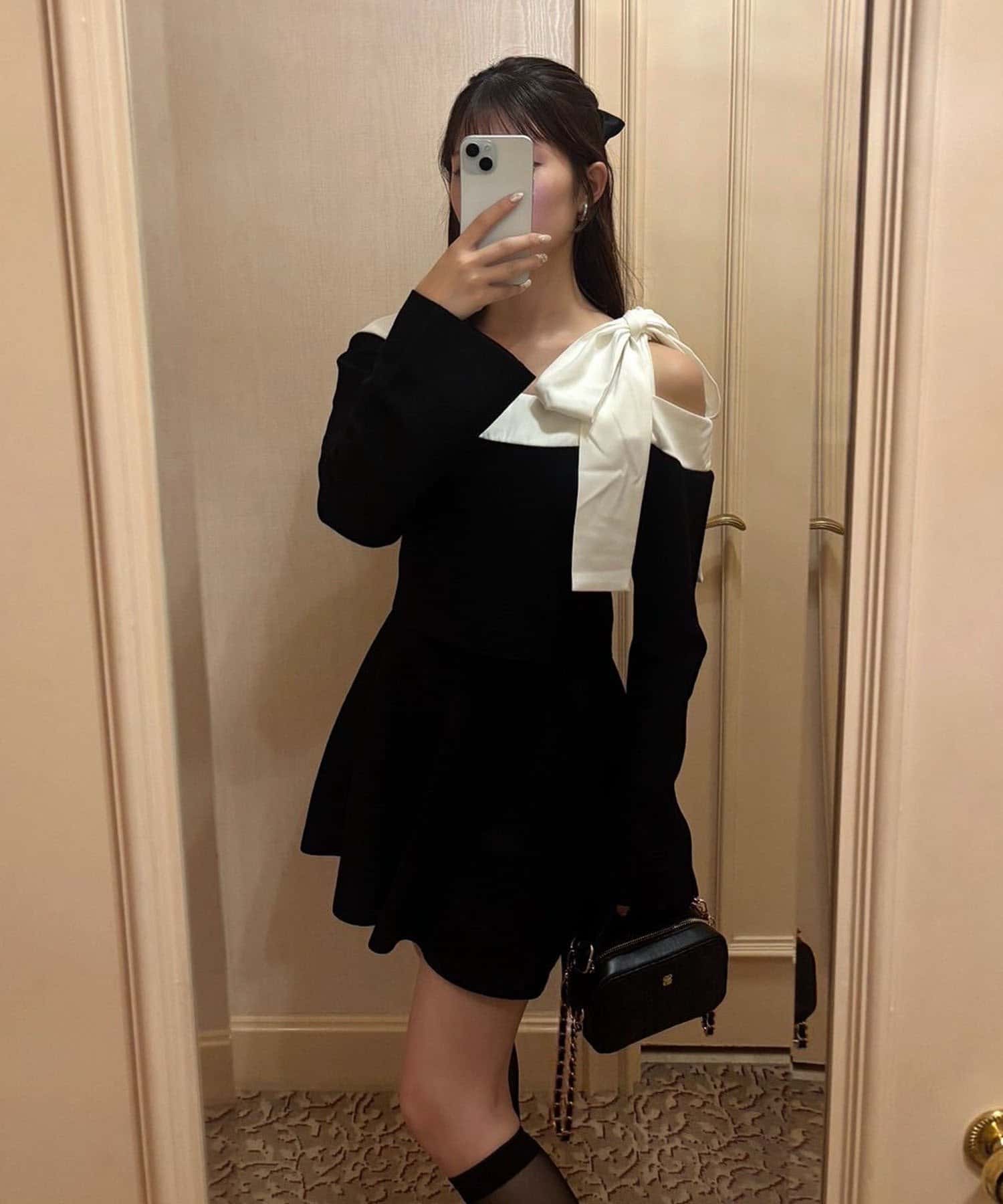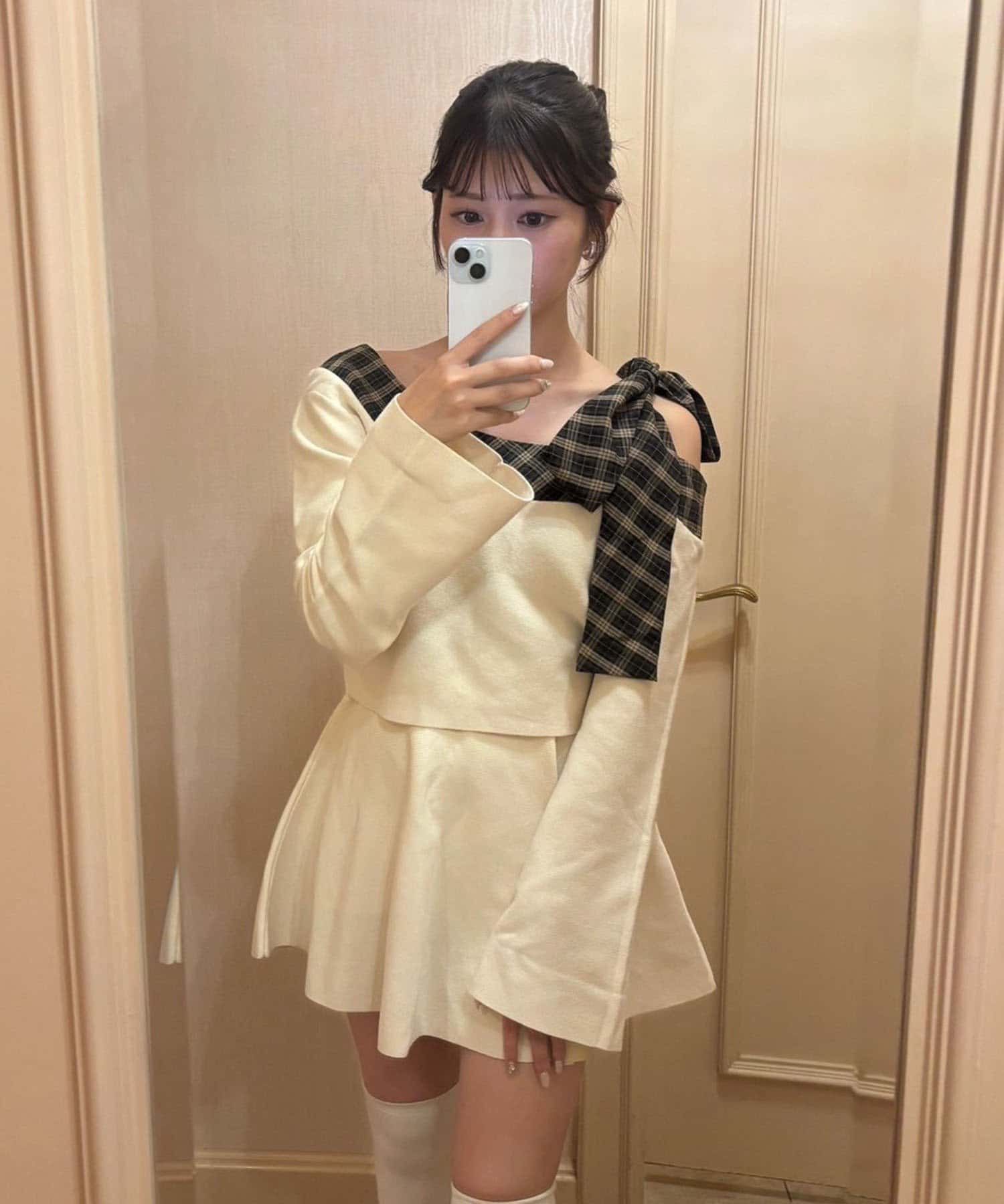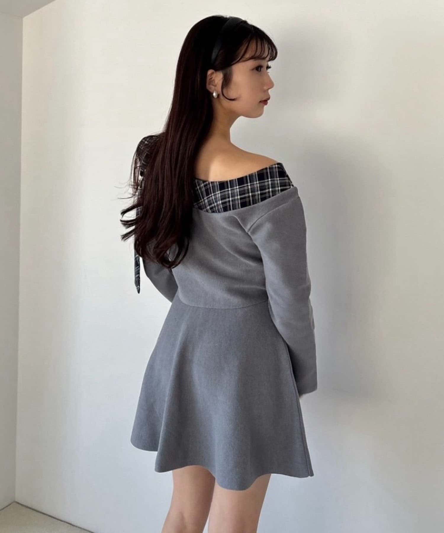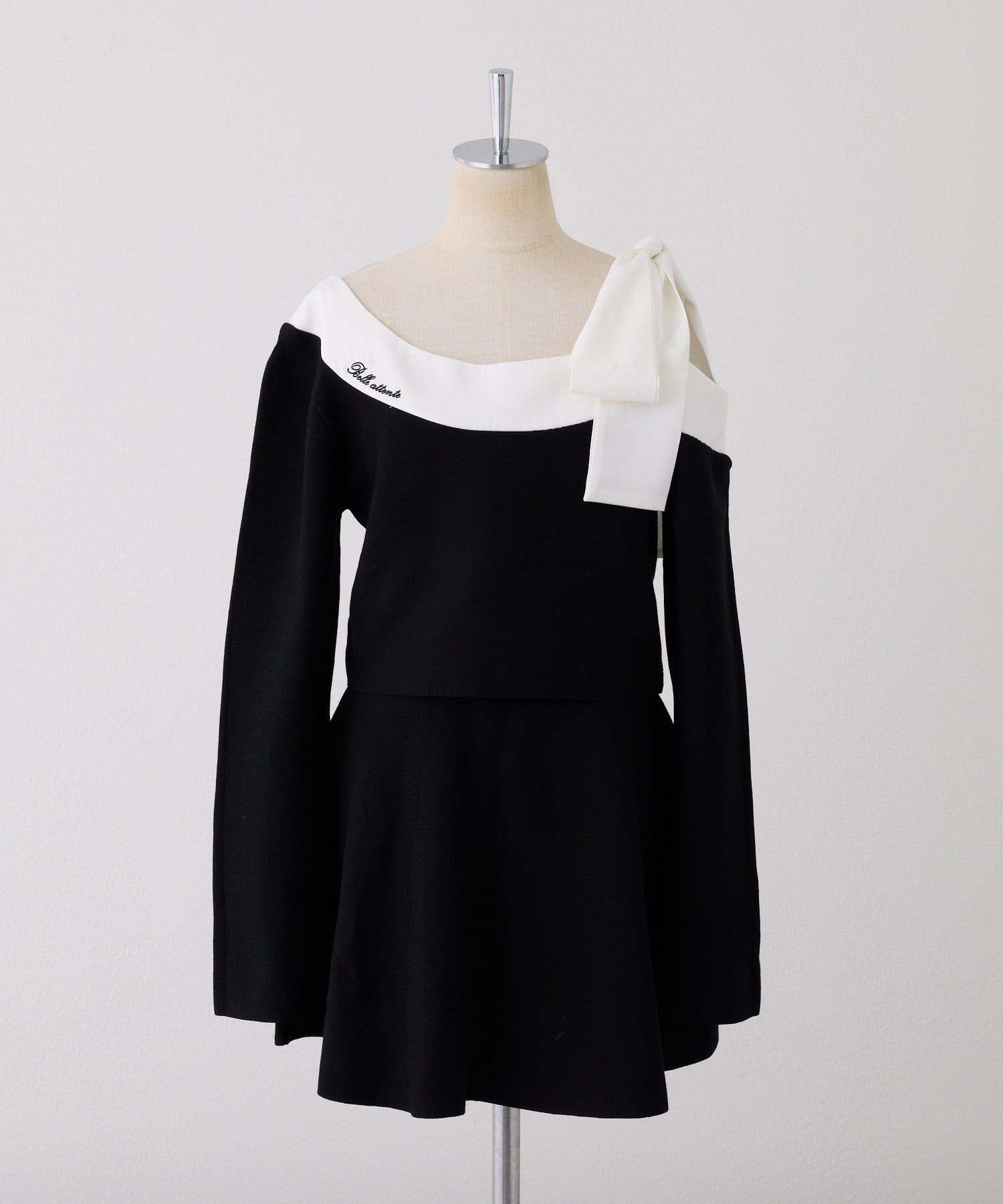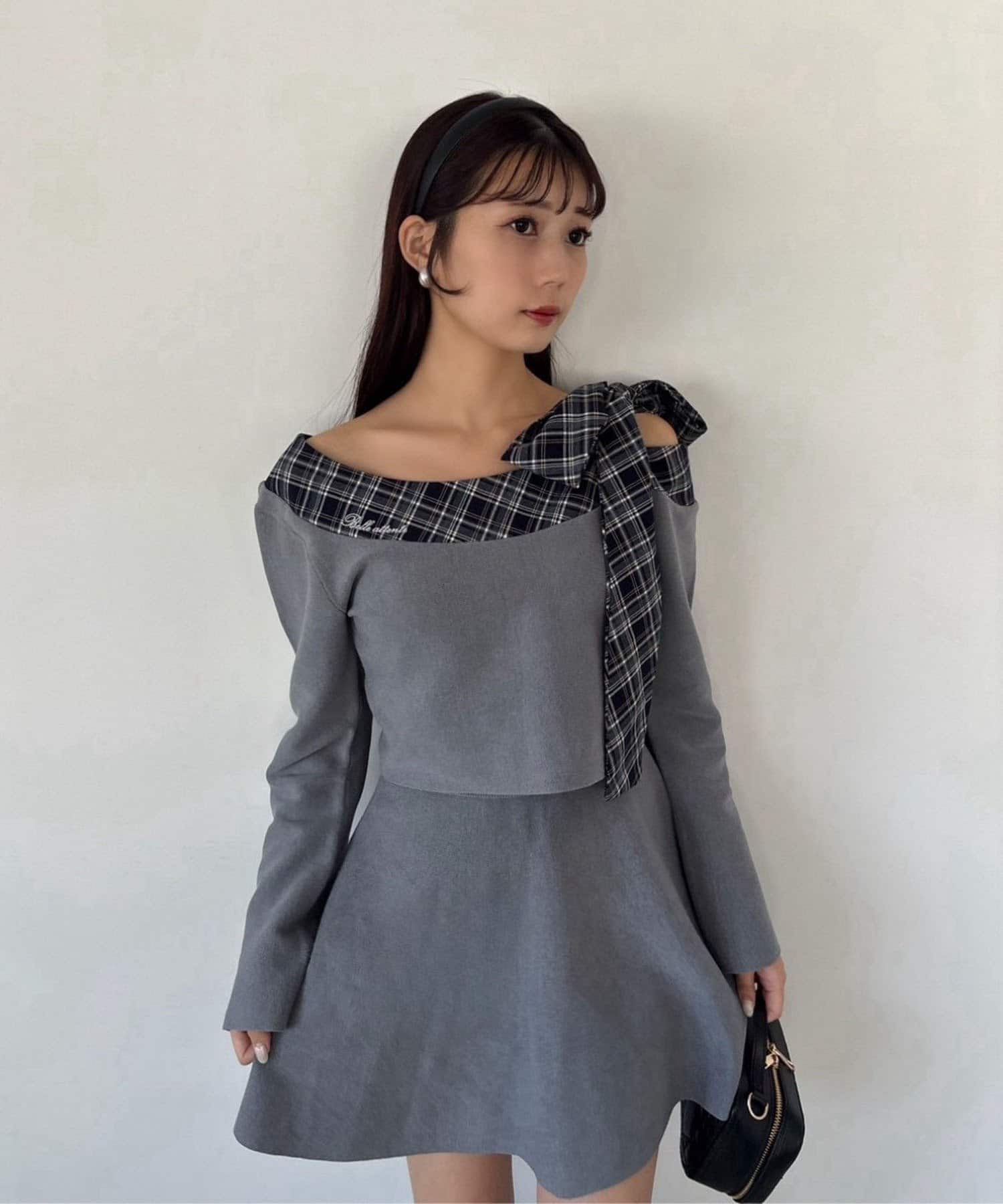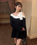トップスはワンショルダー仕様で、デコルテを美しく見せてくれ、程よい抜け感も演出できます。