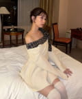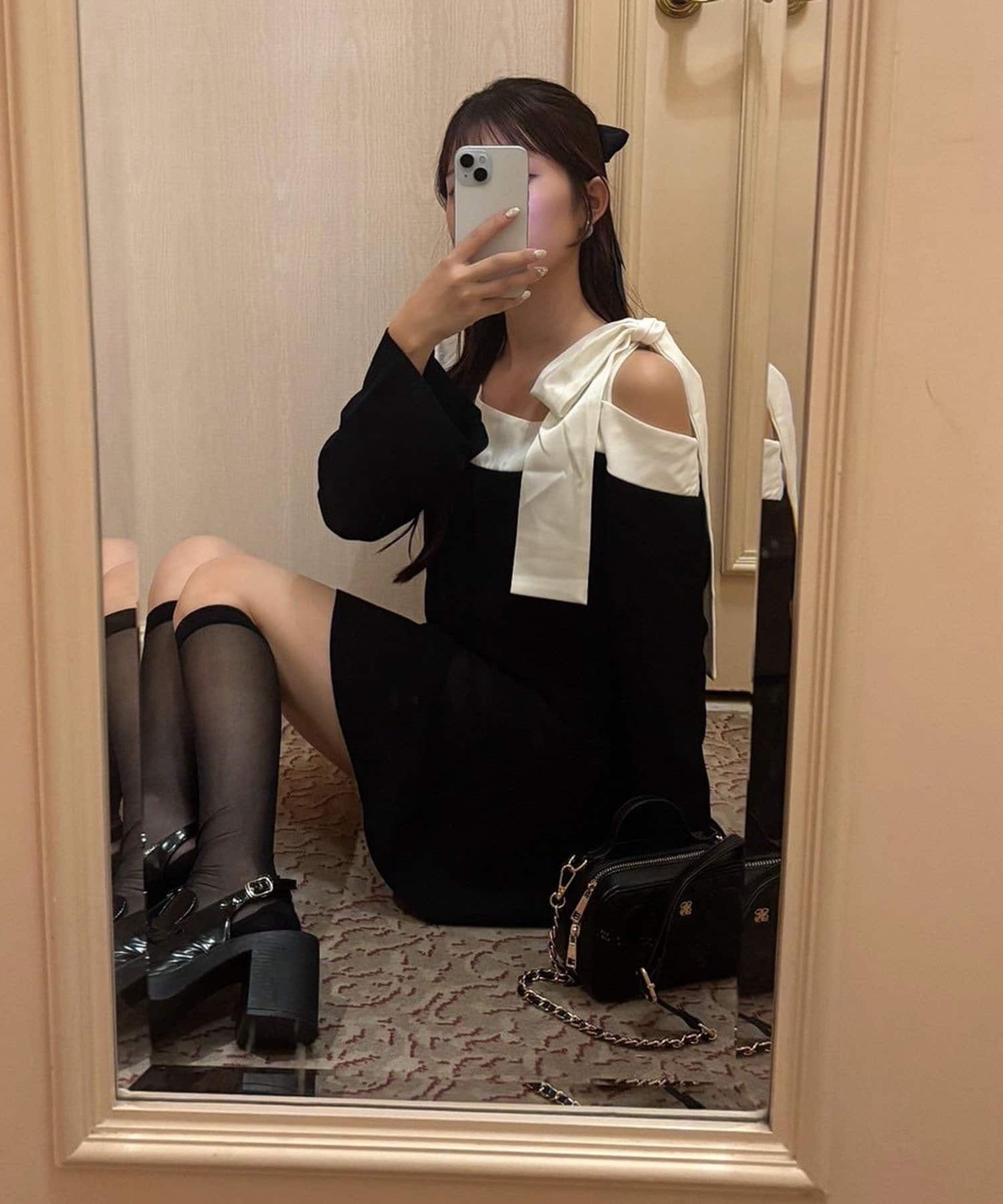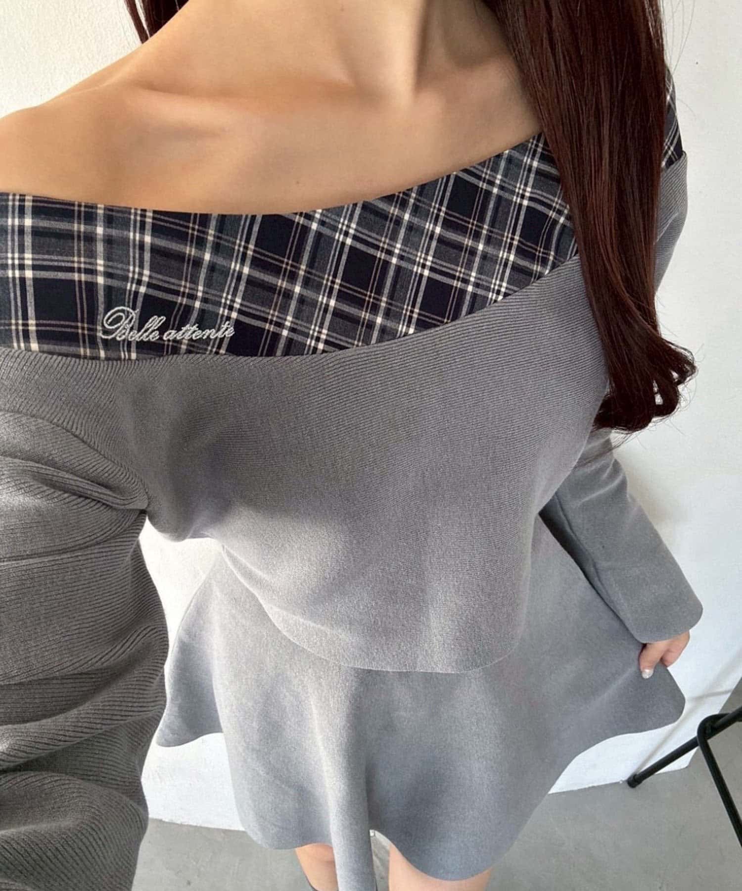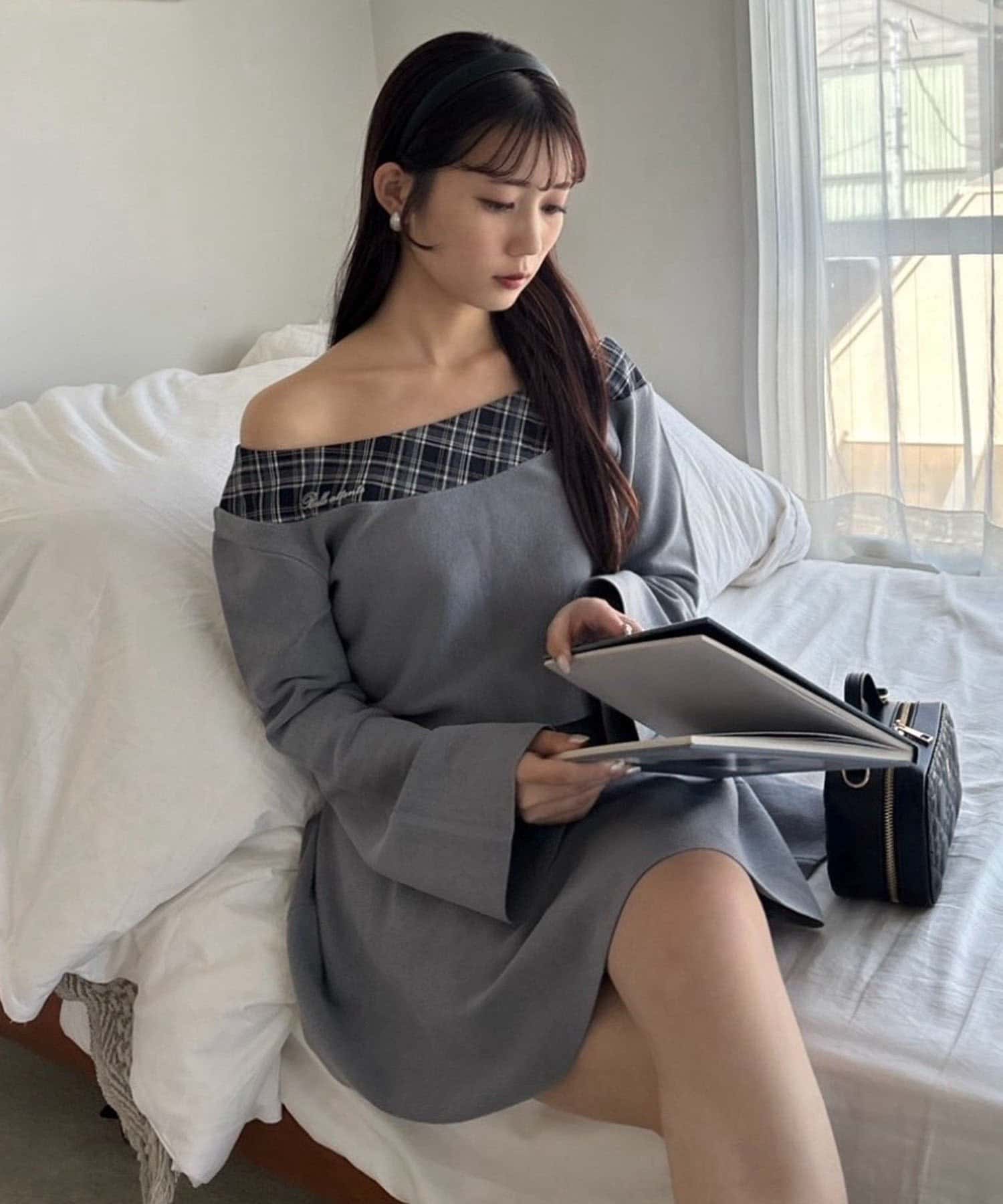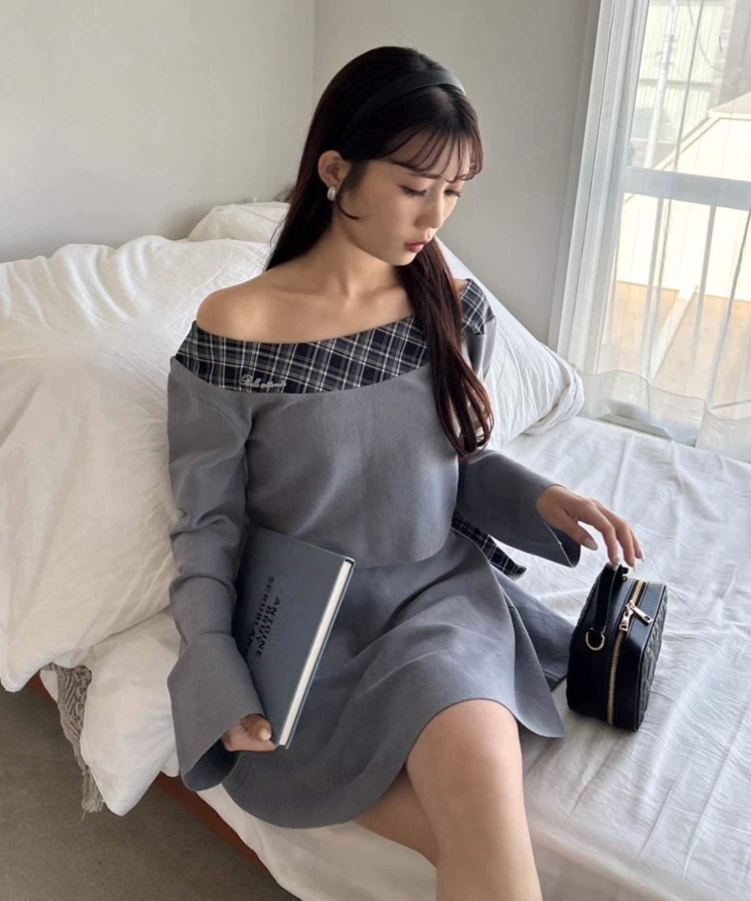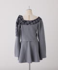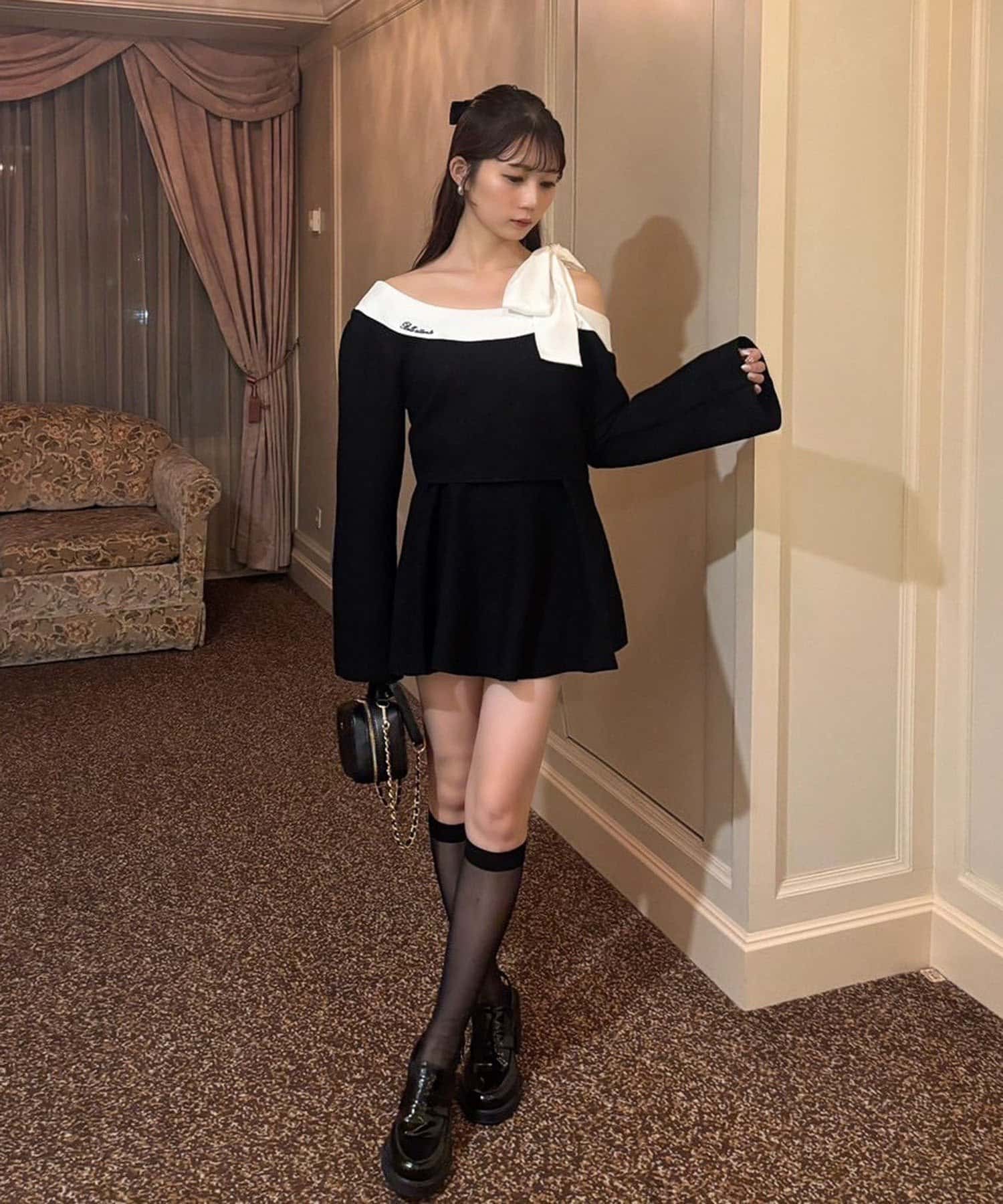 トップスはワンショルダー仕様で、デコルテを美しく見せてくれ、程よい抜け感も演出できます。