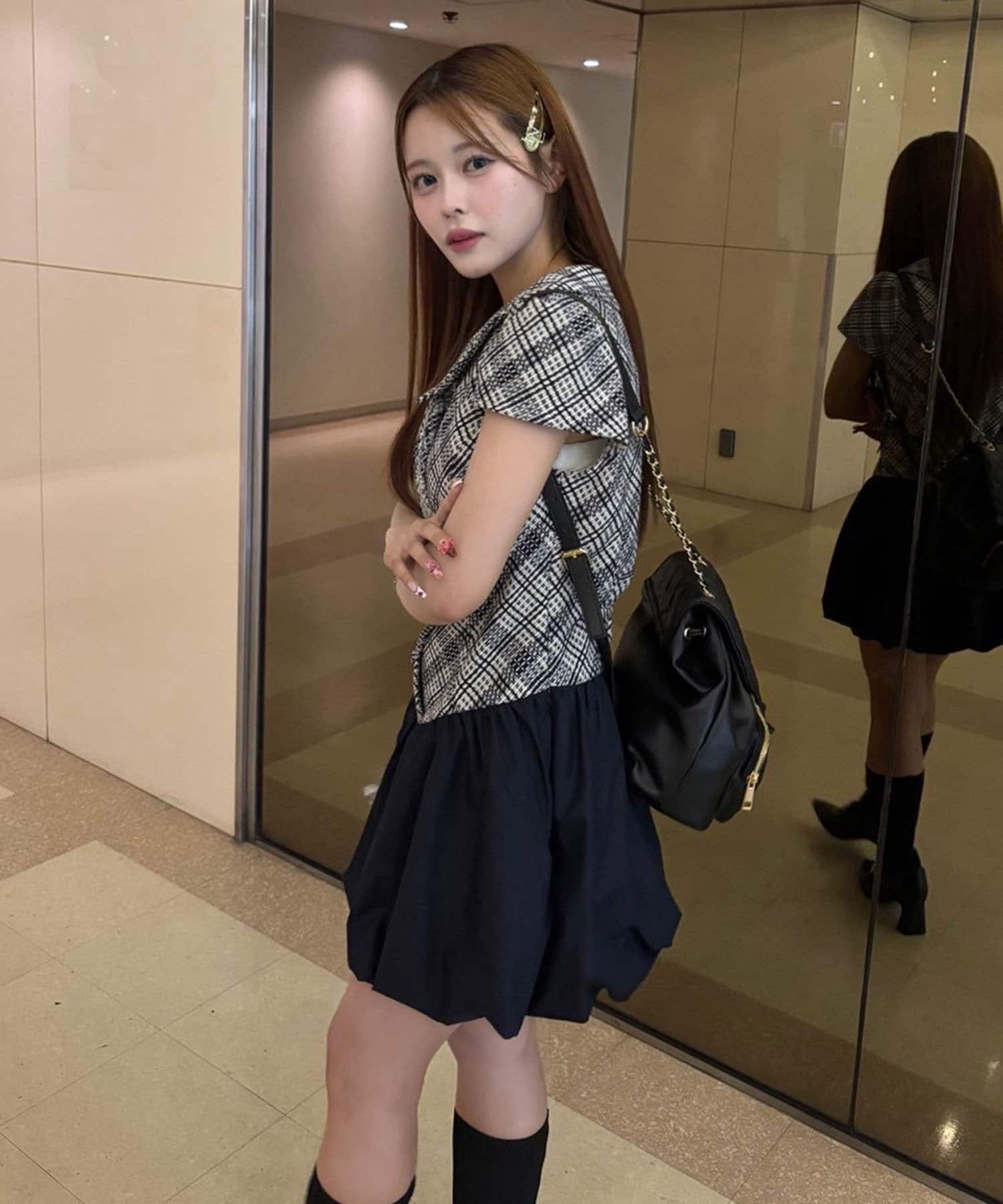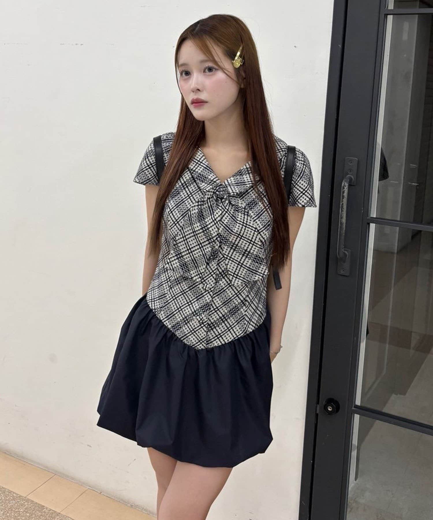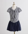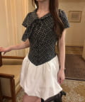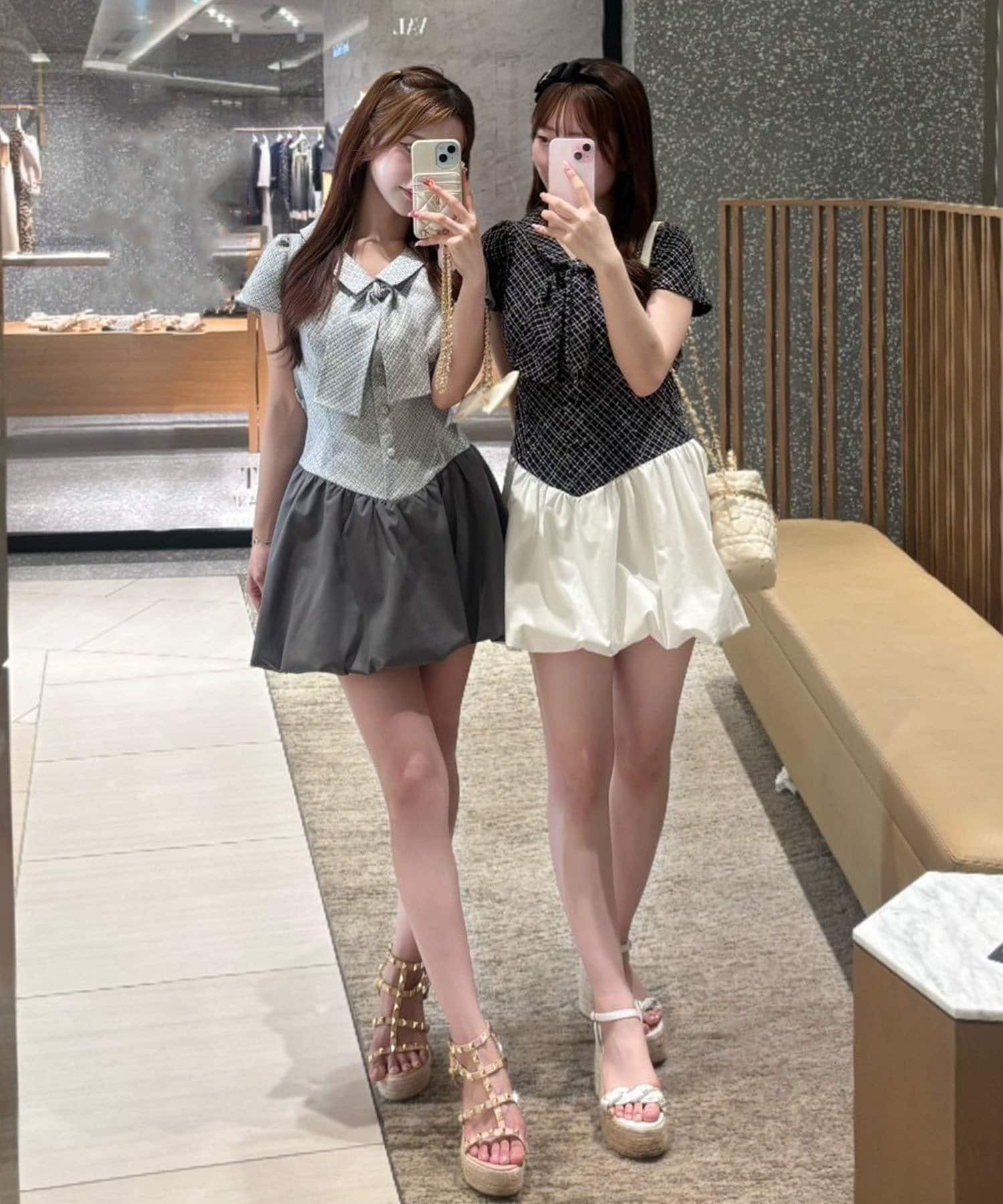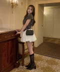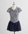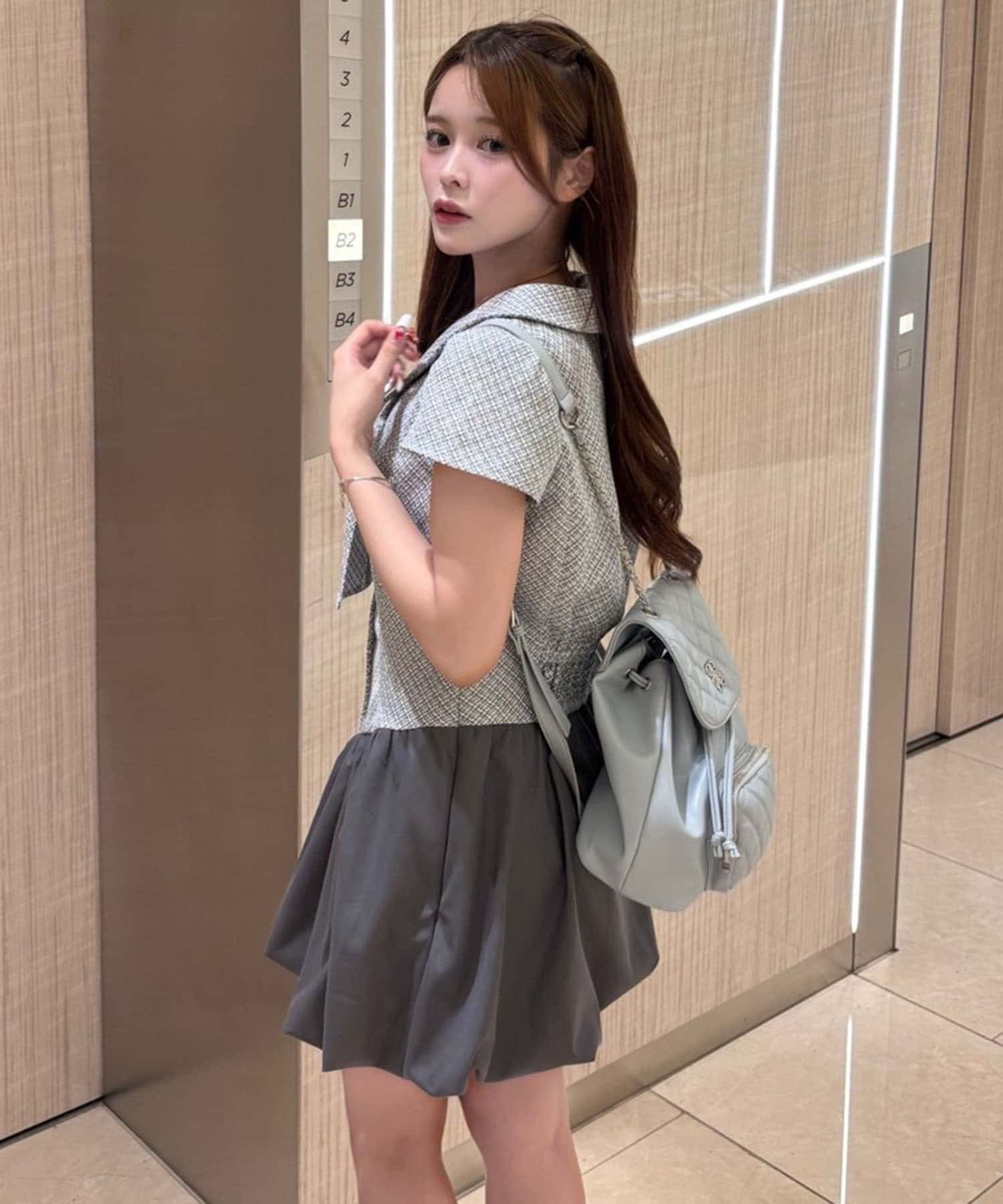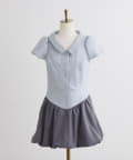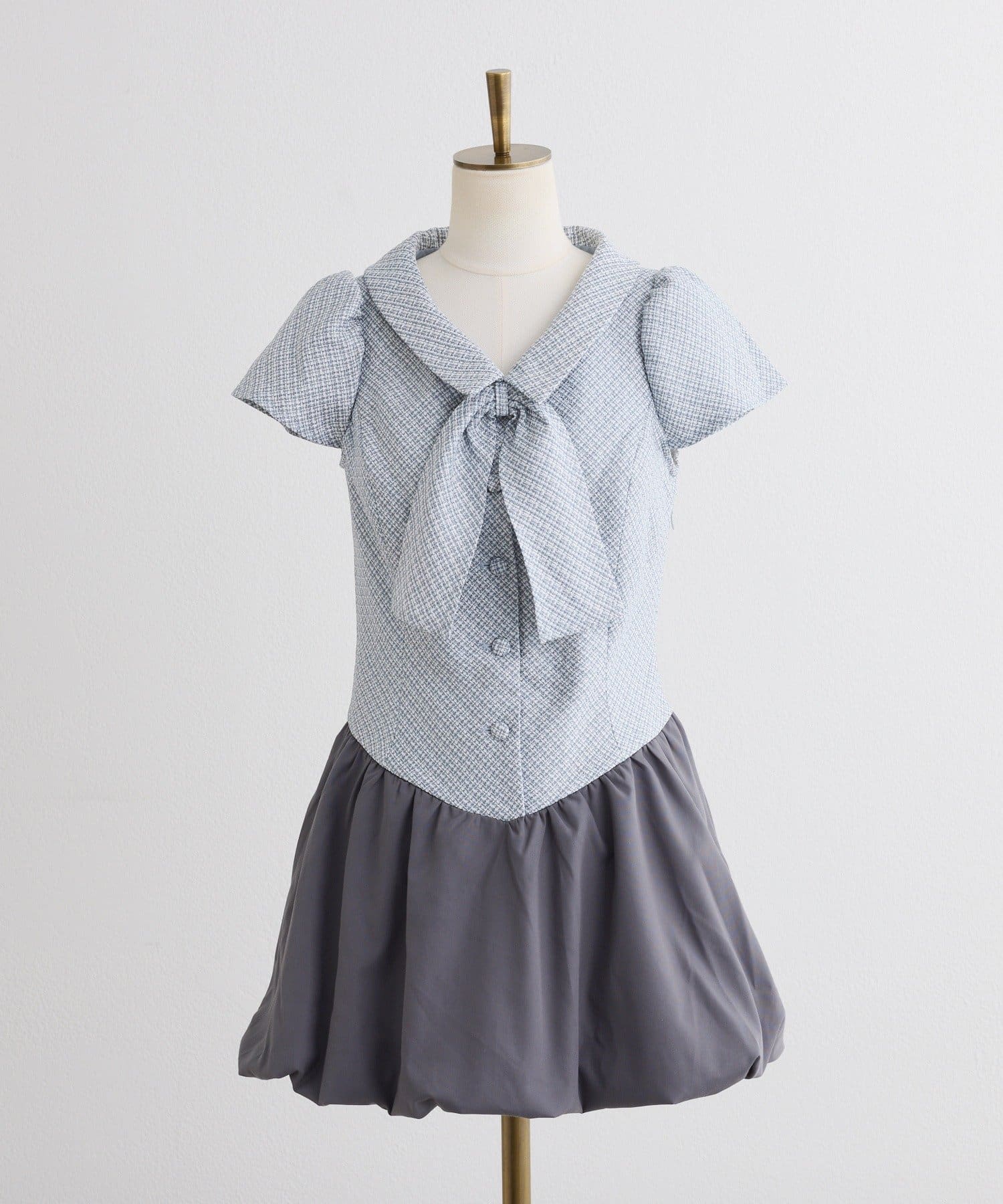 スカート部分はふんわりとしたバルーンシルエットで、気になるヒップラインをカバーしつつ、フェミニンな印象をプラス。