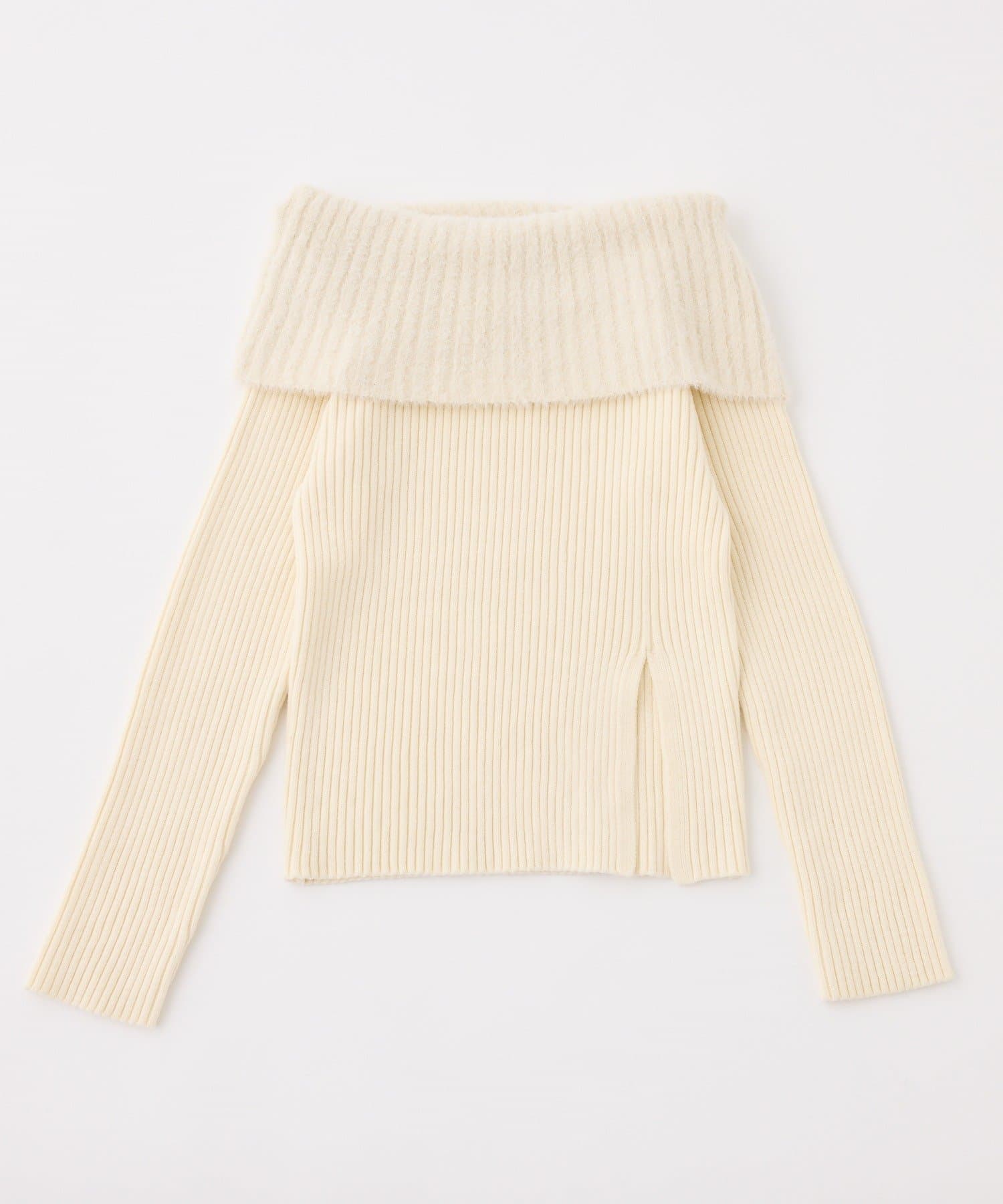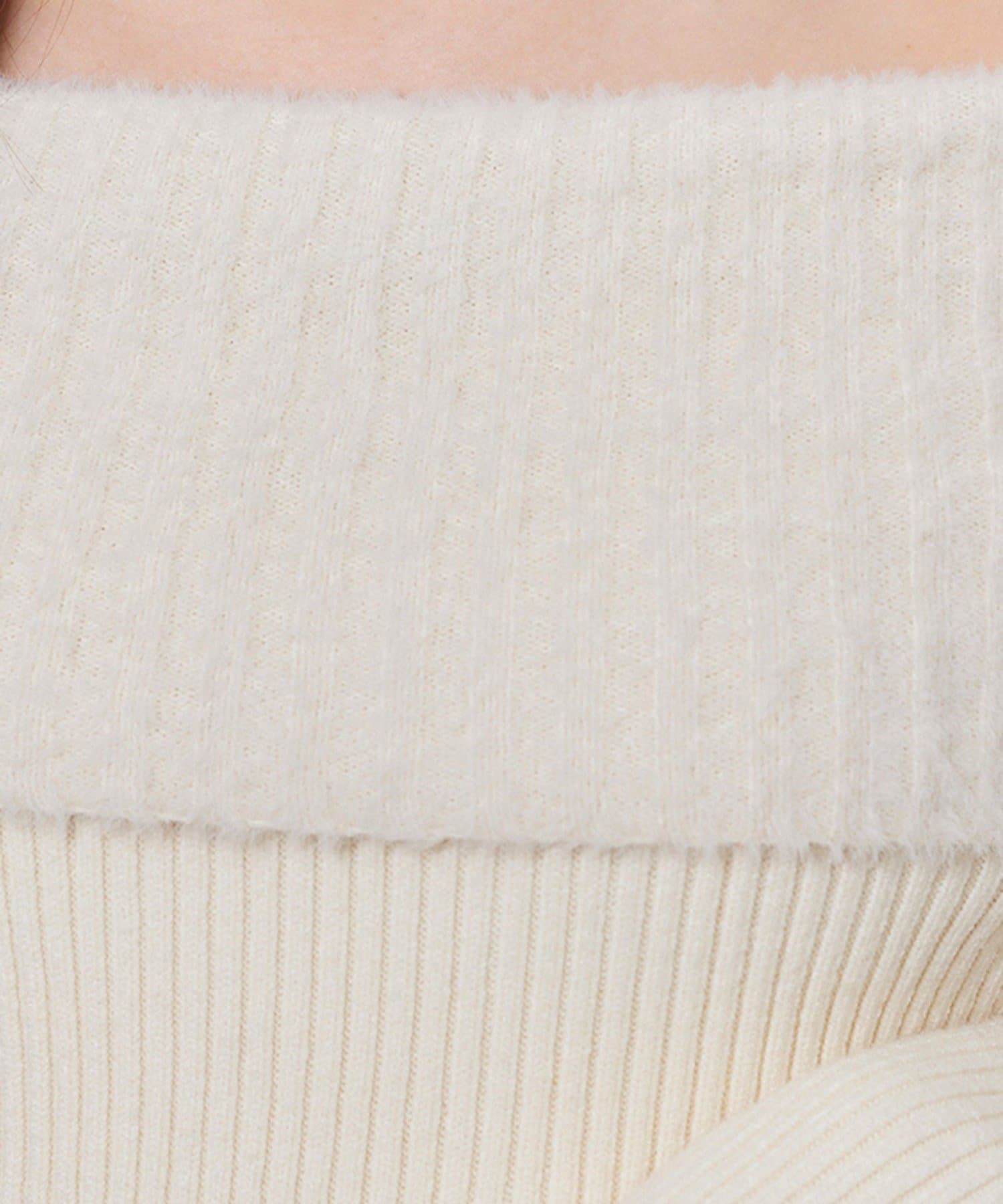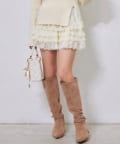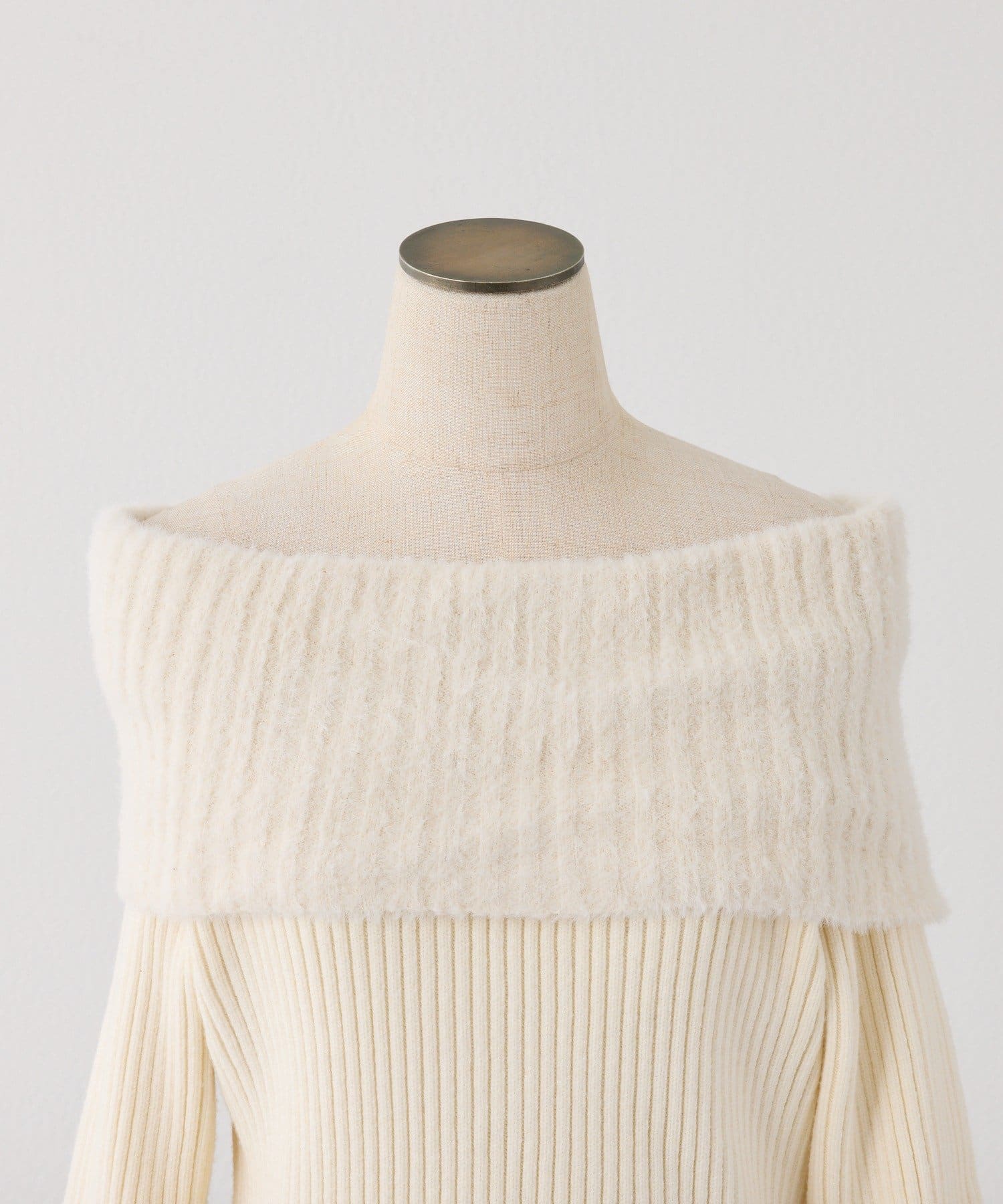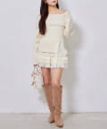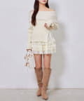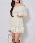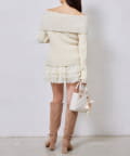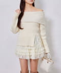 オフショルシャギーニットとティアードミニスカートで、女性らしい華やかなレイヤードスタイルが楽しめます。