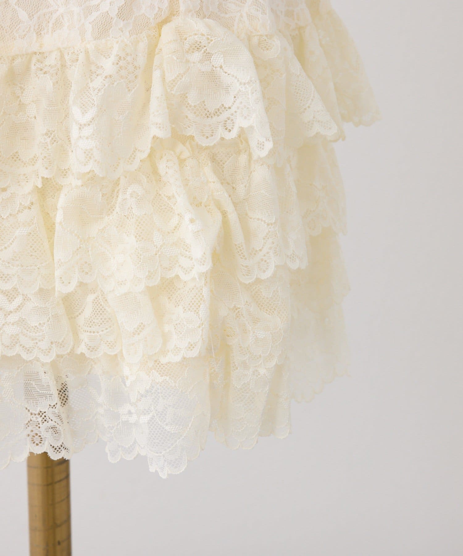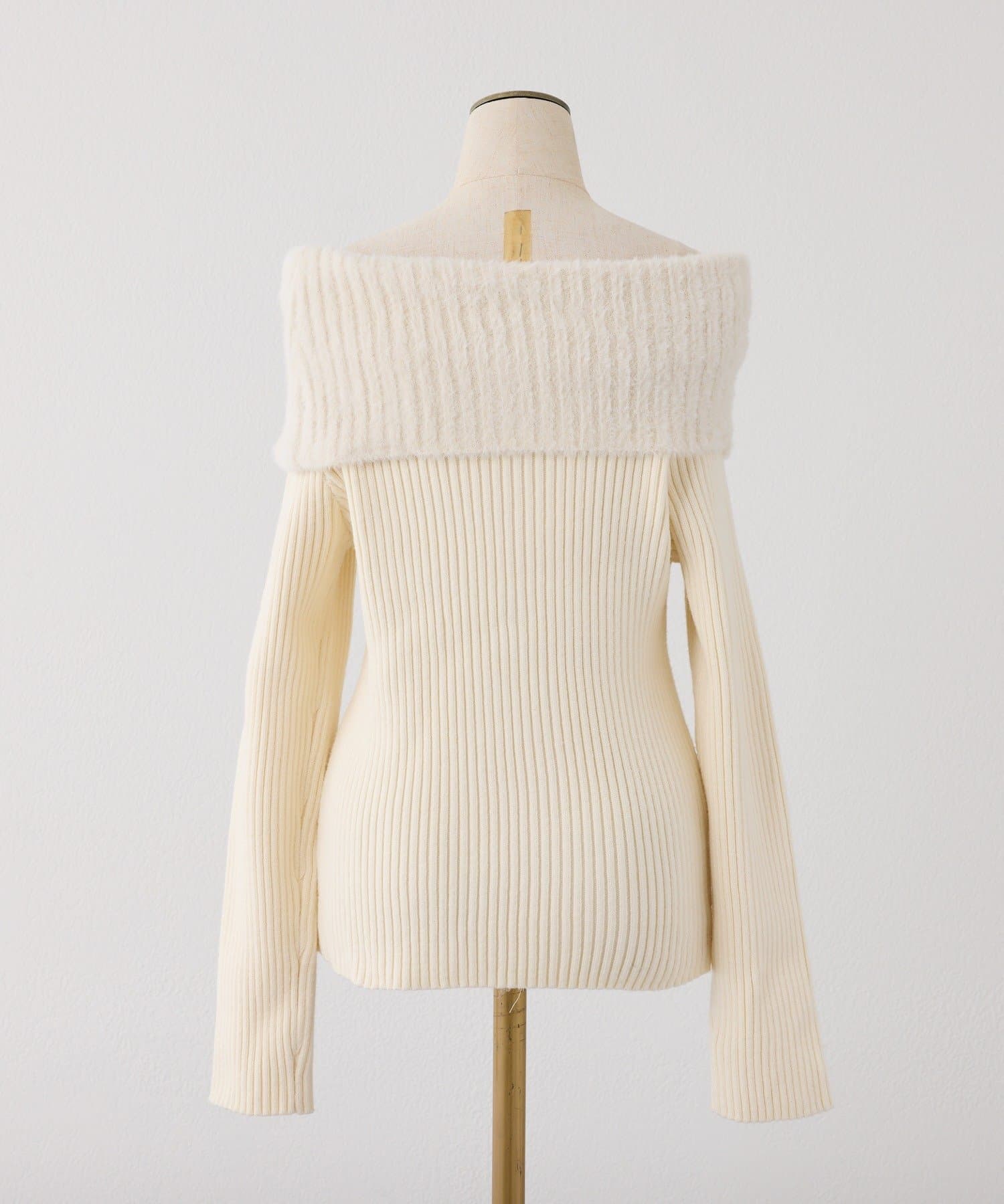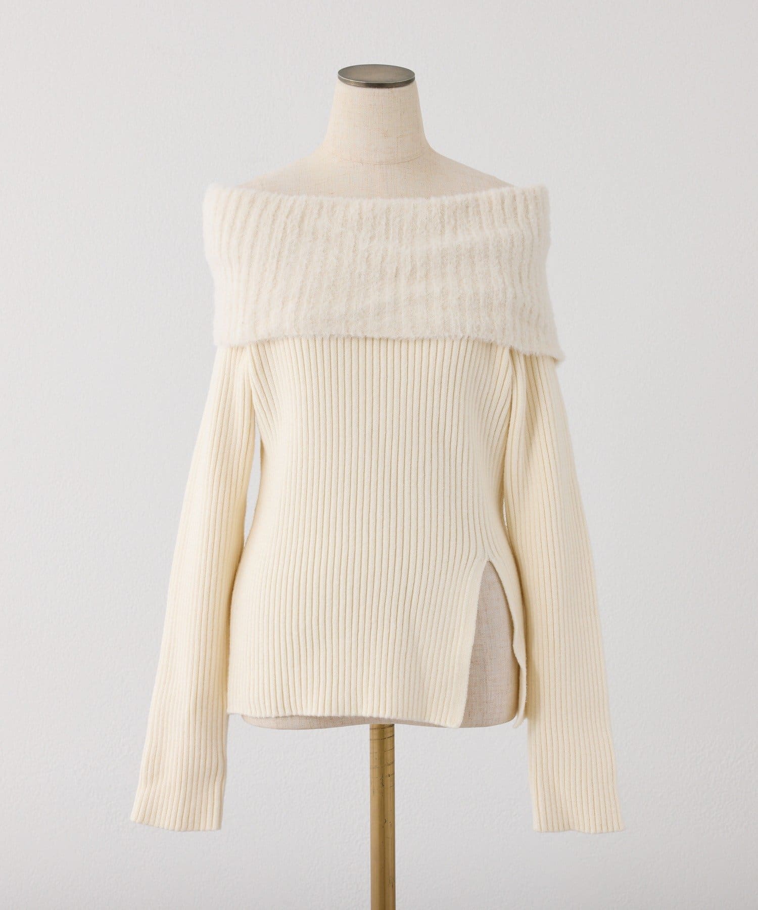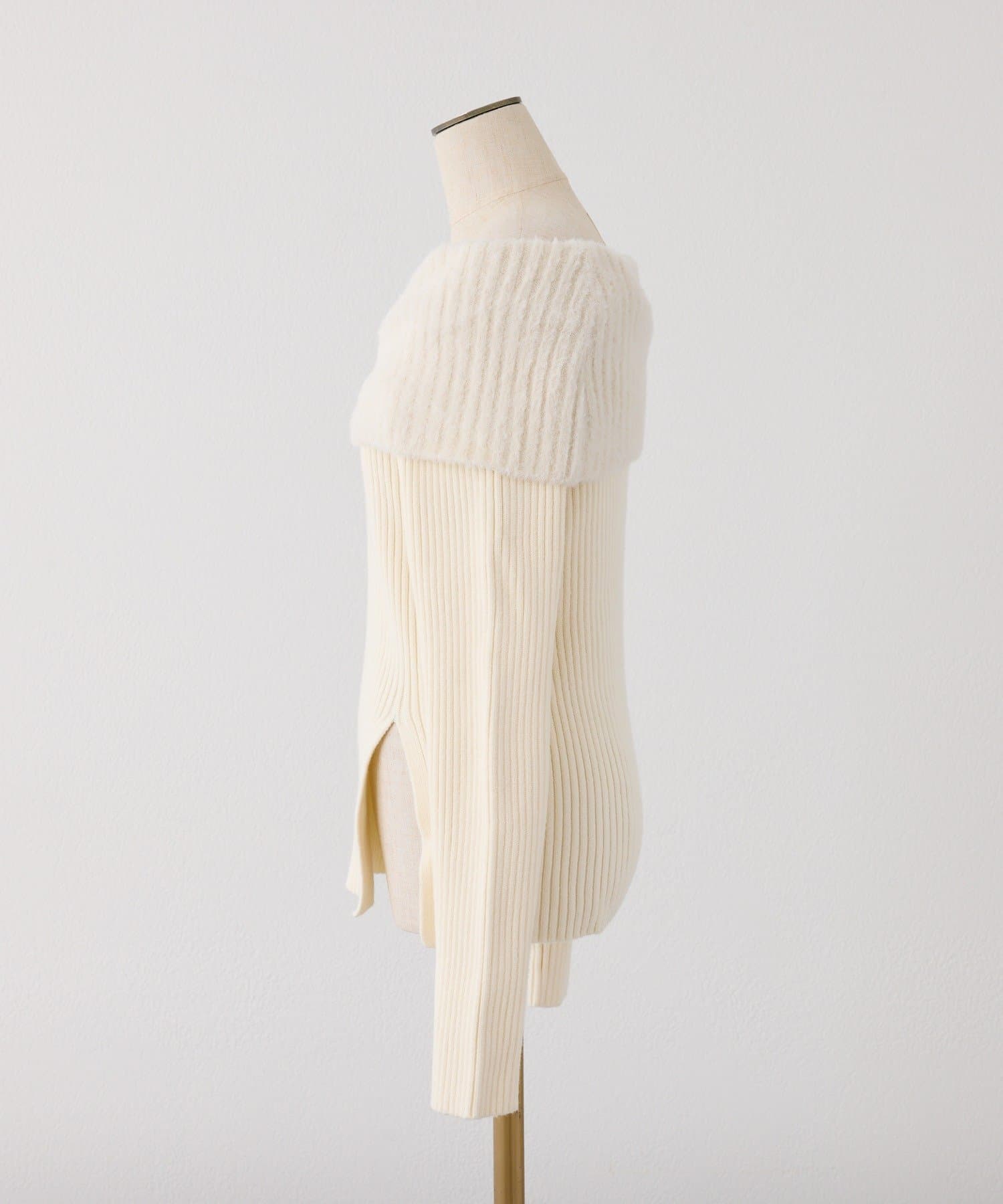 オフショルシャギーニットとティアードミニスカートで、女性らしい華やかなレイヤードスタイルが楽しめます。