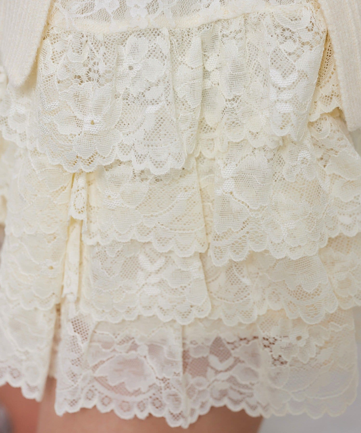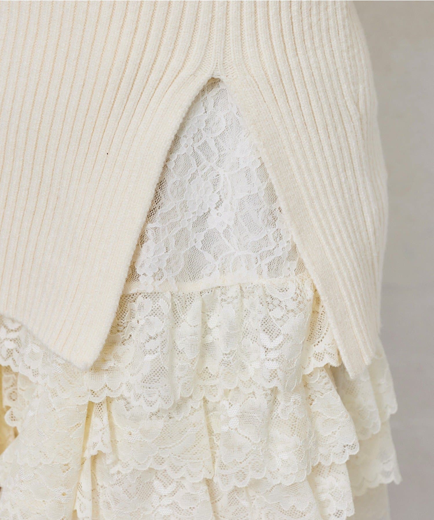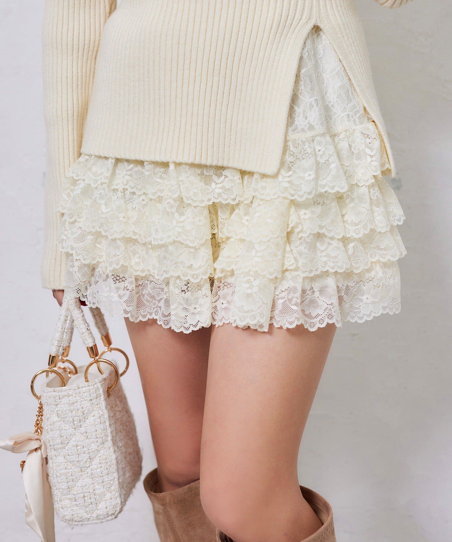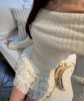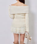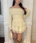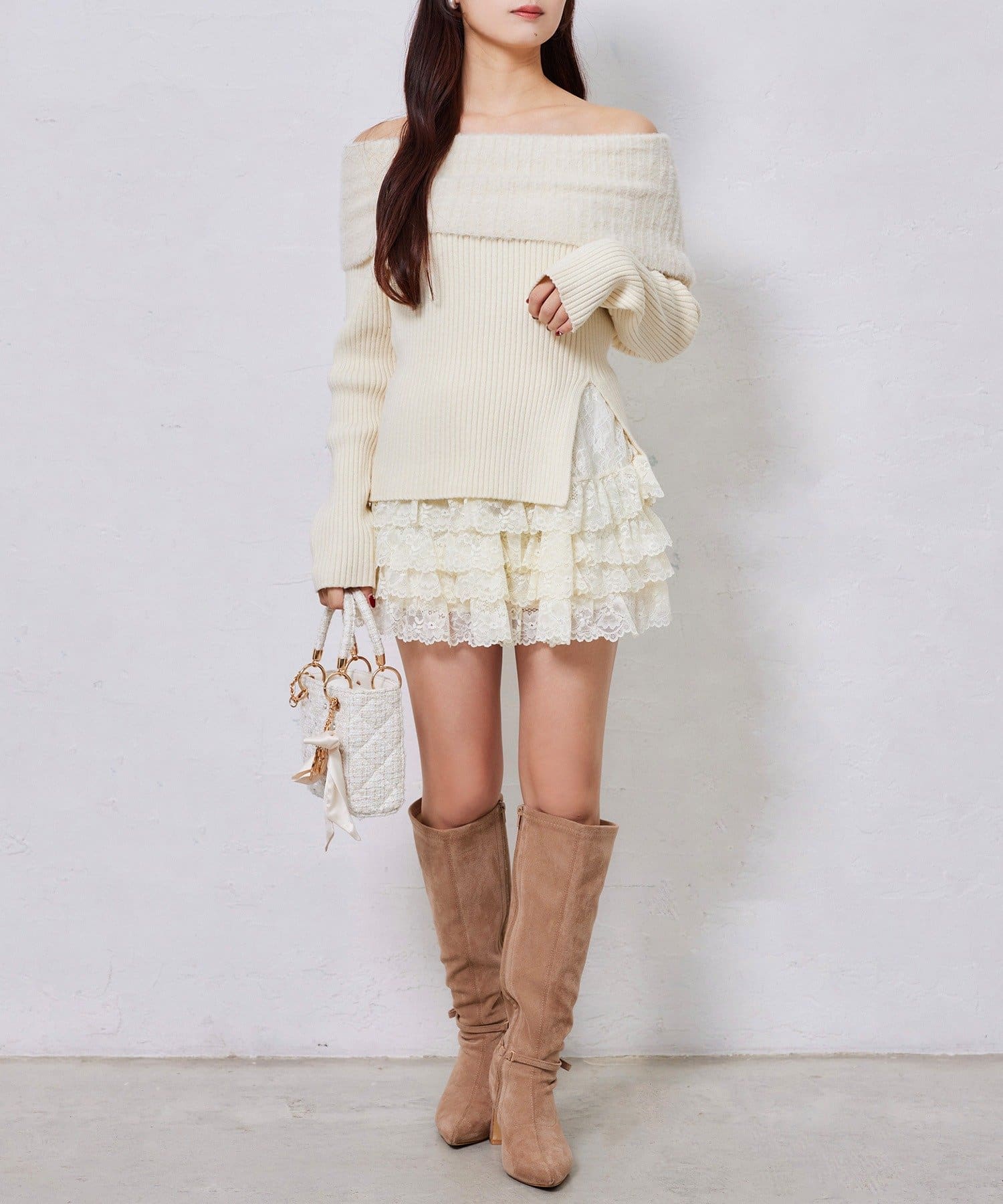 オフショルシャギーニット×レースミニスカートで女性らしいレイヤードスタイルに